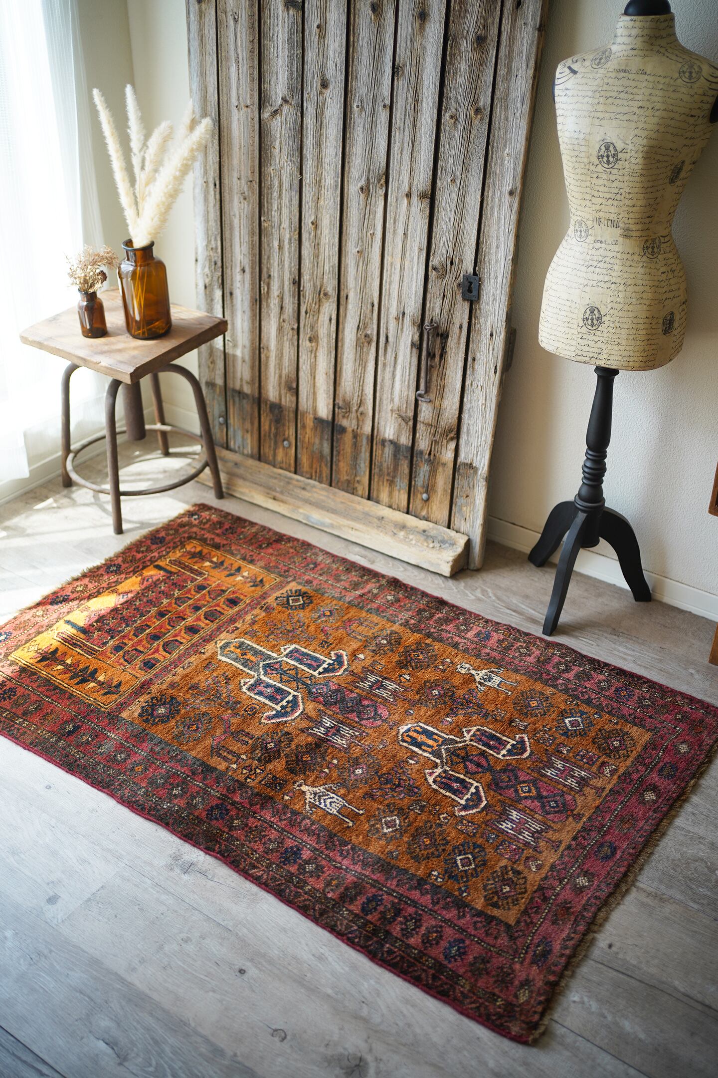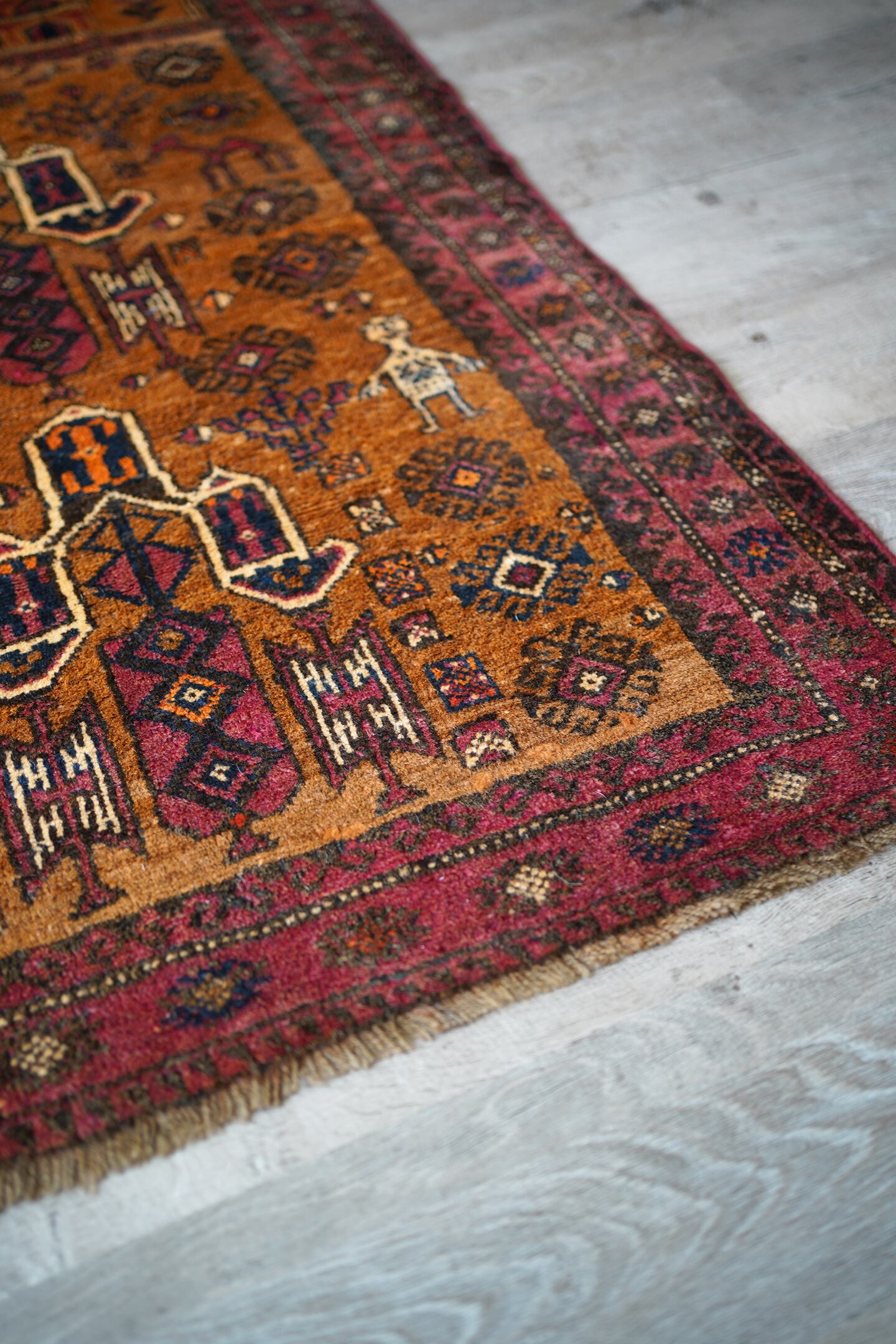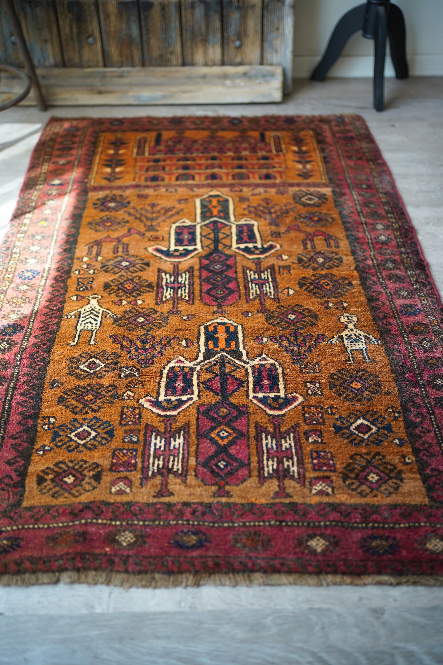 経年約60年のアフガニスタン産のマリダリラグ。カウボーイハットのような帽子を被った可愛らしい人の紋様に釘付けになってしまい、仕入れを決めました。少しオレンジ色にも見えるブラウンカラーのフィールドには人やラクダなどの珍しい紋様が織り込まれています。毛並みはふわっと優しい肌触りで、6mm〜7mmほどの厚みです。補修跡やダメージも見られず、良好な状態です。不思議な魅力がある珍しいラグ、なかなか出会えない一枚かと思います♫