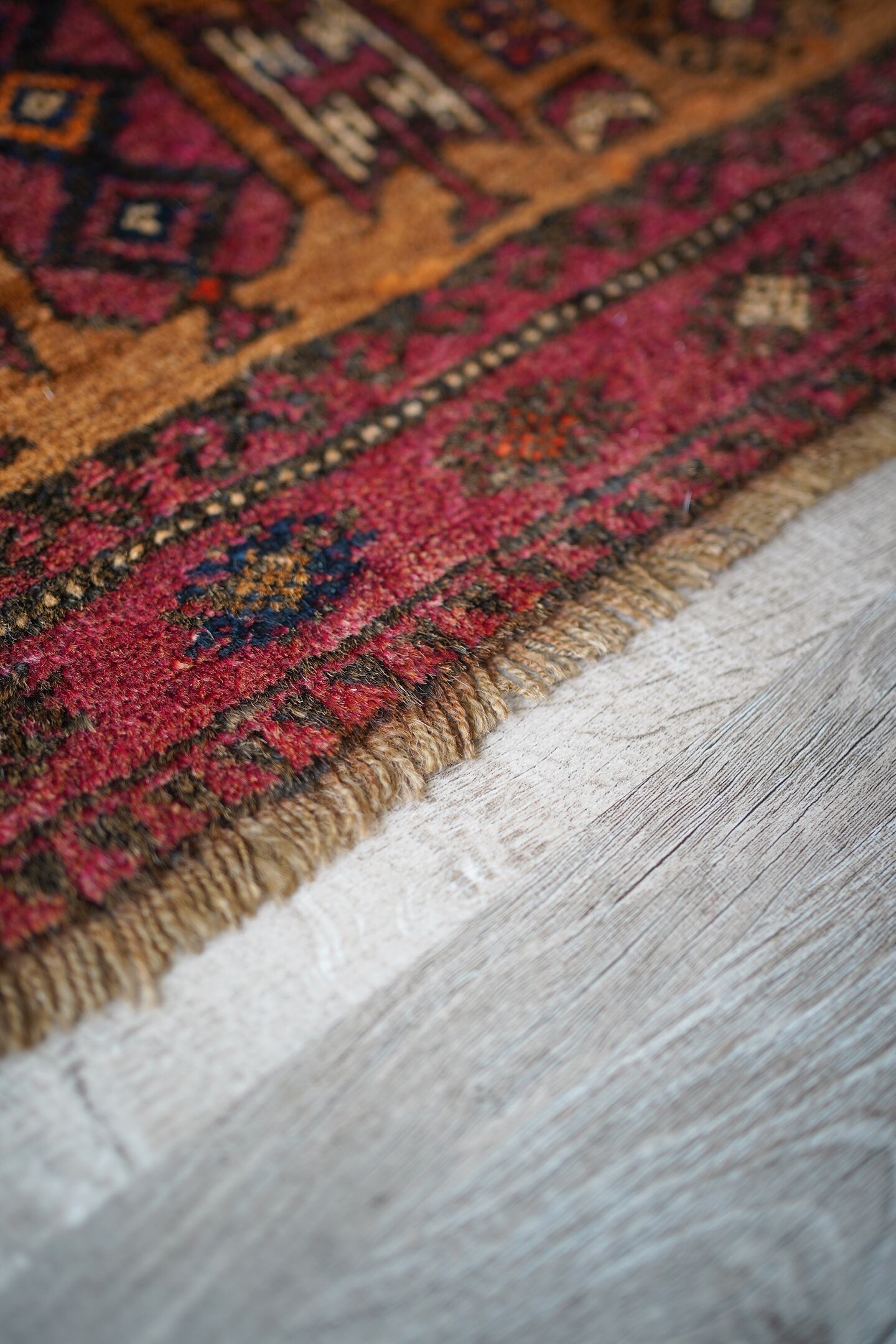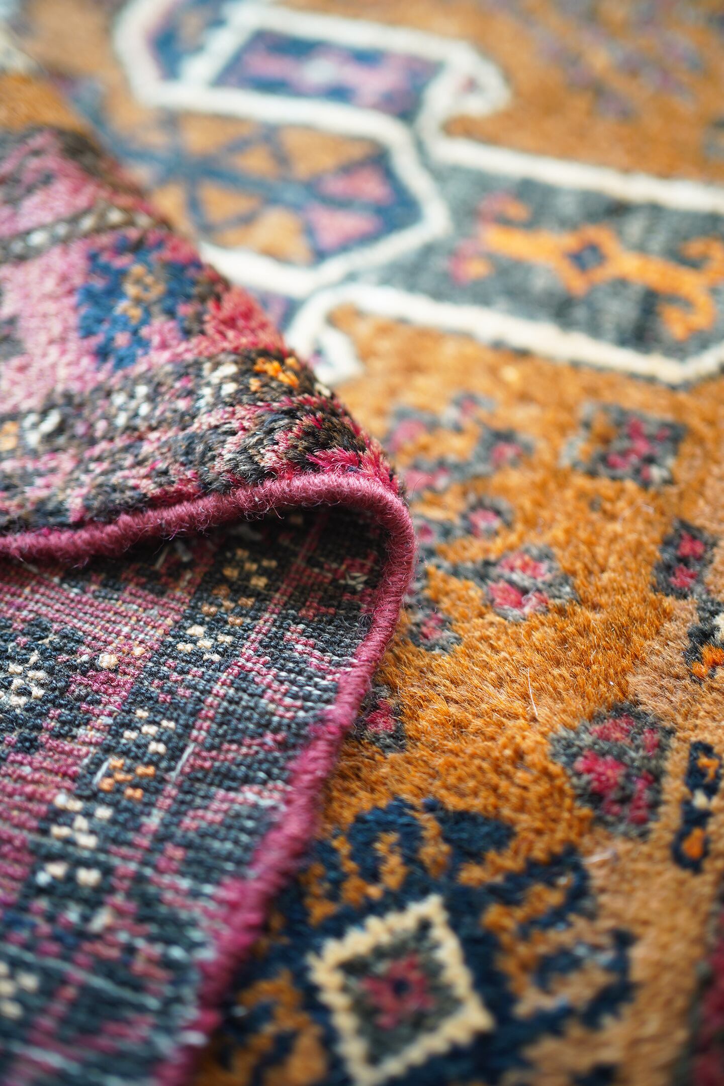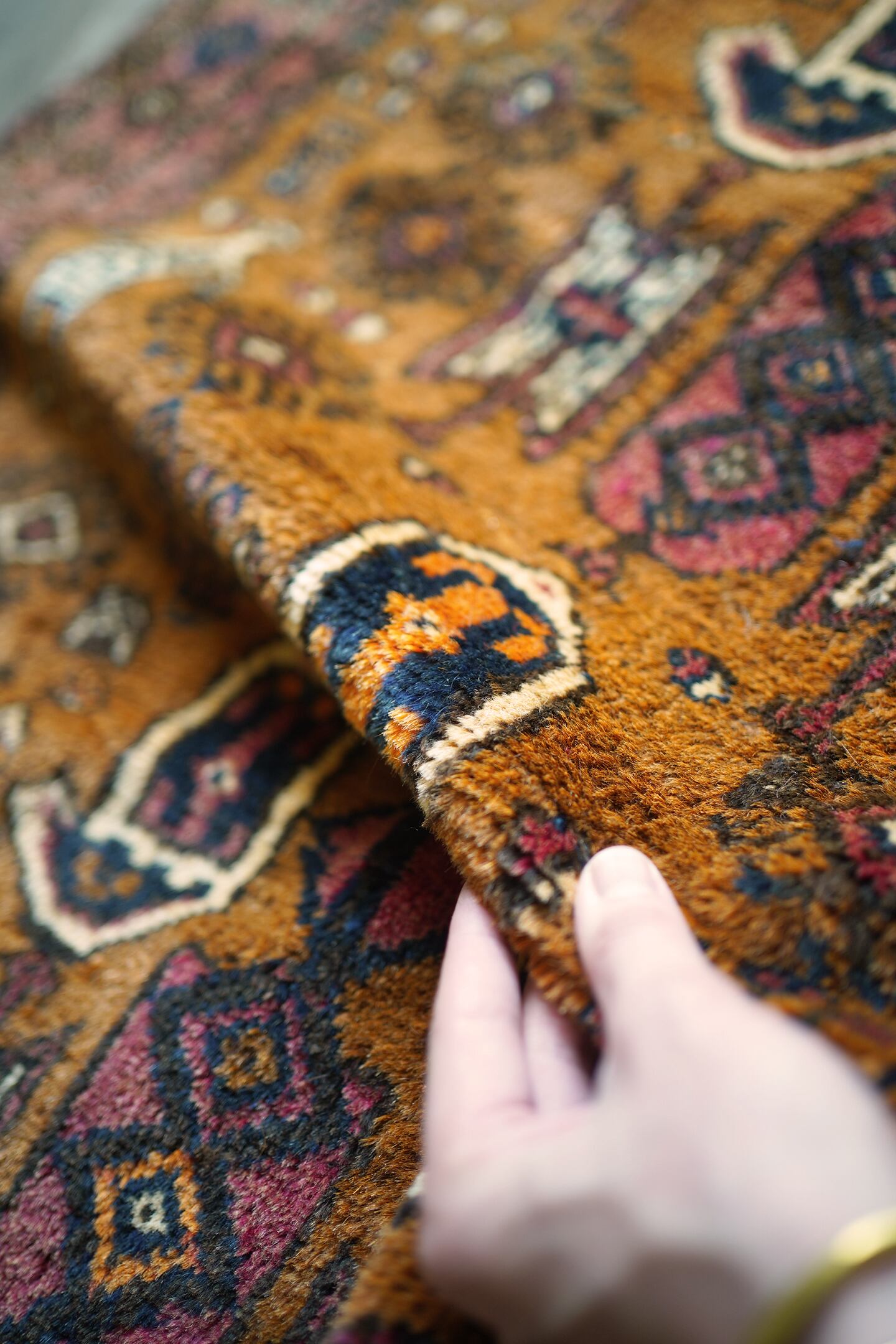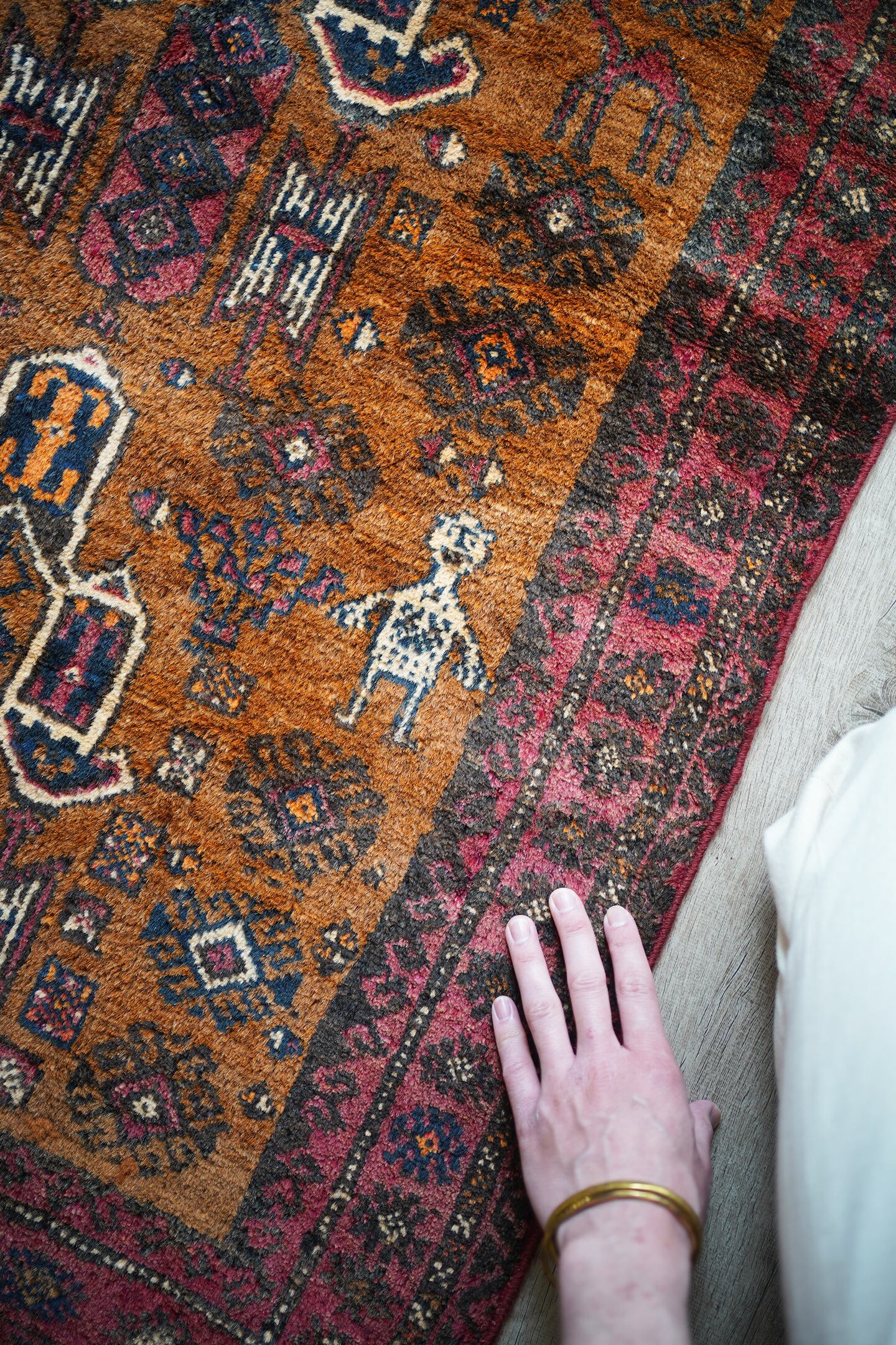 経年約60年のアフガニスタン産のマリダリラグ。カウボーイハットのような帽子を被った可愛らしい人の紋様に釘付けになってしまい、仕入れを決めました。少しオレンジ色にも見えるブラウンカラーのフィールドには人やラクダなどの珍しい紋様が織り込まれています。毛並みはふわっと優しい肌触りで、6mm〜7mmほどの厚みです。補修跡やダメージも見られず、良好な状態です。不思議な魅力がある珍しいラグ、なかなか出会えない一枚かと思います♫