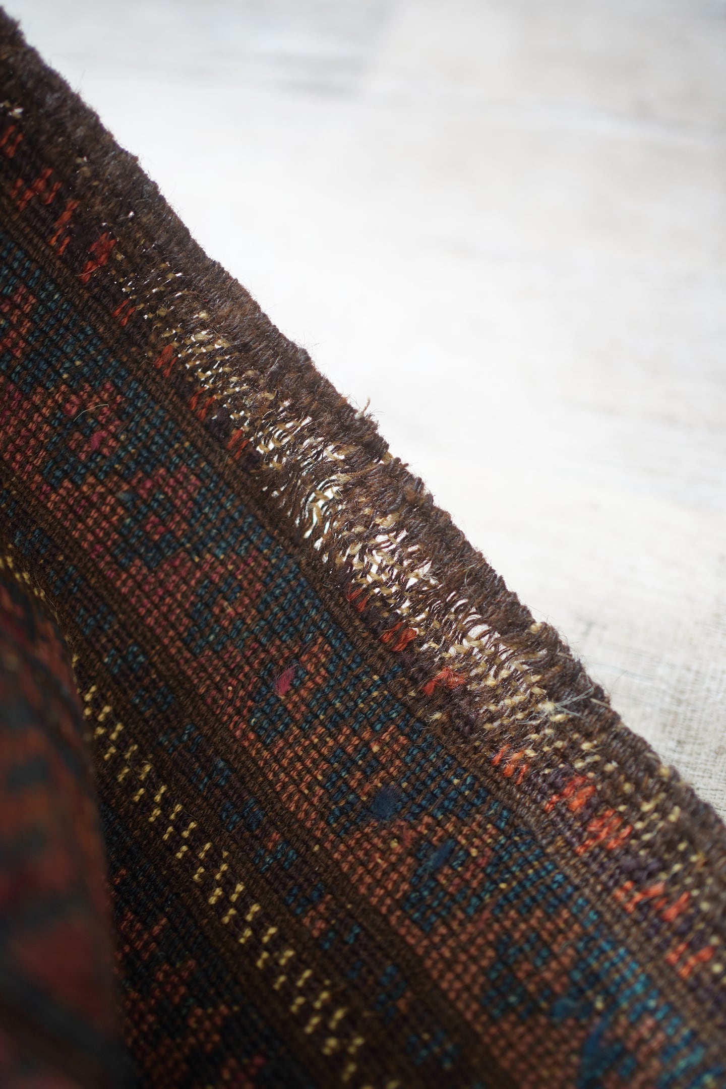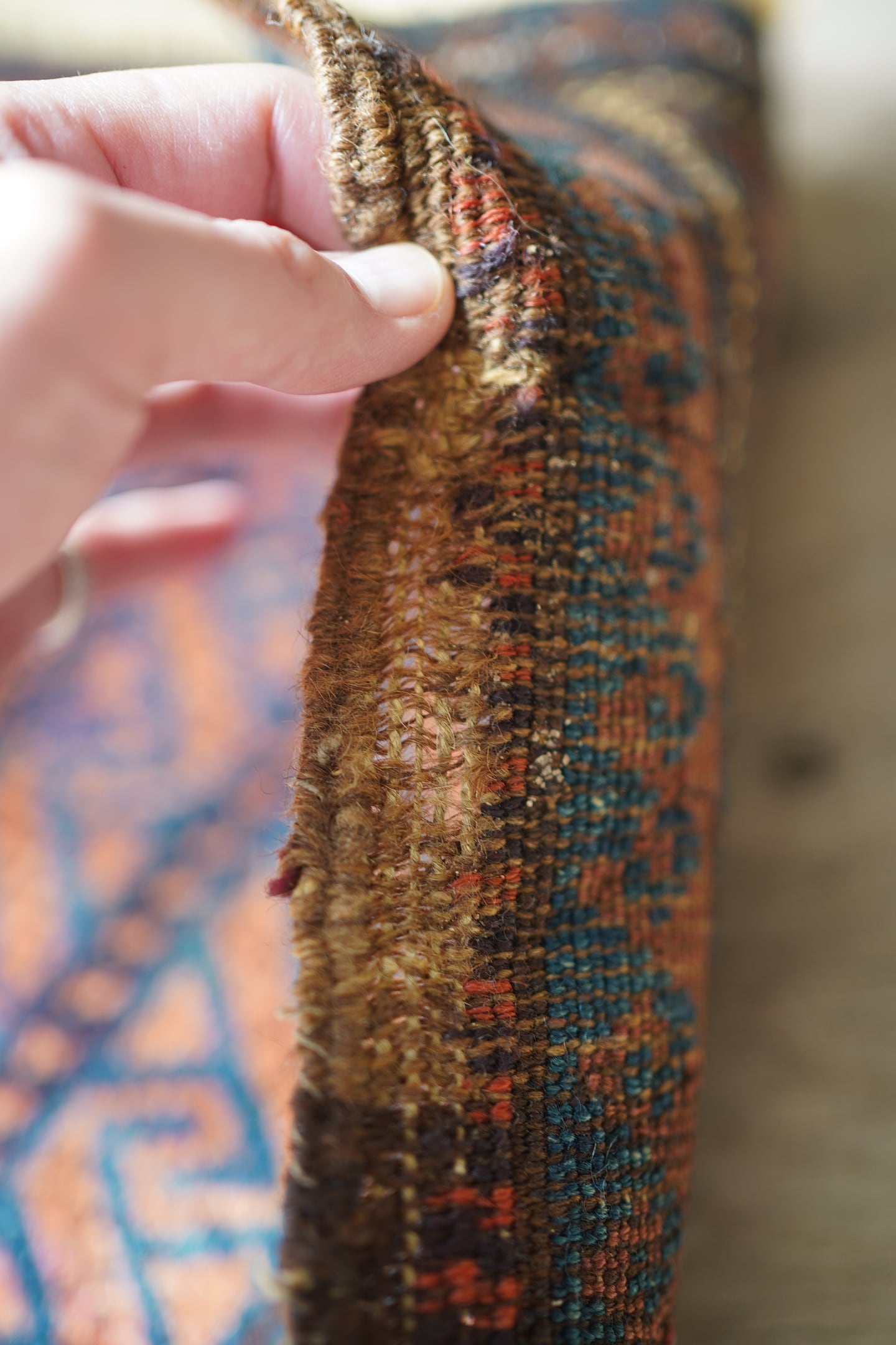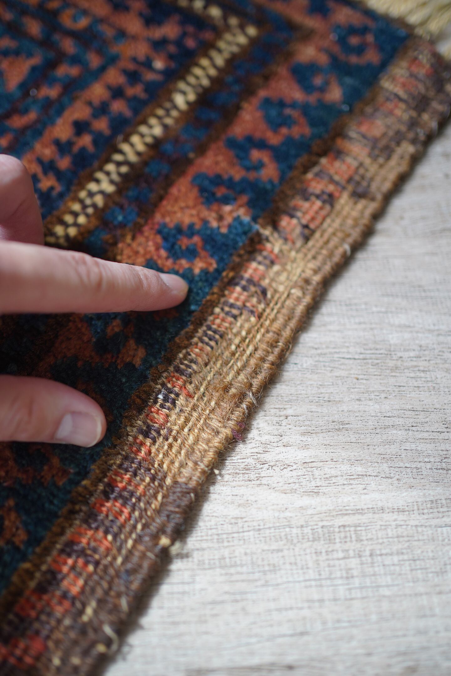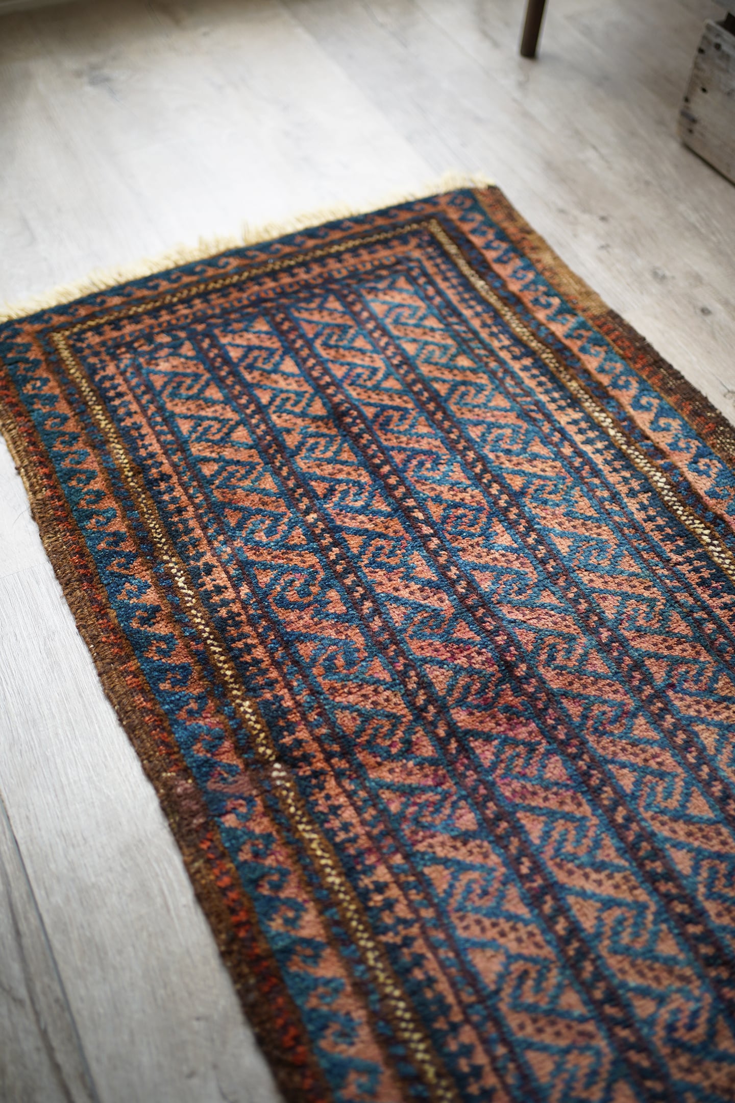 美しい艶を醸し出す経年約70年〜80年ほどのバルーチラグ。コーラルピンクとブルーグリーンの珍しい配色で、見る角度によってコーラルピンク部分が茶色のように見えたり、赤みの強いピンクに見えたりと様々な表情を見せてくれます。ふわっと滑らかな優しい肌触りで、厚みは6mm〜7mm程度です。状態としては両サイドのセルベッジ部分でパイルがかなり薄くなっている箇所があります。また補修によりパイルの色味が少しだけ異なる箇所がございます(お写真最後の5枚をご参照ください)。決して状態が良いと言えるラグではありませんが、艶も含めて大変味のある素敵な一枚です。アンティークの風合いにご理解ある方にお迎えいただければと思います。