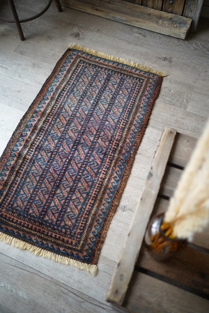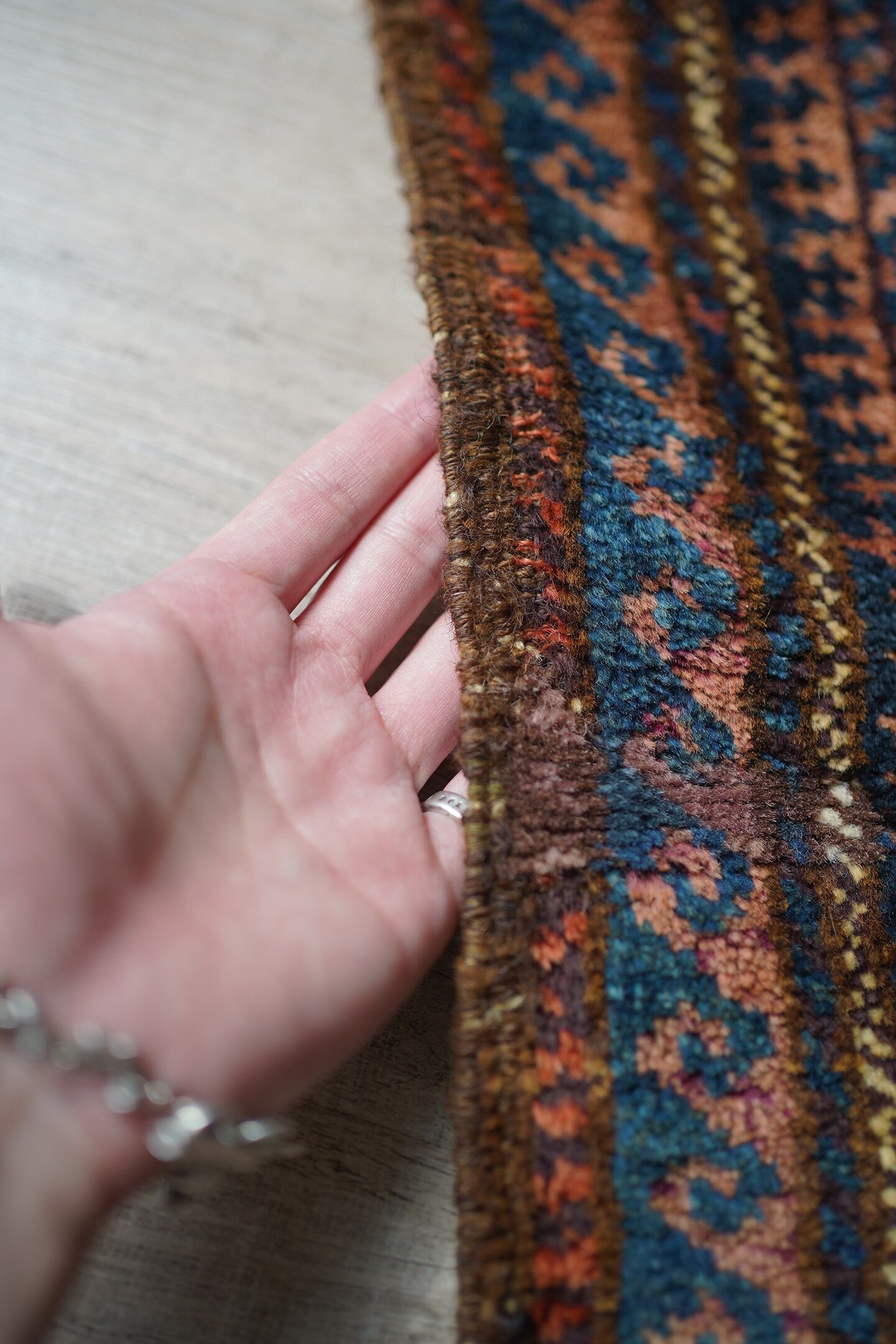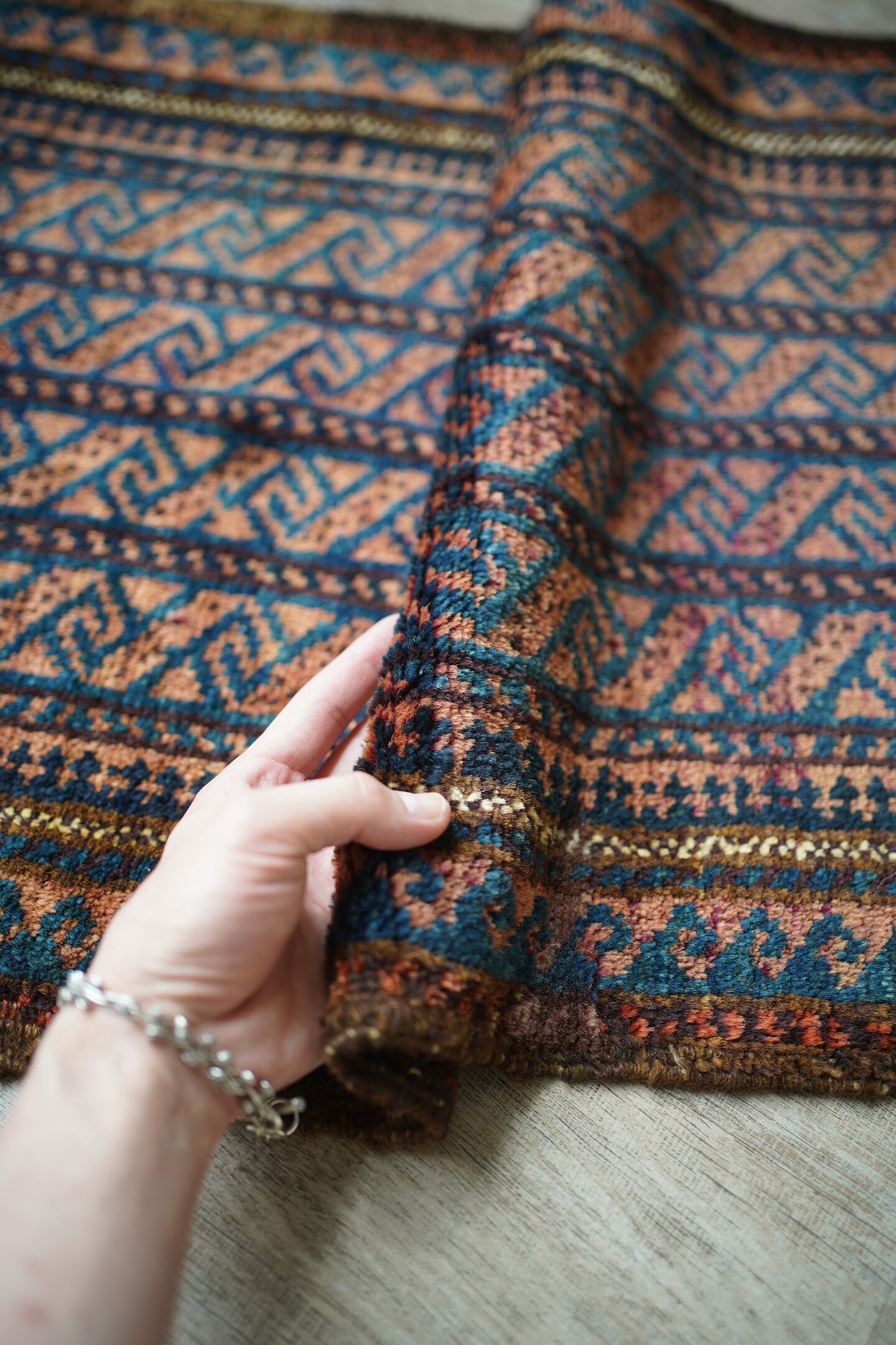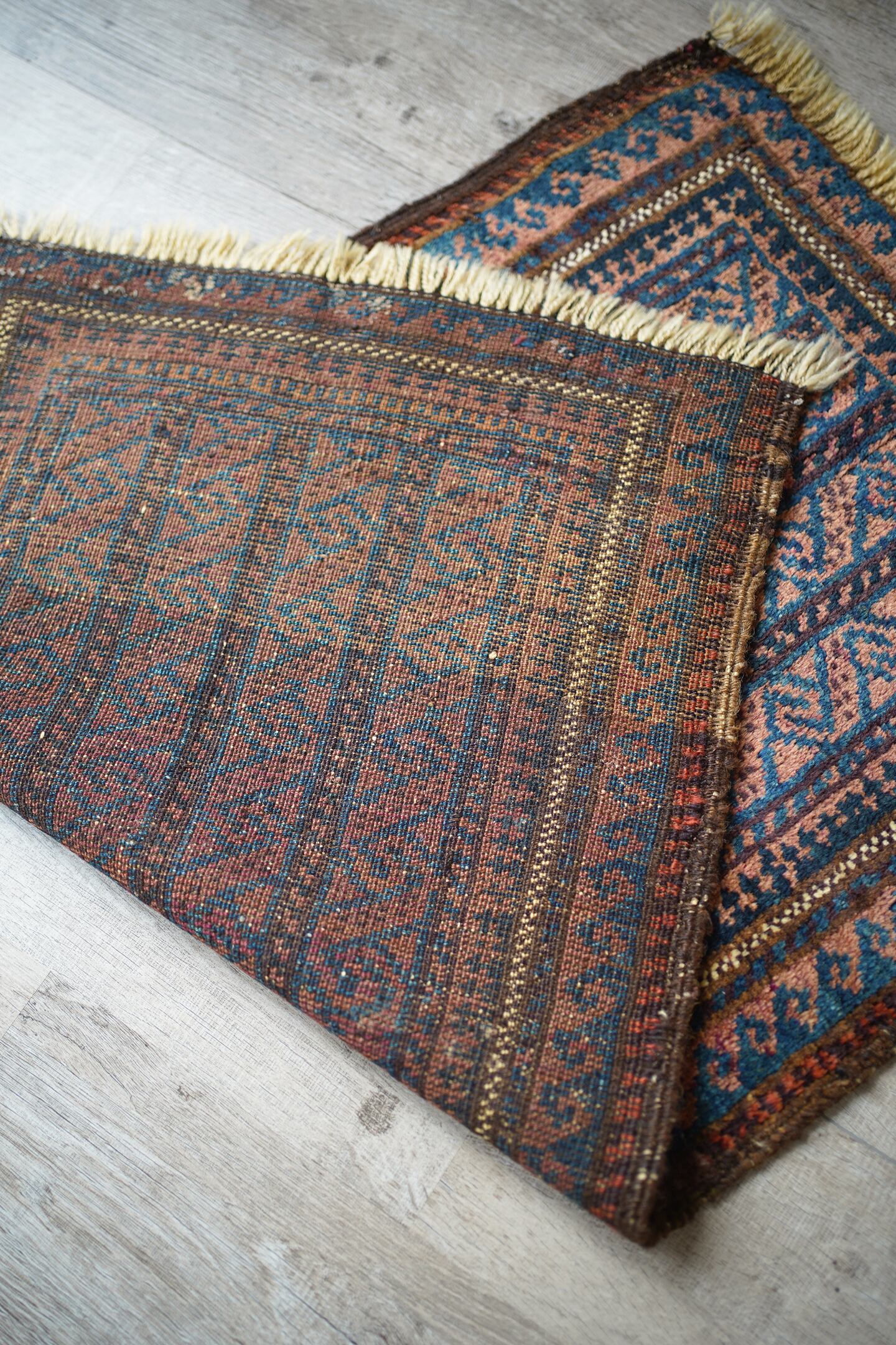 美しい艶を醸し出す経年約70年〜80年ほどのバルーチラグ。コーラルピンクとブルーグリーンの珍しい配色で、見る角度によってコーラルピンク部分が茶色のように見えたり、赤みの強いピンクに見えたりと様々な表情を見せてくれます。ふわっと滑らかな優しい肌触りで、厚みは6mm〜7mm程度です。状態としては両サイドのセルベッジ部分でパイルがかなり薄くなっている箇所があります。また補修によりパイルの色味が少しだけ異なる箇所がございます(お写真最後の5枚をご参照ください)。決して状態が良いと言えるラグではありませんが、艶も含めて大変味のある素敵な一枚です。アンティークの風合いにご理解ある方にお迎えいただければと思います。