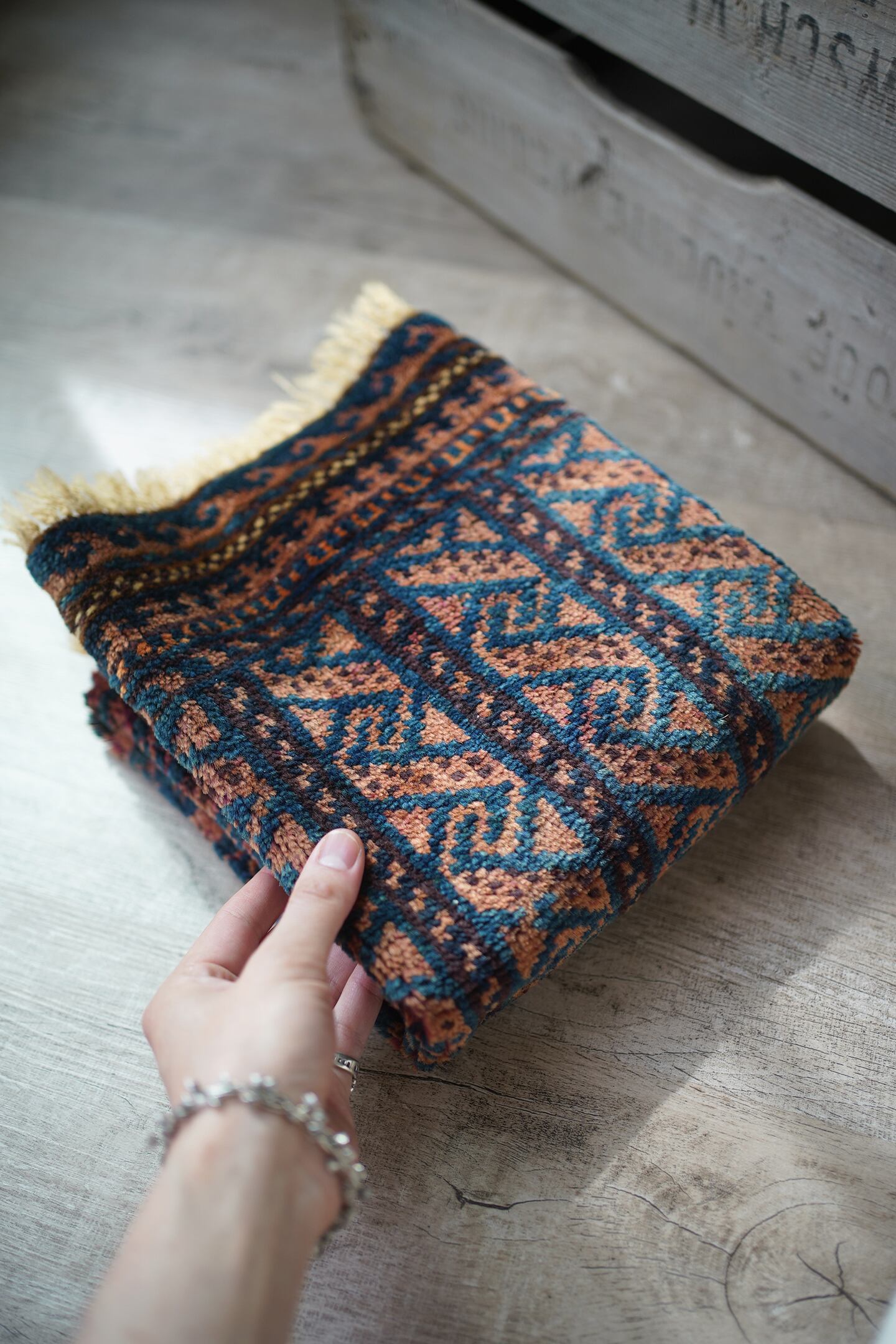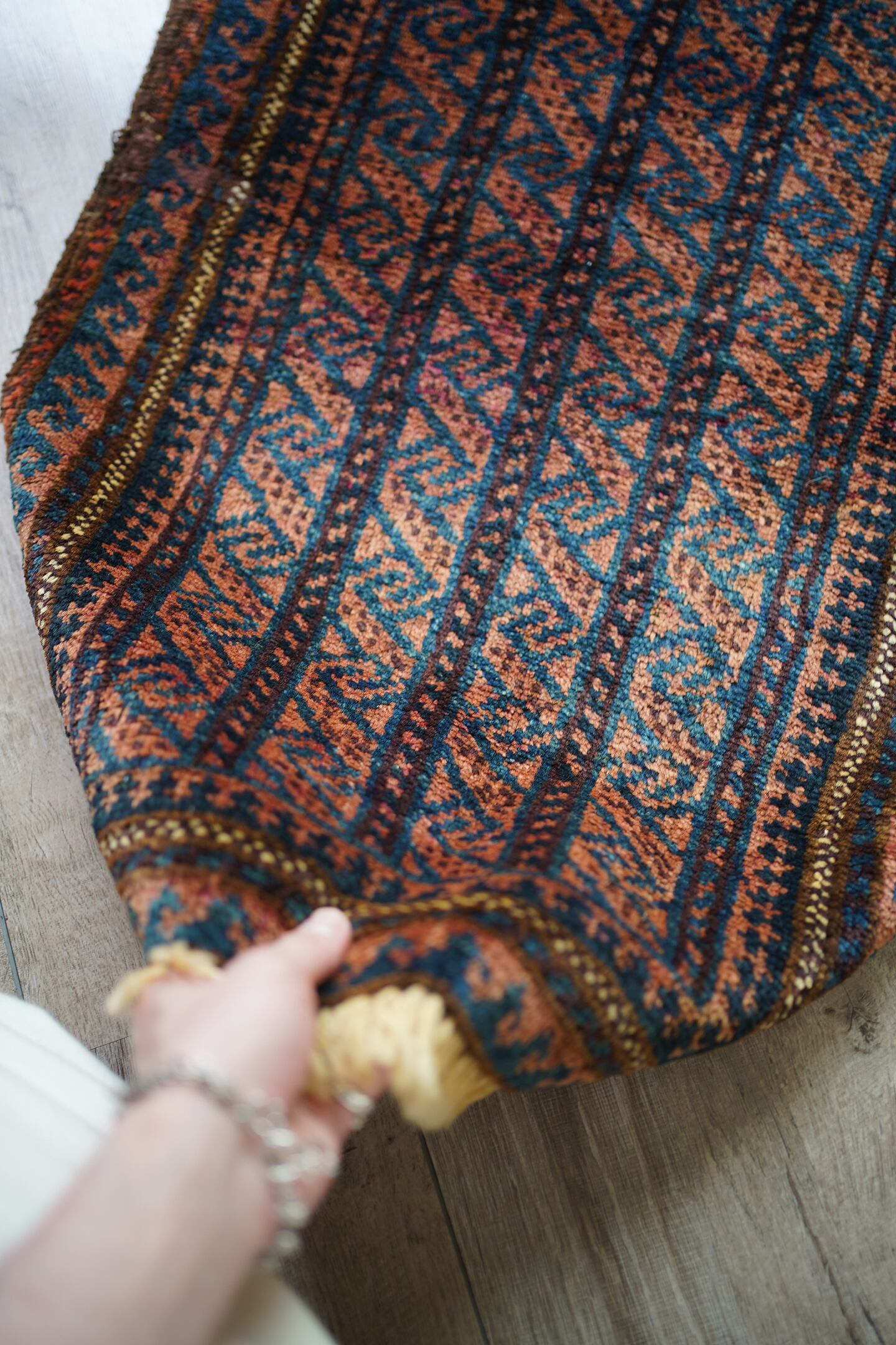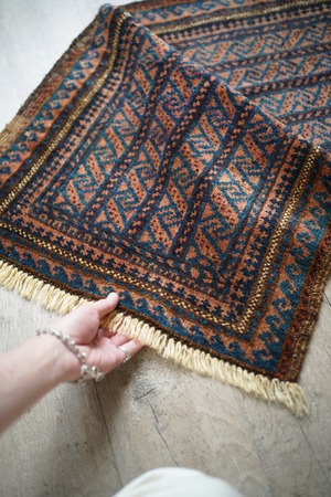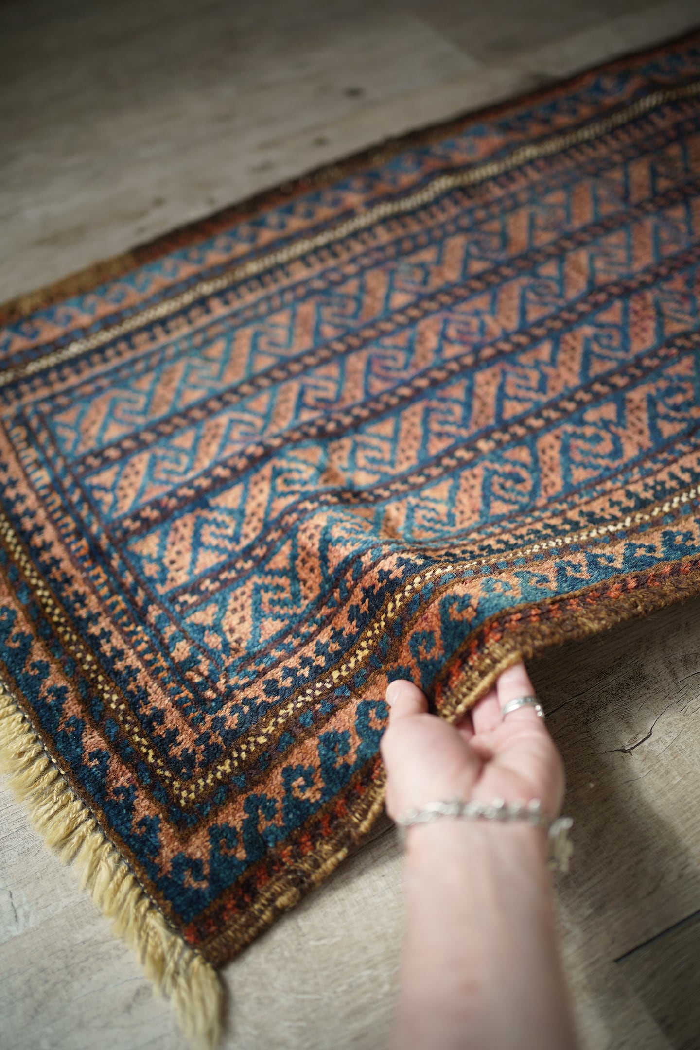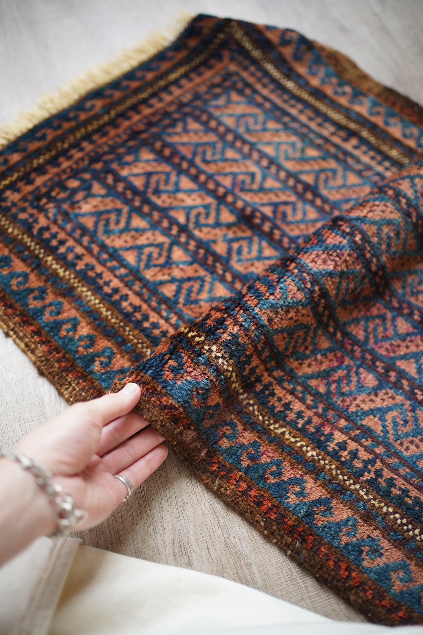 美しい艶を醸し出す経年約70年〜80年ほどのバルーチラグ。コーラルピンクとブルーグリーンの珍しい配色で、見る角度によってコーラルピンク部分が茶色のように見えたり、赤みの強いピンクに見えたりと様々な表情を見せてくれます。ふわっと滑らかな優しい肌触りで、厚みは6mm〜7mm程度です。状態としては両サイドのセルベッジ部分でパイルがかなり薄くなっている箇所があります。また補修によりパイルの色味が少しだけ異なる箇所がございます(お写真最後の5枚をご参照ください)。決して状態が良いと言えるラグではありませんが、艶も含めて大変味のある素敵な一枚です。アンティークの風合いにご理解ある方にお迎えいただければと思います。