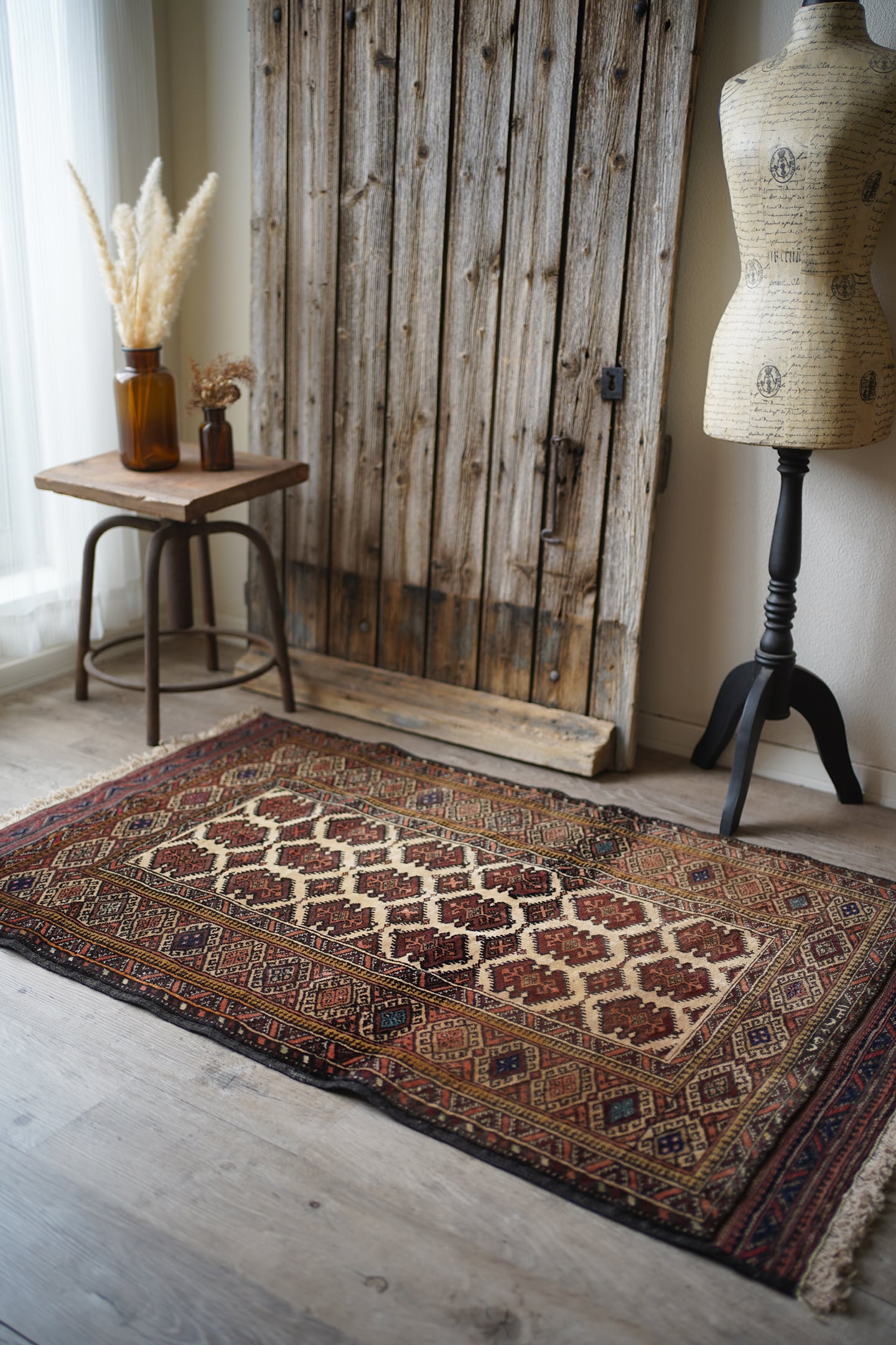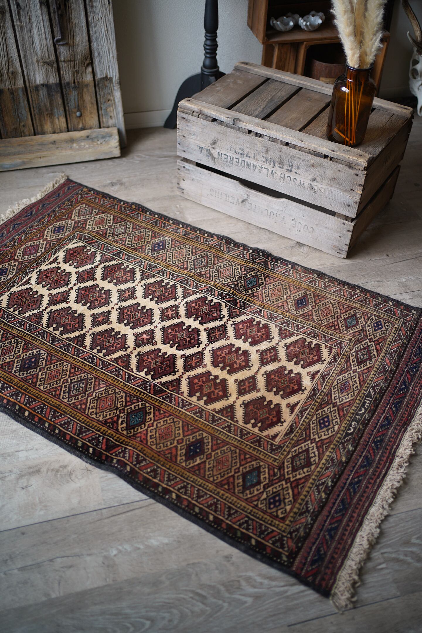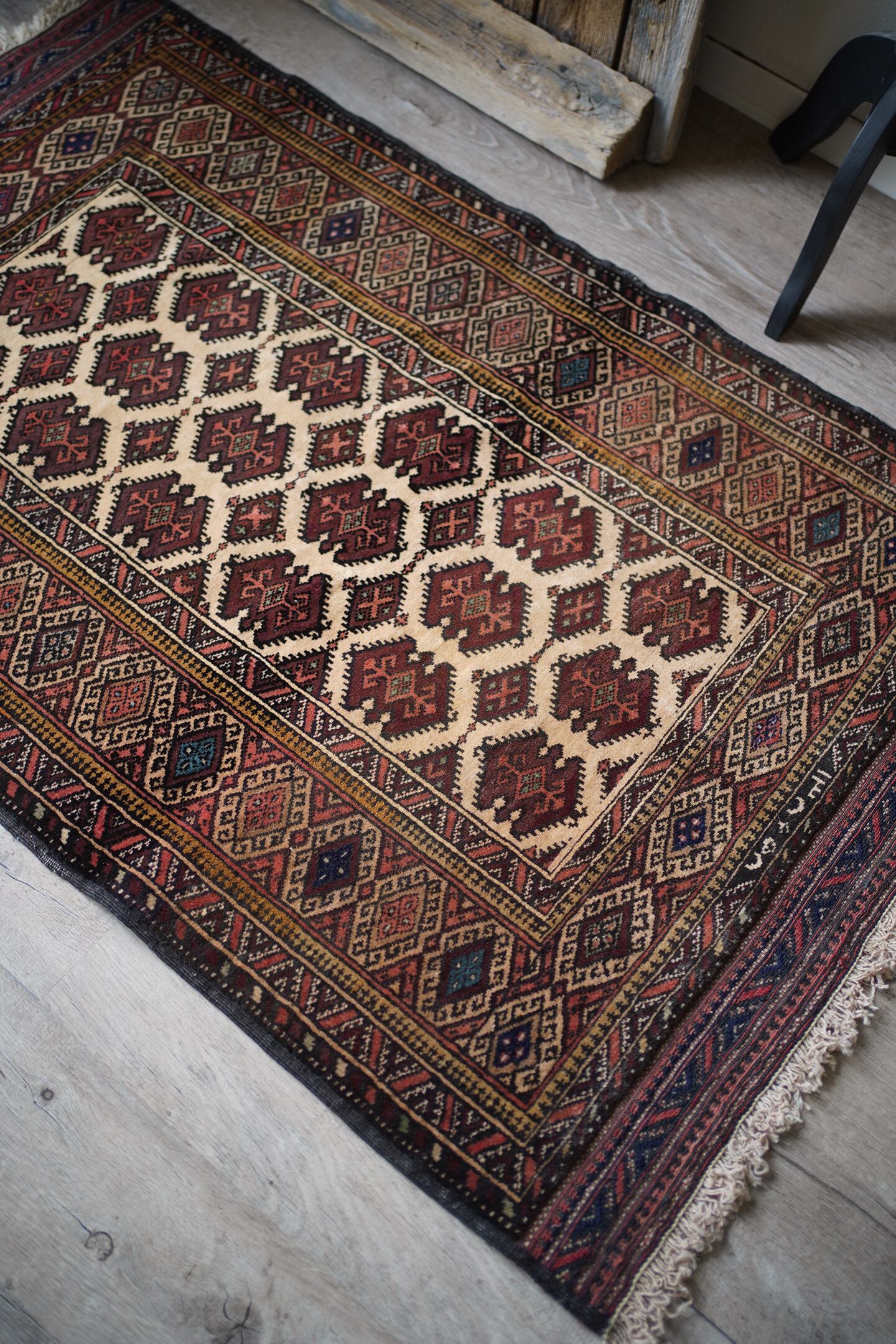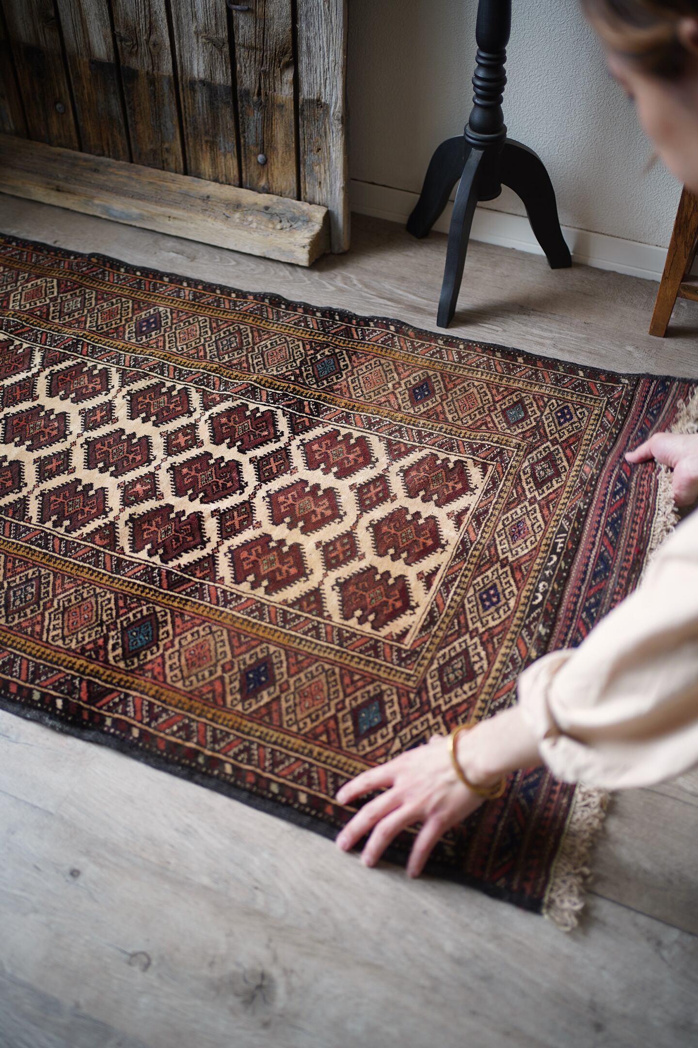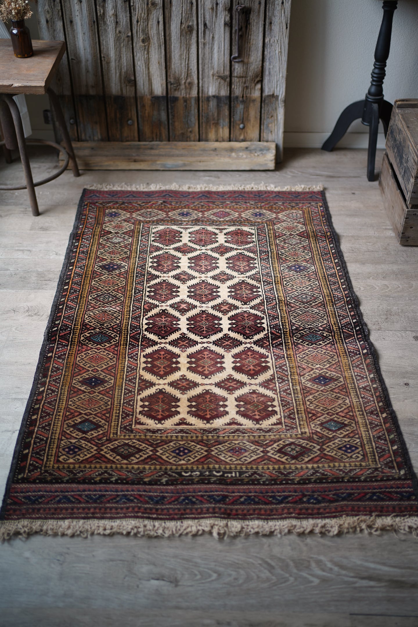 繊細な紋様とバランスの取れた色使いが素晴らしい経年約30年のアフガニスタン産のマリキバルーチラグ。ブラウンとベージュをベースカラーに、淡い赤や濃紺、濃いめのブルーグリーンなどが使われており、フリンジ部分は美しいキリムエンドで作られています。表面はふわっと柔らかい肌触りで、厚みは7mmと程よい厚さ。ほとんど気にならないレベルですが、フリンジが少しだけ短くなっている箇所がございますのでお写真最後にてご確認ください。それ以外は状態も良く、コンディションも大変良好です。様々なインテリアに合わせやすいカラーリングで、この1枚を敷くだけで圧倒的な存在感とカッコよさを醸し出してくれるはずです♫