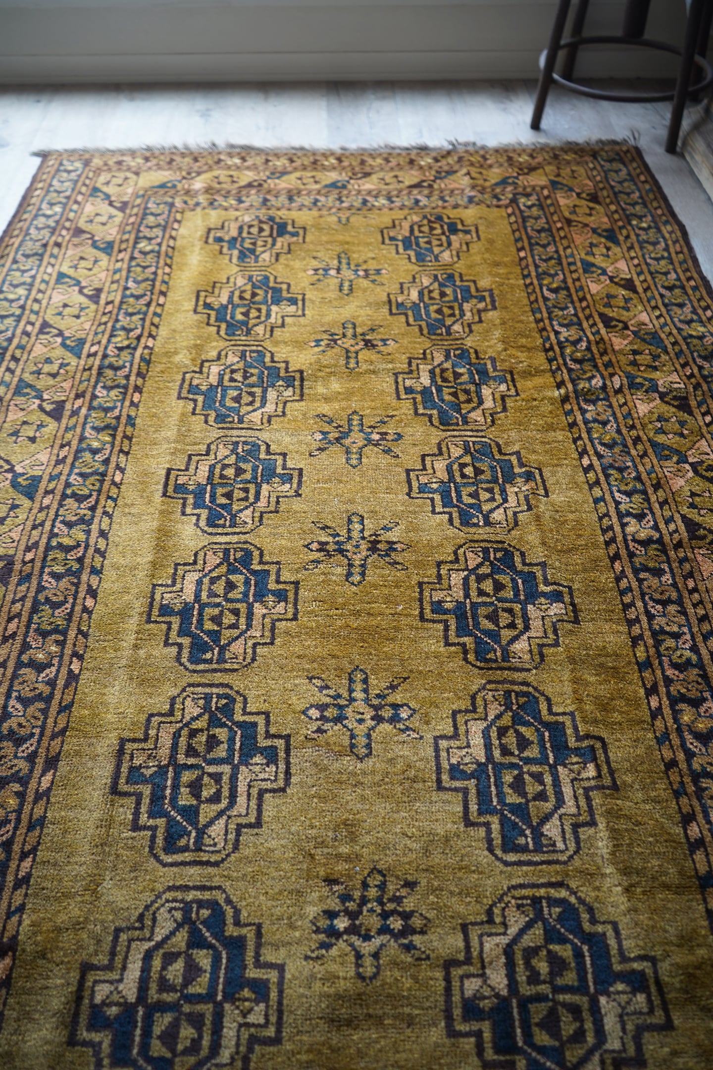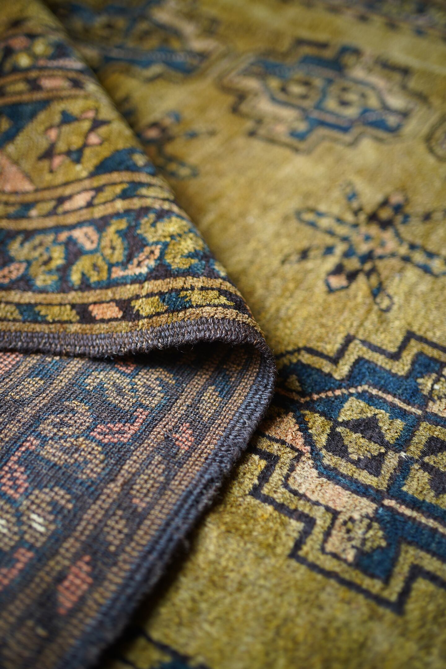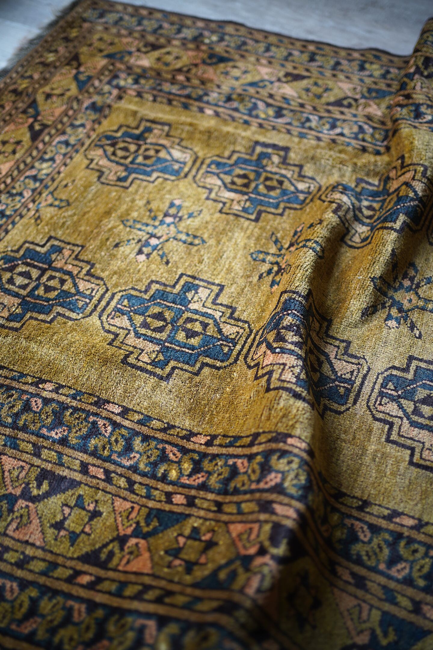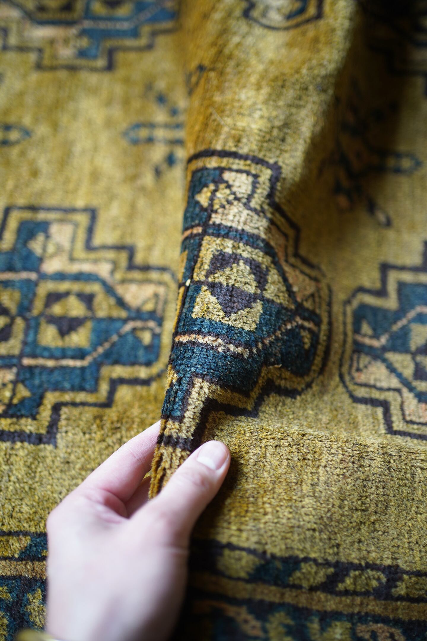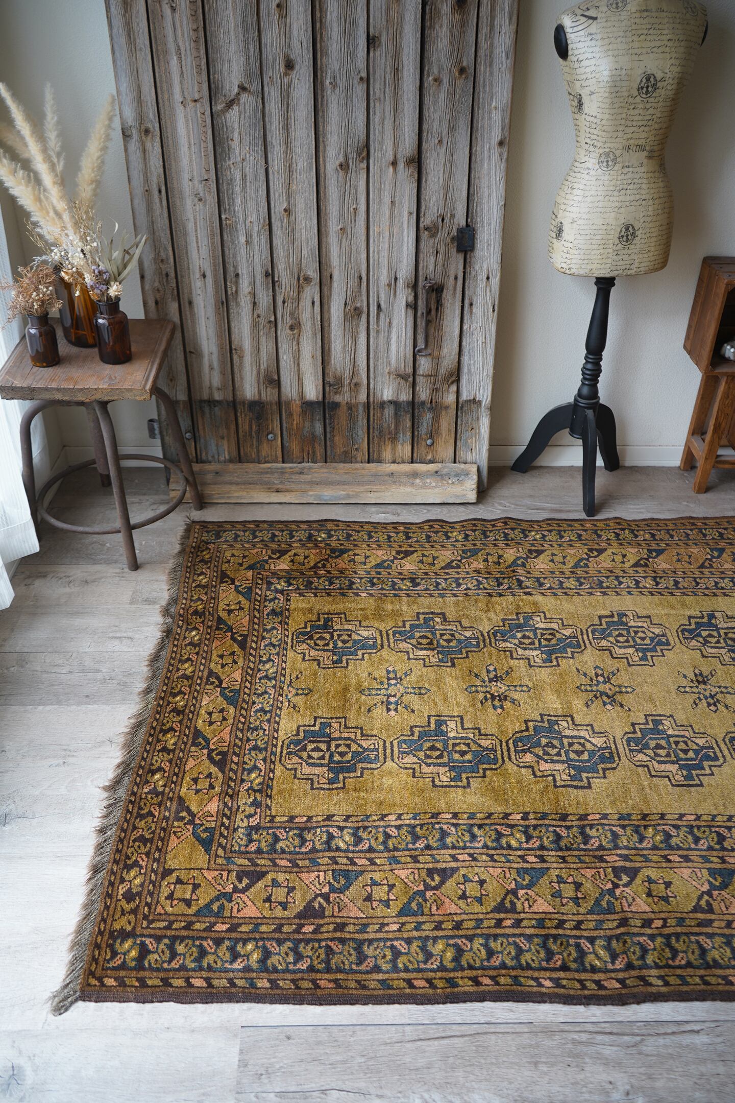 おおよそ90年前に織られたセミアンティークのトルクメンラグ。オリーブ色のような珍しいお色味で、大きなラグにはあまり使われないチュワルギュルが織り込まれた一枚。濃いめのブルーグリーン、退色した薄いオレンジ色も使われた配色で、全体的な色味のバランスが大変素晴らしい一枚。またパイルに光が差し込むと艶も出て、大変美しいです。サラッと滑らかな肌触りで、厚みは4mm〜5mm程度。一部補修した跡がございますが、よく見ないとほとんどわからない状態です(お写真最後をご参照ください)。ユニークなカラーのトルクメン、厚みや質感含めてこれからの季節にもピッタリですよ♫