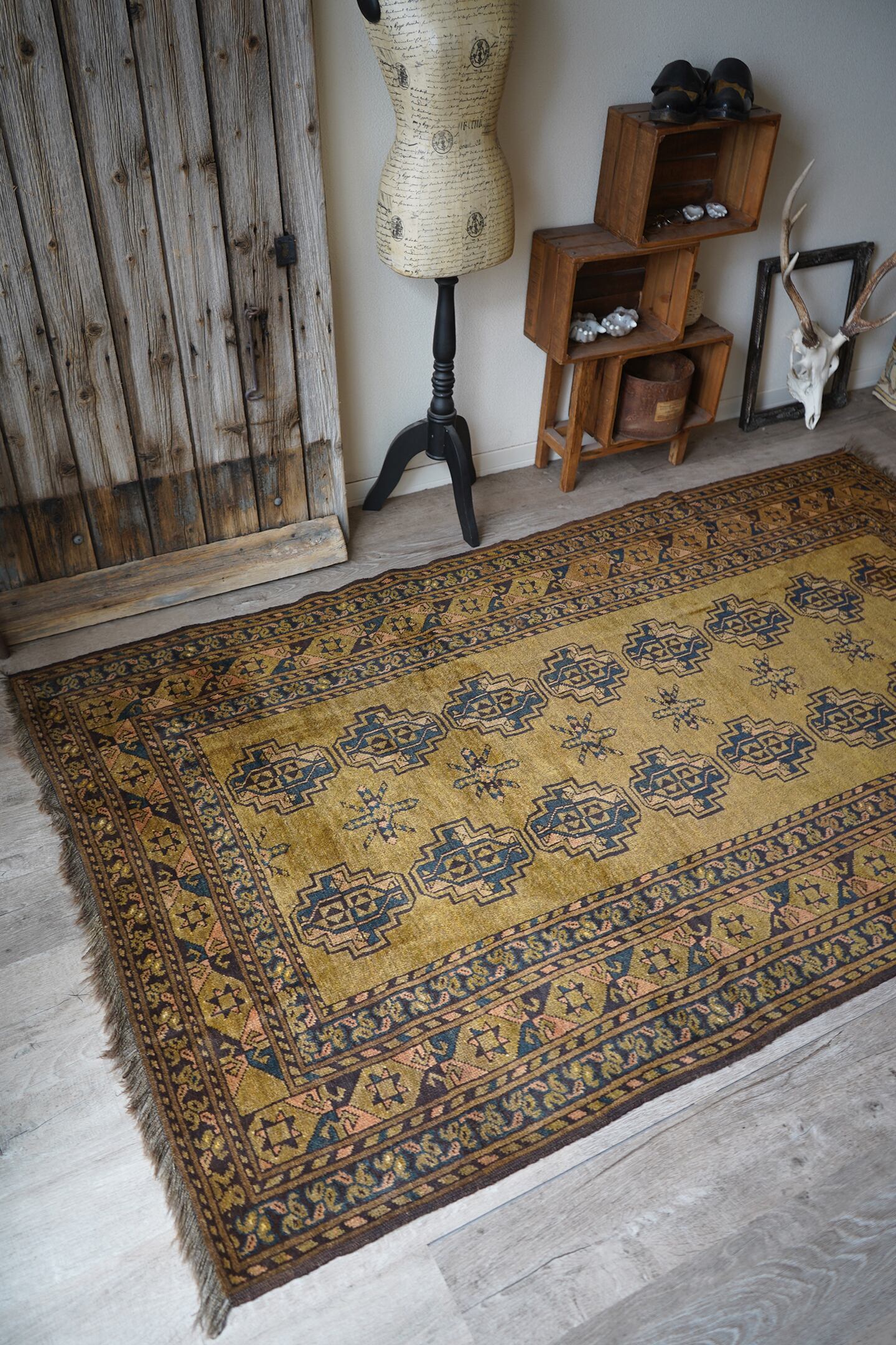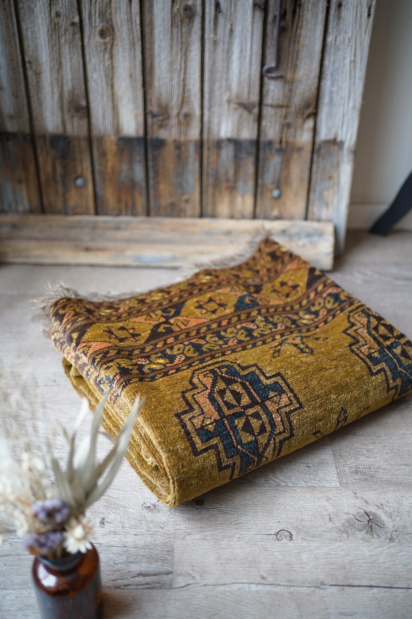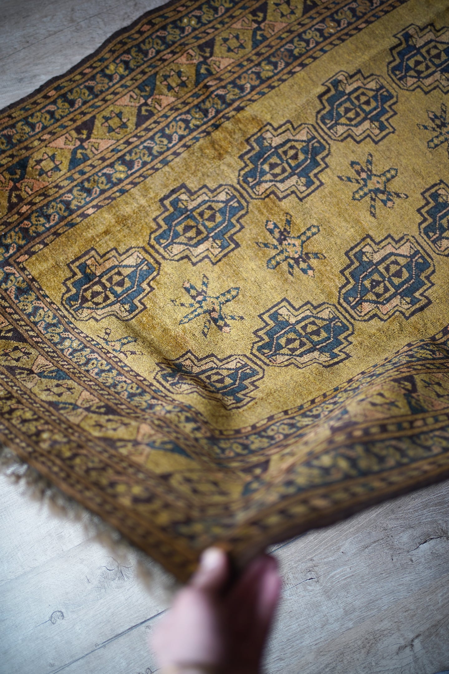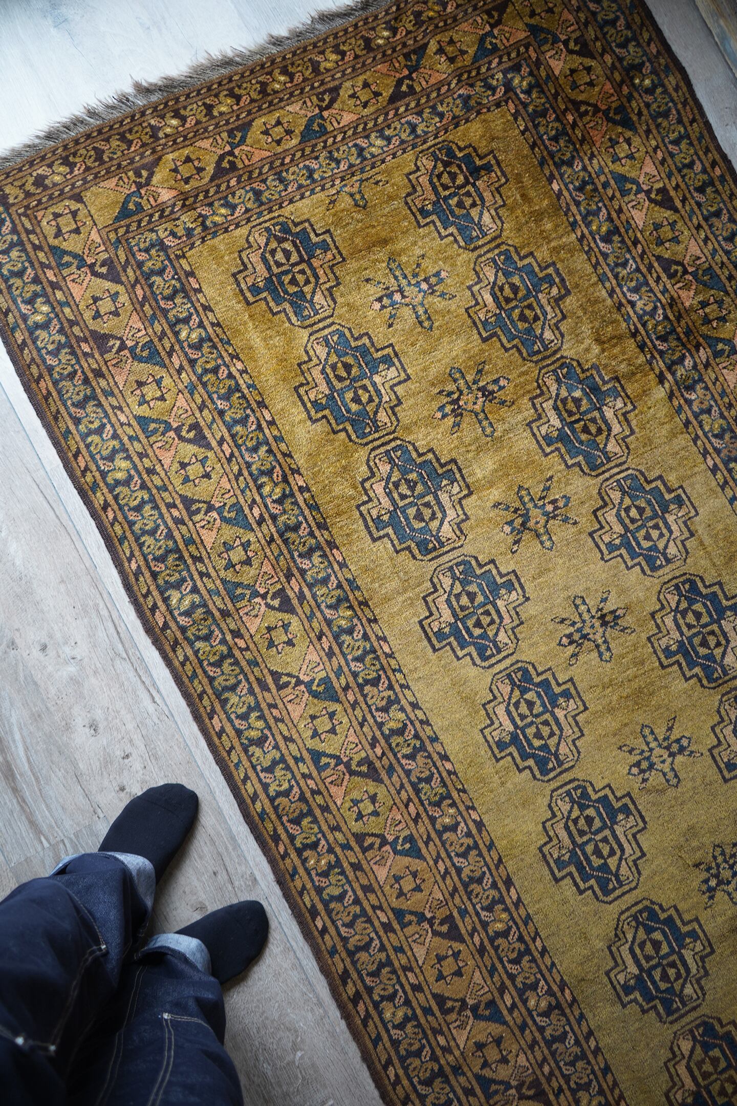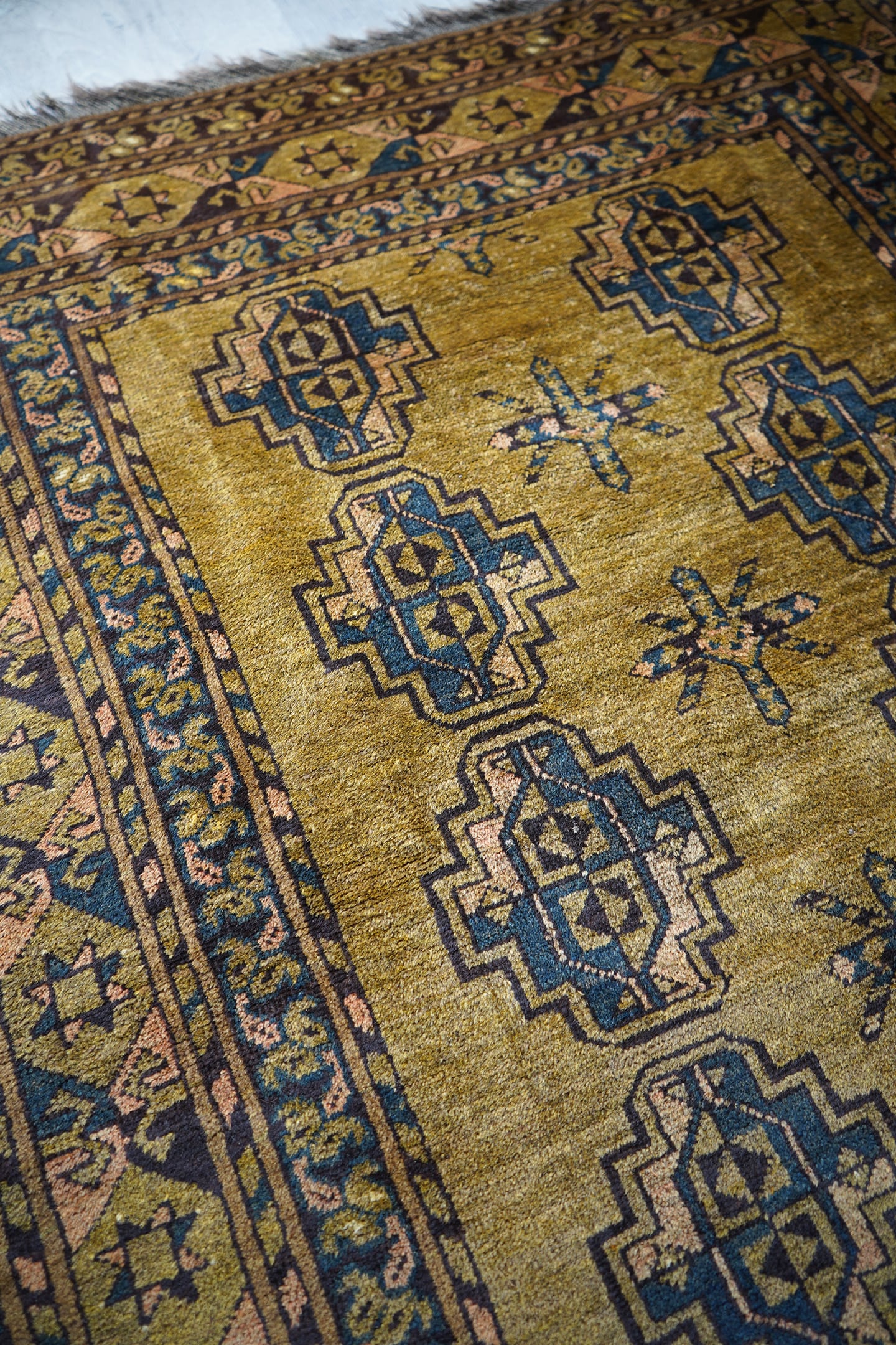 おおよそ90年前に織られたセミアンティークのトルクメンラグ。オリーブ色のような珍しいお色味で、大きなラグにはあまり使われないチュワルギュルが織り込まれた一枚。濃いめのブルーグリーン、退色した薄いオレンジ色も使われた配色で、全体的な色味のバランスが大変素晴らしい一枚。またパイルに光が差し込むと艶も出て、大変美しいです。サラッと滑らかな肌触りで、厚みは4mm〜5mm程度。一部補修した跡がございますが、よく見ないとほとんどわからない状態です(お写真最後をご参照ください)。ユニークなカラーのトルクメン、厚みや質感含めてこれからの季節にもピッタリですよ♫
