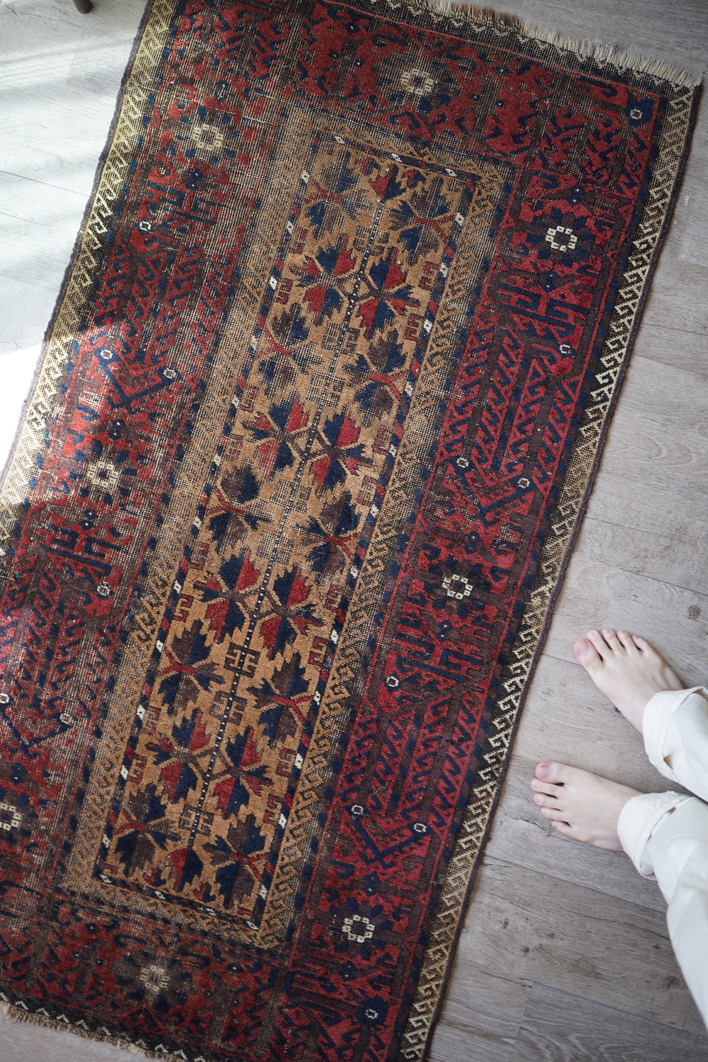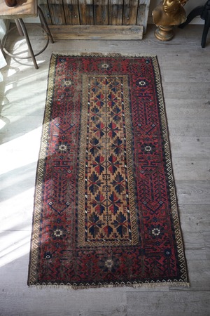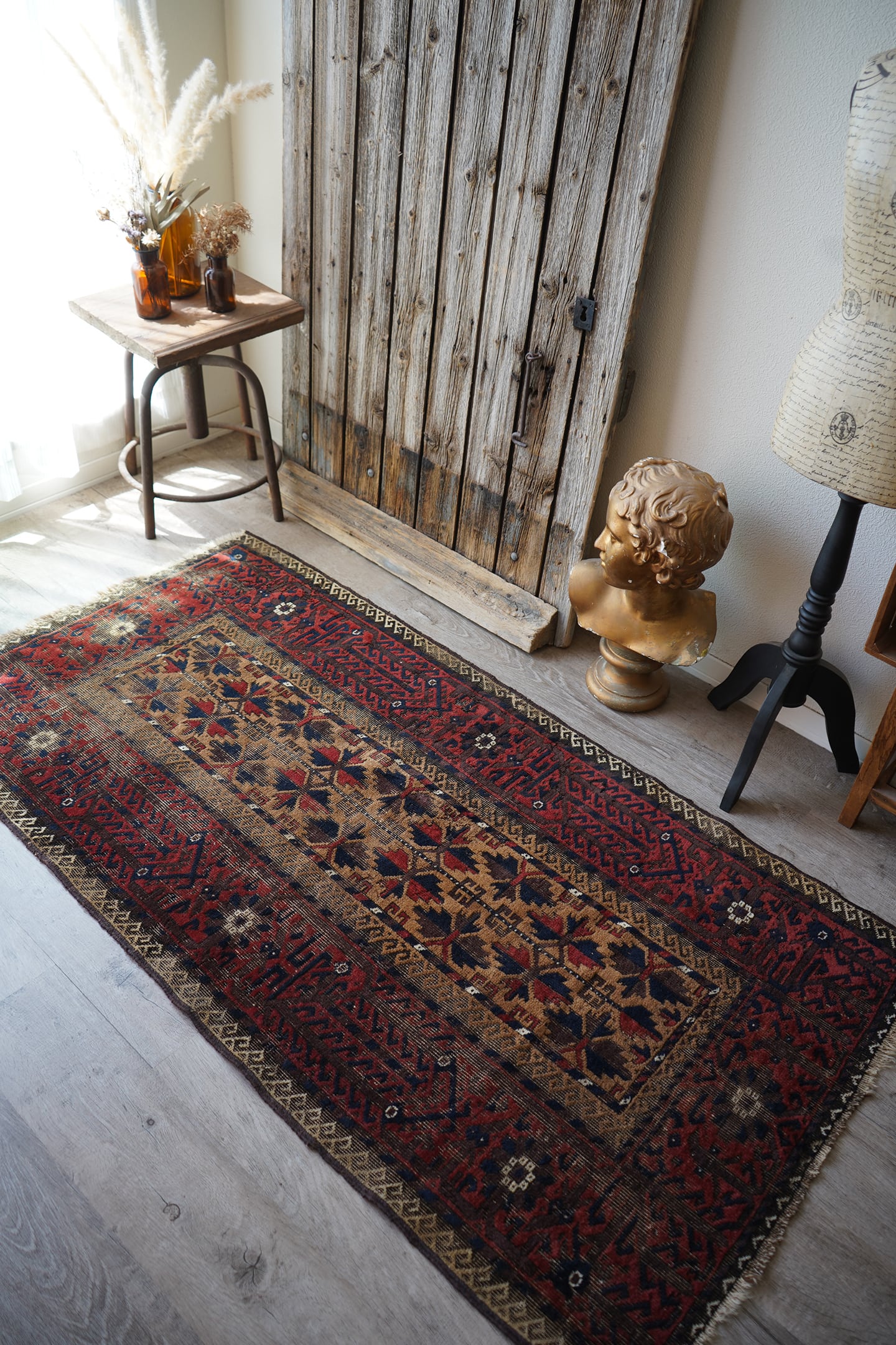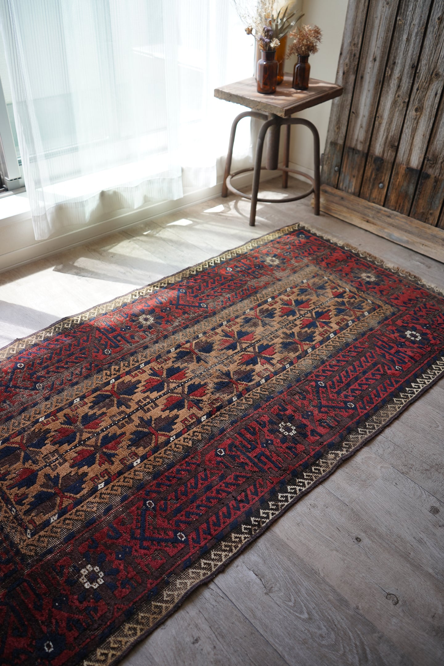 おおよそ110年前に織られたイラン産のアンティークのバルーチラグ。100年以上の経年を感じさせる擦れ感が素敵で、太めのボーダーにフィールドのチナール紋様が特徴的です。配色は落ち着いた赤色、紺、薄いブラウン。擦れによるパイルの抜けも目立ちますが、見た目とは裏腹に肌触りはふわっとしており、大変柔らかく優しいです。厚みは4mm程度で薄めとなります。アンティーク家具などとの相性も抜群かと思います。リビングをはじめ、寝室や書斎などにどうぞ♫