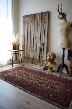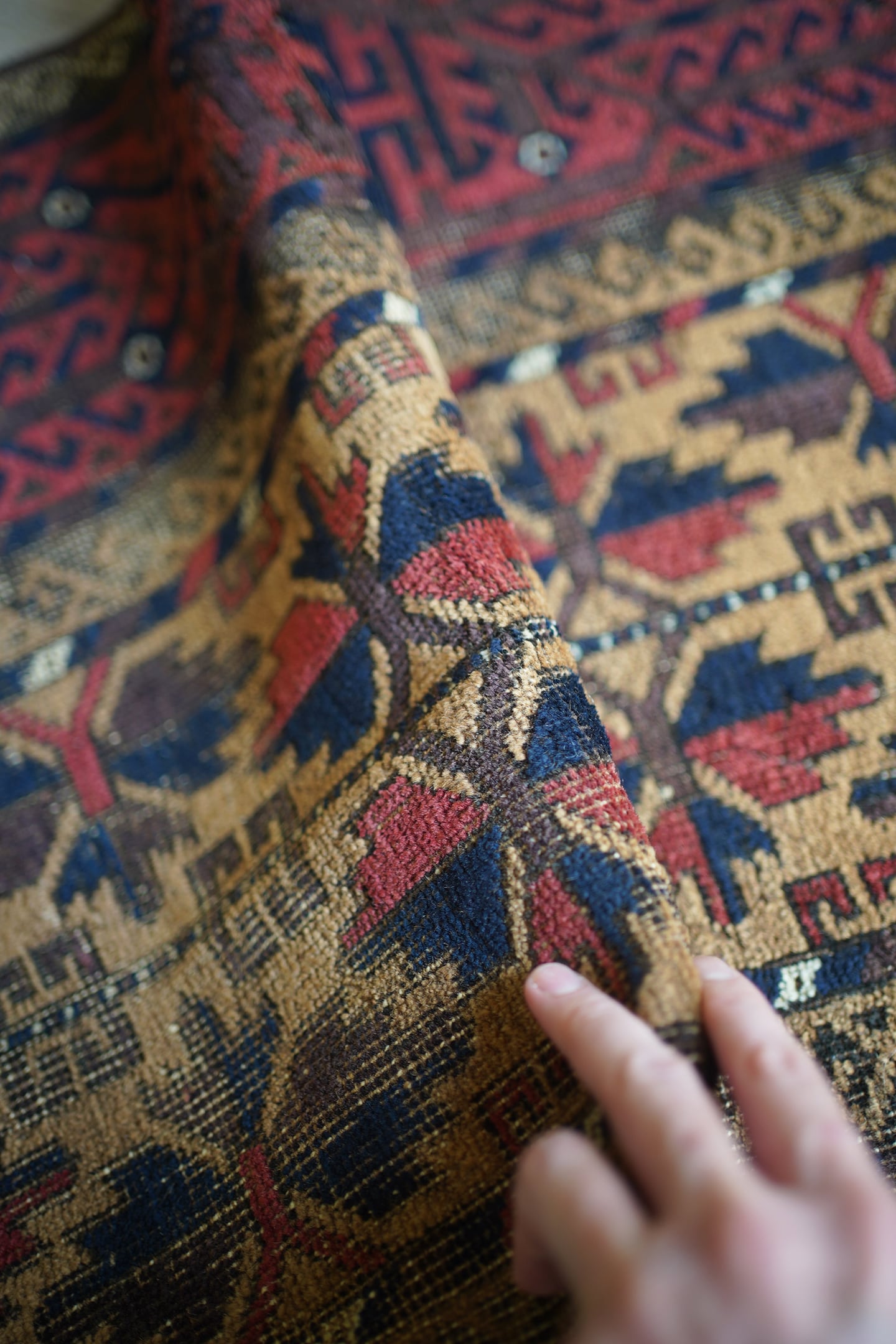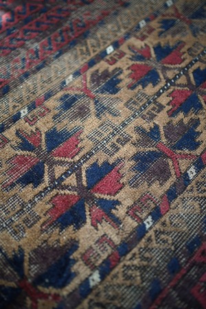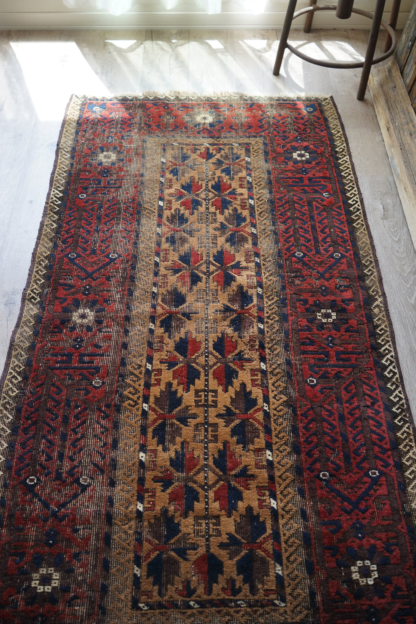 おおよそ110年前に織られたイラン産のアンティークのバルーチラグ。100年以上の経年を感じさせる擦れ感が素敵で、太めのボーダーにフィールドのチナール紋様が特徴的です。配色は落ち着いた赤色、紺、薄いブラウン。擦れによるパイルの抜けも目立ちますが、見た目とは裏腹に肌触りはふわっとしており、大変柔らかく優しいです。厚みは4mm程度で薄めとなります。アンティーク家具などとの相性も抜群かと思います。リビングをはじめ、寝室や書斎などにどうぞ♫