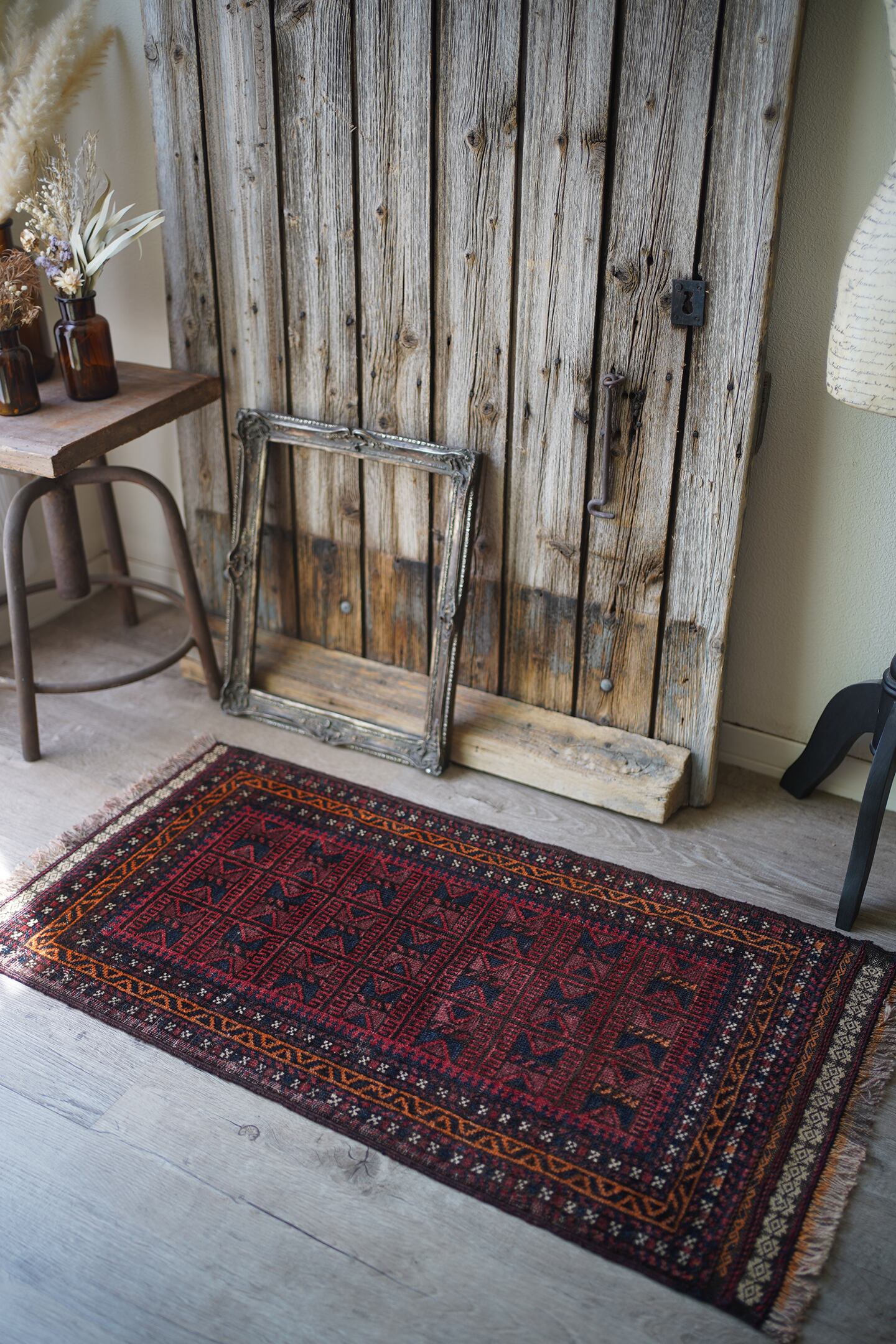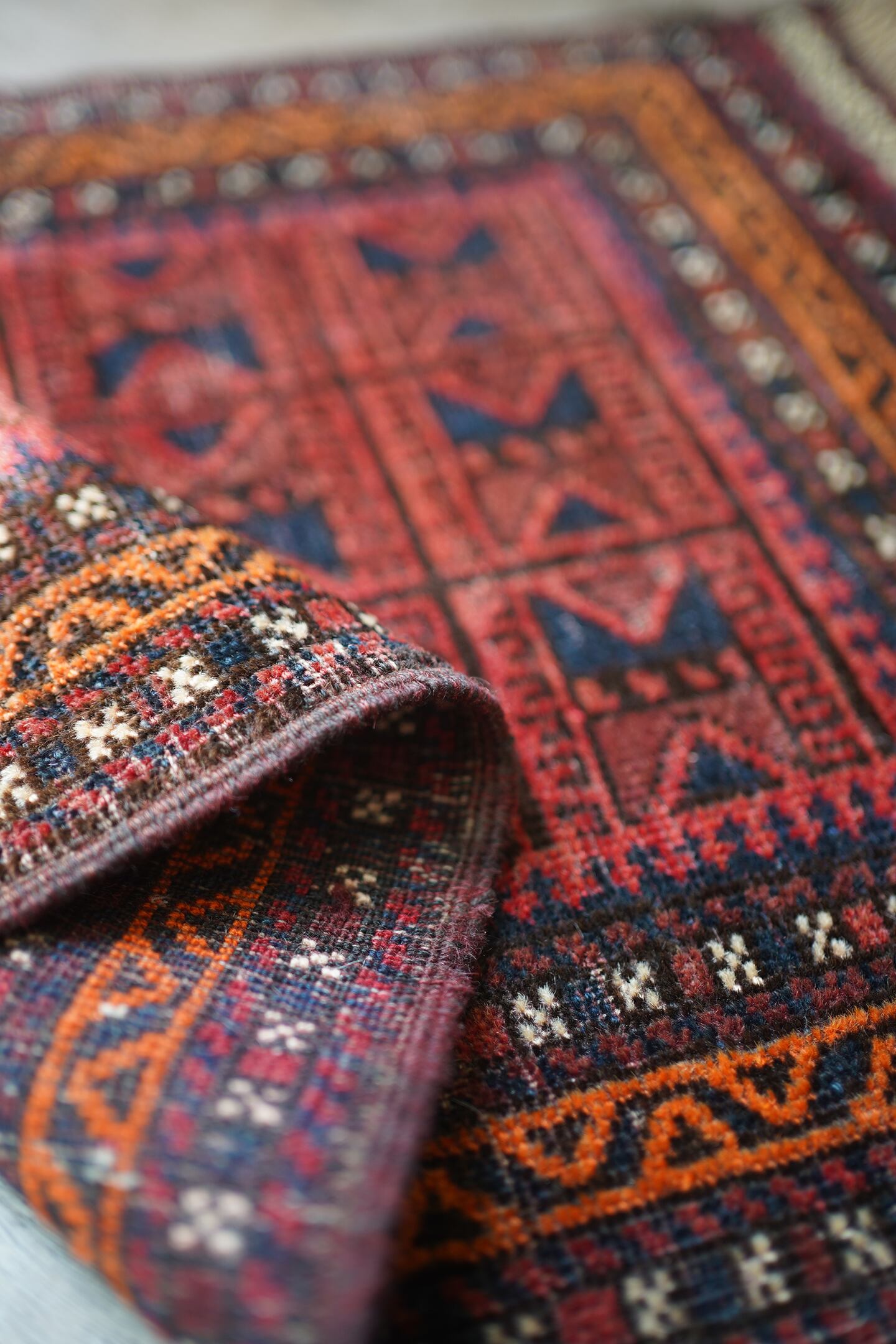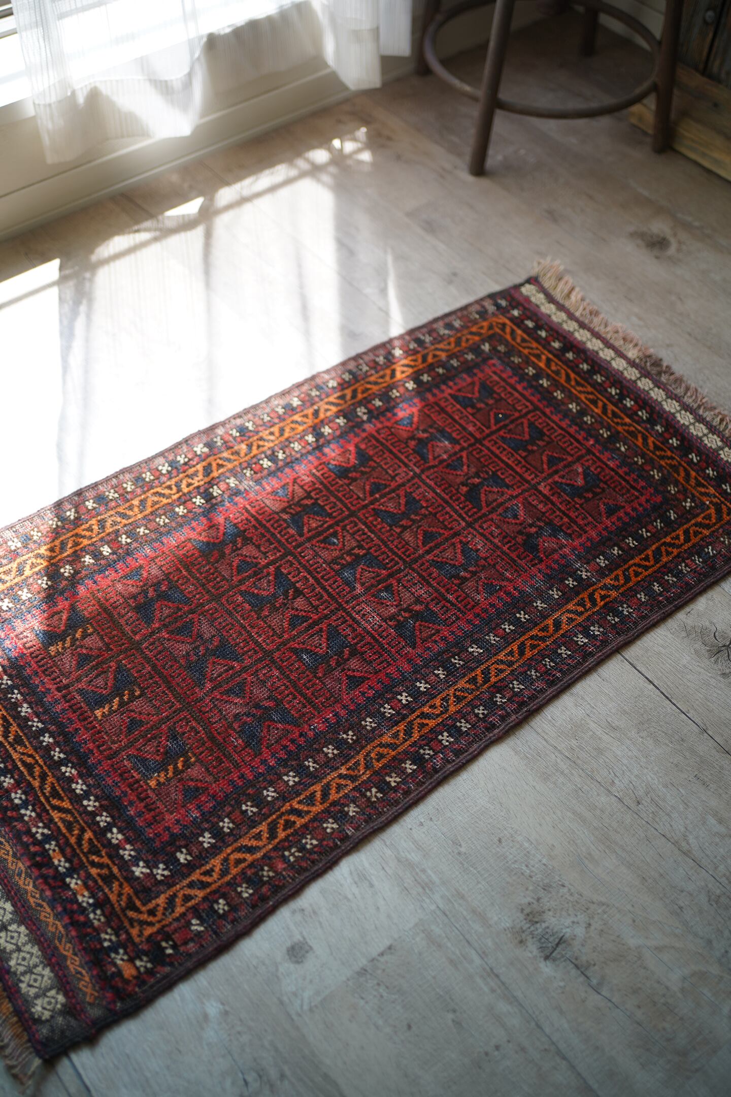 経年約50年ほどのアフガニスタ産のバルーチラグ。元々クッションカバーとして織られていたものを表面のみに加工して作成したラグとなります。落ち着いた赤色に黒と濃いめのブラウンの配色、綺麗に整ったデザインが美しく、フリンジ部分のキリムエンドも素敵な柄となっています。表面はサラッとした滑らかな肌触りで、厚みが4mm程度と薄めの質感です。パイルが薄くなっている箇所もありますが、全体的に馴染んでおり素敵な風合いになっています。お家の色んな場所に敷いてみて、ベストなポイントを探してみるのも楽しそうですね♫