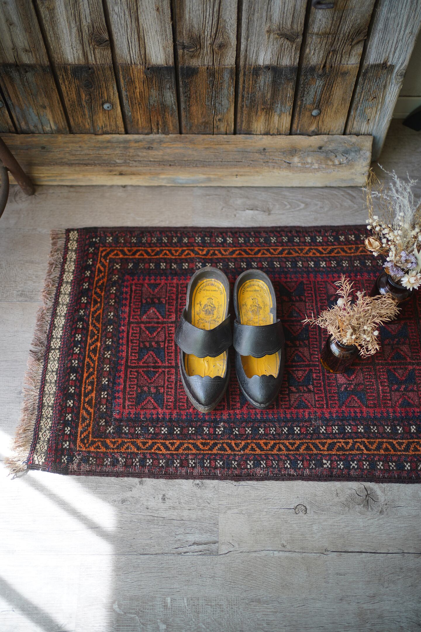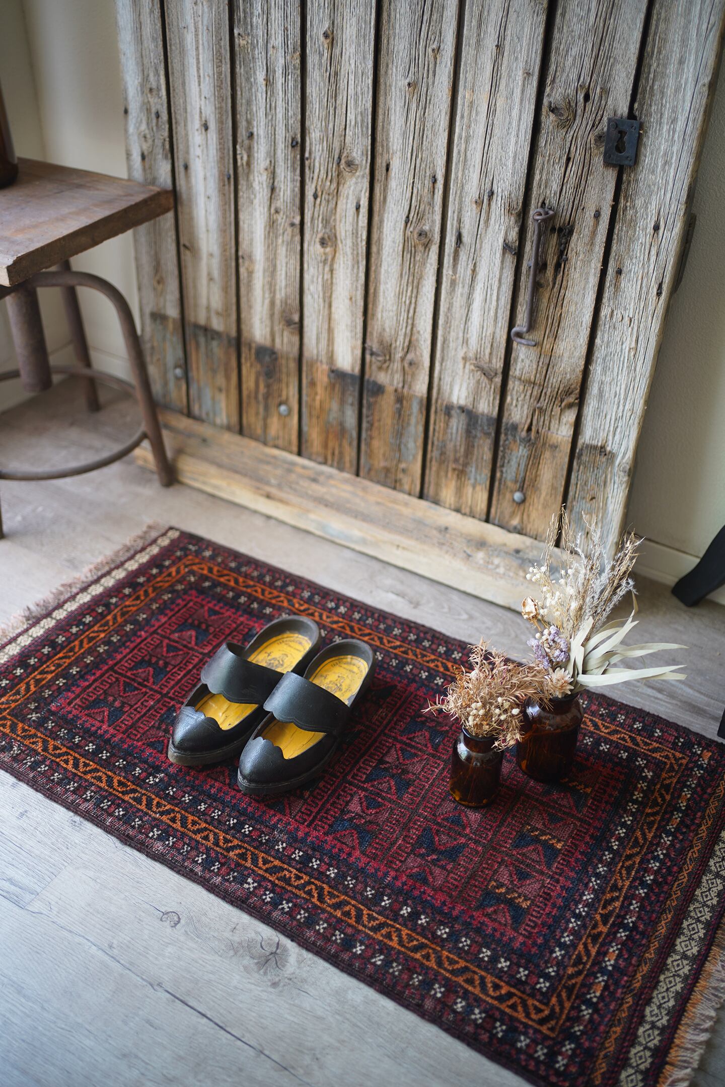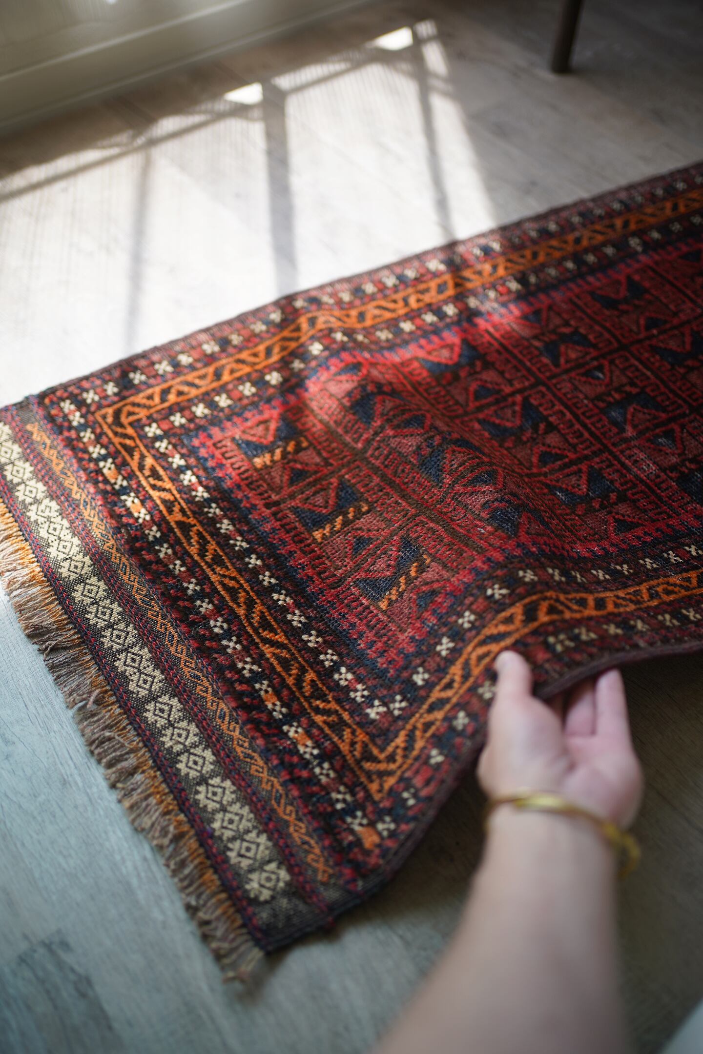 経年約50年ほどのアフガニスタ産のバルーチラグ。元々クッションカバーとして織られていたものを表面のみに加工して作成したラグとなります。落ち着いた赤色に黒と濃いめのブラウンの配色、綺麗に整ったデザインが美しく、フリンジ部分のキリムエンドも素敵な柄となっています。表面はサラッとした滑らかな肌触りで、厚みが4mm程度と薄めの質感です。パイルが薄くなっている箇所もありますが、全体的に馴染んでおり素敵な風合いになっています。お家の色んな場所に敷いてみて、ベストなポイントを探してみるのも楽しそうですね♫
