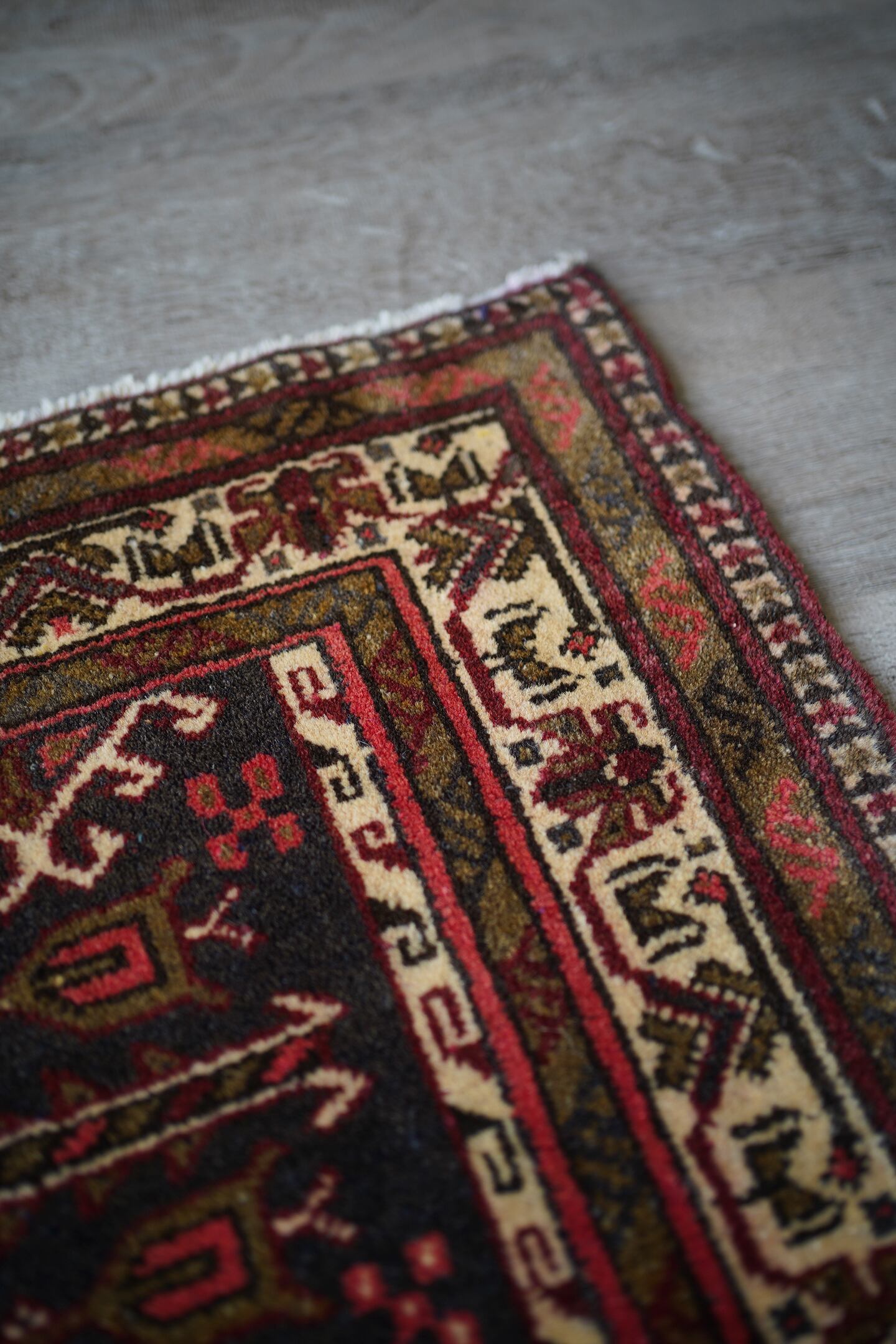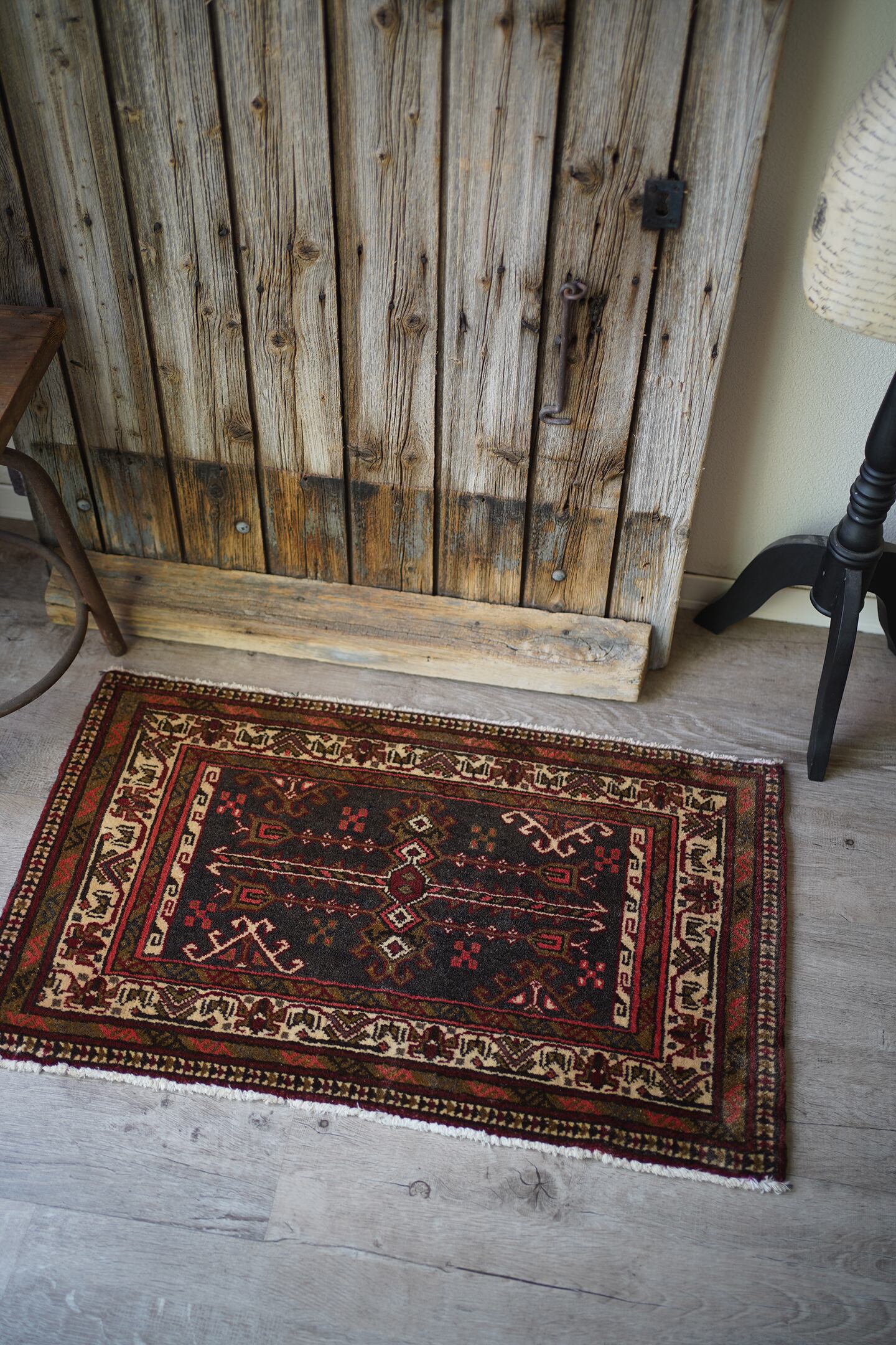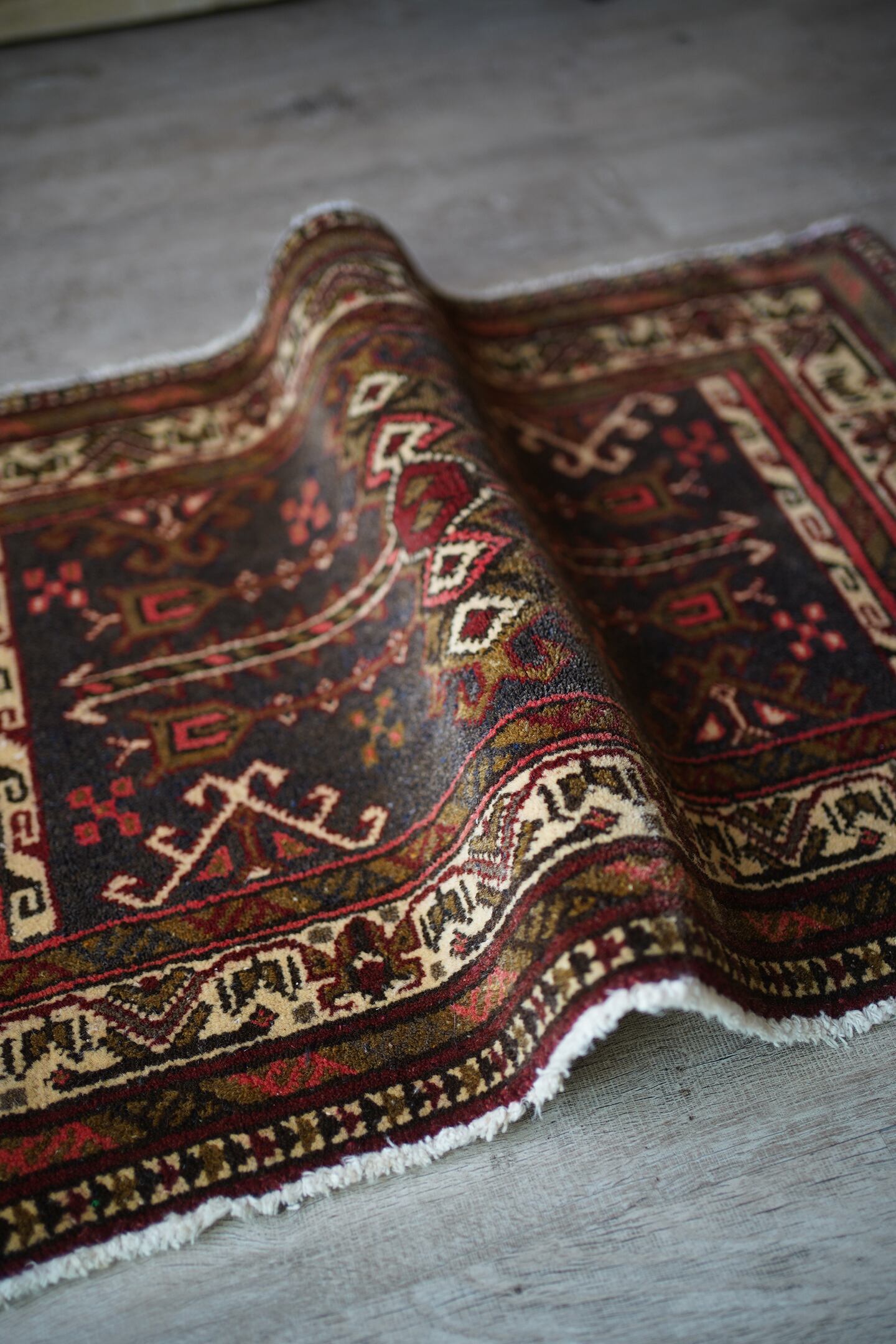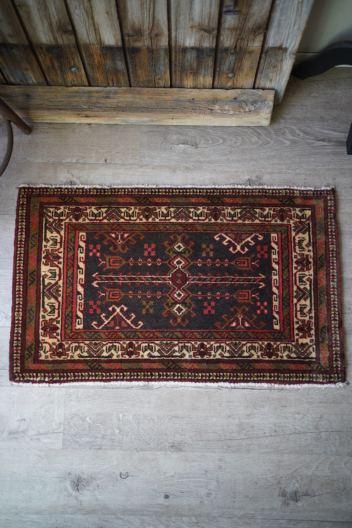 おおよそ40年前に織られたアフガニスタン産のトルクメンラグ。薄い黒とベージュに、焦茶と薄めの赤色の配色で、落ち着いたカラーリングで色んなインテリアに合わせやすいかと思います。目の詰まった毛足が長めのラグで、厚みも1cm程度あり、ふかふかの質感です。ダメージもなく、状態も大変良好。玄関や洗面所、全身鏡の前など様々な場所にどうぞ♫