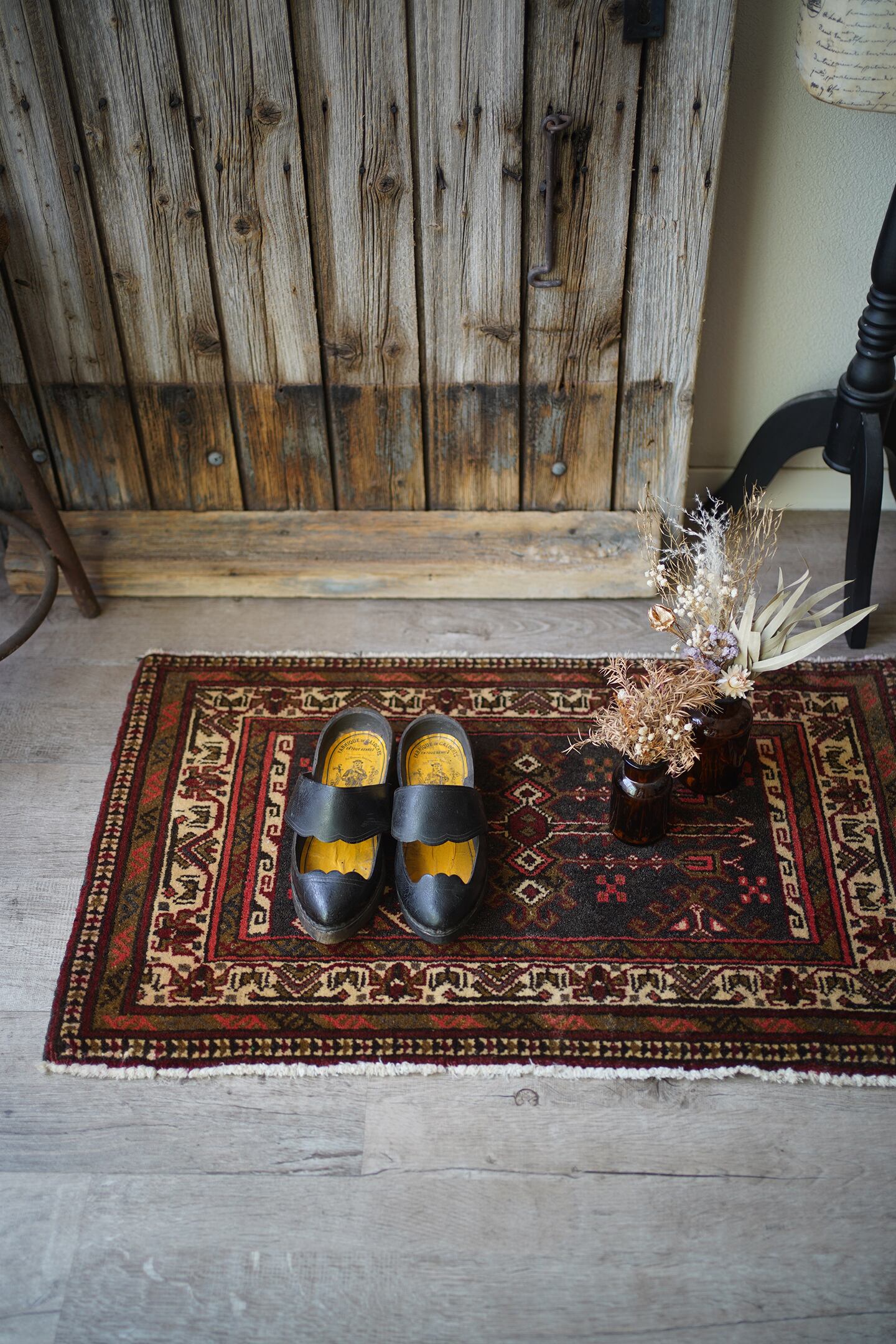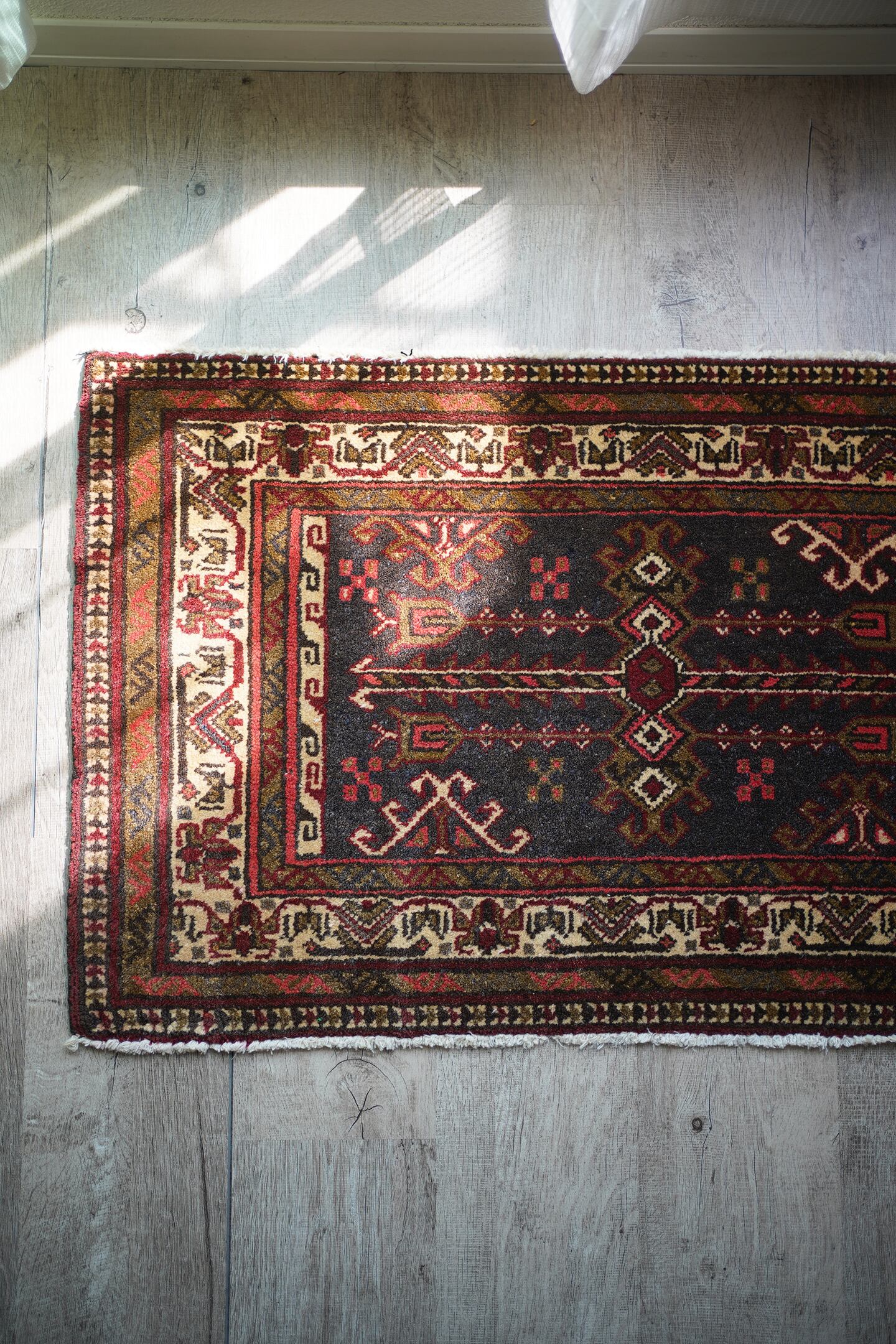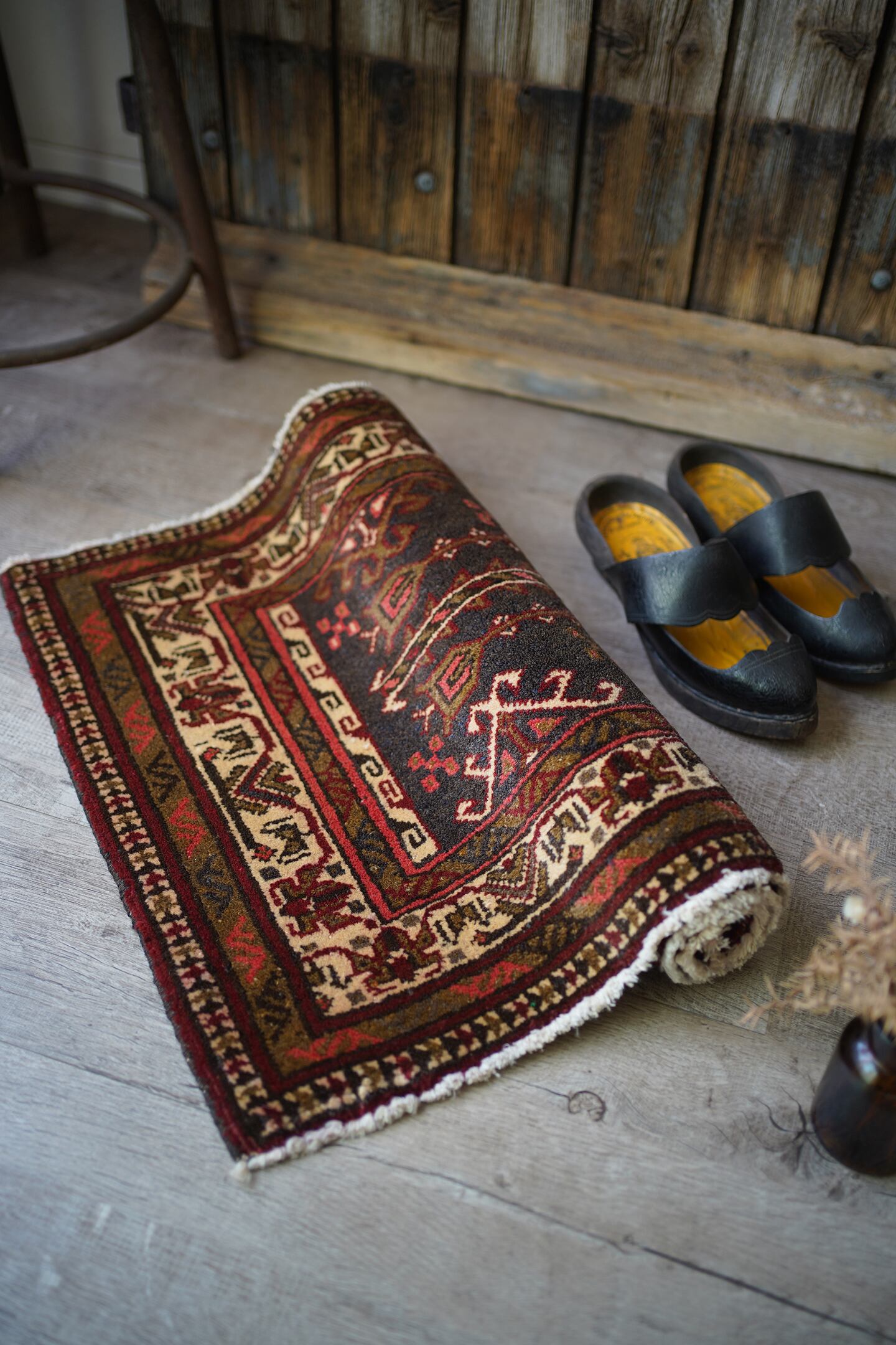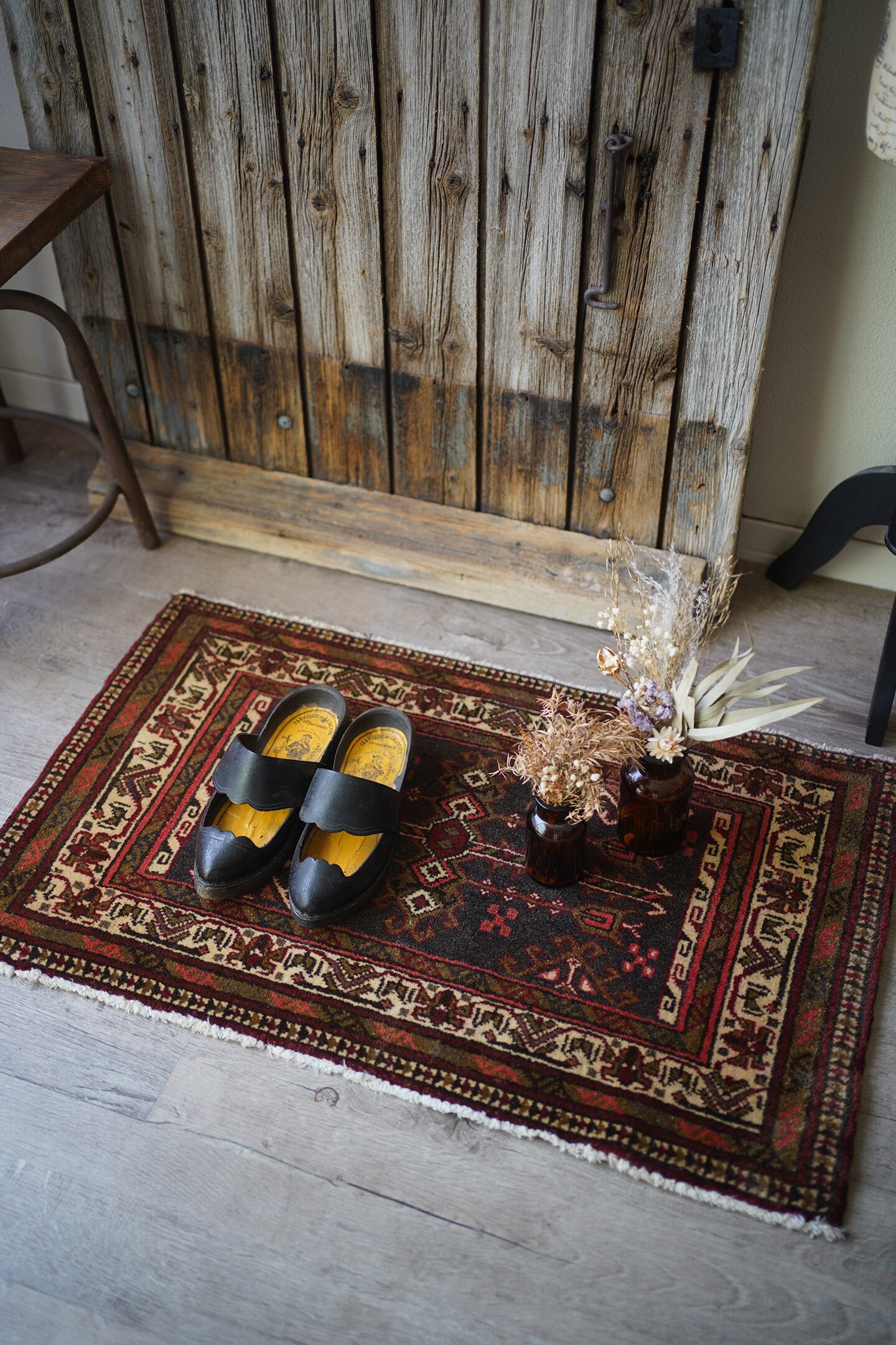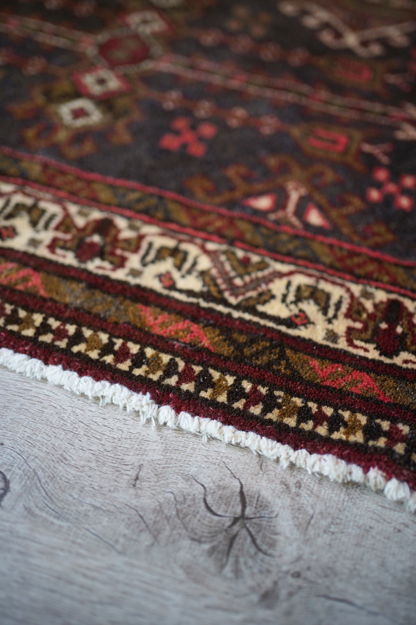 おおよそ40年前に織られたアフガニスタン産のトルクメンラグ。薄い黒とベージュに、焦茶と薄めの赤色の配色で、落ち着いたカラーリングで色んなインテリアに合わせやすいかと思います。目の詰まった毛足が長めのラグで、厚みも1cm程度あり、ふかふかの質感です。ダメージもなく、状態も大変良好。玄関や洗面所、全身鏡の前など様々な場所にどうぞ♫