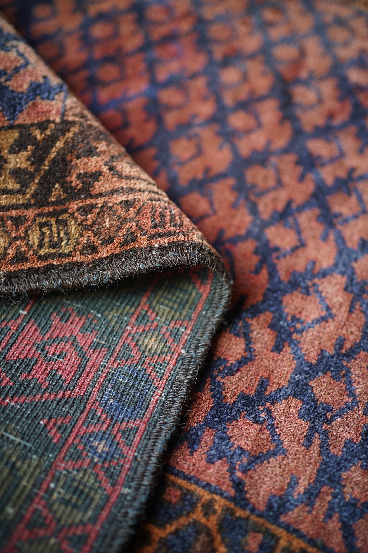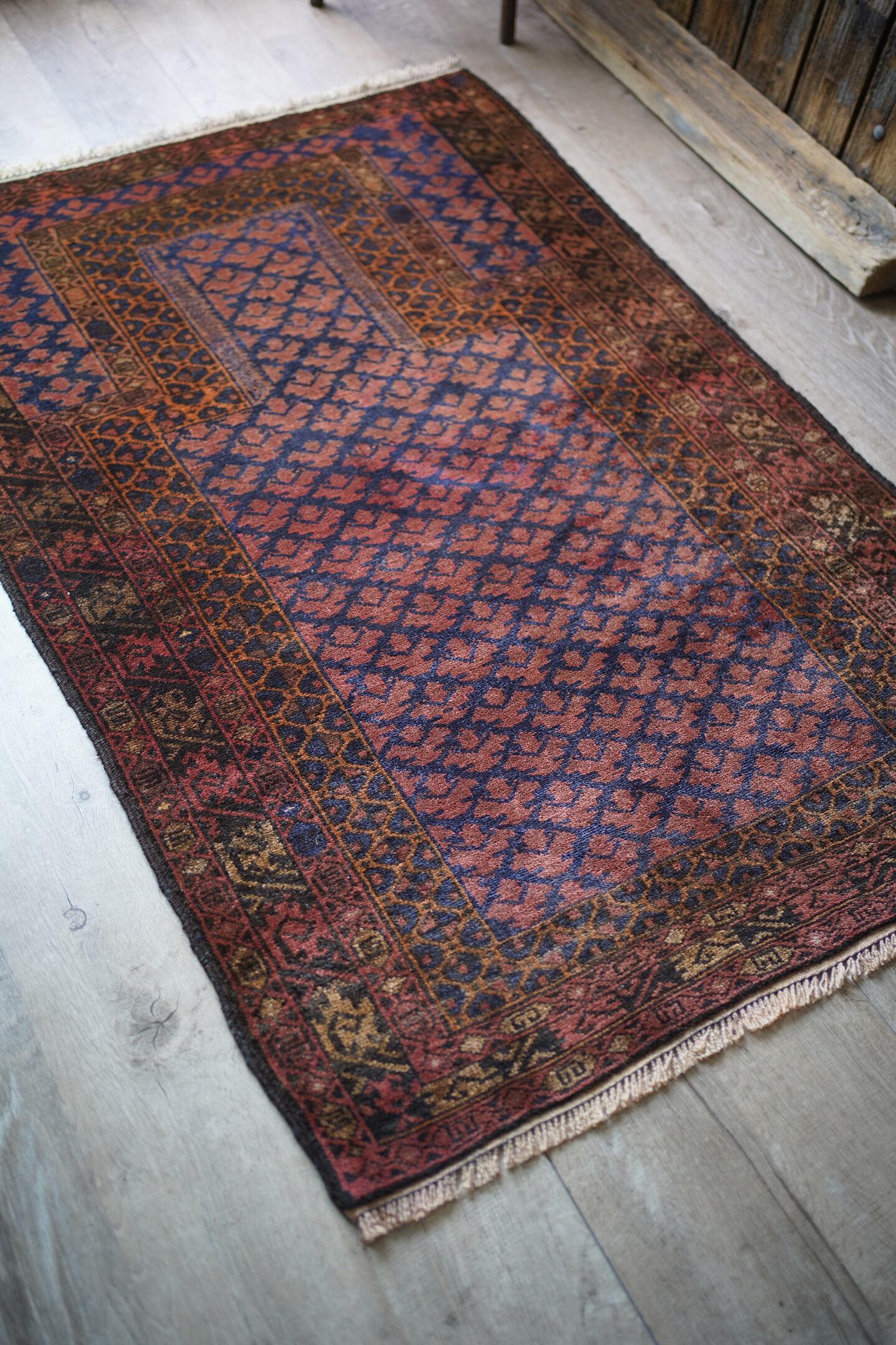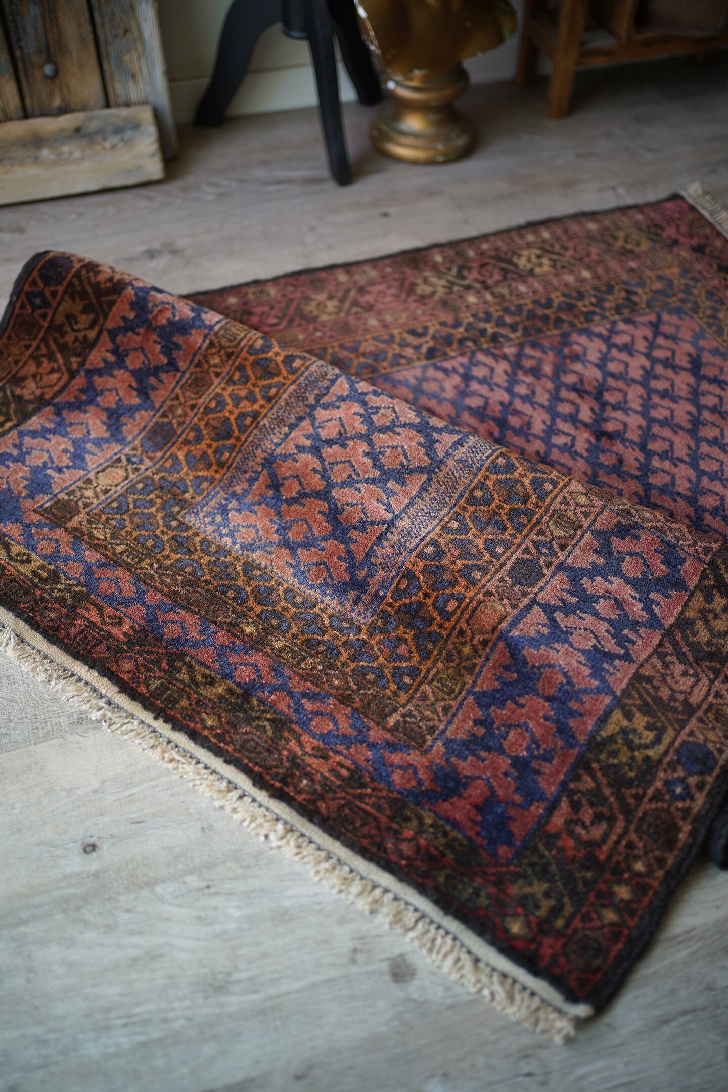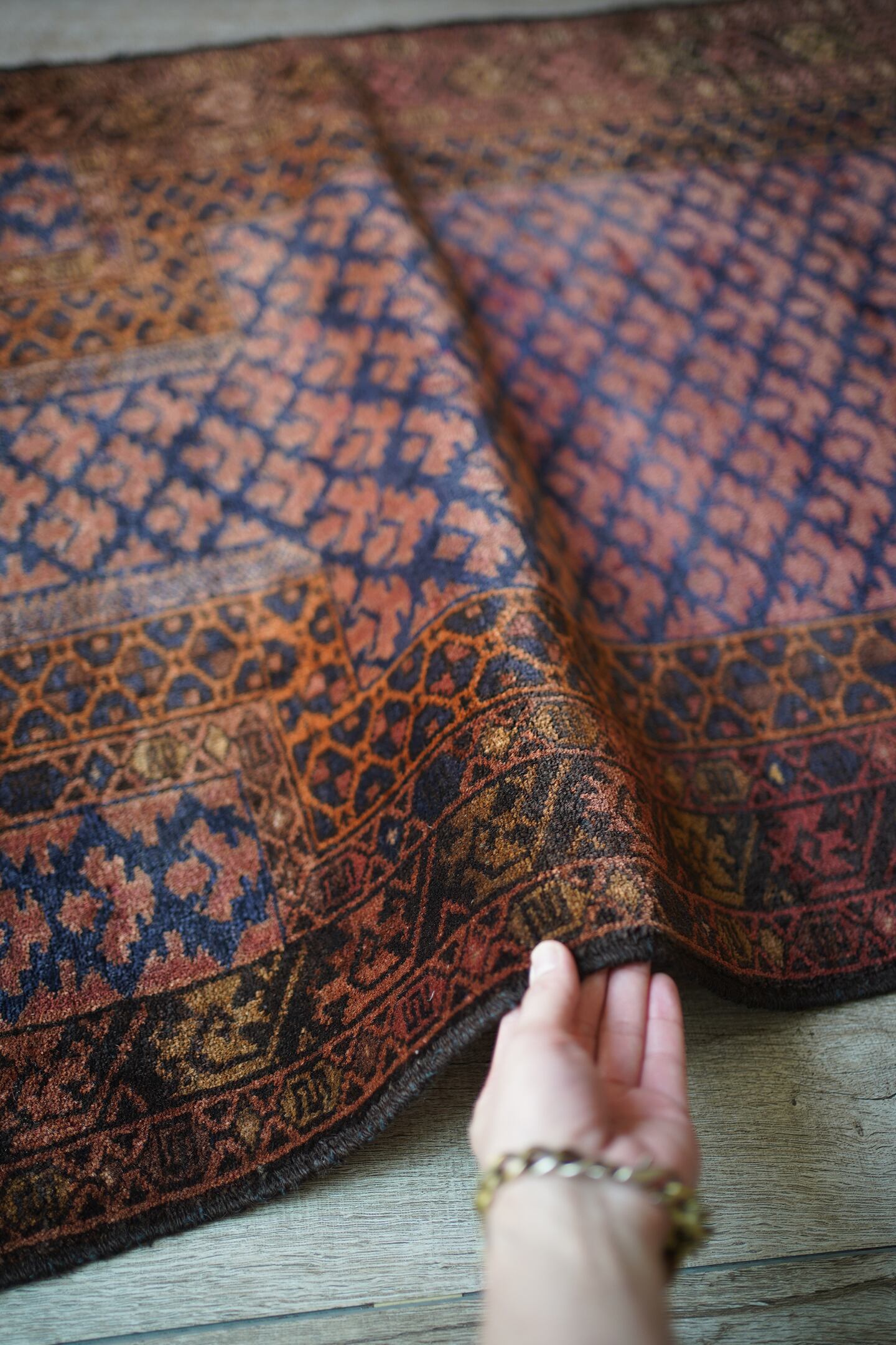 おおよそ35年前にバルーチ族によって織られたプレイヤーラグです。テラコッタ色にも見えるブラウン色に、ネイビーの落ち着いた色味の配色が素敵な一枚で、全体的に艶も見受けられる大変美しい一枚です。ふわサラッとした滑らかな肌触りで、厚みは7mm程度。目立ったダメージもなく、コンディションも大変良好です。店主お気に入りのオススメのラグです♫