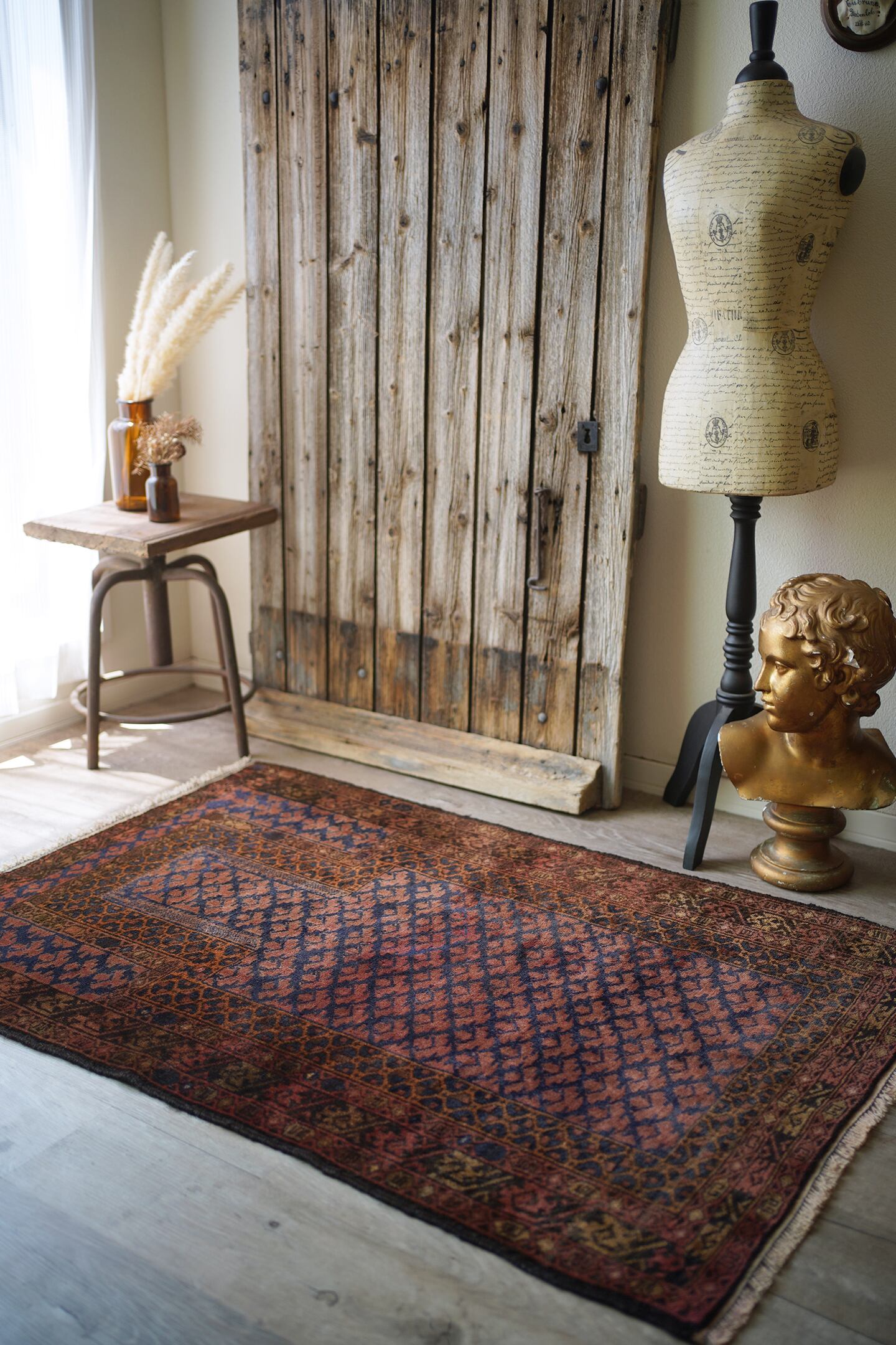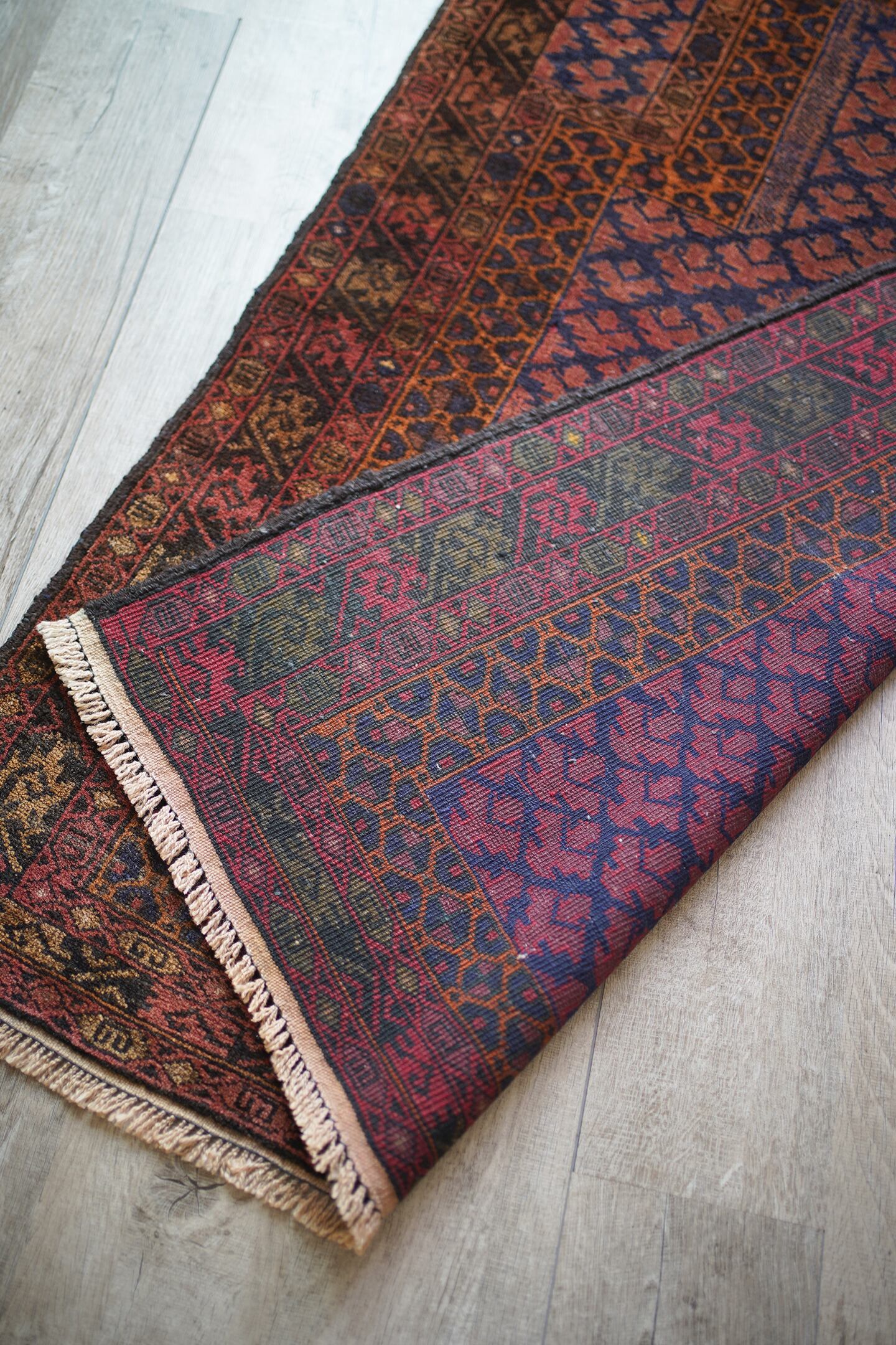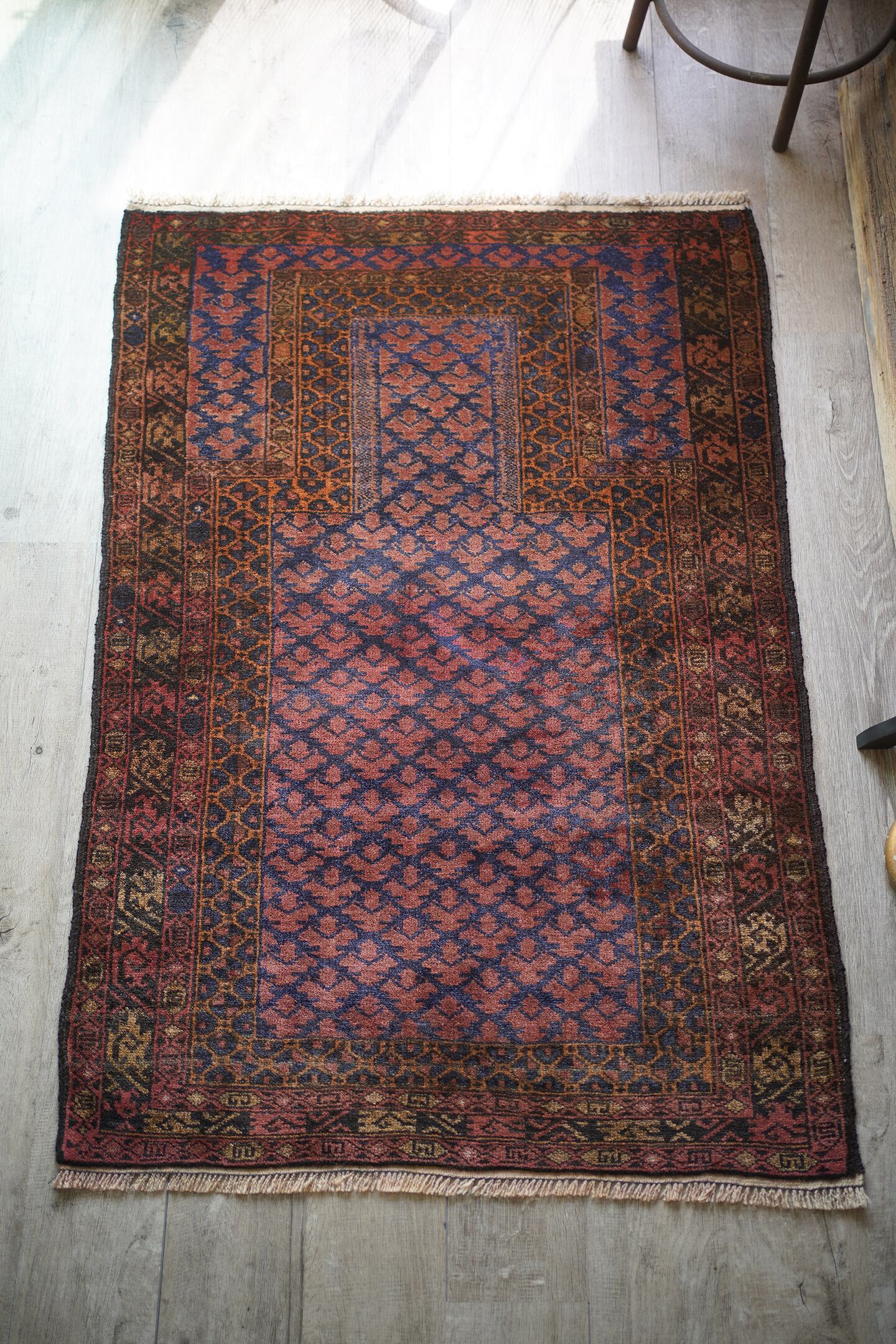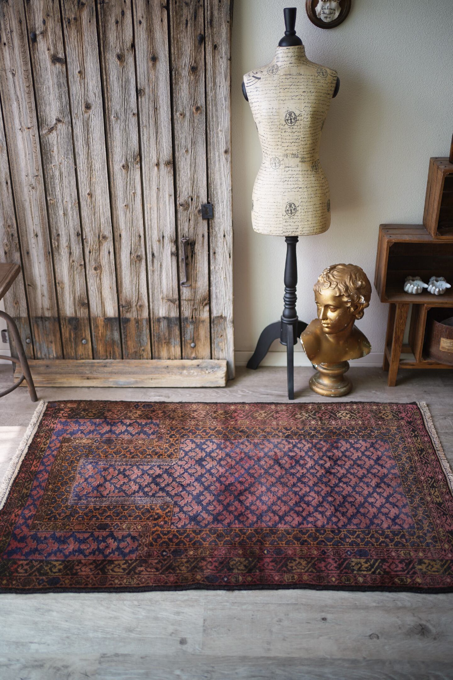 おおよそ35年前にバルーチ族によって織られたプレイヤーラグです。テラコッタ色にも見えるブラウン色に、ネイビーの落ち着いた色味の配色が素敵な一枚で、全体的に艶も見受けられる大変美しい一枚です。ふわサラッとした滑らかな肌触りで、厚みは7mm程度。目立ったダメージもなく、コンディションも大変良好です。店主お気に入りのオススメのラグです♫