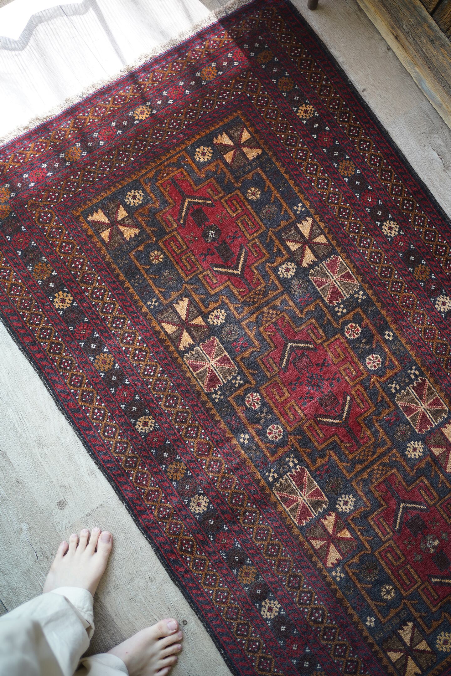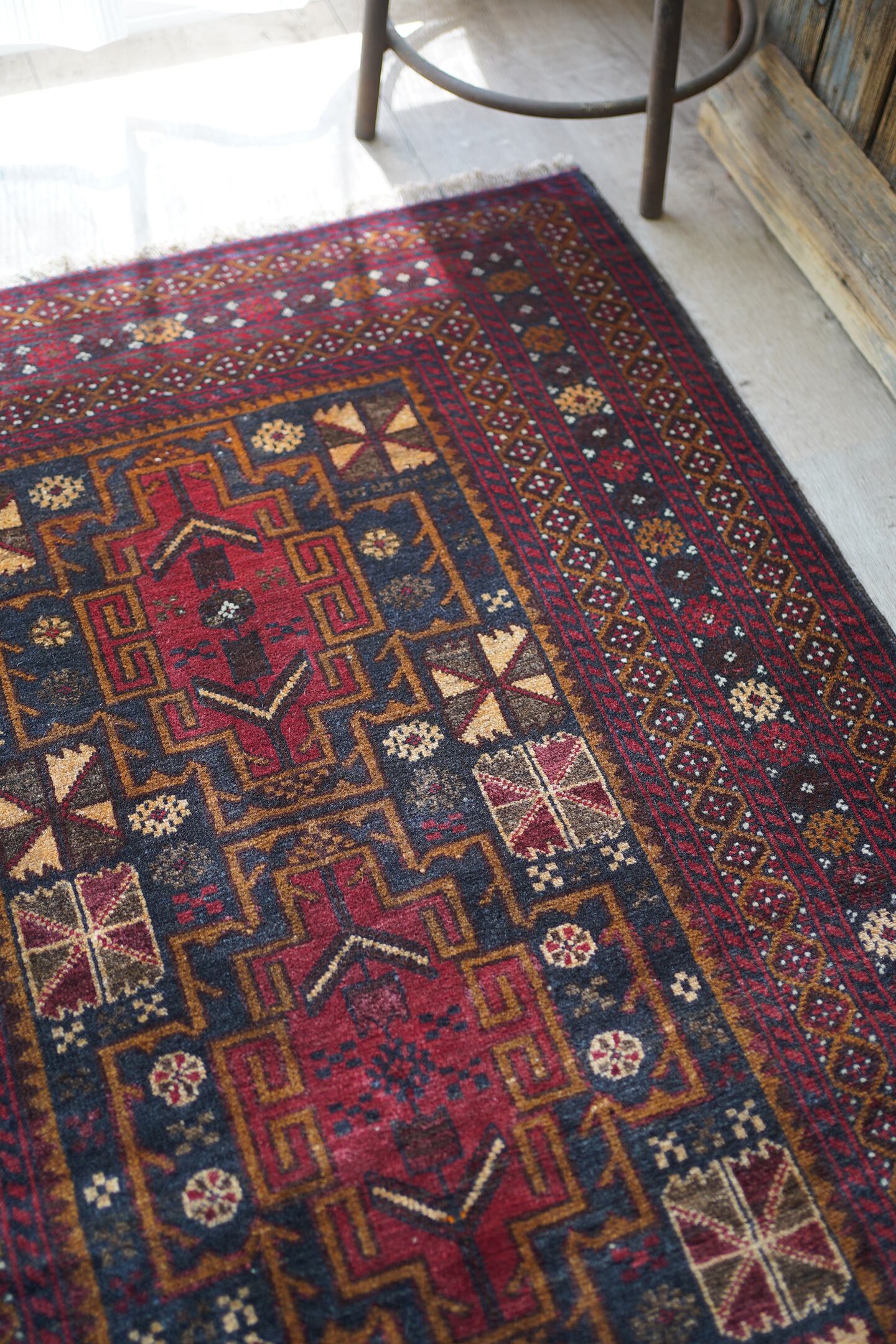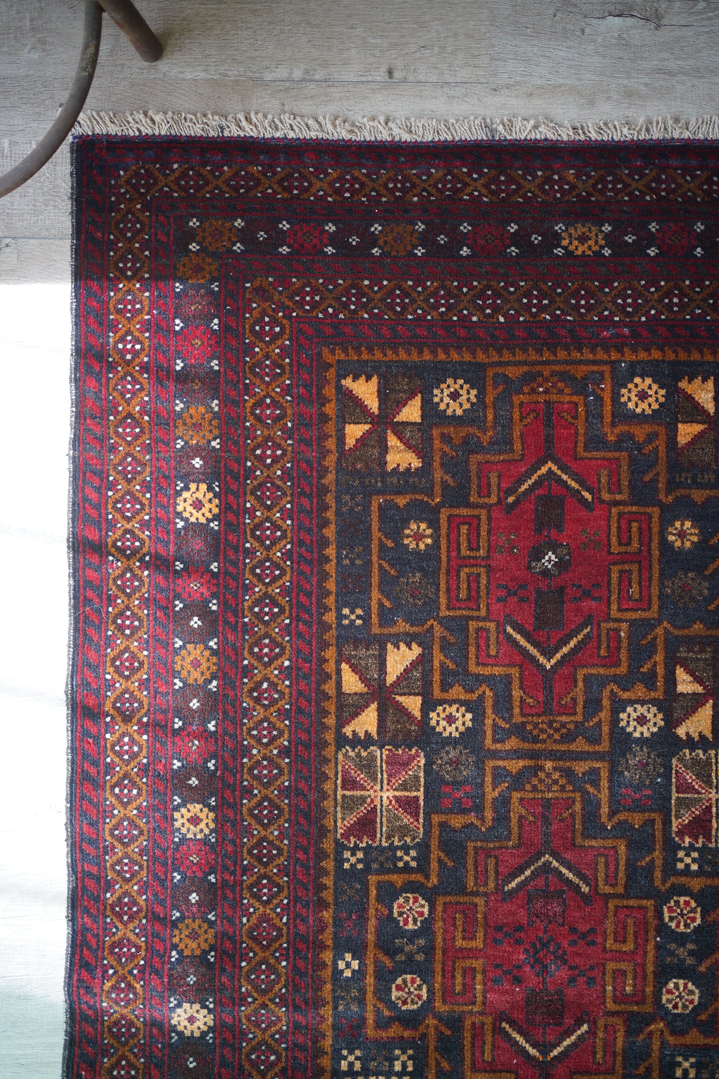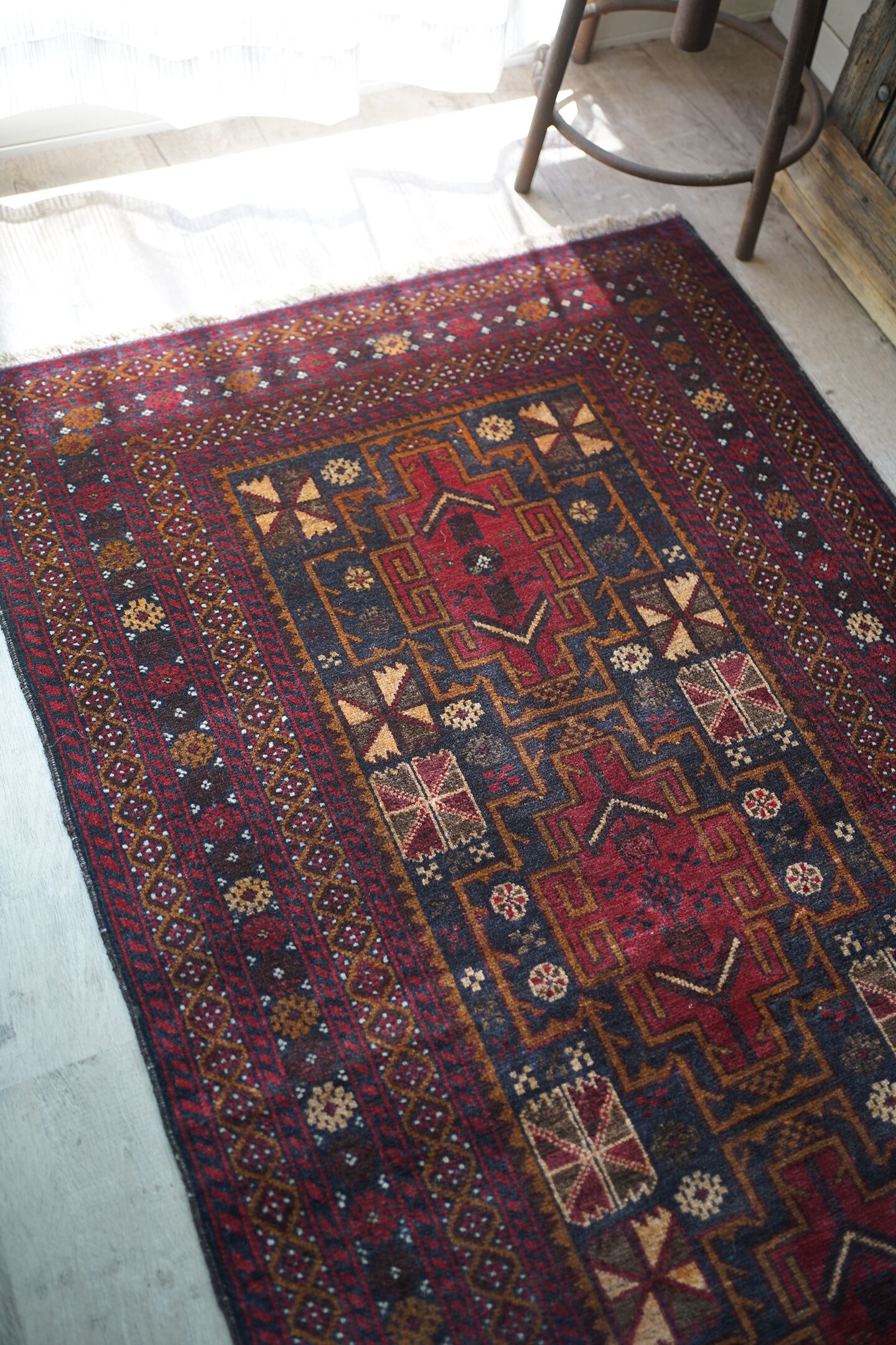 おおよそ35年前にバルーチ族によって織られたヴィンテージラグ。ボーダー部分の赤紫をメインカラーに、深めの赤やベージュ、ブラウン、薄めのブラックなどがバランス良く使われた配色です。表面はふわっとした滑らかな優しい肌触りで、厚みは6mm〜7mmほど。状態も大変良好です。可愛らしくも落ち着いた雰囲気が素敵で、さりげなくお部屋の雰囲気をアップしてくれると思います。トライバルラグが初めての方にもオススメの一枚です♫