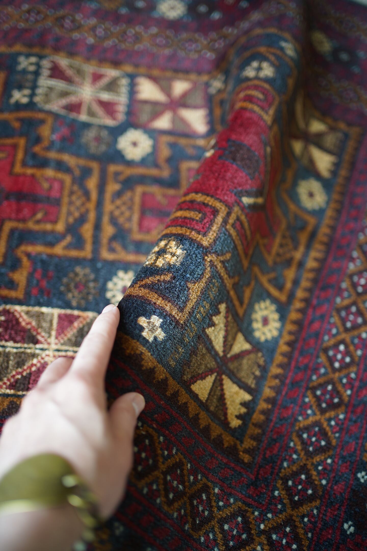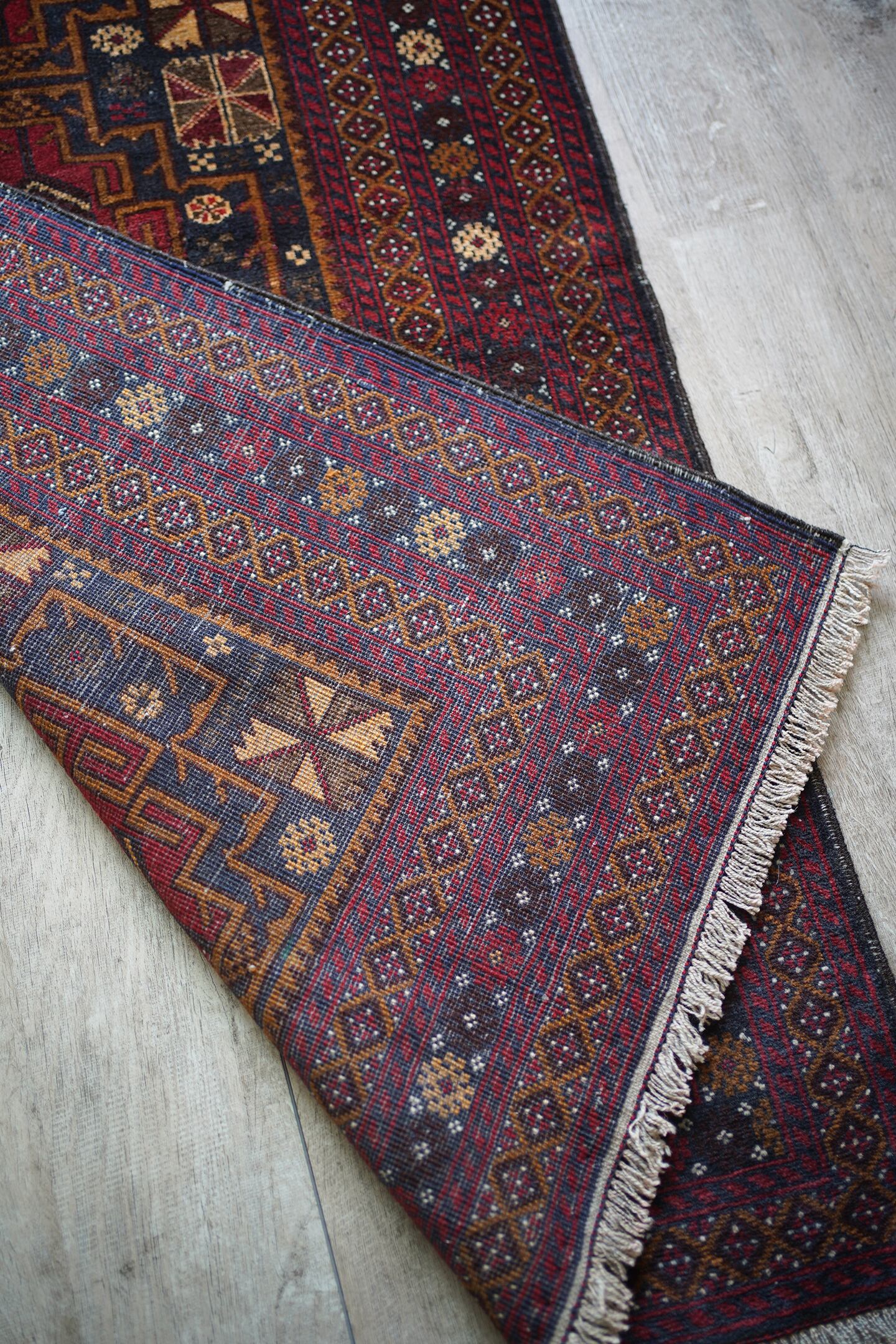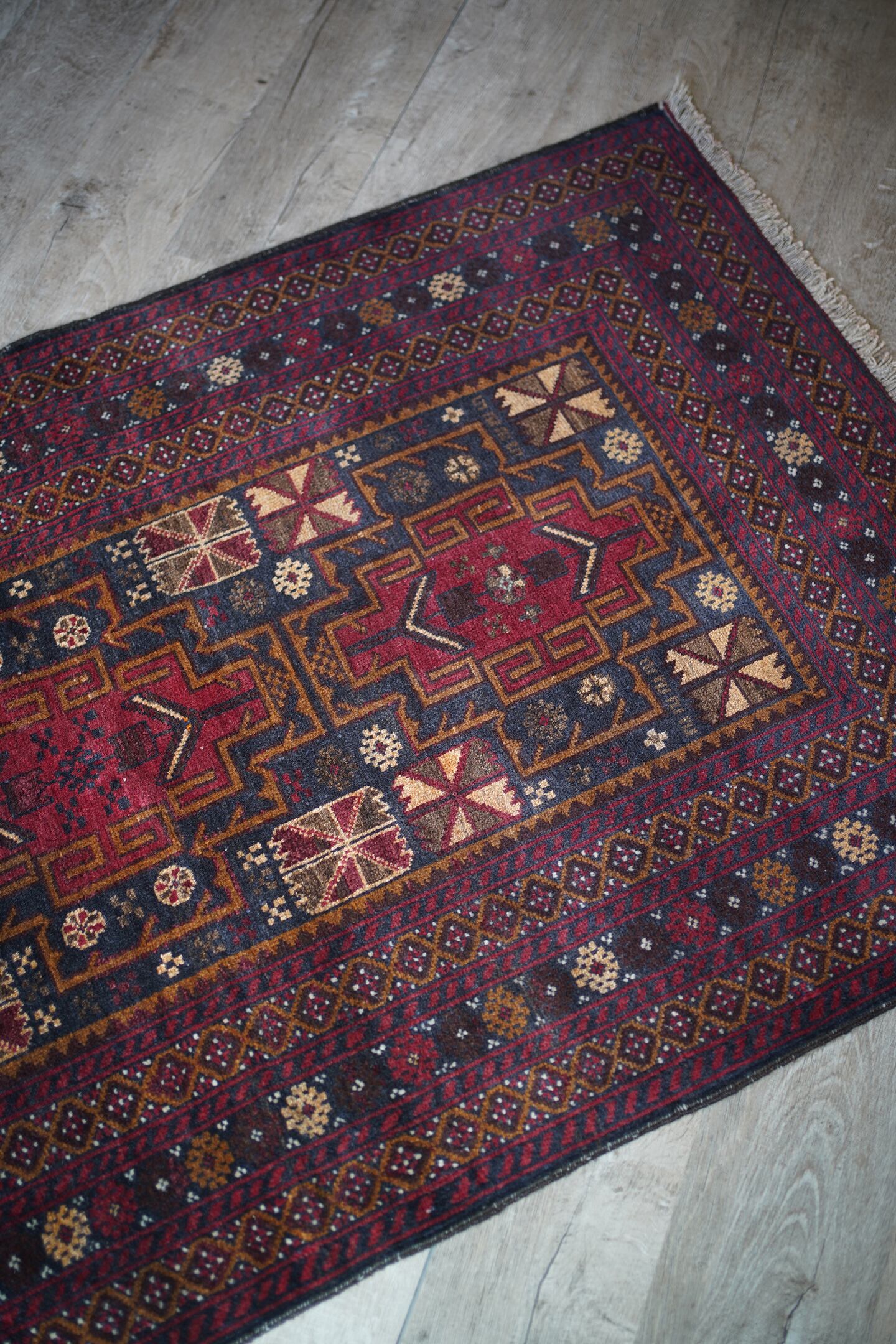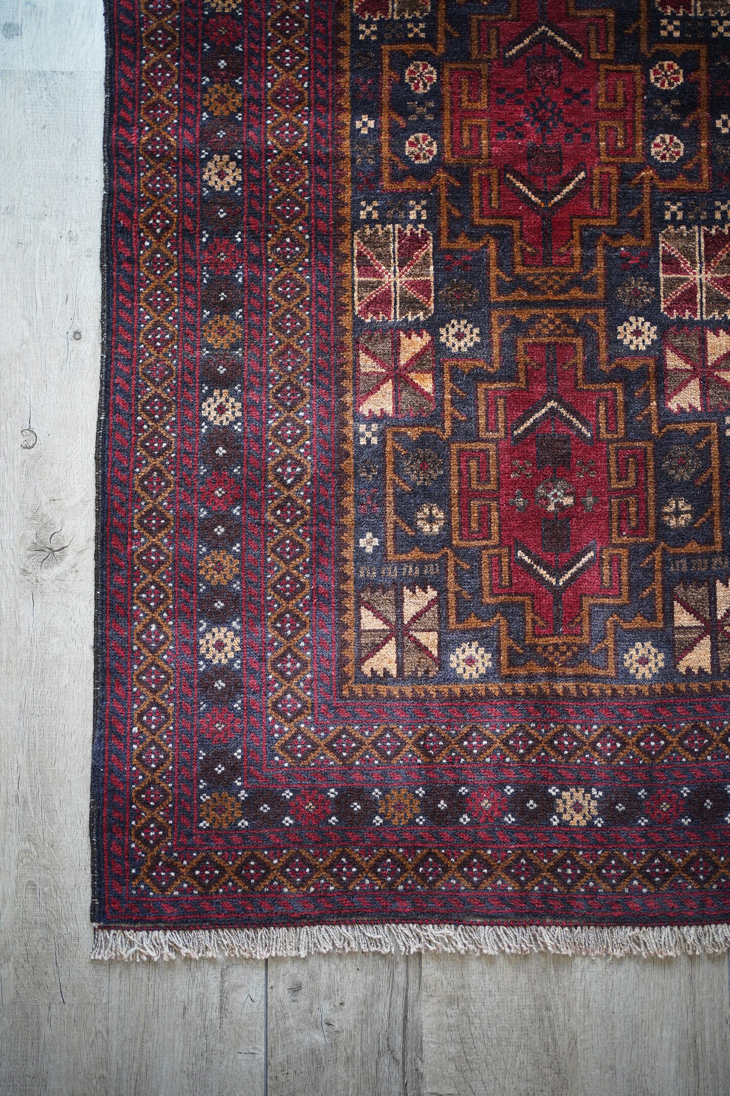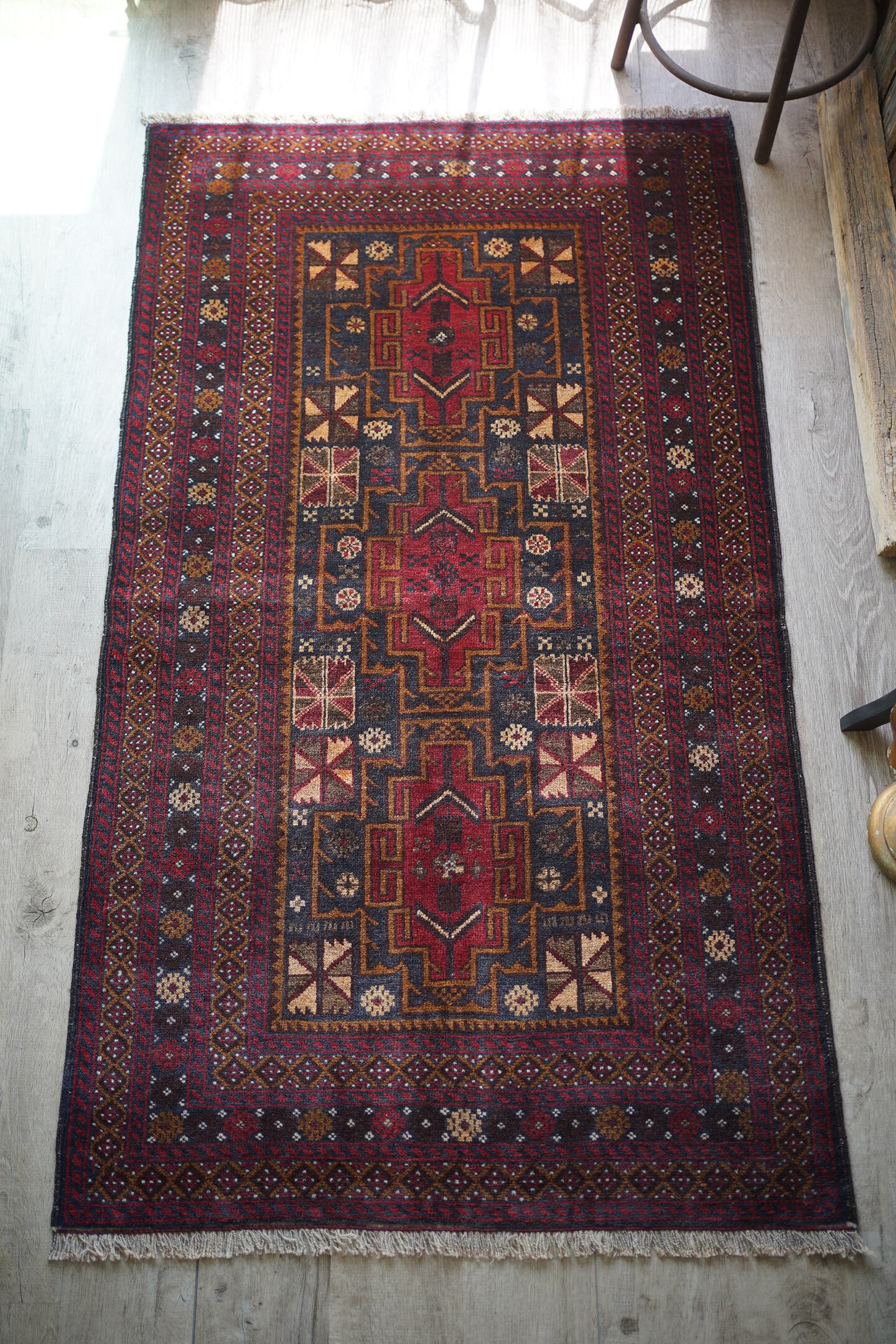 おおよそ35年前にバルーチ族によって織られたヴィンテージラグ。ボーダー部分の赤紫をメインカラーに、深めの赤やベージュ、ブラウン、薄めのブラックなどがバランス良く使われた配色です。表面はふわっとした滑らかな優しい肌触りで、厚みは6mm〜7mmほど。状態も大変良好です。可愛らしくも落ち着いた雰囲気が素敵で、さりげなくお部屋の雰囲気をアップしてくれると思います。トライバルラグが初めての方にもオススメの一枚です♫