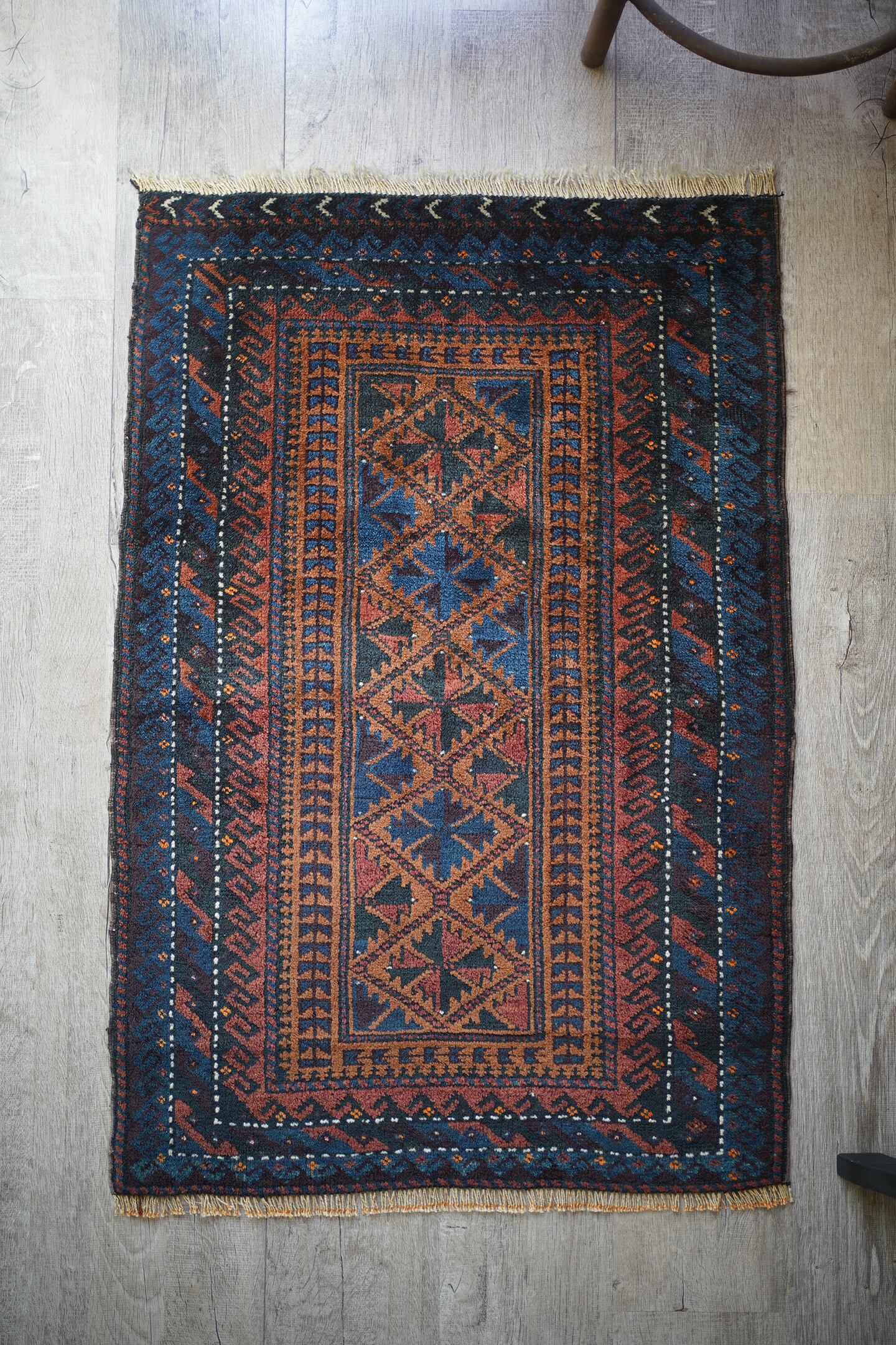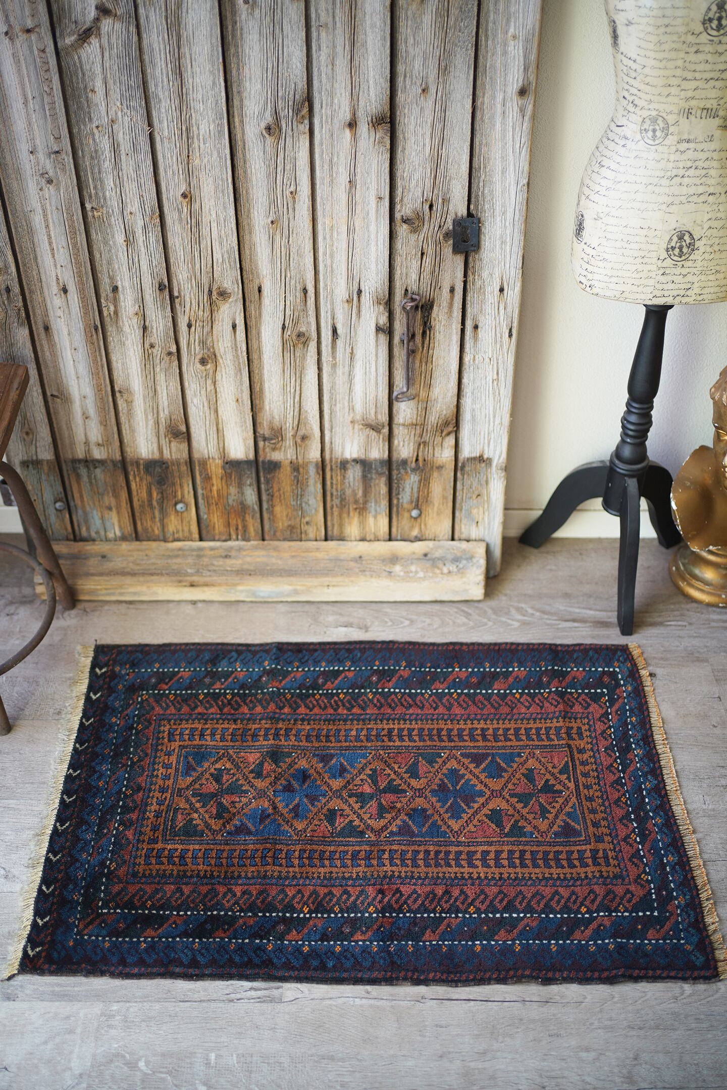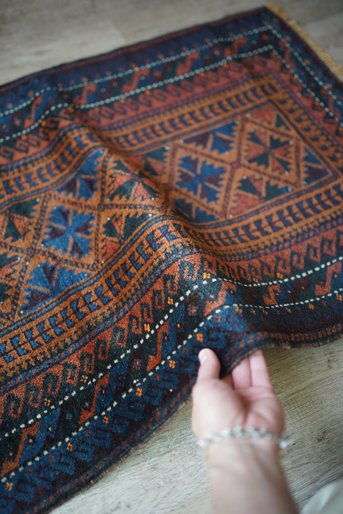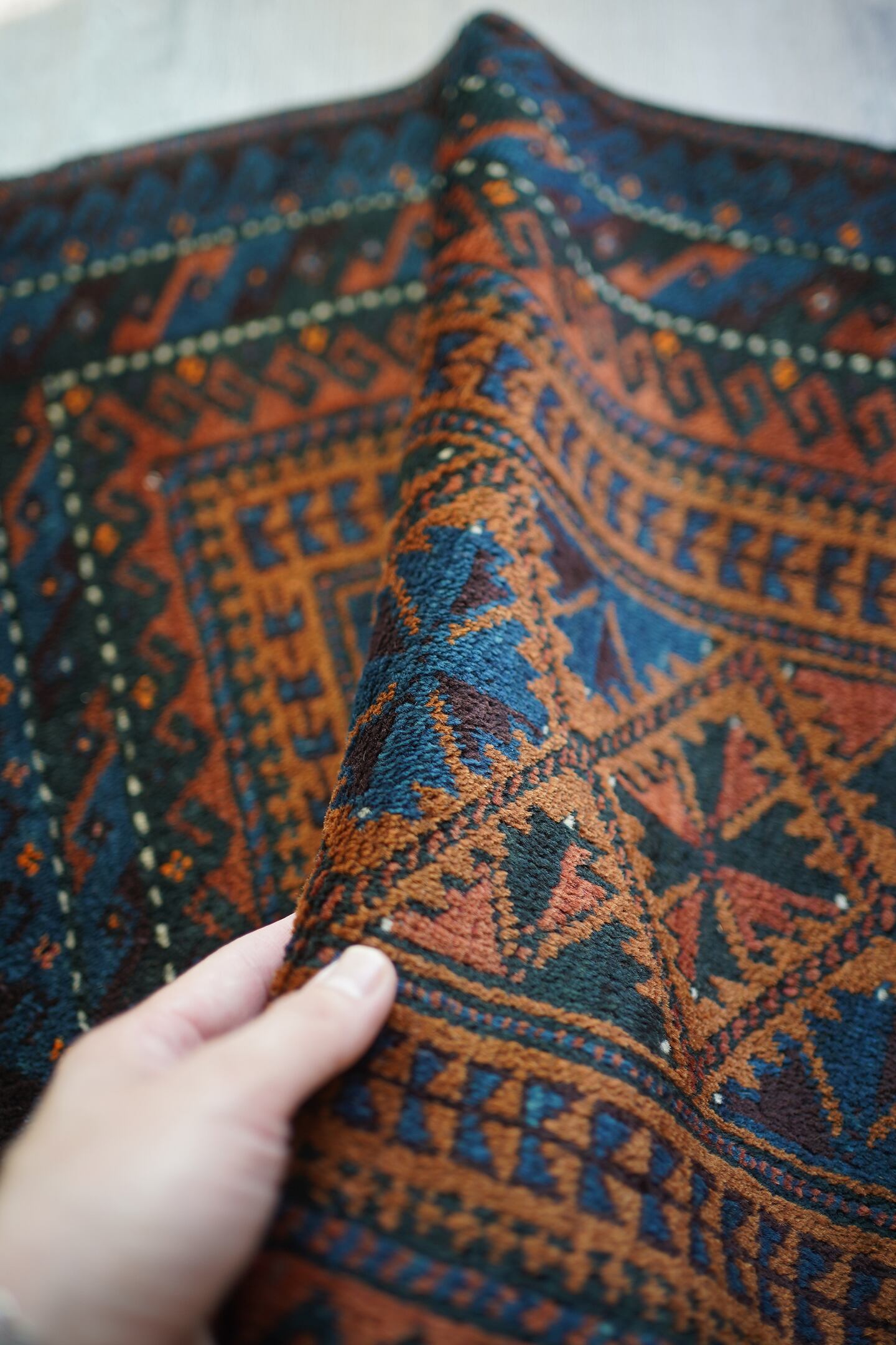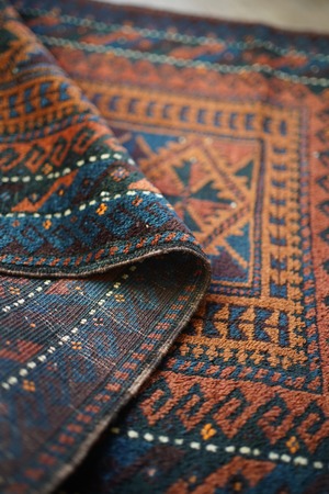 およそ90年前にイラン南東部のシスターン地方で織られたセミアンティークのバルーチラグです。チナール紋様が織り込まれたデザインで、ブラウン、藍色、赤みがかった茶色の配色です。ふわっと滑らかな優しい肌触りで、5mm程度の厚みです。経年からは考えられないほど状態もよく、艶もある大変美しいラグです。使い勝手の良いサイズ感なので色んな場所で活躍してくれると思います♫