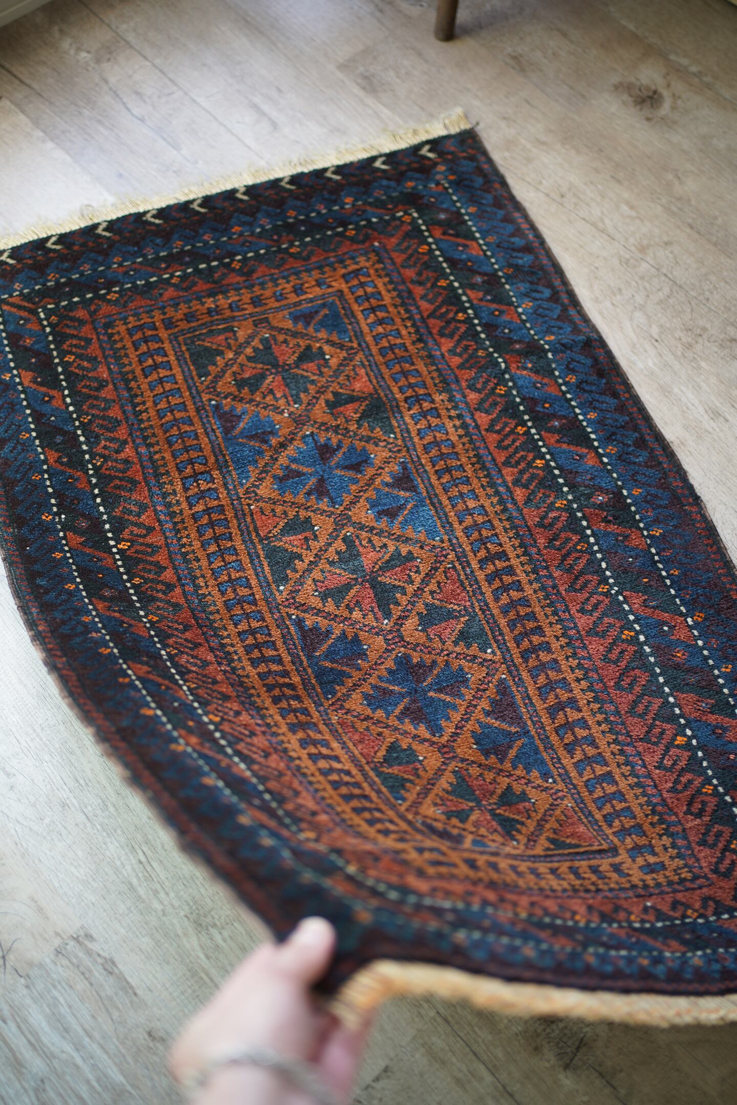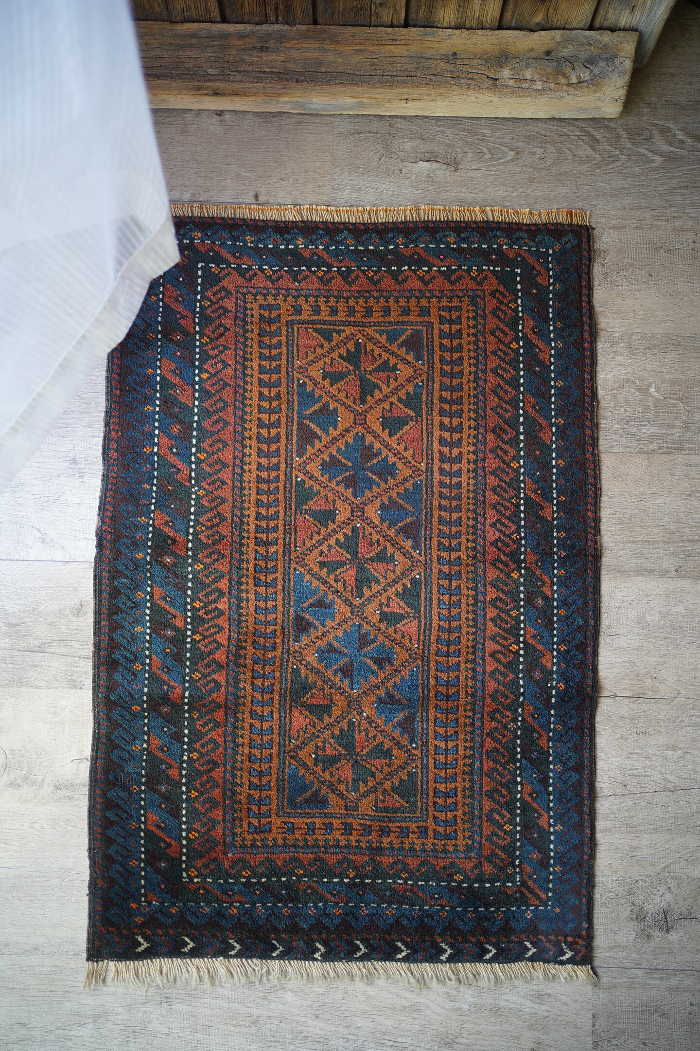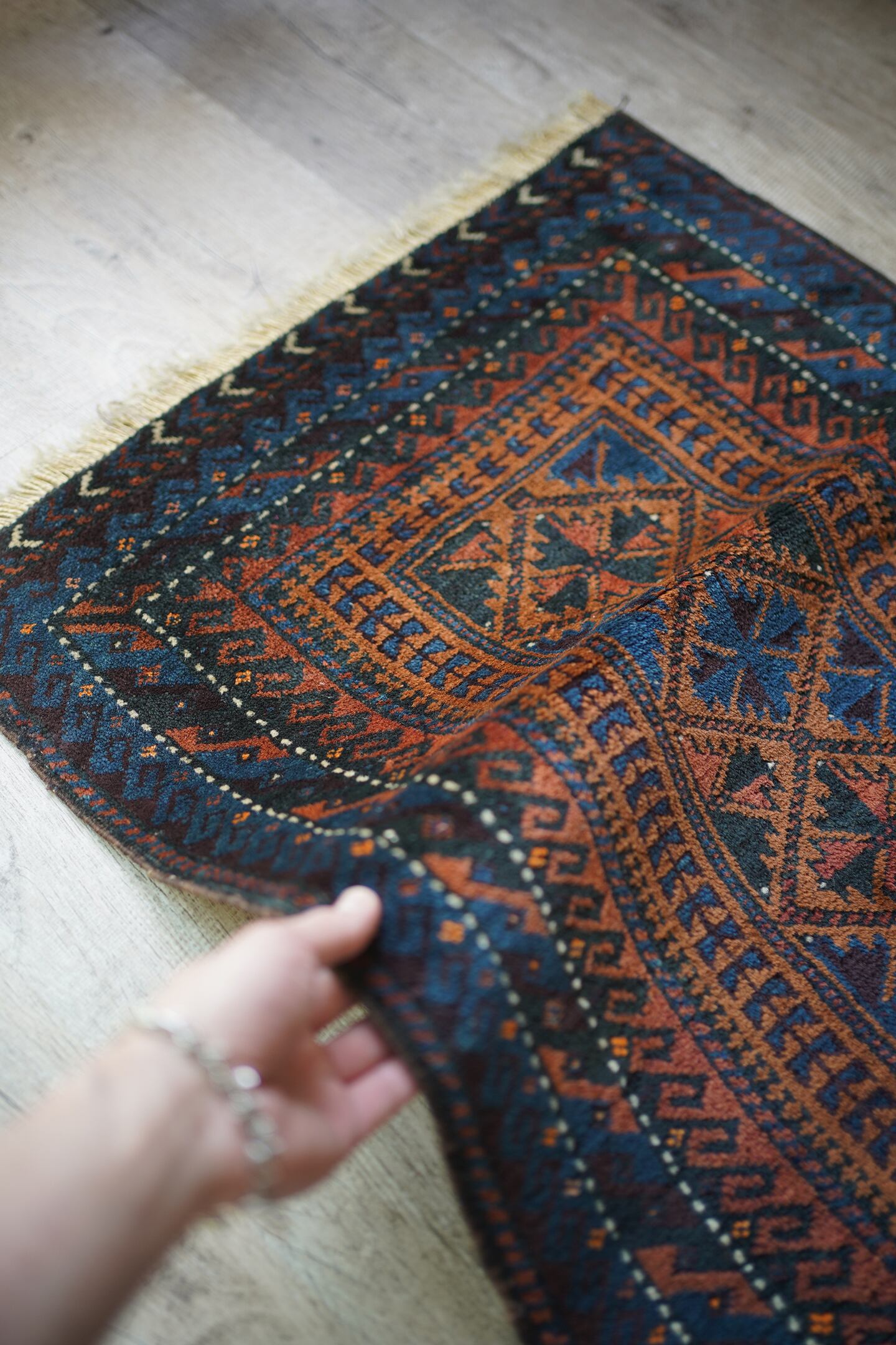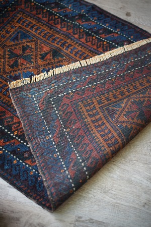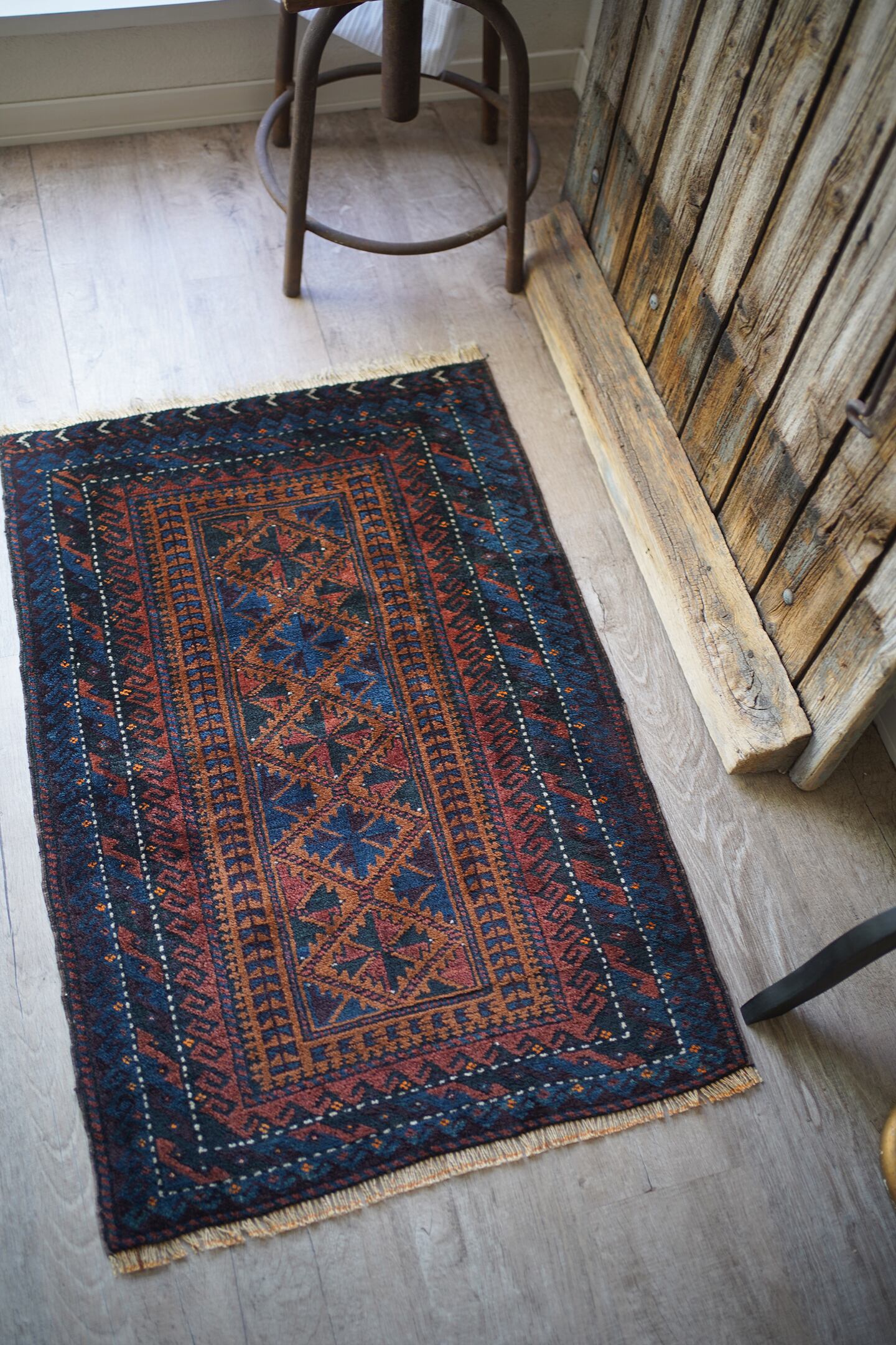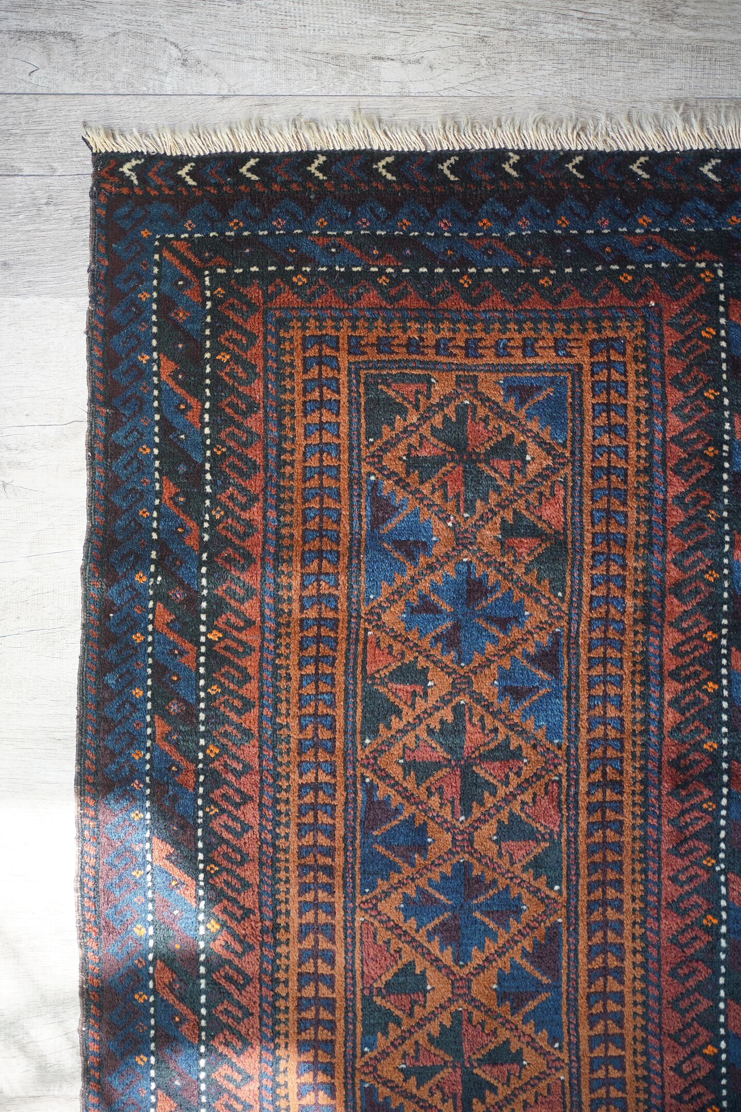 およそ90年前にイラン南東部のシスターン地方で織られたセミアンティークのバルーチラグです。チナール紋様が織り込まれたデザインで、ブラウン、藍色、赤みがかった茶色の配色です。ふわっと滑らかな優しい肌触りで、5mm程度の厚みです。経年からは考えられないほど状態もよく、艶もある大変美しいラグです。使い勝手の良いサイズ感なので色んな場所で活躍してくれると思います♫