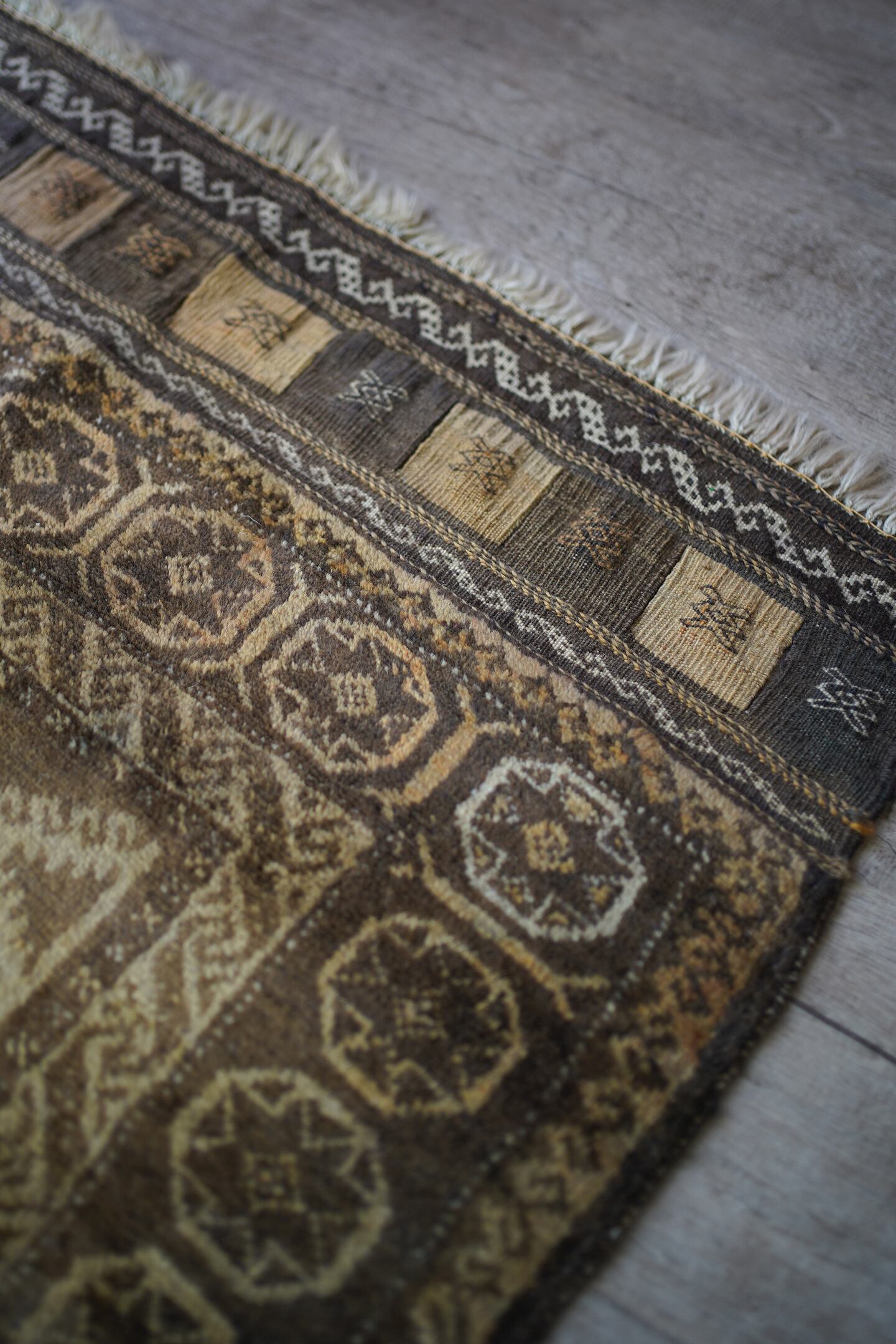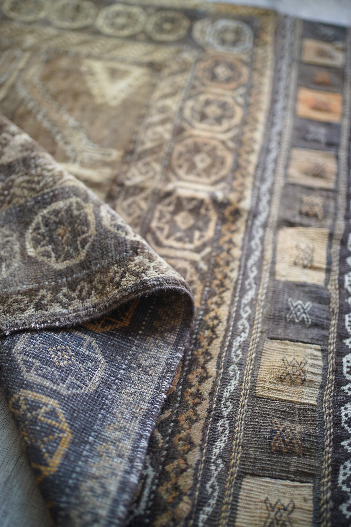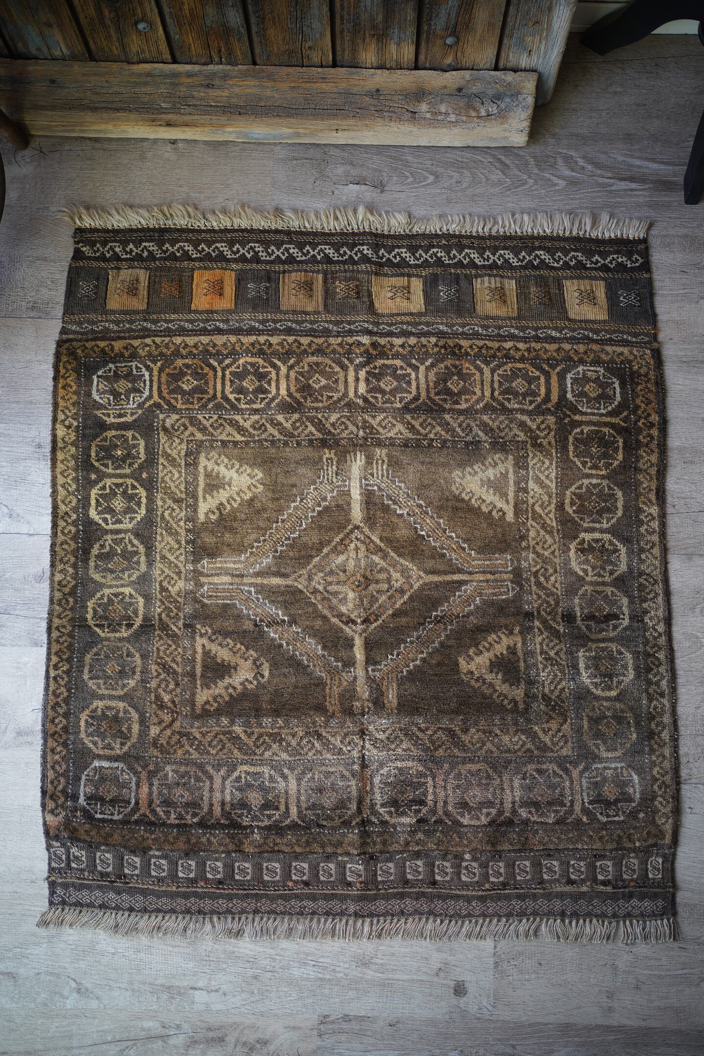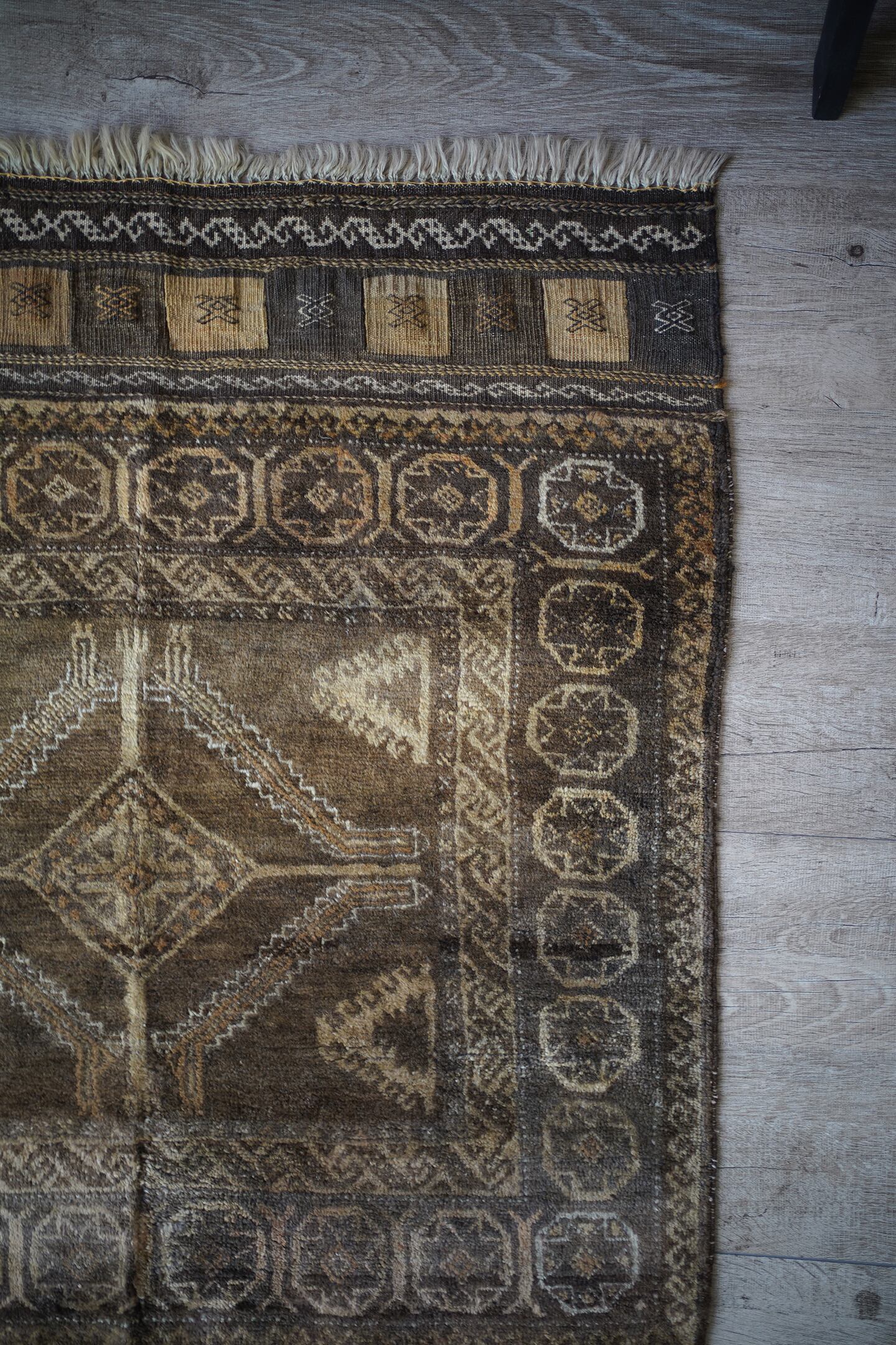 ふわっとしたバスタオルのような柔らかい肌触りの経年約40年のアフガンバルーチ。ブラウン、濃茶色、ベージュの配色で、様々なインテリアに合わせやすいカラーリングとなっています。またフリンジ部分の美しいキリムエンドがとても素敵です。厚みは7mm程度。コンディションも良好です。玄関やお気に入りのスペースにどうぞ♫