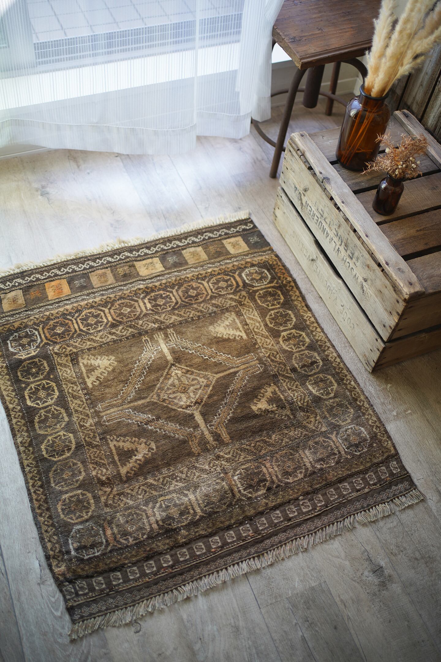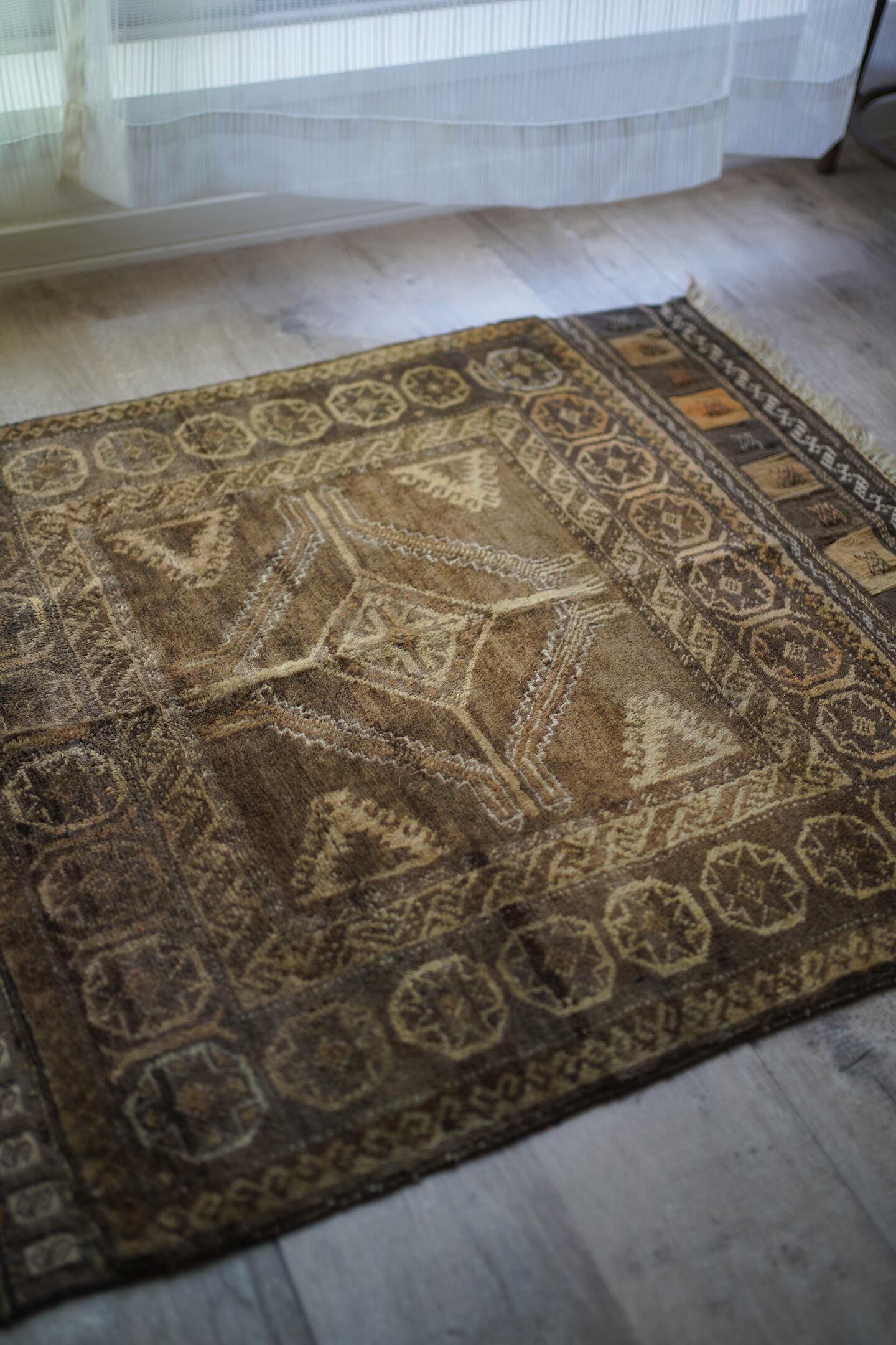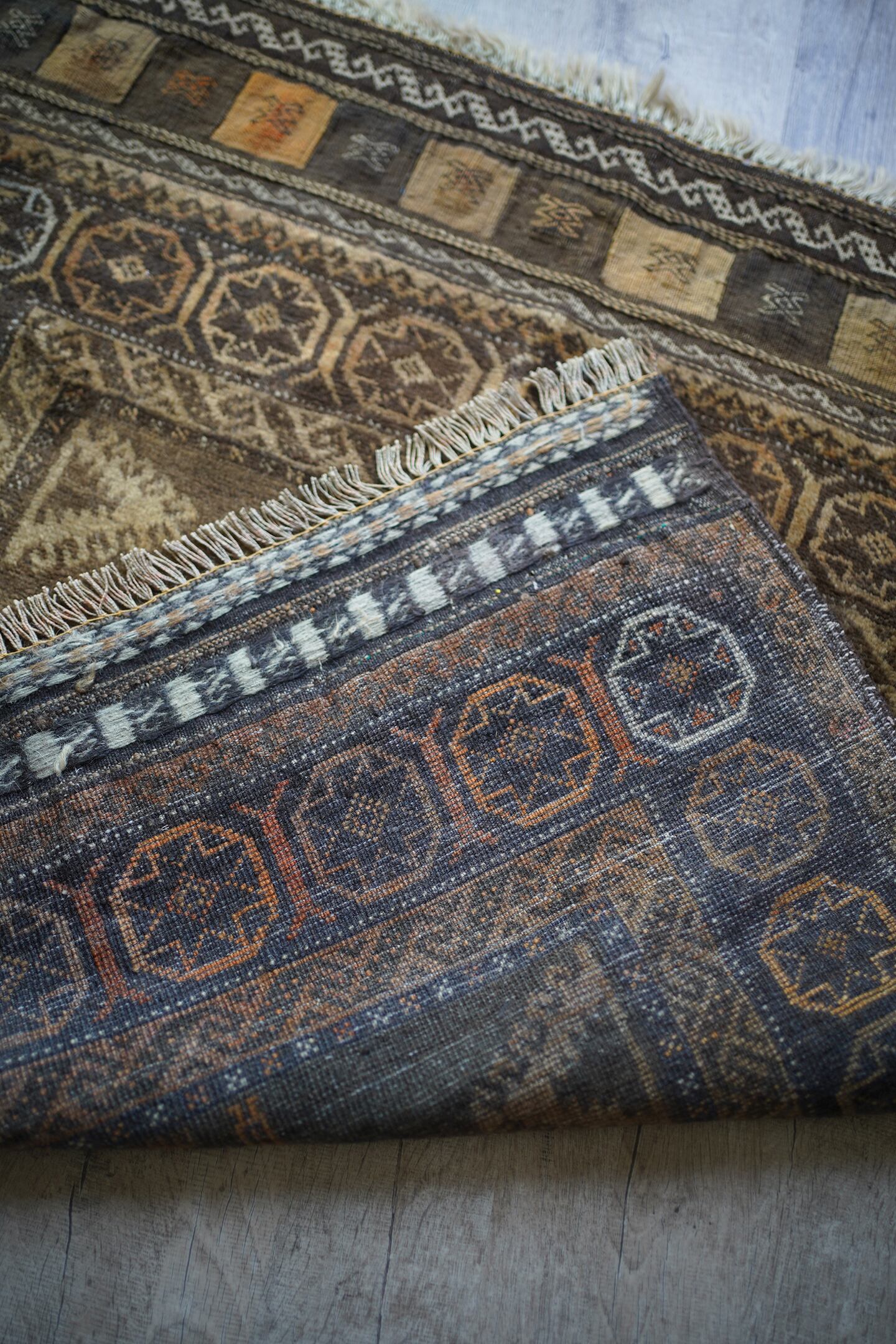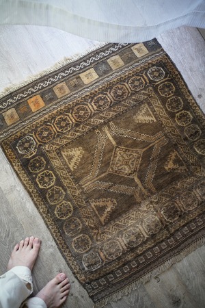 ふわっとしたバスタオルのような柔らかい肌触りの経年約40年のアフガンバルーチ。ブラウン、濃茶色、ベージュの配色で、様々なインテリアに合わせやすいカラーリングとなっています。またフリンジ部分の美しいキリムエンドがとても素敵です。厚みは7mm程度。コンディションも良好です。玄関やお気に入りのスペースにどうぞ♫