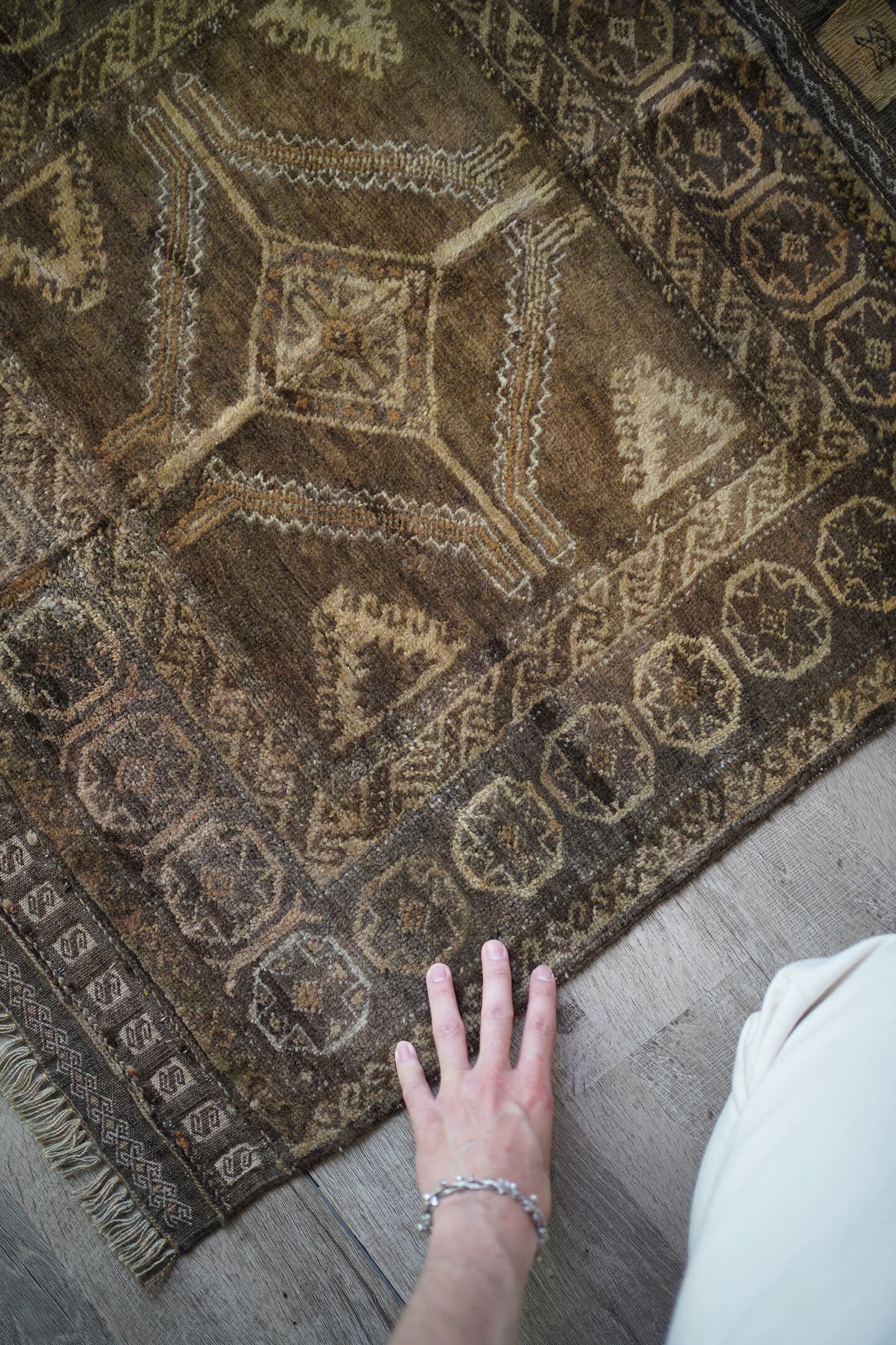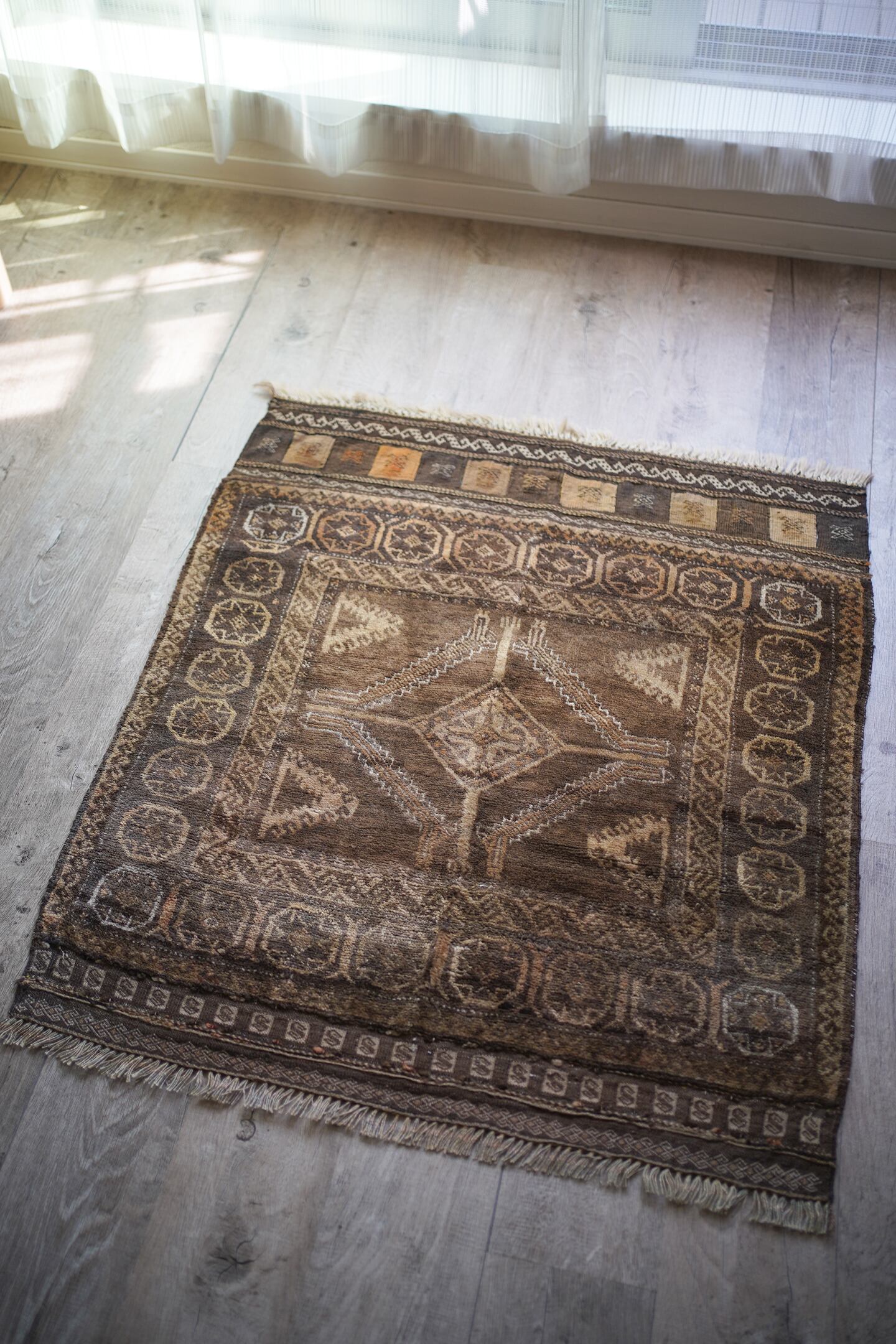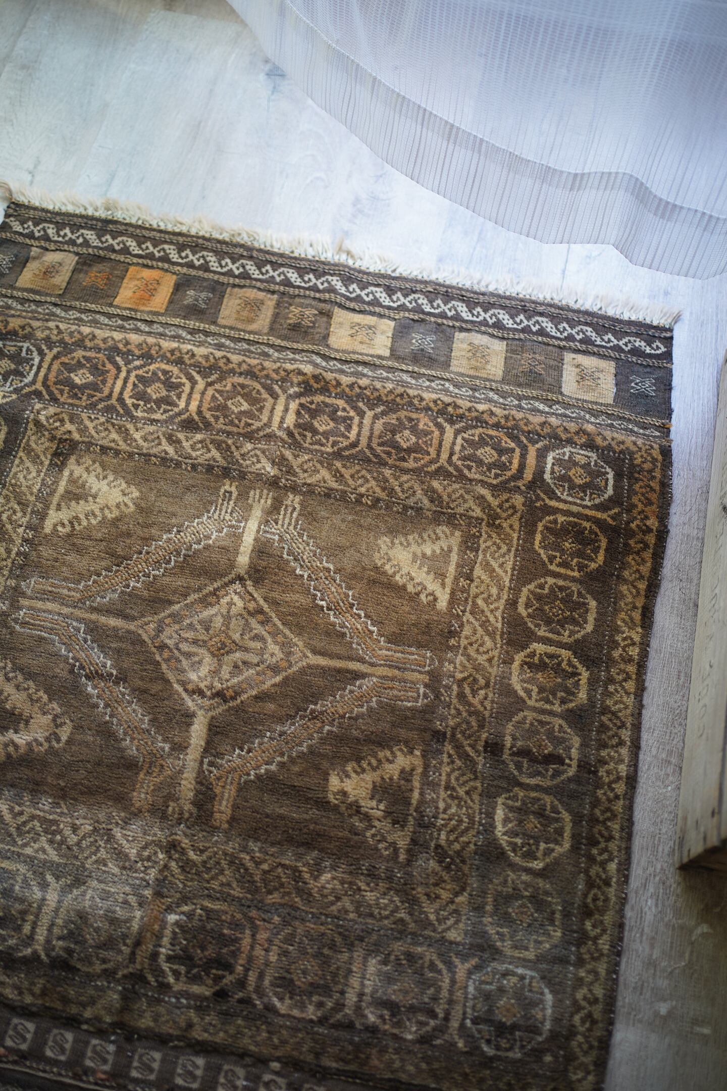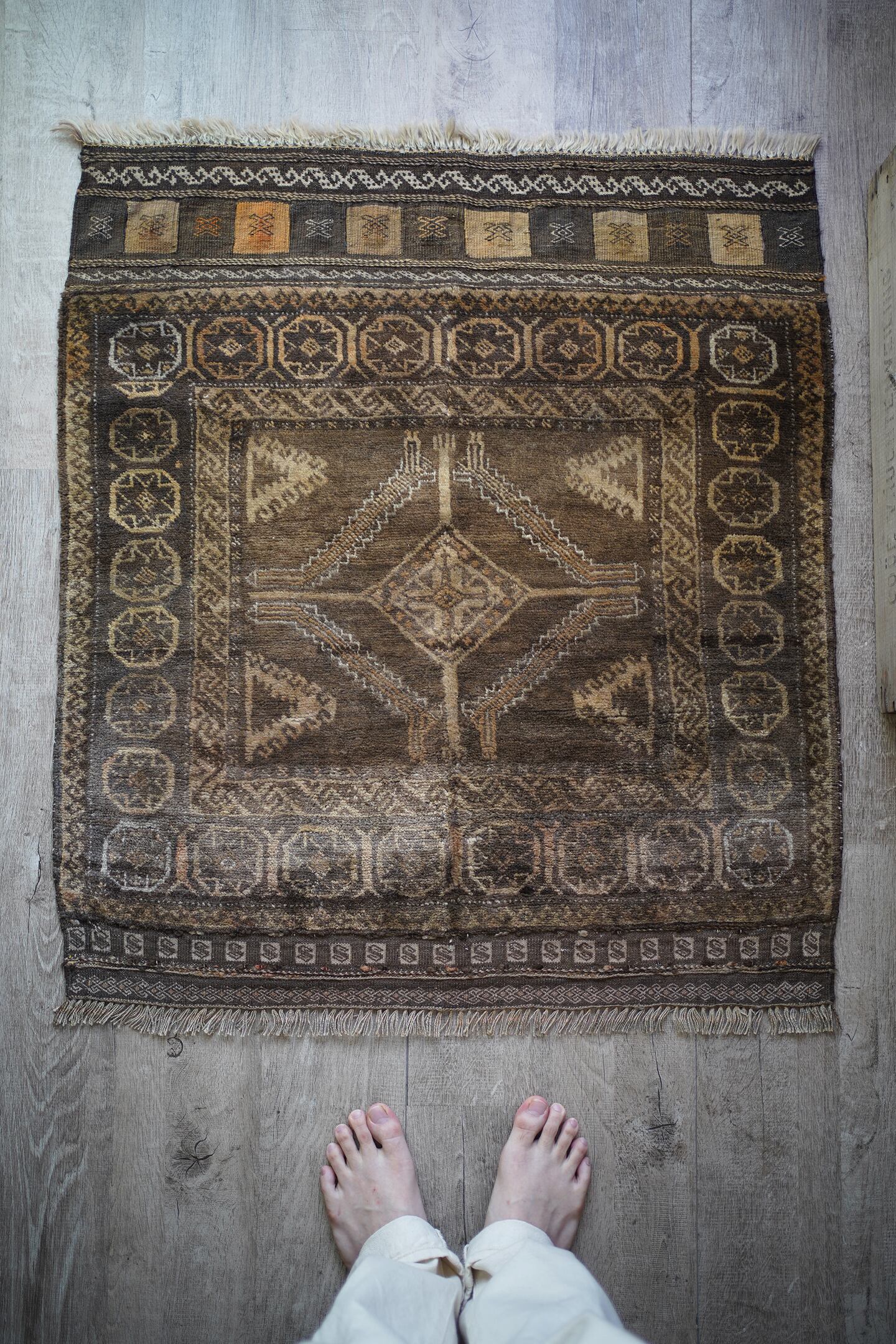 ふわっとしたバスタオルのような柔らかい肌触りの経年約40年のアフガンバルーチ。ブラウン、濃茶色、ベージュの配色で、様々なインテリアに合わせやすいカラーリングとなっています。またフリンジ部分の美しいキリムエンドがとても素敵です。厚みは7mm程度。コンディションも良好です。玄関やお気に入りのスペースにどうぞ♫