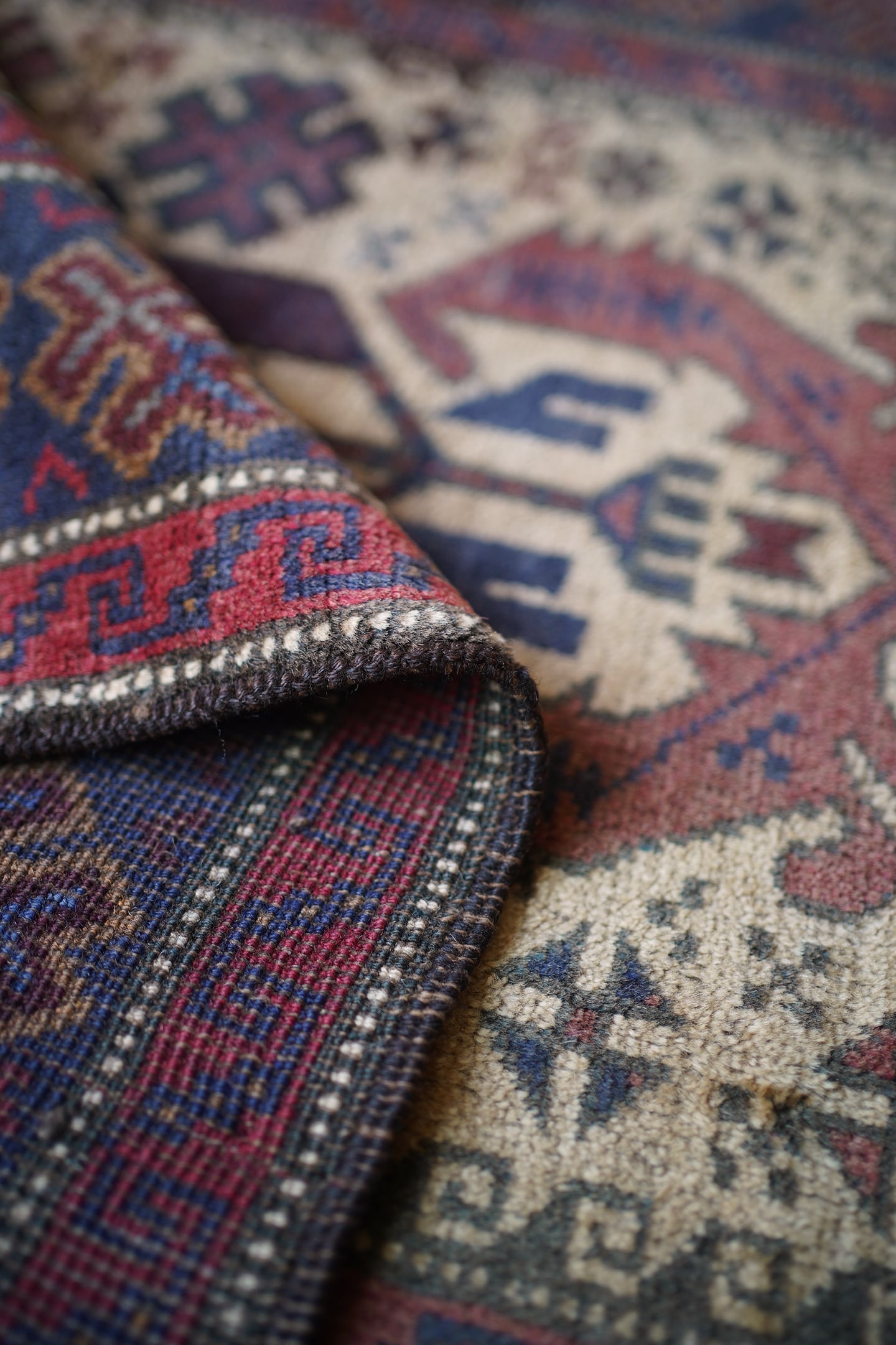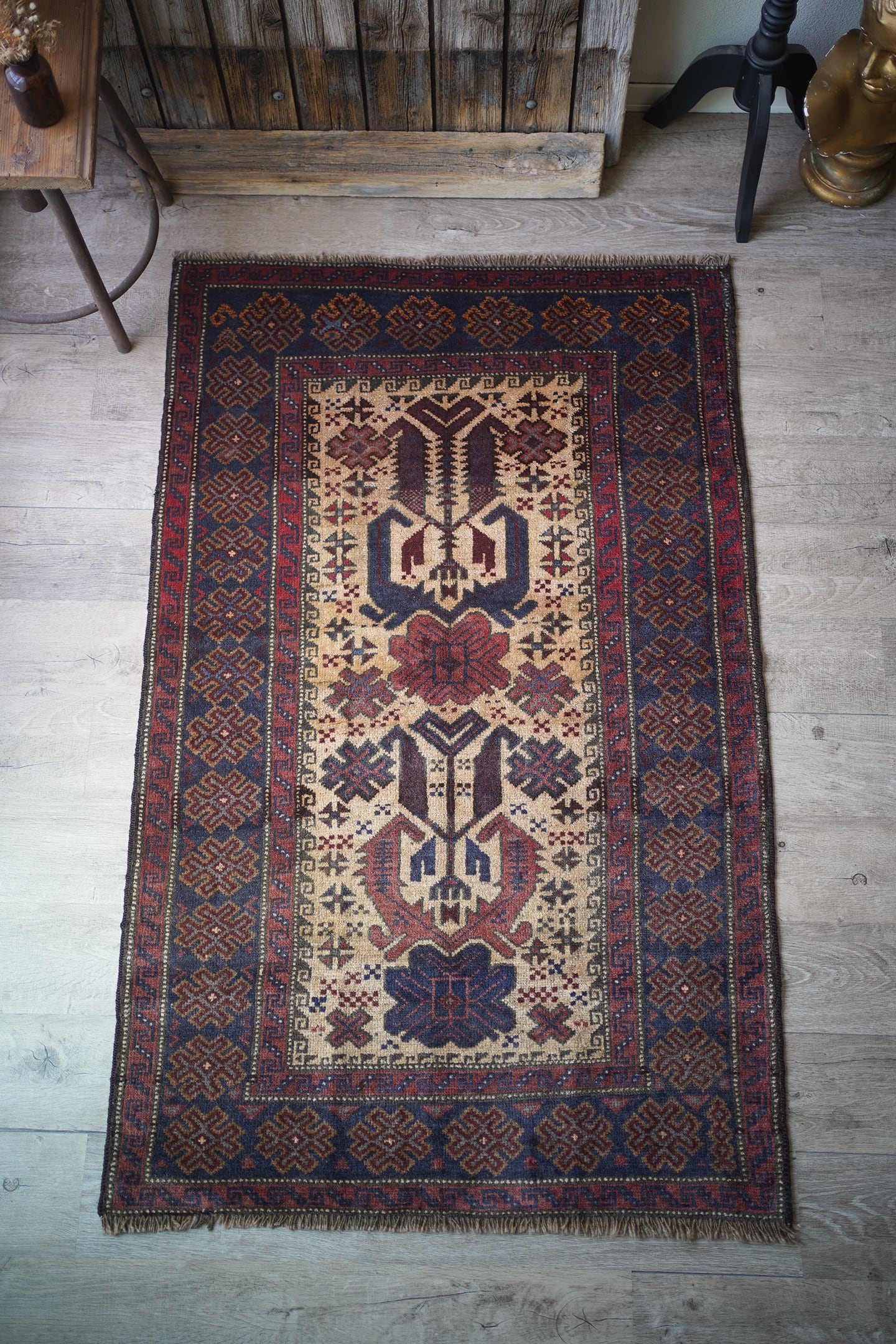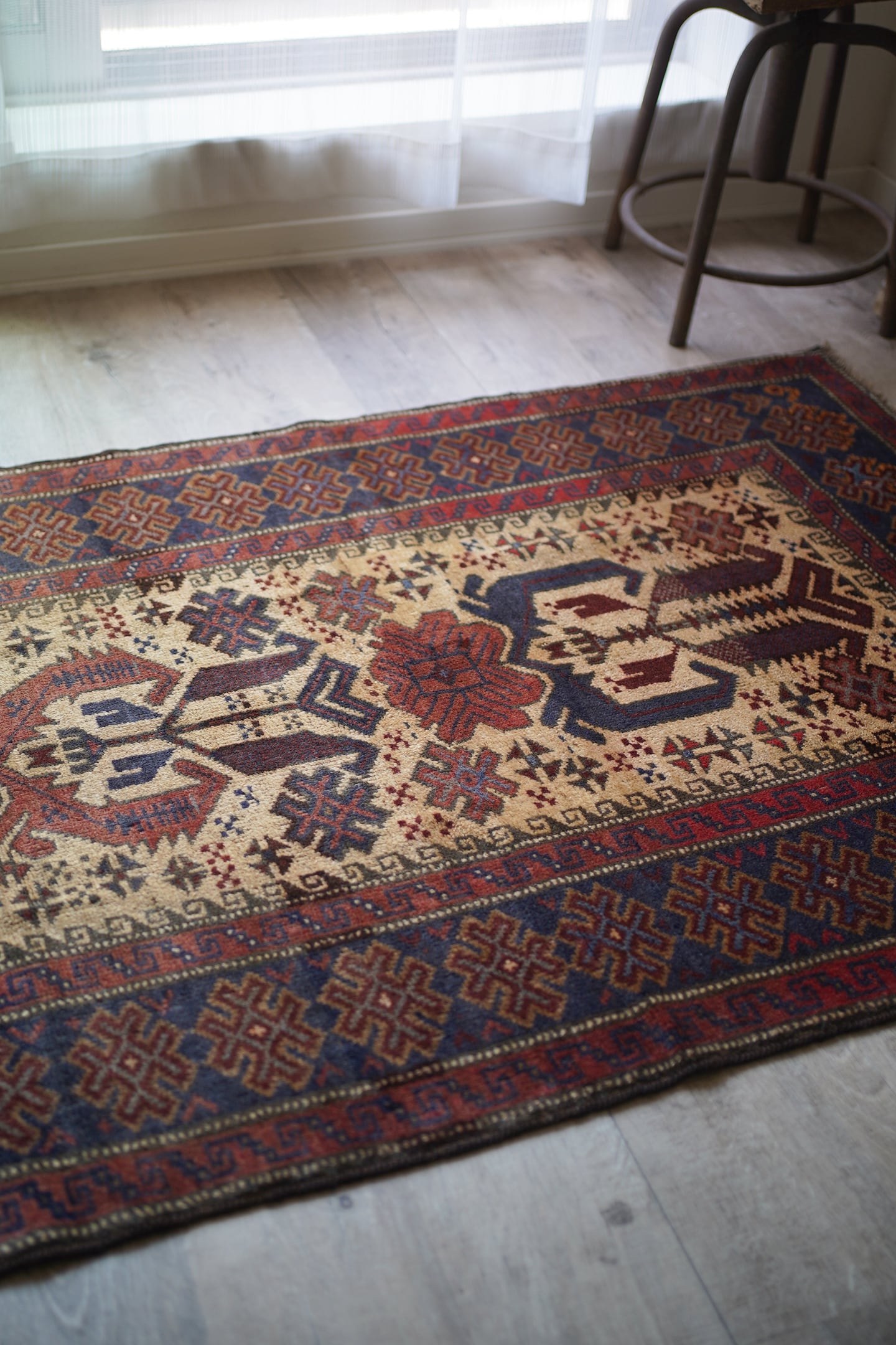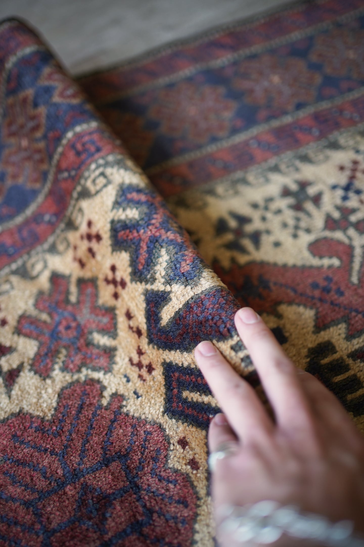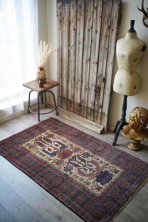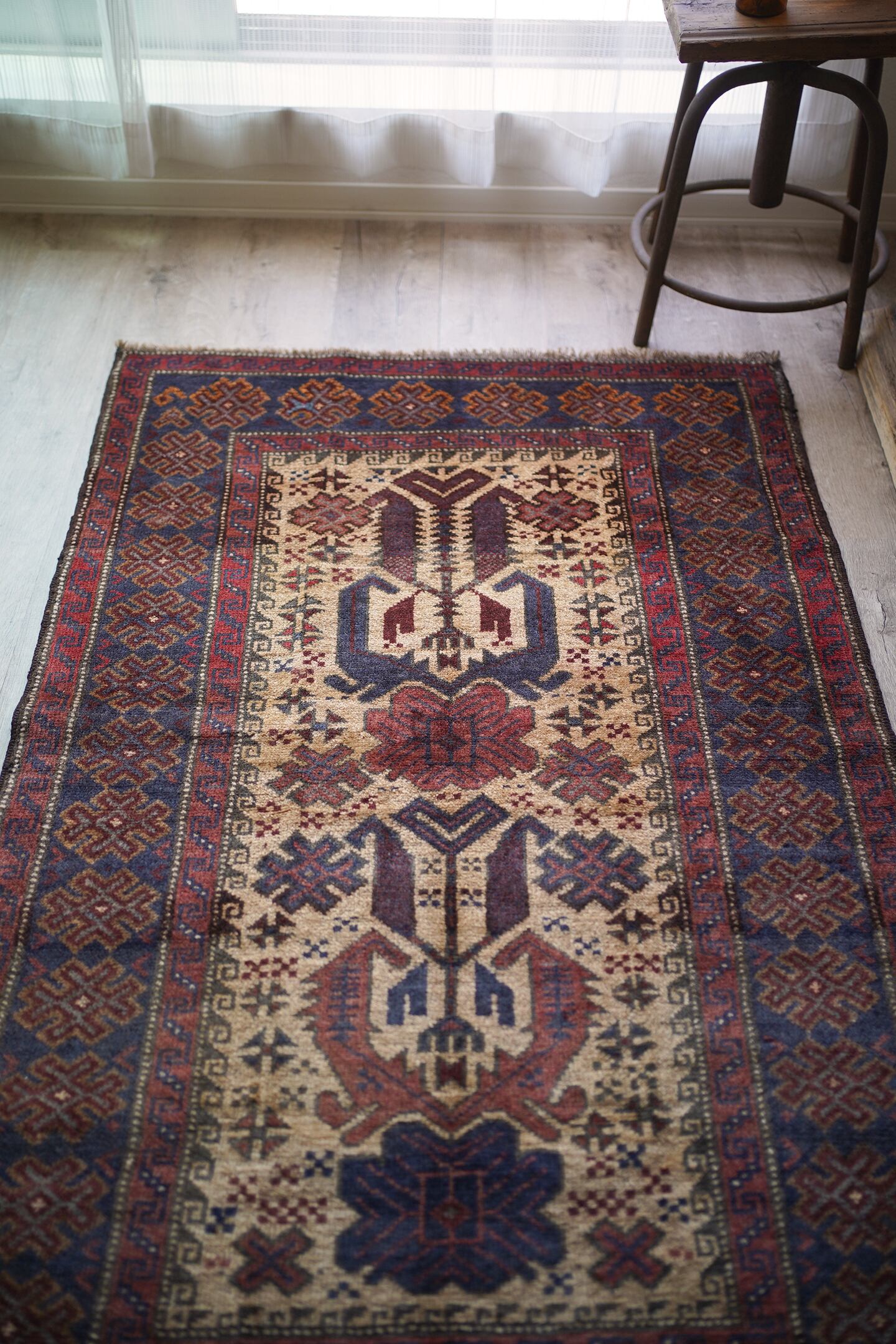 約50年前にバルーチ族によって織られたラグです。ベージュ、ブラウン、薄めのブラックの色構成でTHE ヴィンテージラグ感のある雰囲気が素敵な一枚。表面はふわっと優しい肌触りで、6mmほどの厚みです。目立ったダメージもなく、状態も良好。落ち着いた色味ですので、ご自宅のインテリアにスッと馴染んでくれるかと思います。