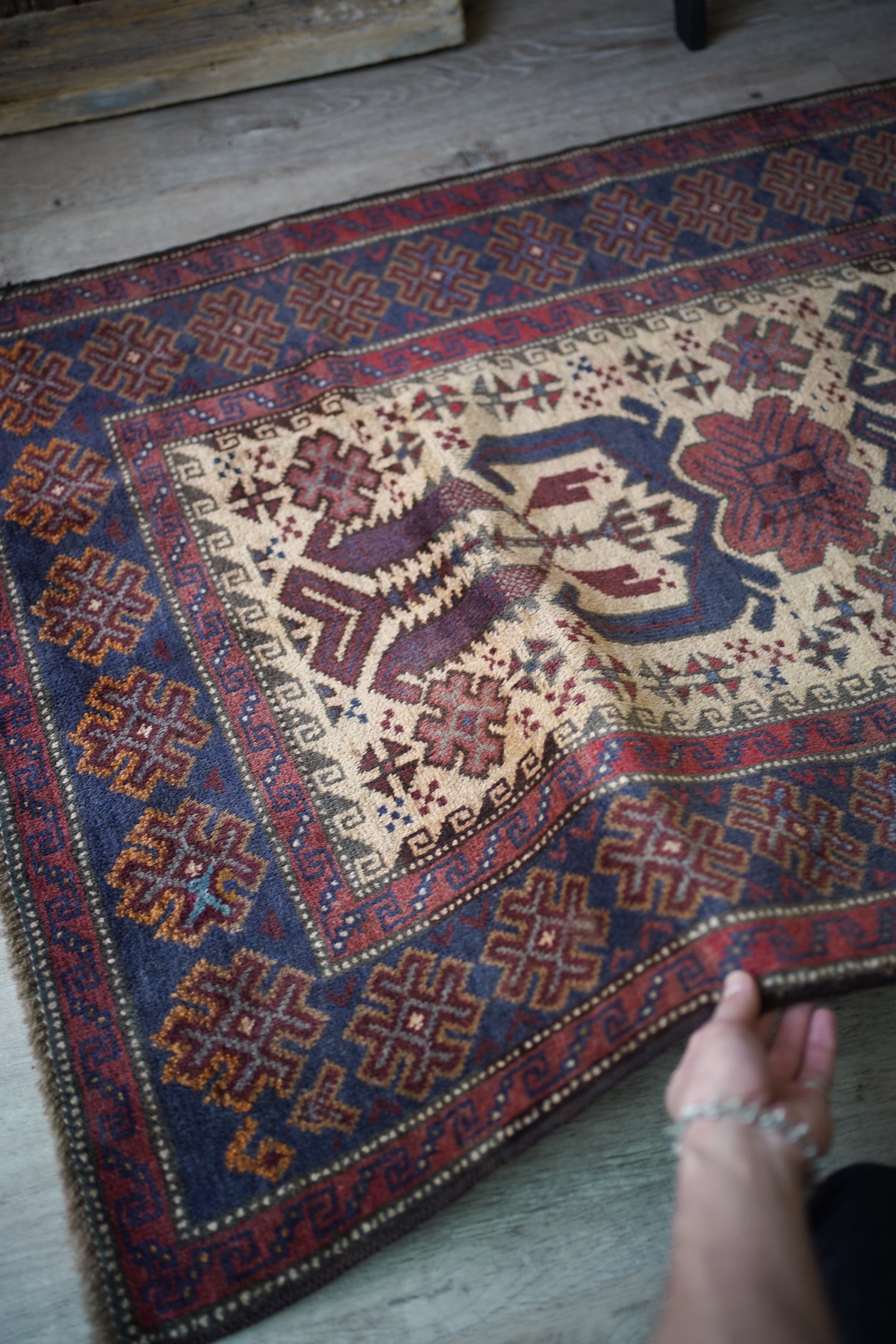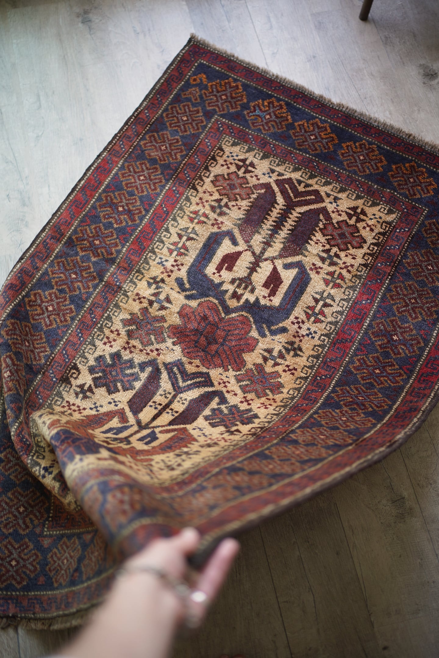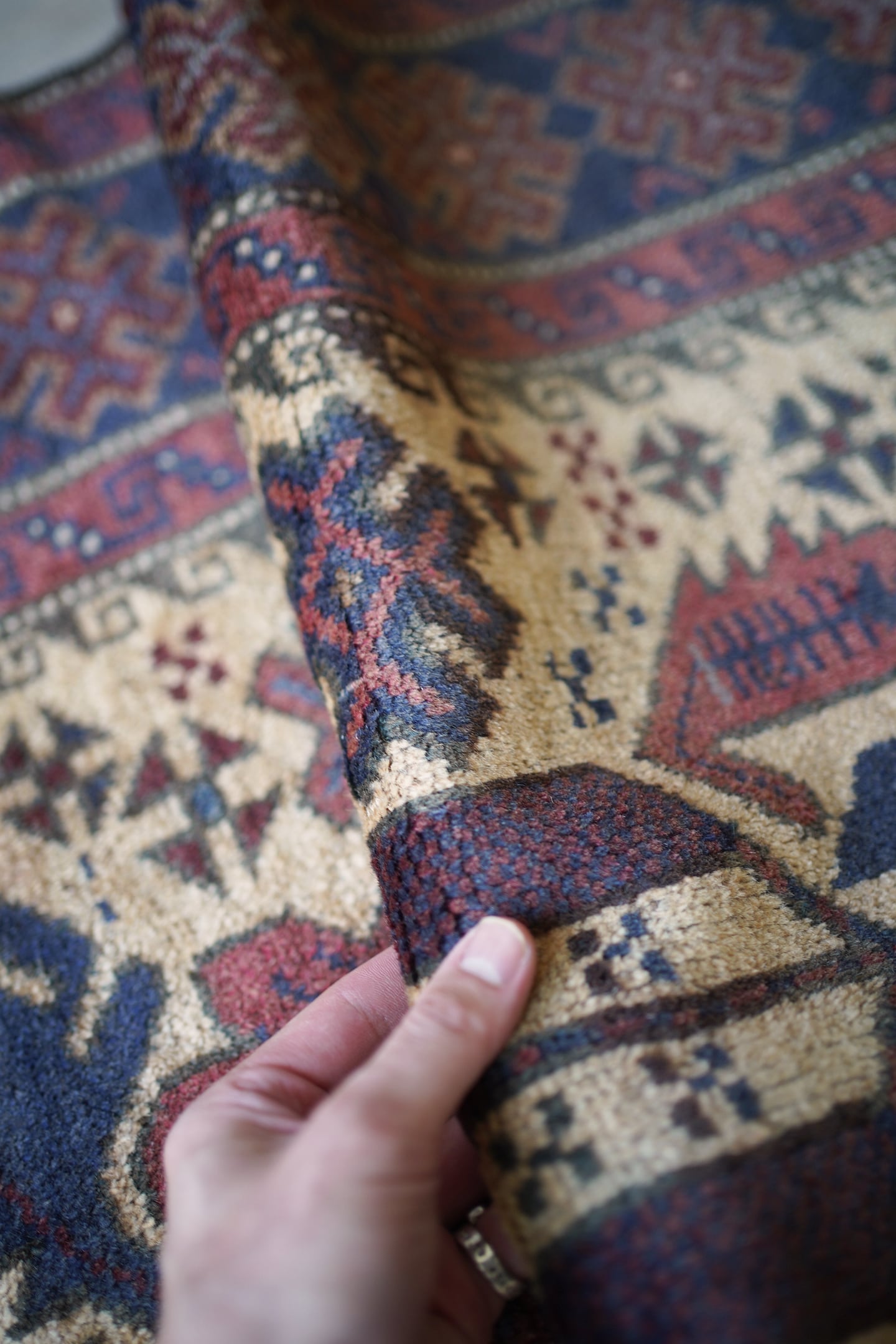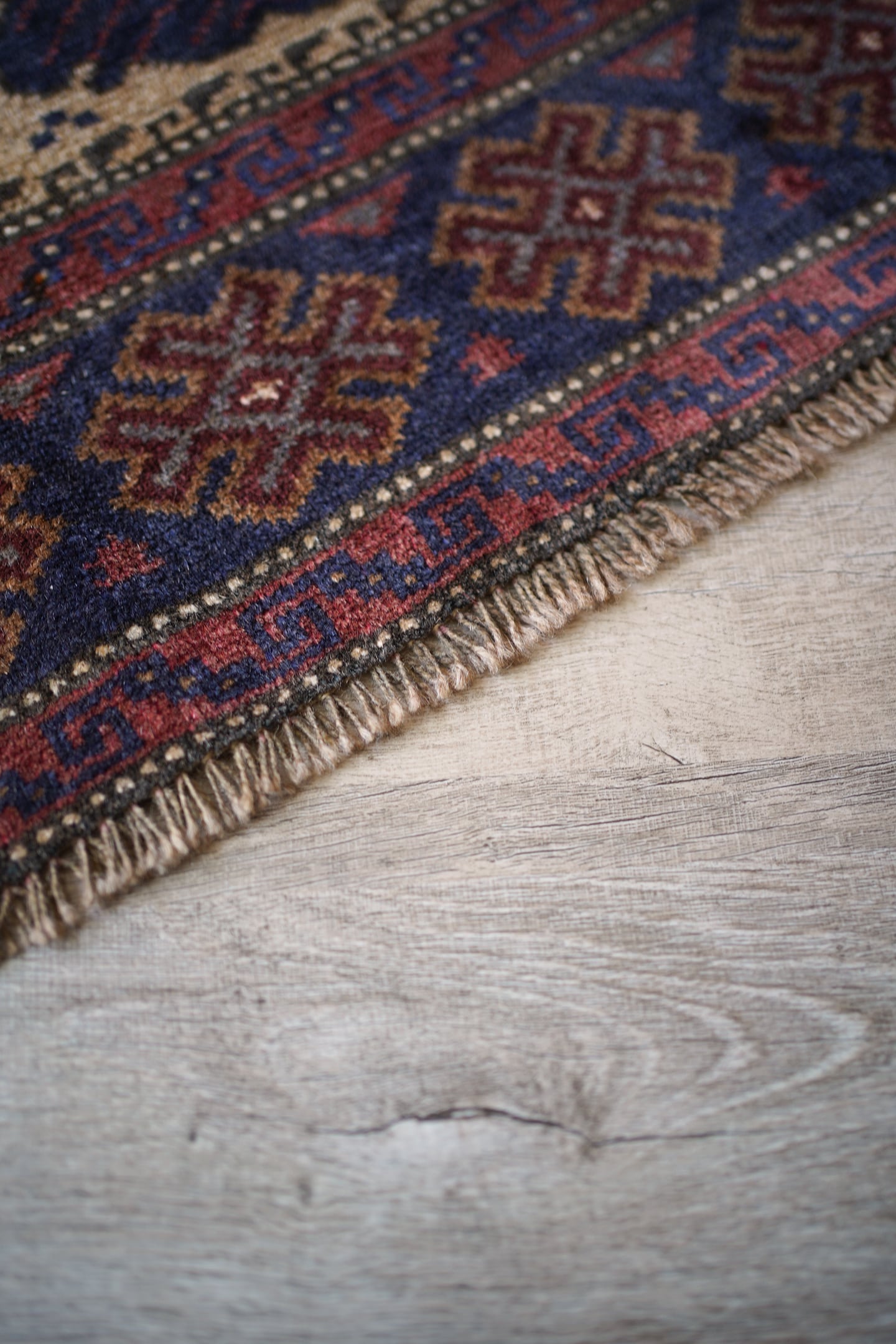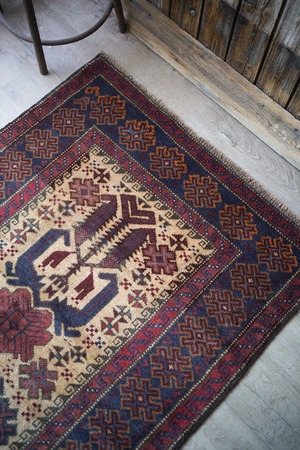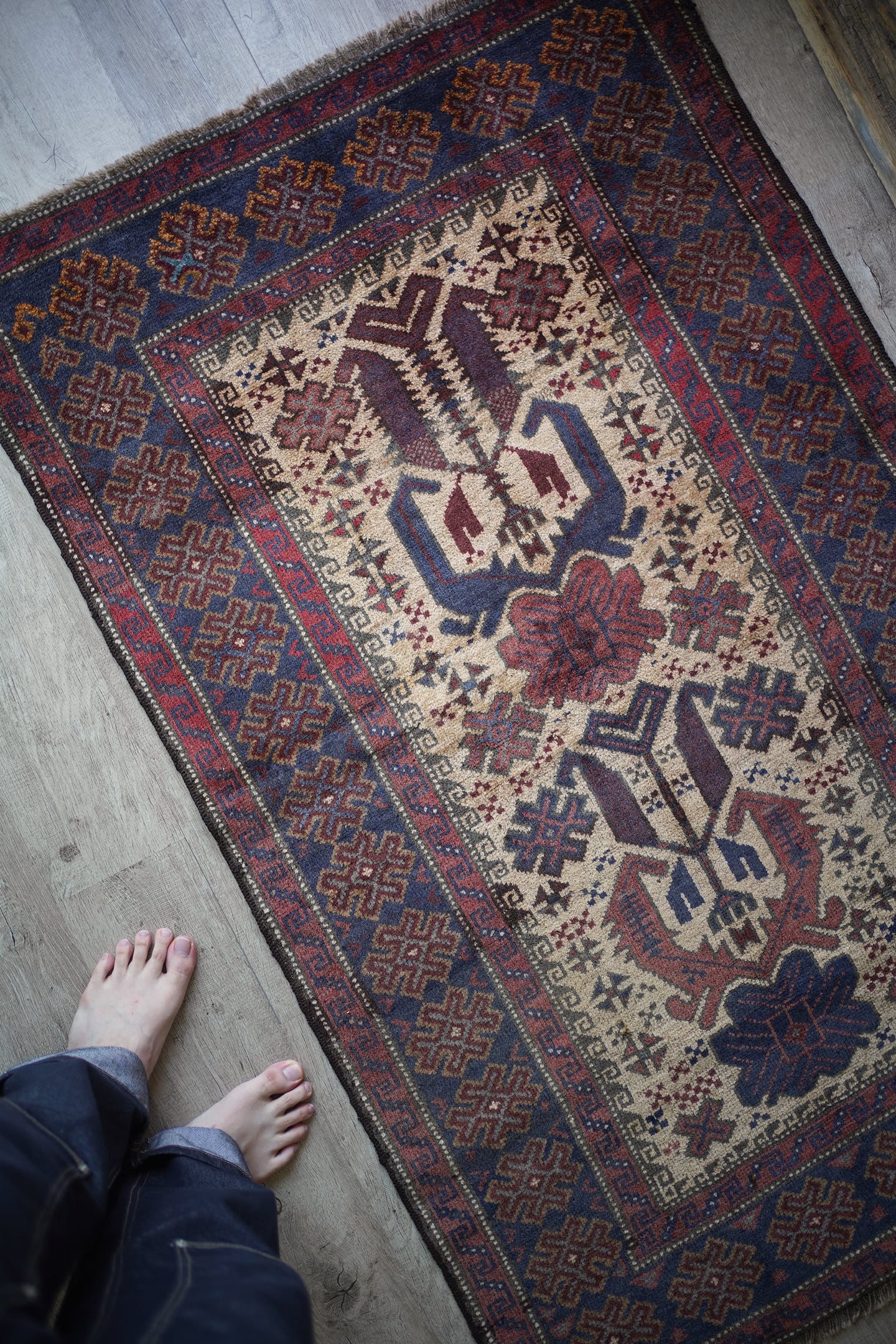 約50年前にバルーチ族によって織られたラグです。ベージュ、ブラウン、薄めのブラックの色構成でTHE ヴィンテージラグ感のある雰囲気が素敵な一枚。表面はふわっと優しい肌触りで、6mmほどの厚みです。目立ったダメージもなく、状態も良好。落ち着いた色味ですので、ご自宅のインテリアにスッと馴染んでくれるかと思います。