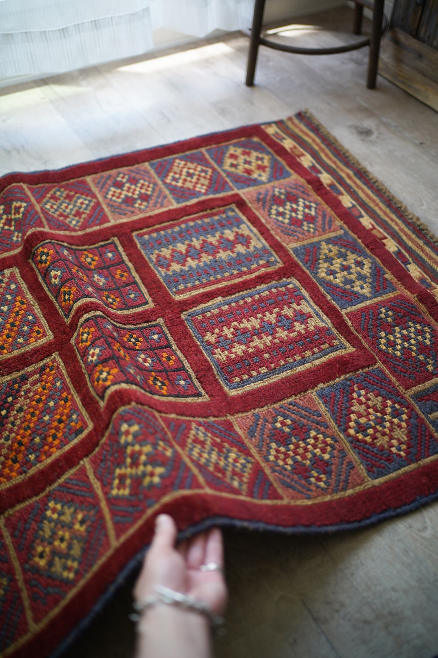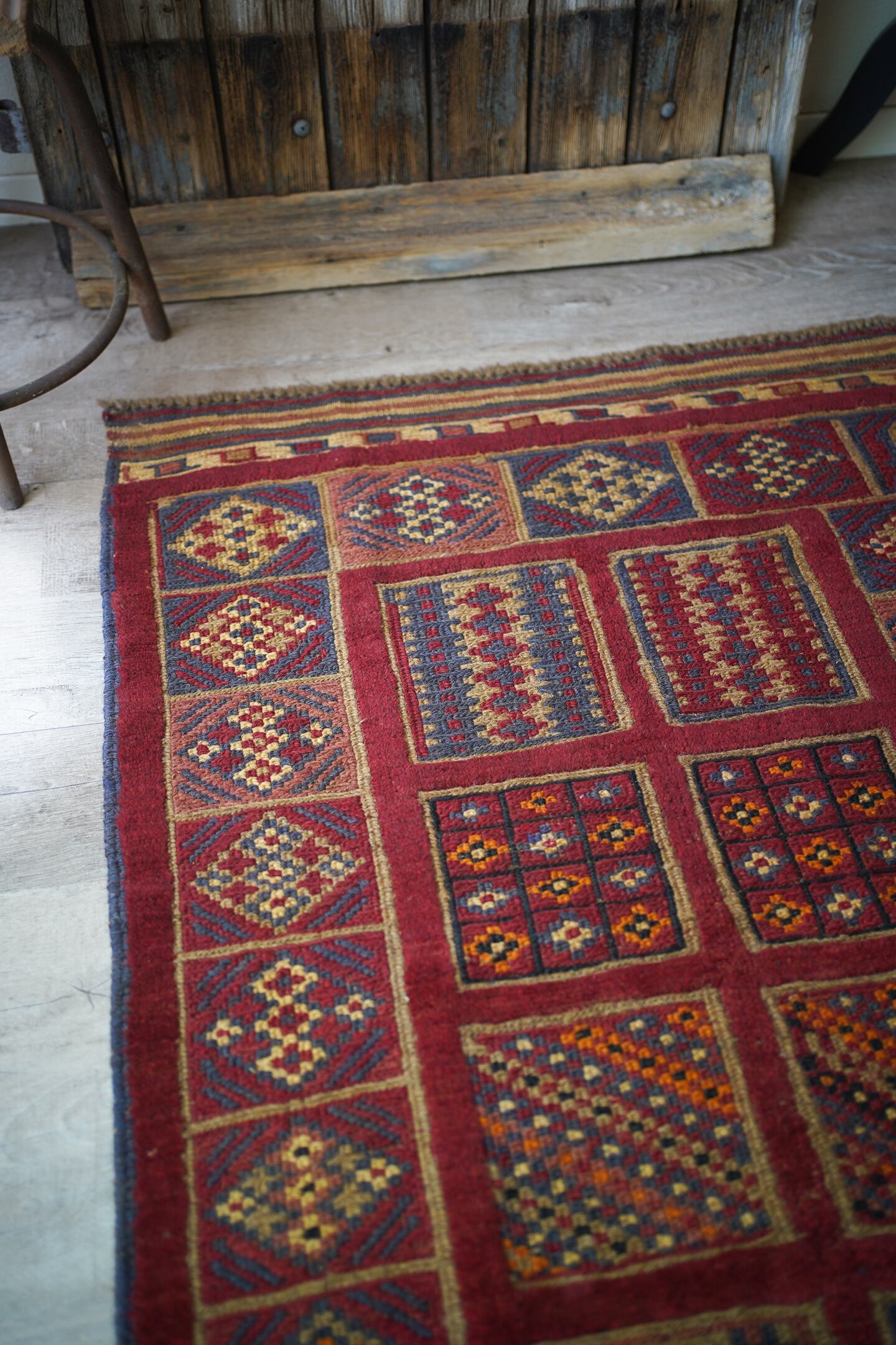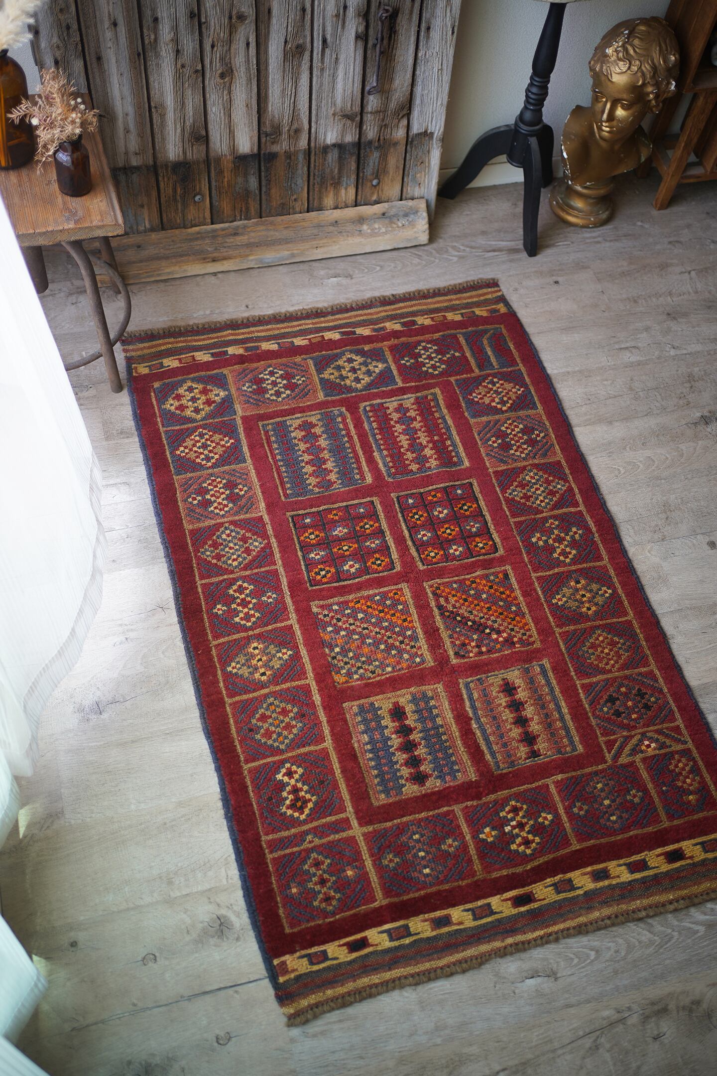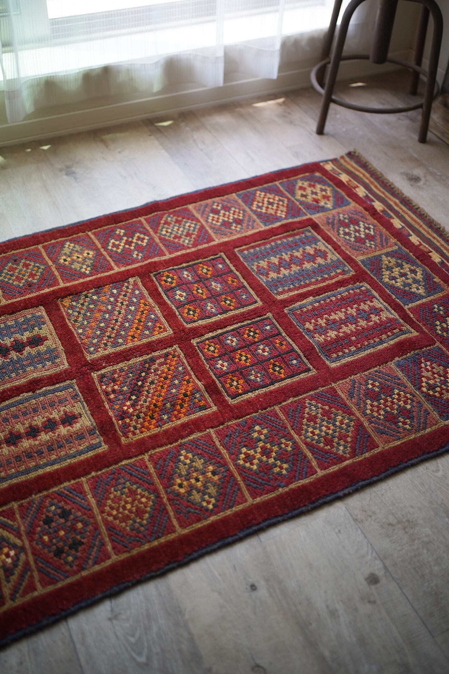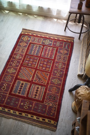 経年30年のアフガン産のバラジャスタラグ。バラジャスタとはアフガニスタンの都市ヘラートに居住するマシュワニ族が織る、ポコポコとした凹凸が特徴的なパイルとキリムをミックスしたラグです。四角形をモチーフにしたデザインには様々な柄が織り込まれており、眺めているだけでも楽しく可愛らしい一枚。配色はパイル織り箇所は落ち着いた赤、四角形のキリム部分はグレーやオレンジ、ベージュなどのマルチカラーとなっています。また表面の感触はパイル織り部分はふわっと柔らかい肌触り、キリム部分はサラサラと乾いた肌触りの質感です。厚みは8mmほど。目立ったダメージはなく、状態も大変良好です。
