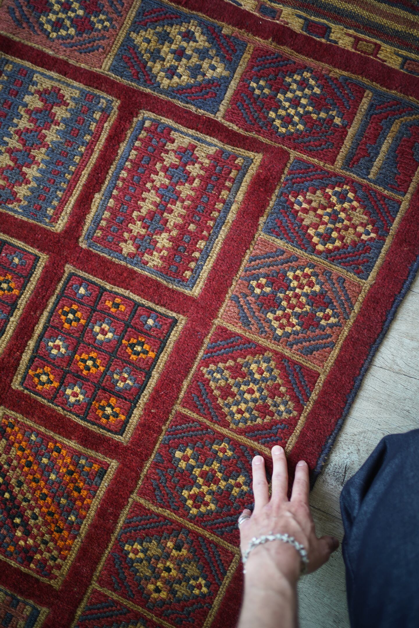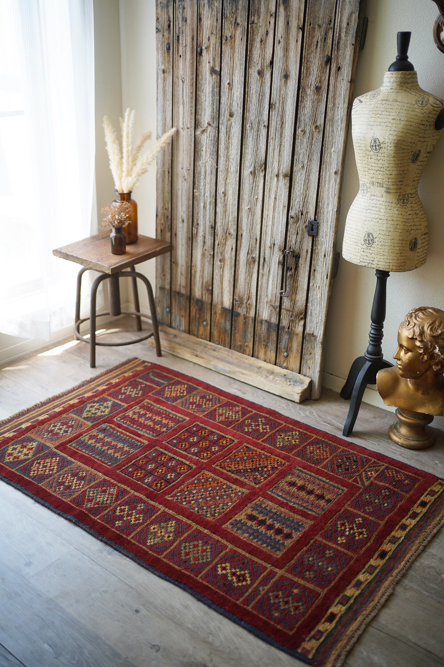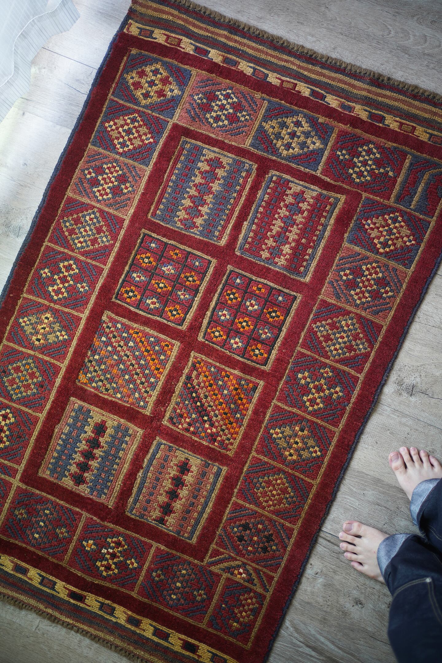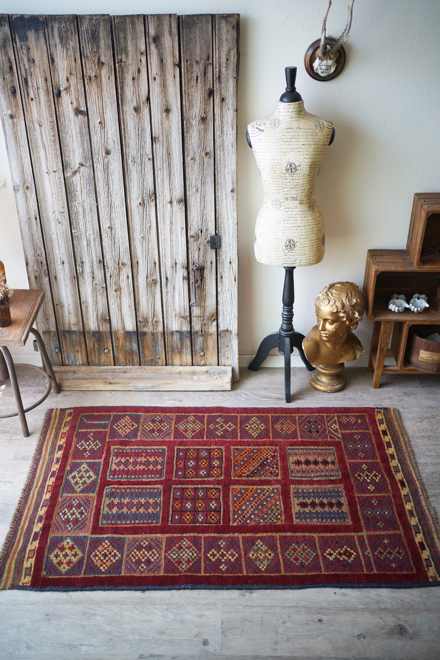 経年30年のアフガン産のバラジャスタラグ。バラジャスタとはアフガニスタンの都市ヘラートに居住するマシュワニ族が織る、ポコポコとした凹凸が特徴的なパイルとキリムをミックスしたラグです。四角形をモチーフにしたデザインには様々な柄が織り込まれており、眺めているだけでも楽しく可愛らしい一枚。配色はパイル織り箇所は落ち着いた赤、四角形のキリム部分はグレーやオレンジ、ベージュなどのマルチカラーとなっています。また表面の感触はパイル織り部分はふわっと柔らかい肌触り、キリム部分はサラサラと乾いた肌触りの質感です。厚みは8mmほど。目立ったダメージはなく、状態も大変良好です。