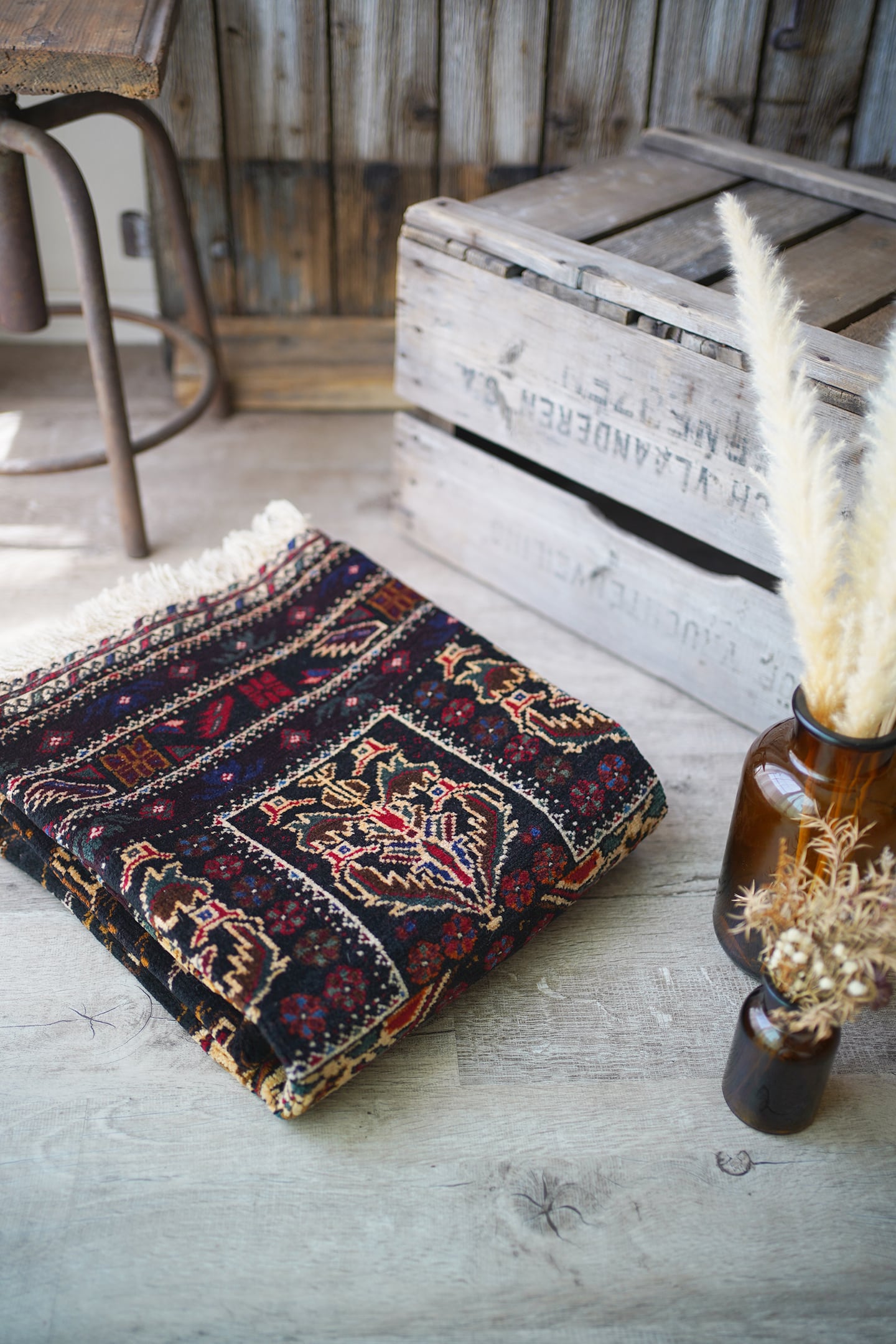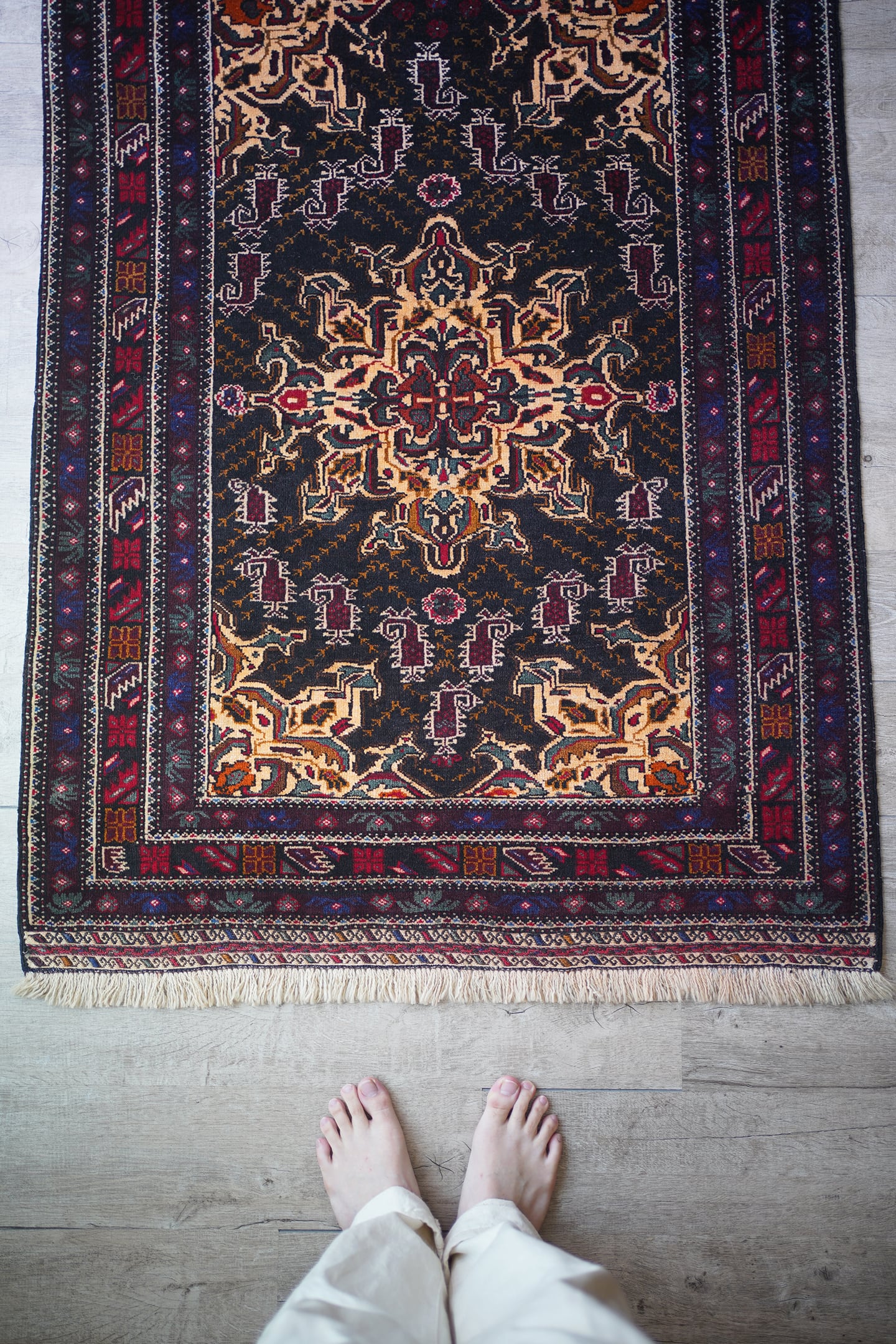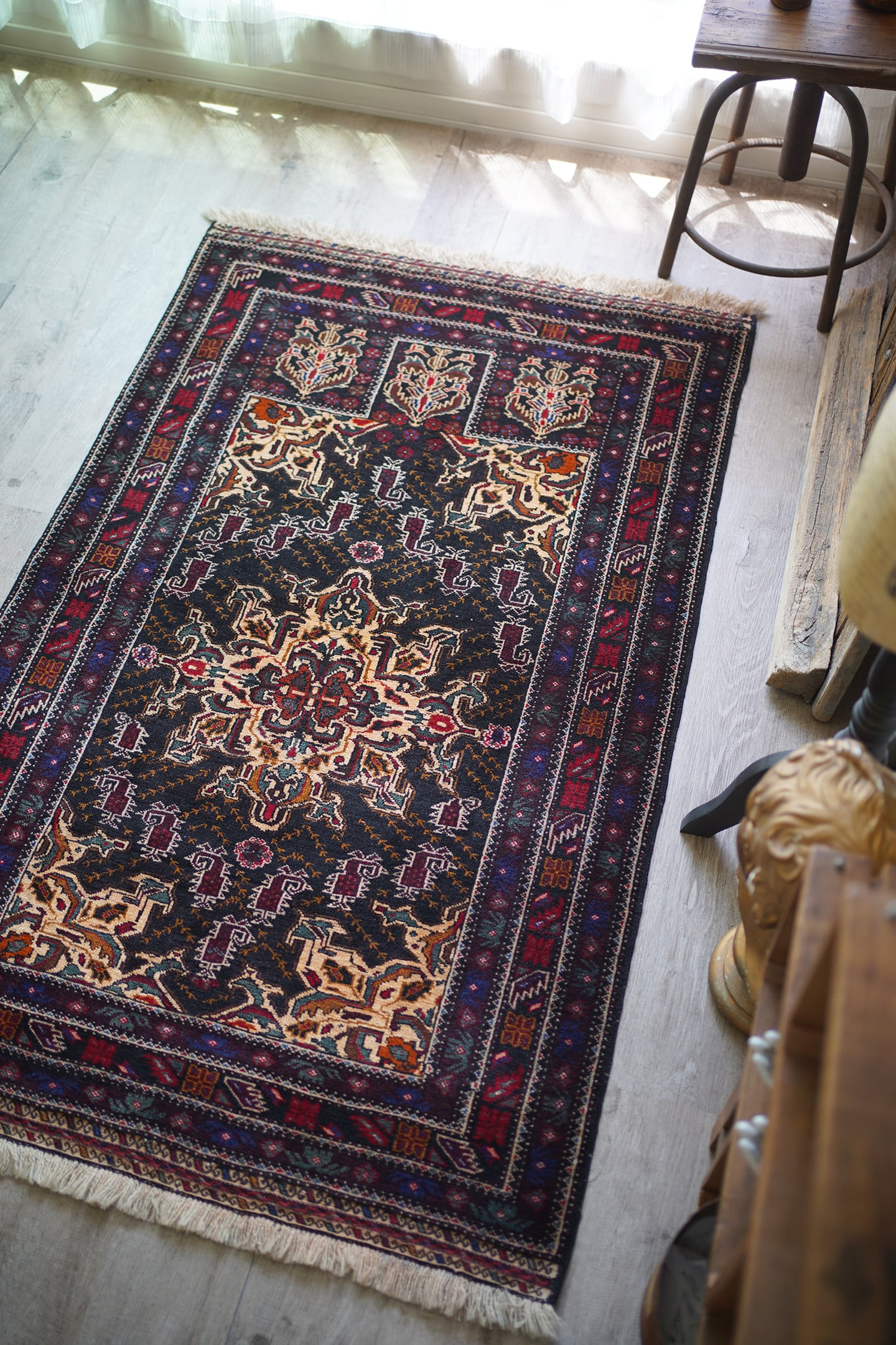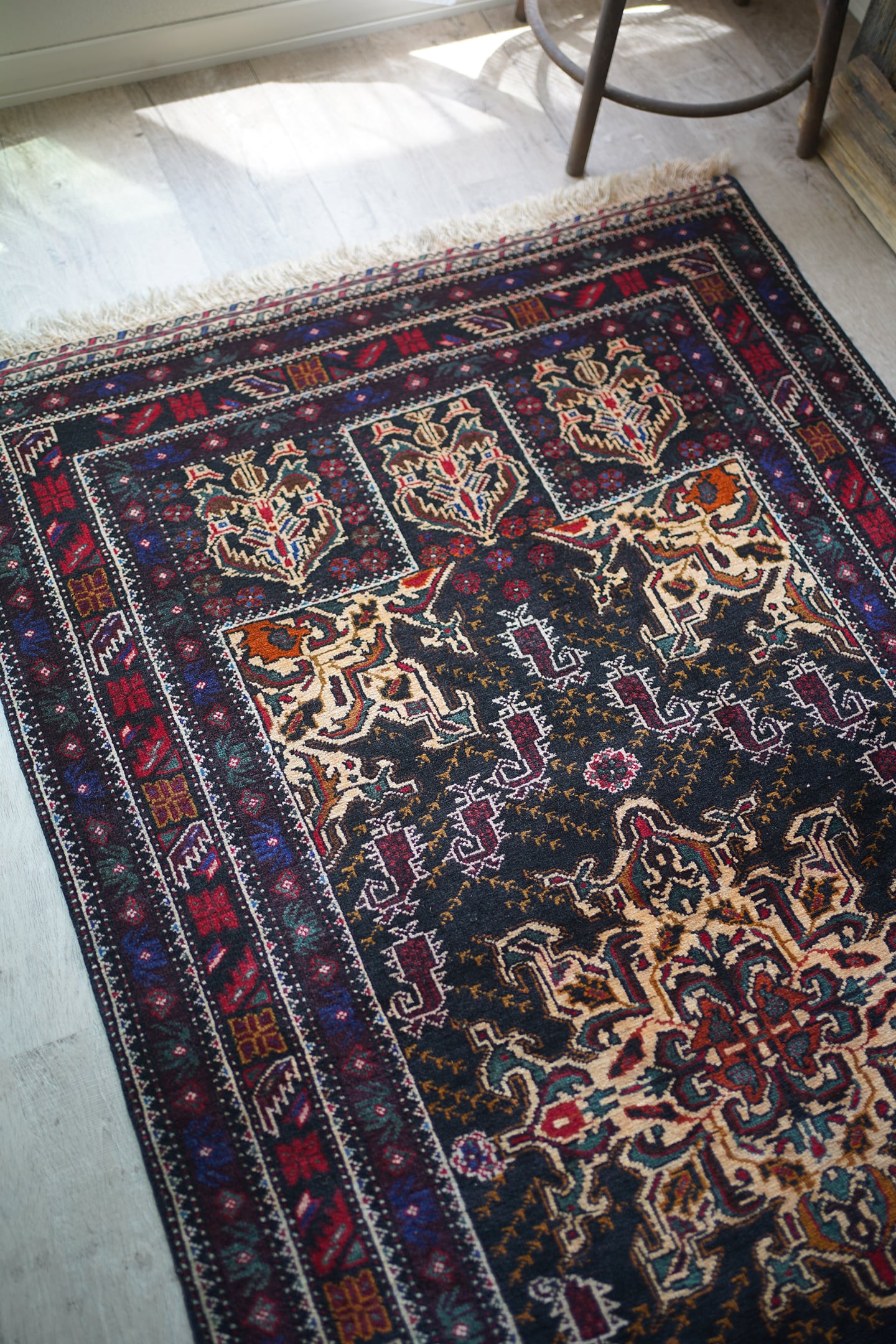 経年約35年のアフガニスタン産のマリキバルーチラグ。ブラックをベースに、紋様はオレンジベージュ、その他に赤、紺、ブルーグリーンなどのマルチカラーが使われた配色です。ふわサラッとした気持ちの良い肌触りで、6mm程度の厚みです。パイルの長さの均一感含めて上質な一枚で、コンディションもパーフェクト。リビングをはじめ、書斎などにもオススメです♫
