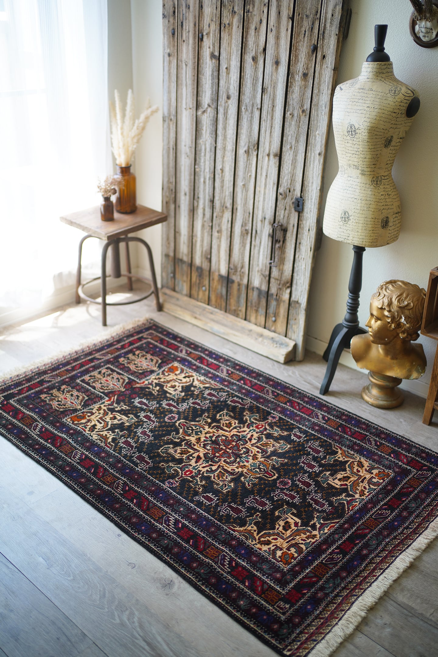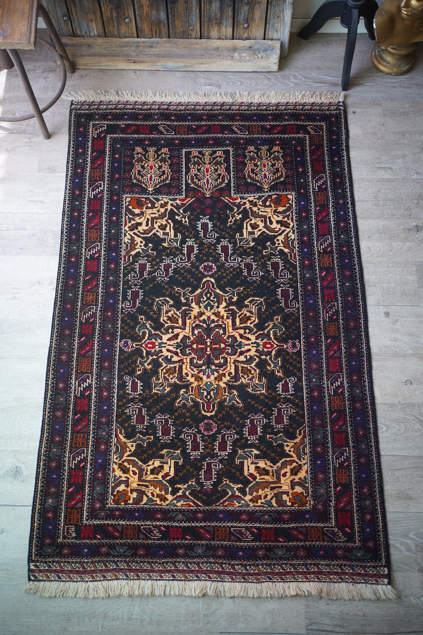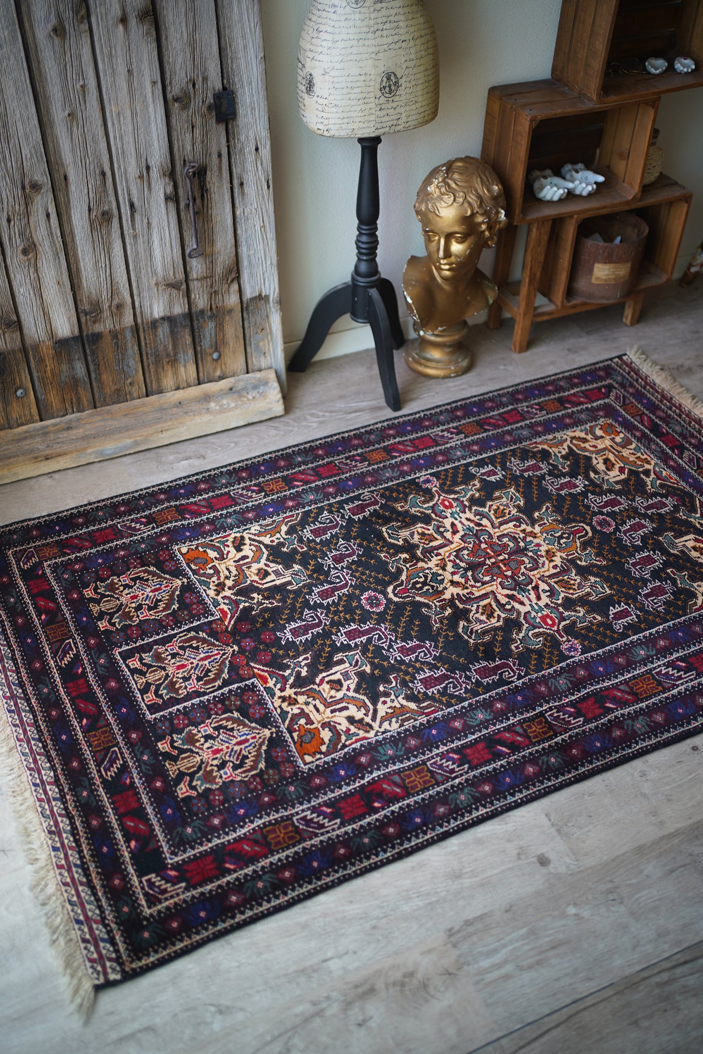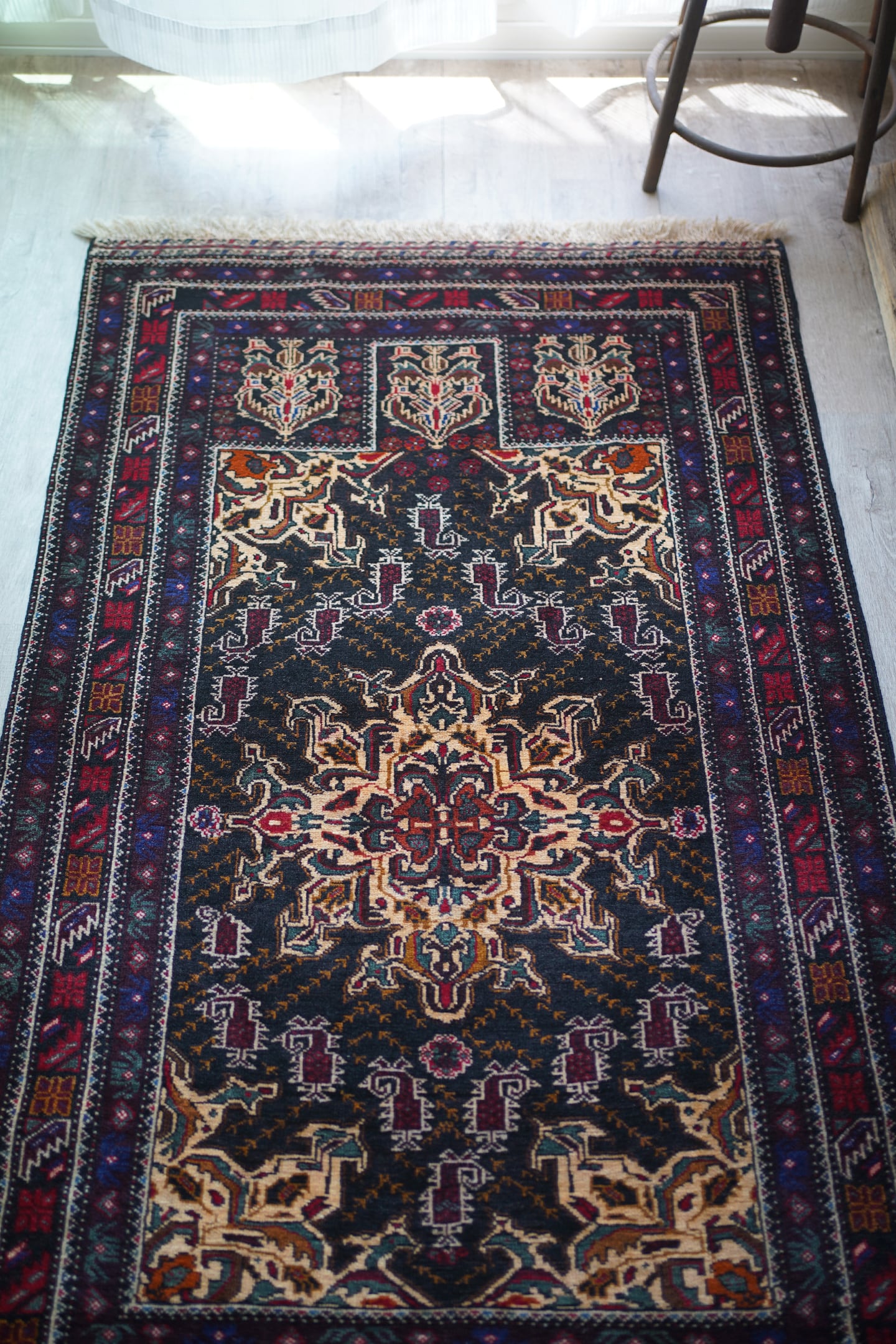 経年約35年のアフガニスタン産のマリキバルーチラグ。ブラックをベースに、紋様はオレンジベージュ、その他に赤、紺、ブルーグリーンなどのマルチカラーが使われた配色です。ふわサラッとした気持ちの良い肌触りで、6mm程度の厚みです。パイルの長さの均一感含めて上質な一枚で、コンディションもパーフェクト。リビングをはじめ、書斎などにもオススメです♫