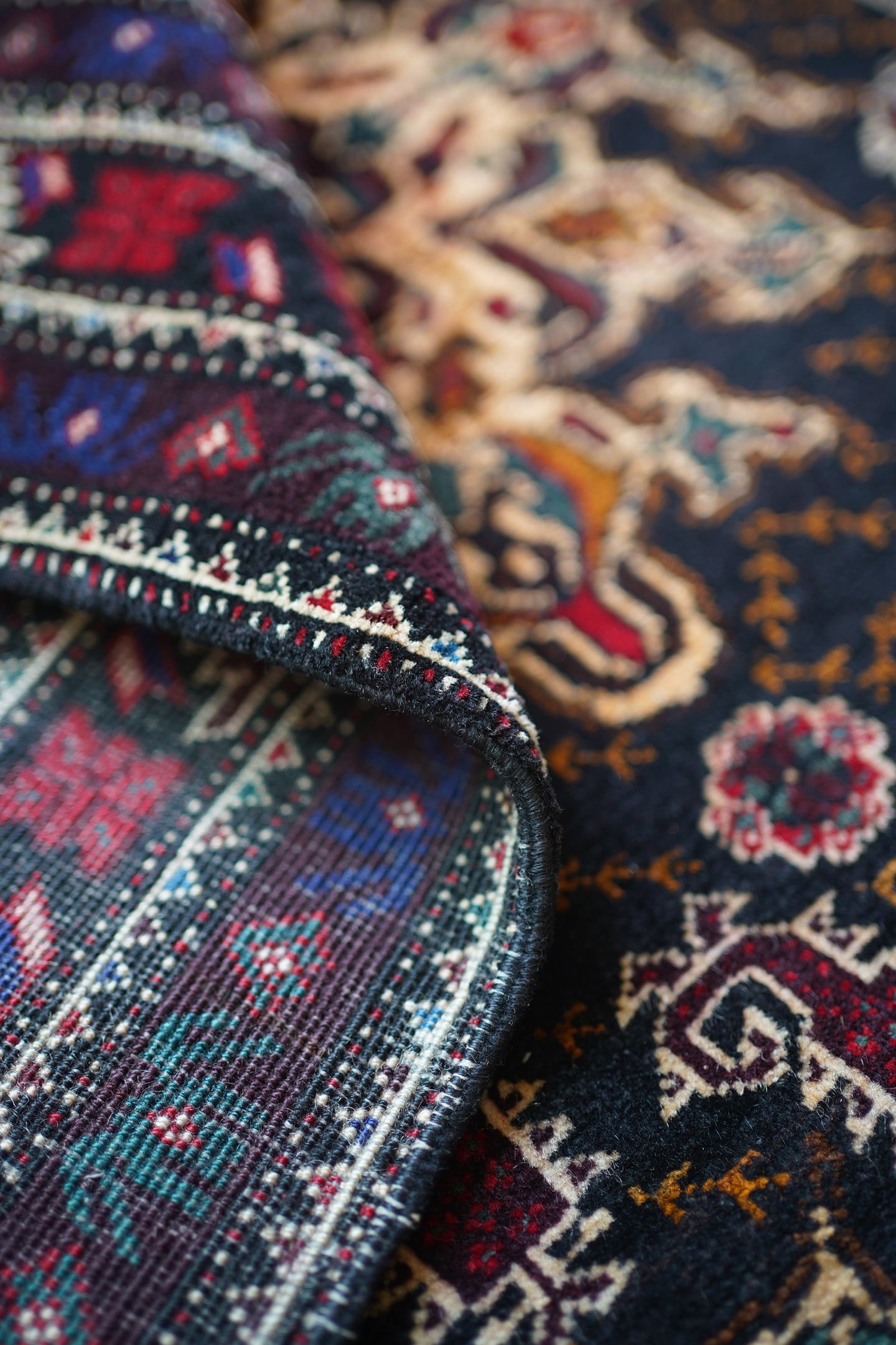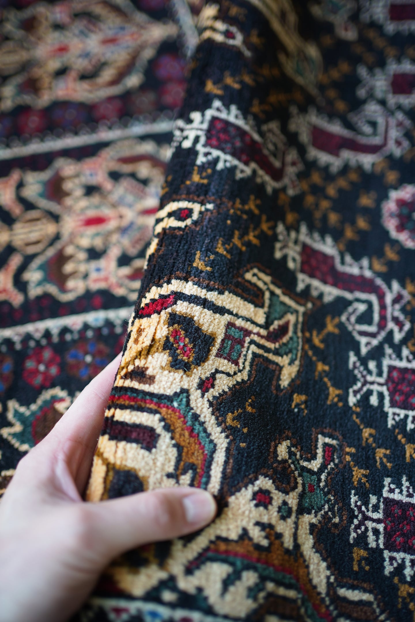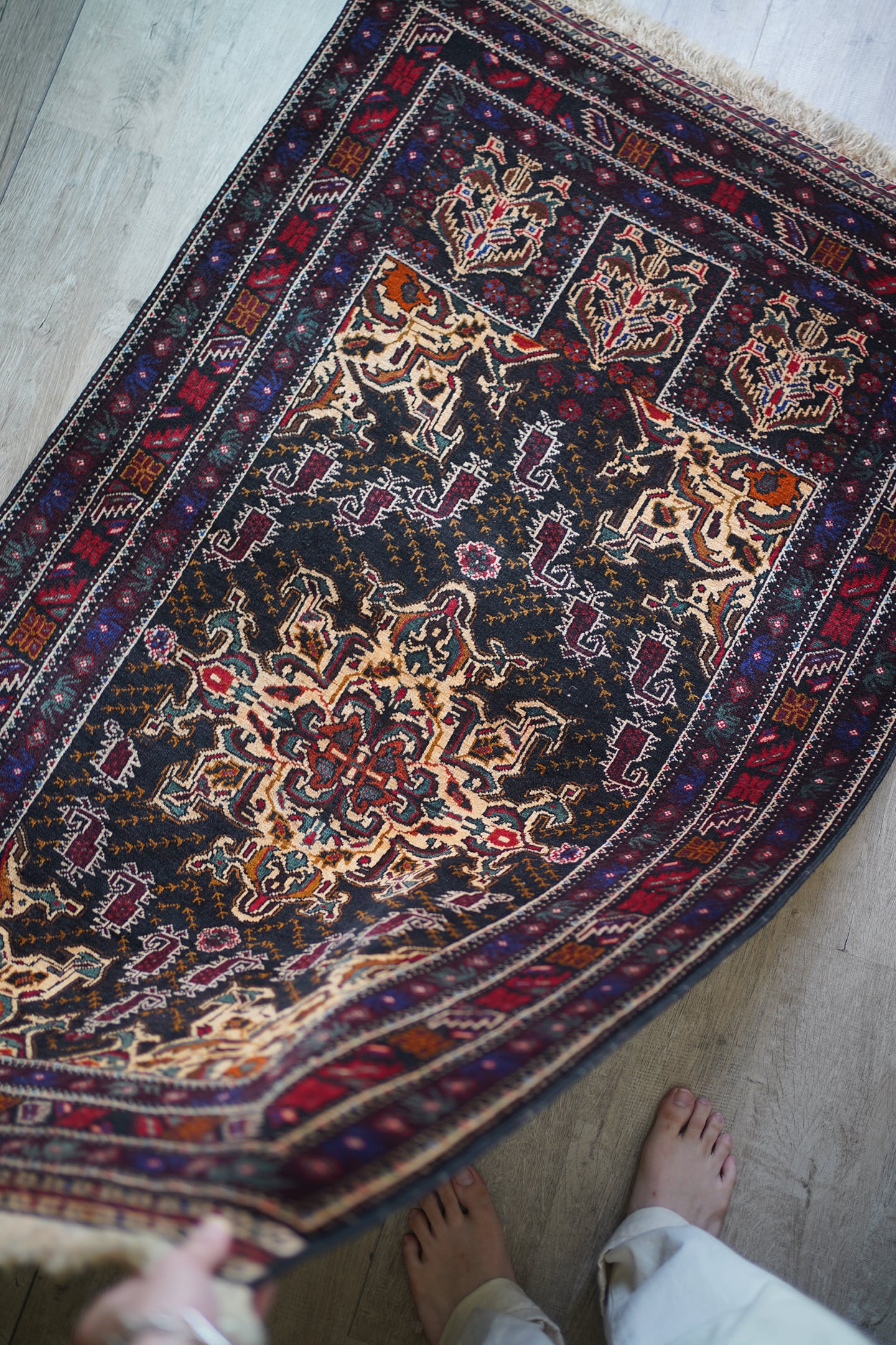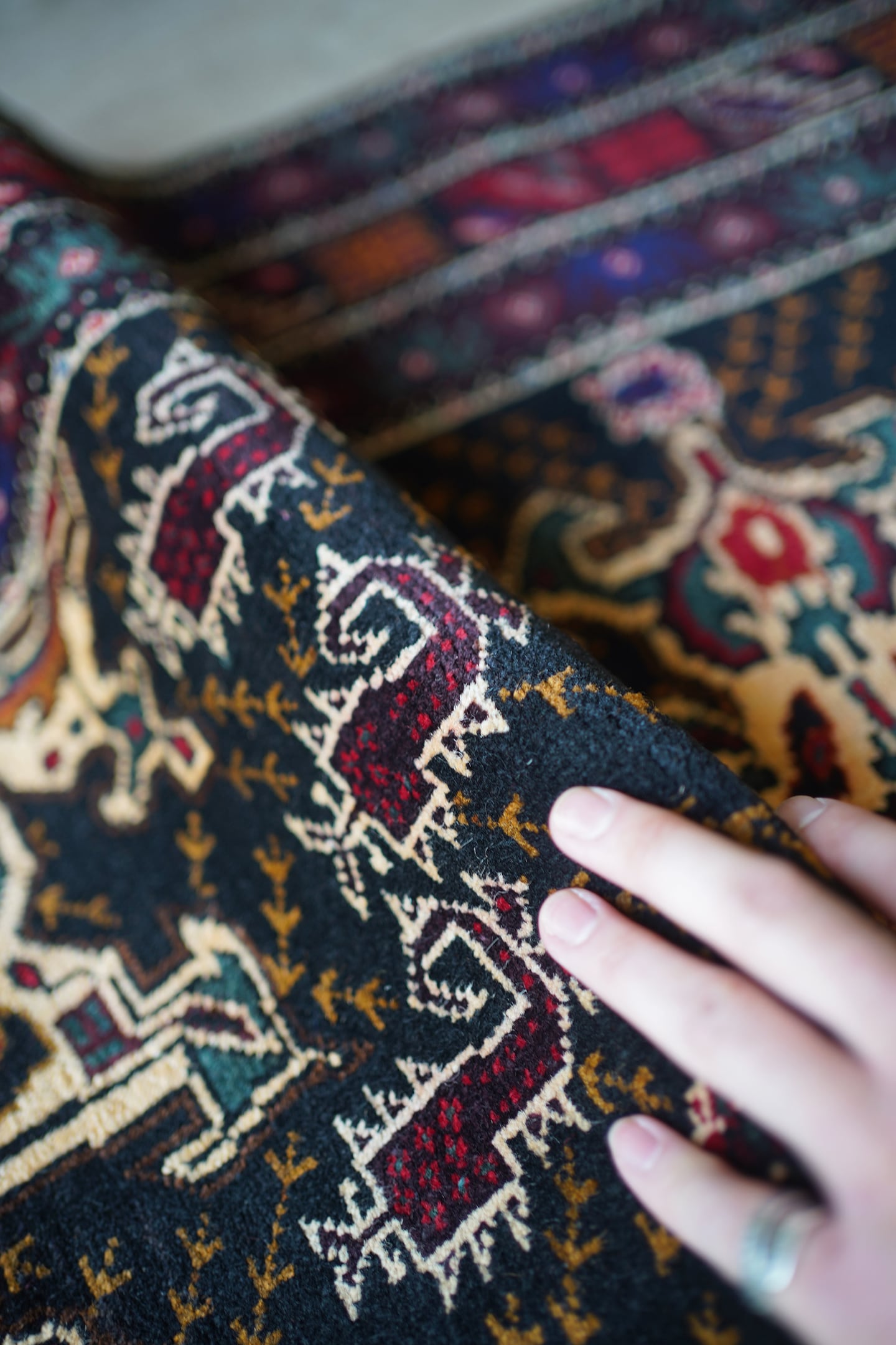 経年約35年のアフガニスタン産のマリキバルーチラグ。ブラックをベースに、紋様はオレンジベージュ、その他に赤、紺、ブルーグリーンなどのマルチカラーが使われた配色です。ふわサラッとした気持ちの良い肌触りで、6mm程度の厚みです。パイルの長さの均一感含めて上質な一枚で、コンディションもパーフェクト。リビングをはじめ、書斎などにもオススメです♫
