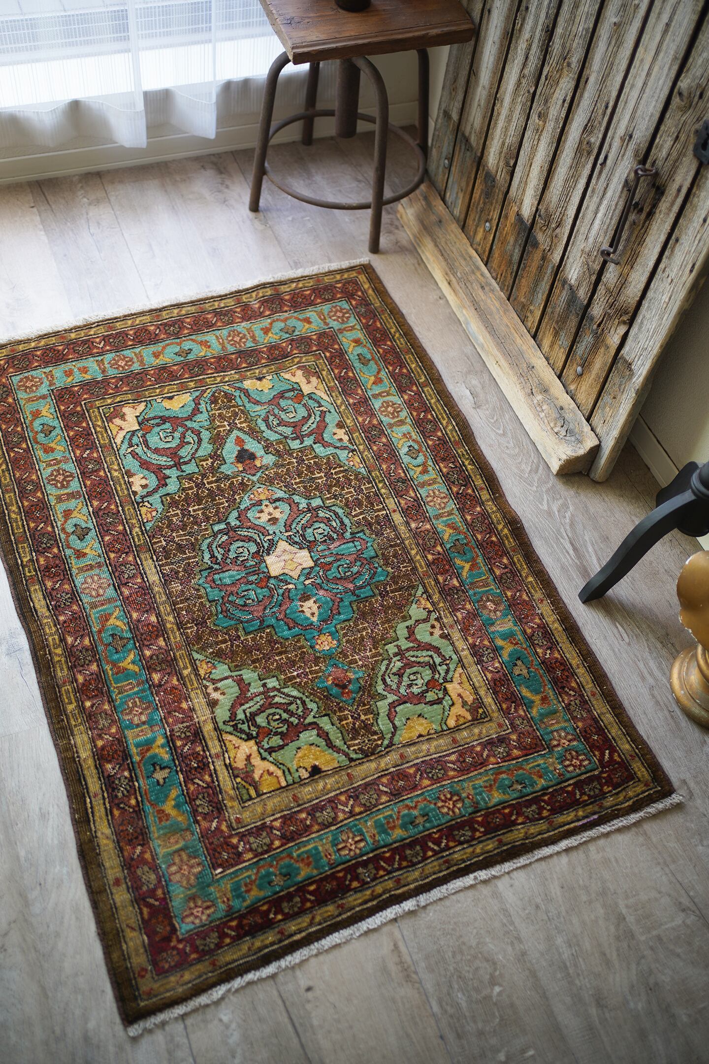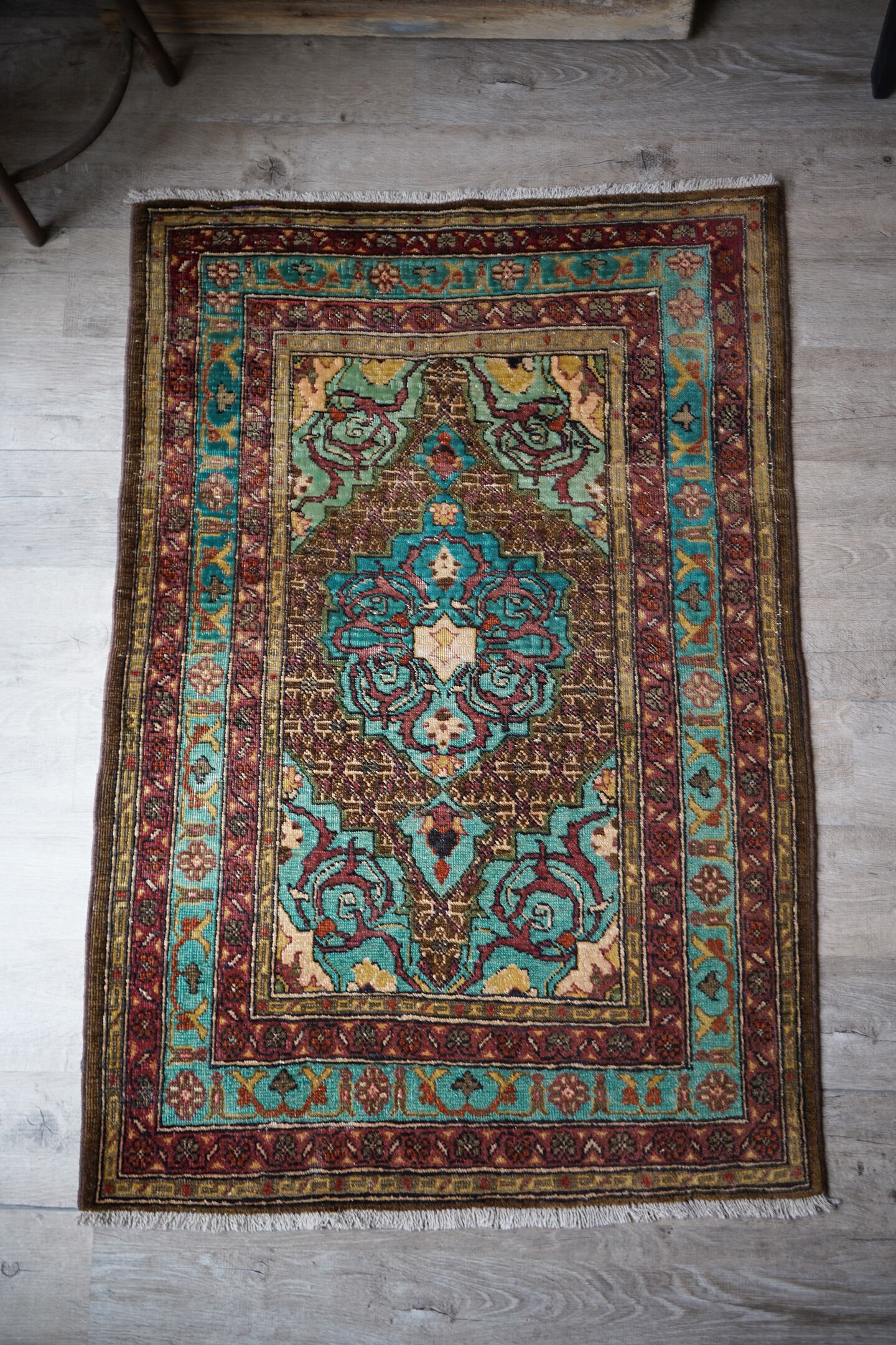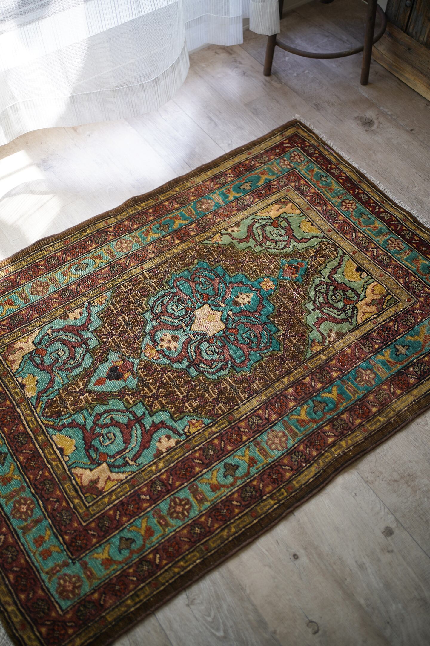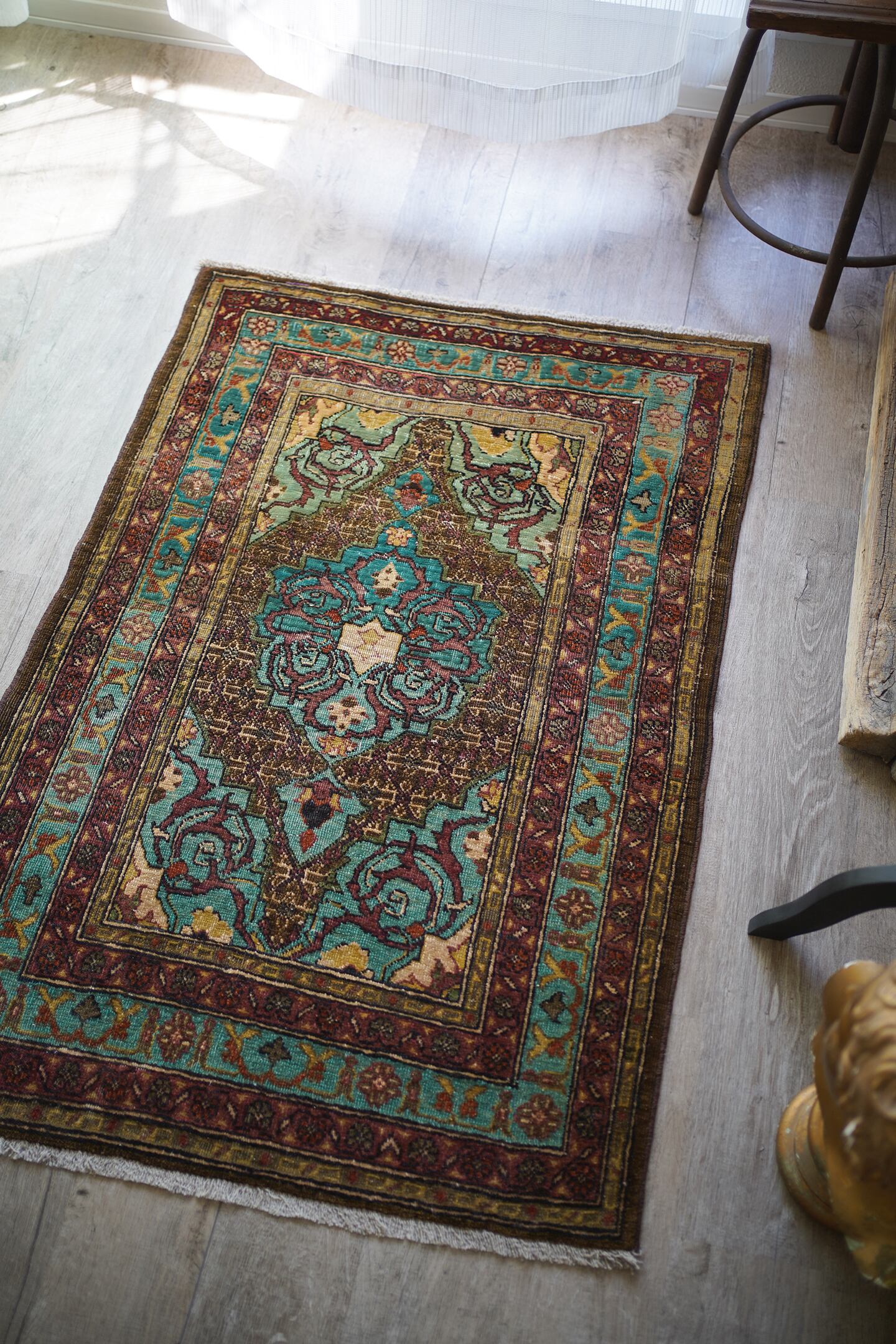 イラン北西部の都市タブリーズ周辺で織られた経年80年のセミアンティークラグ。エメラルドグリーンとブラウンをベースにした珍しい色味に惹かれて仕入れを決めた一枚です。経年によりパイルが薄くなっており、表面はサラサラとした肌触り。厚みは6mm程度で、全体的にハリのある質感です。目立った補修もなくグッドコンディション。小さめながら存在もあり素敵ですよ♫