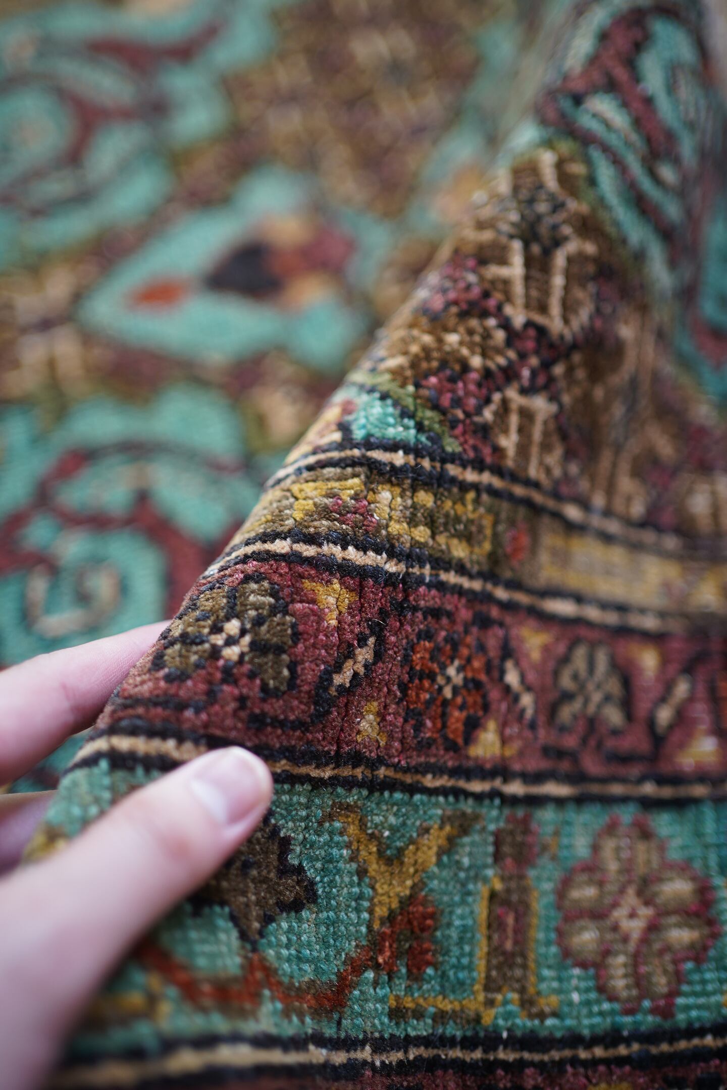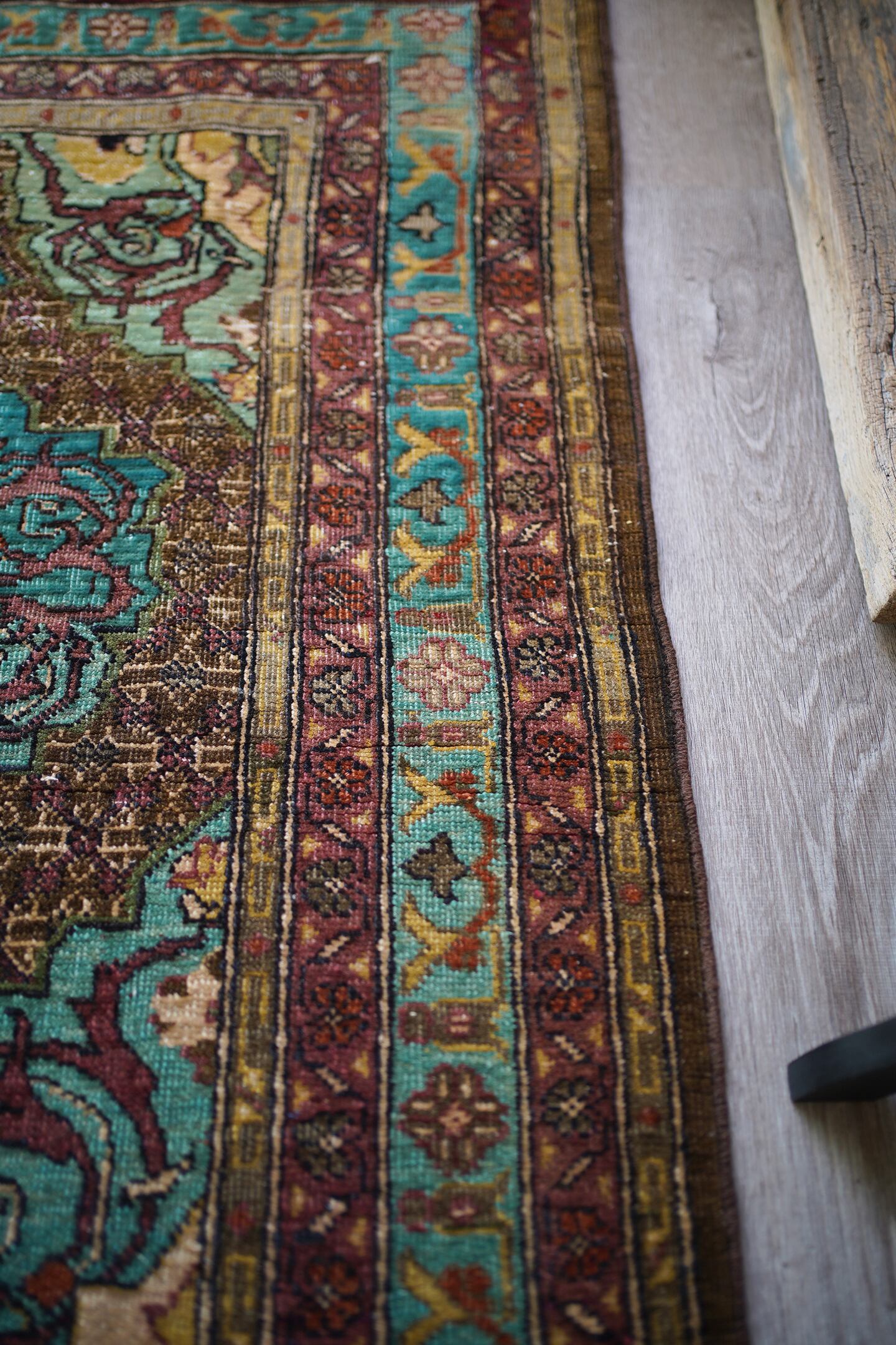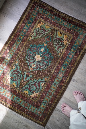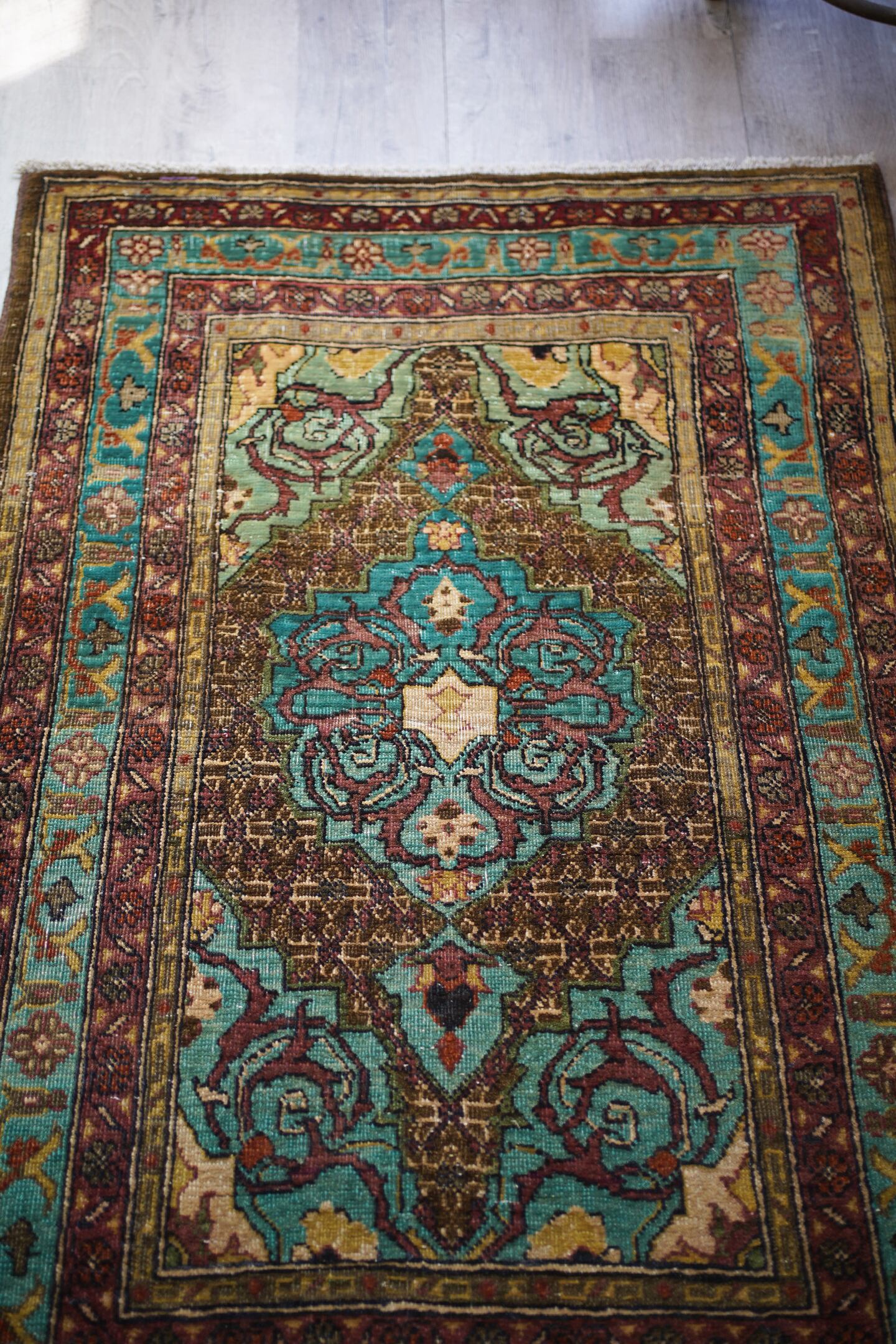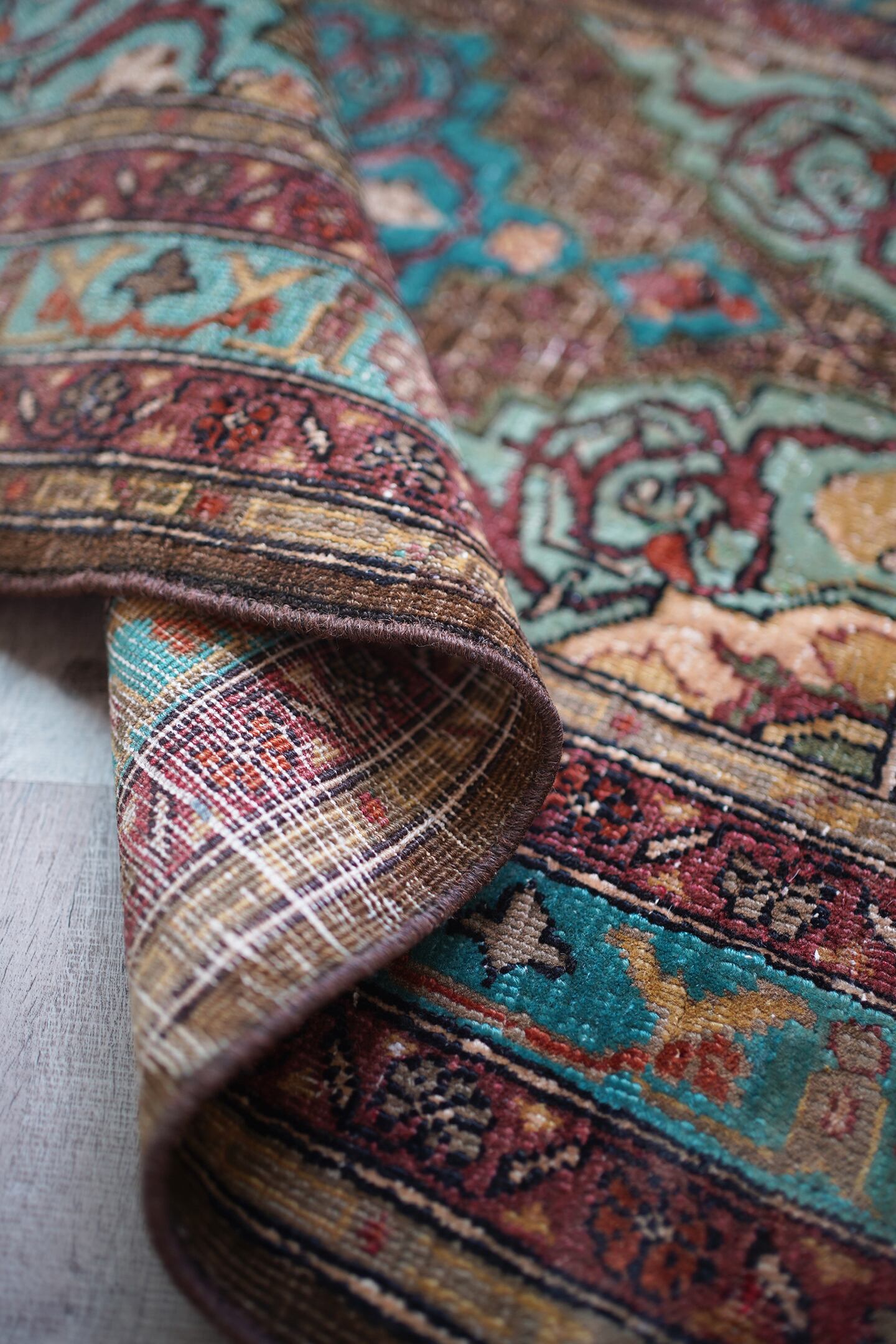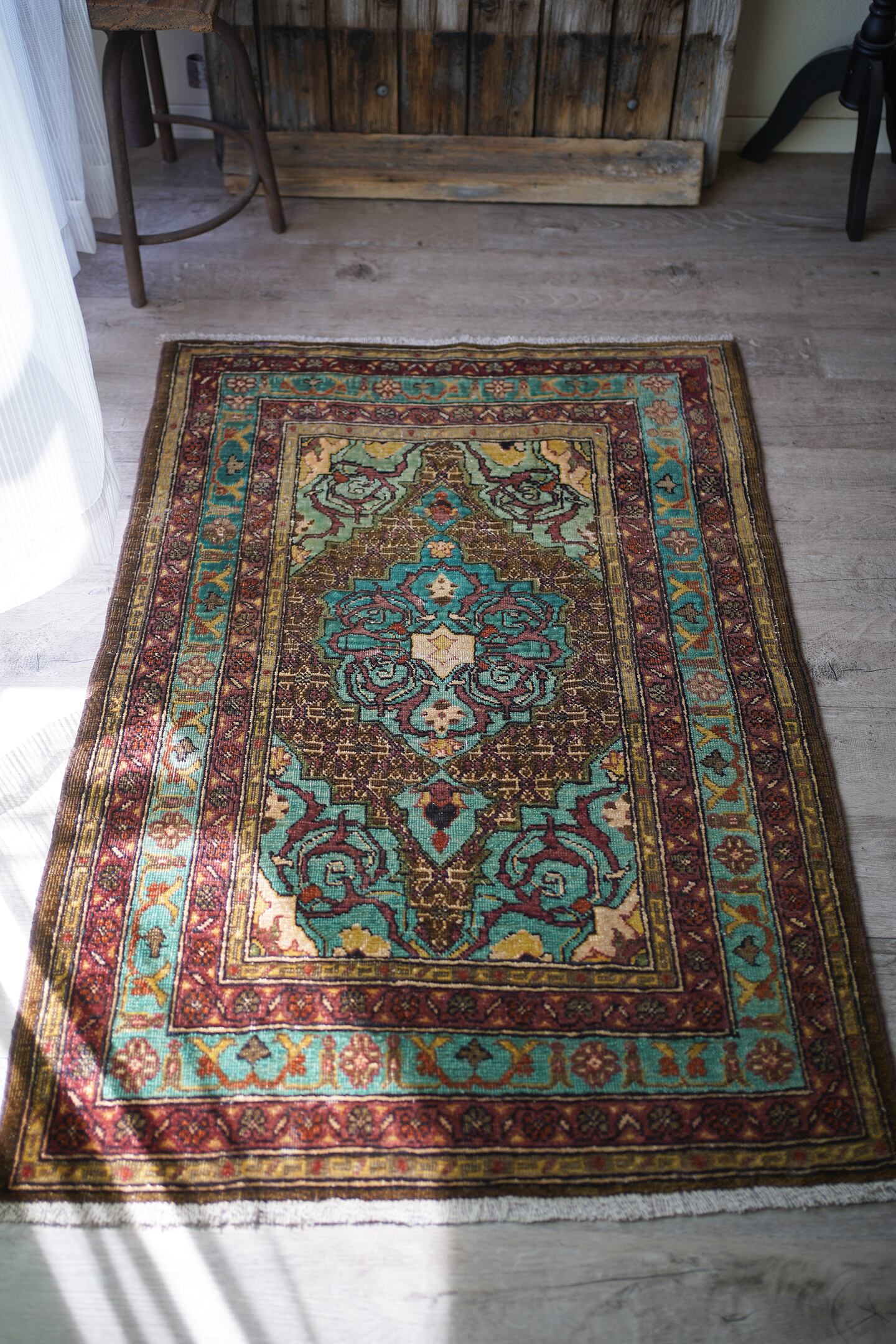 イラン北西部の都市タブリーズ周辺で織られた経年80年のセミアンティークラグ。エメラルドグリーンとブラウンをベースにした珍しい色味に惹かれて仕入れを決めた一枚です。経年によりパイルが薄くなっており、表面はサラサラとした肌触り。厚みは6mm程度で、全体的にハリのある質感です。目立った補修もなくグッドコンディション。小さめながら存在もあり素敵ですよ♫