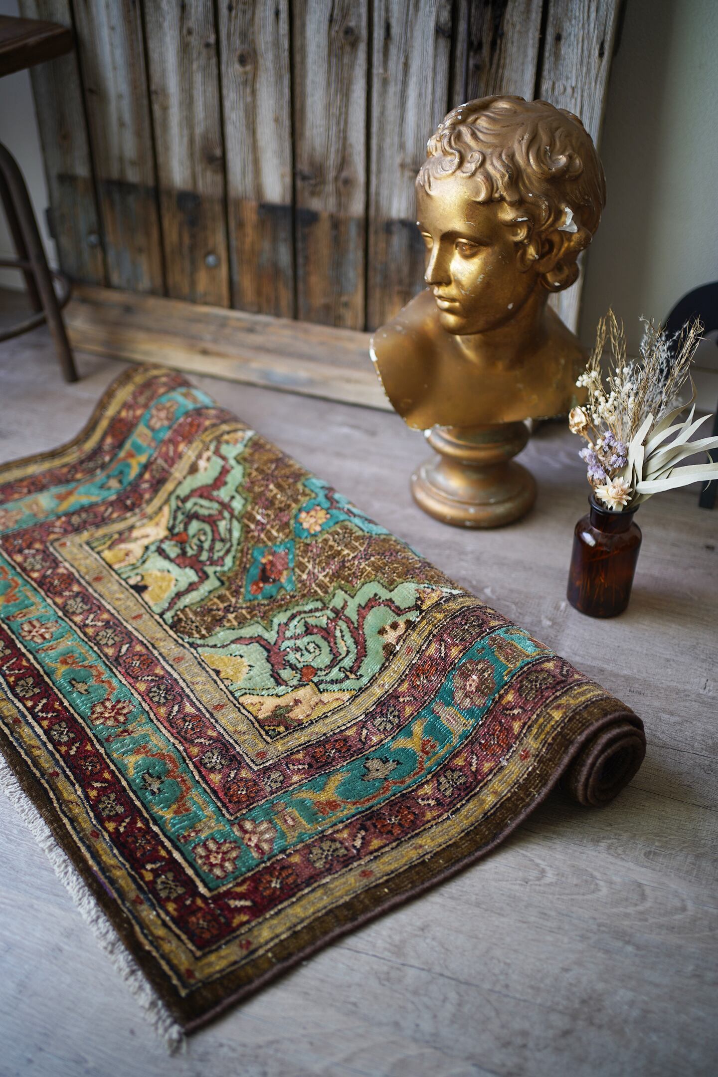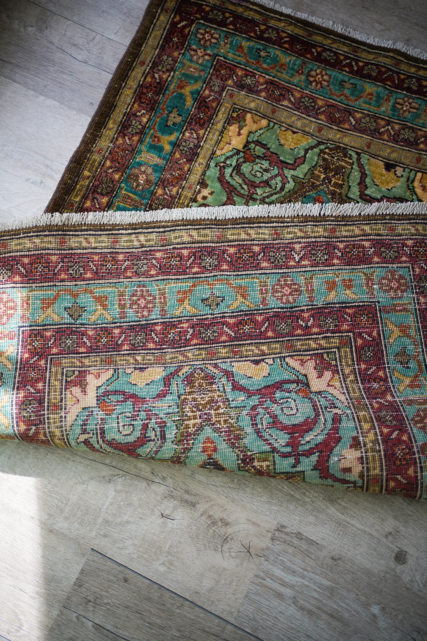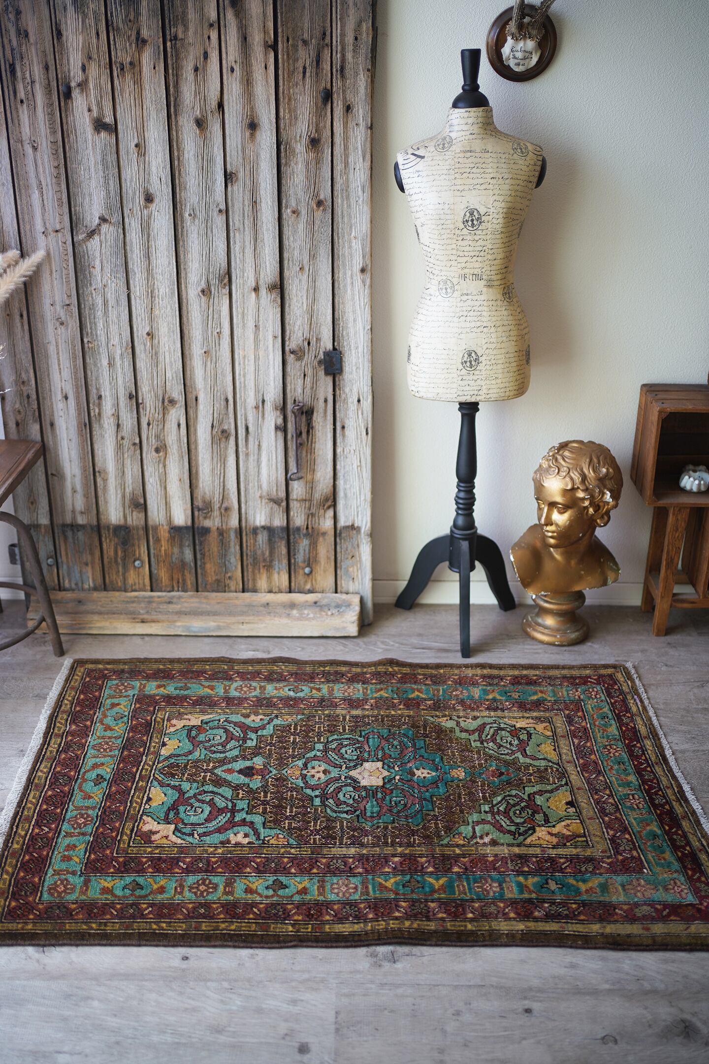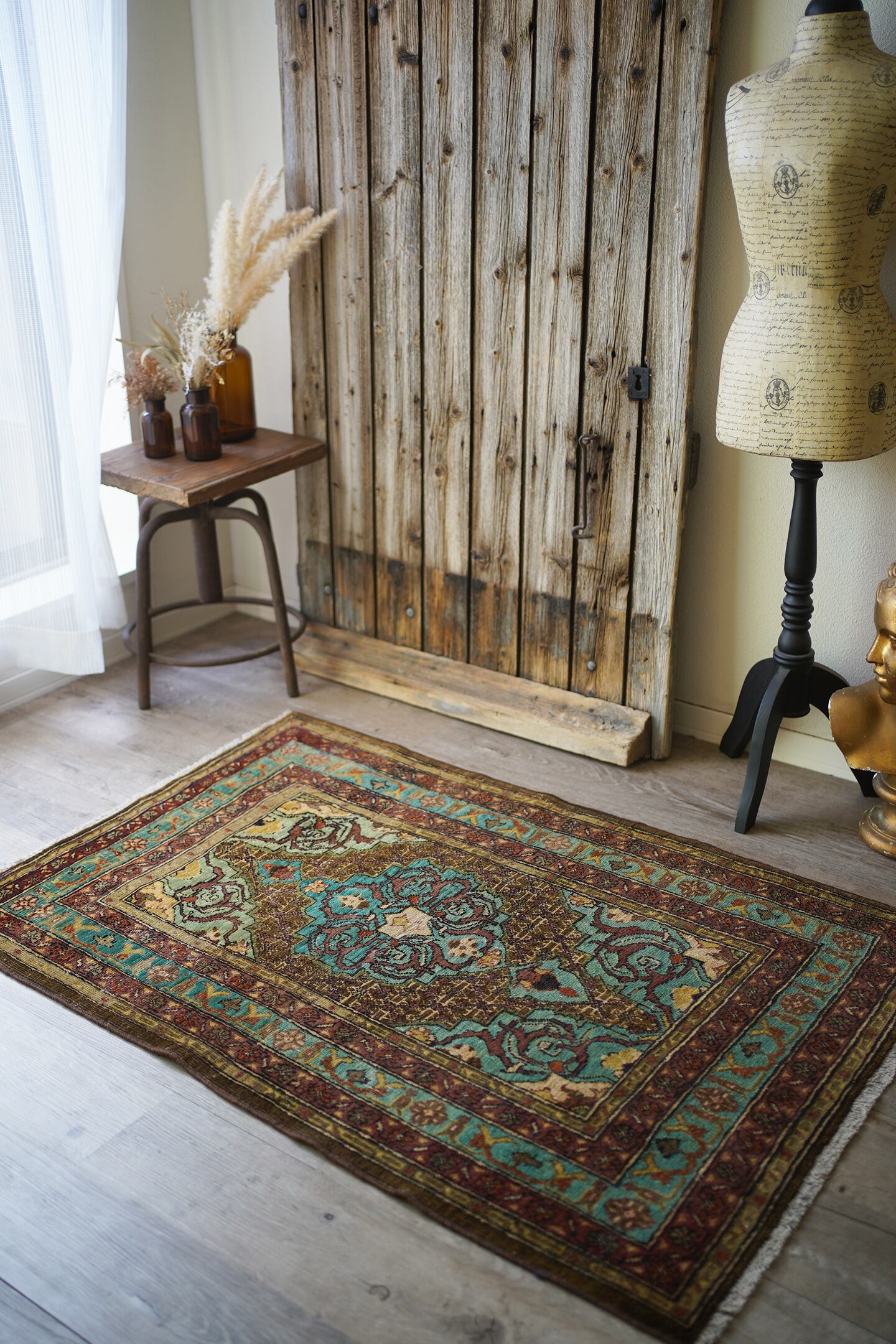 イラン北西部の都市タブリーズ周辺で織られた経年80年のセミアンティークラグ。エメラルドグリーンとブラウンをベースにした珍しい色味に惹かれて仕入れを決めた一枚です。経年によりパイルが薄くなっており、表面はサラサラとした肌触り。厚みは6mm程度で、全体的にハリのある質感です。目立った補修もなくグッドコンディション。小さめながら存在もあり素敵ですよ♫