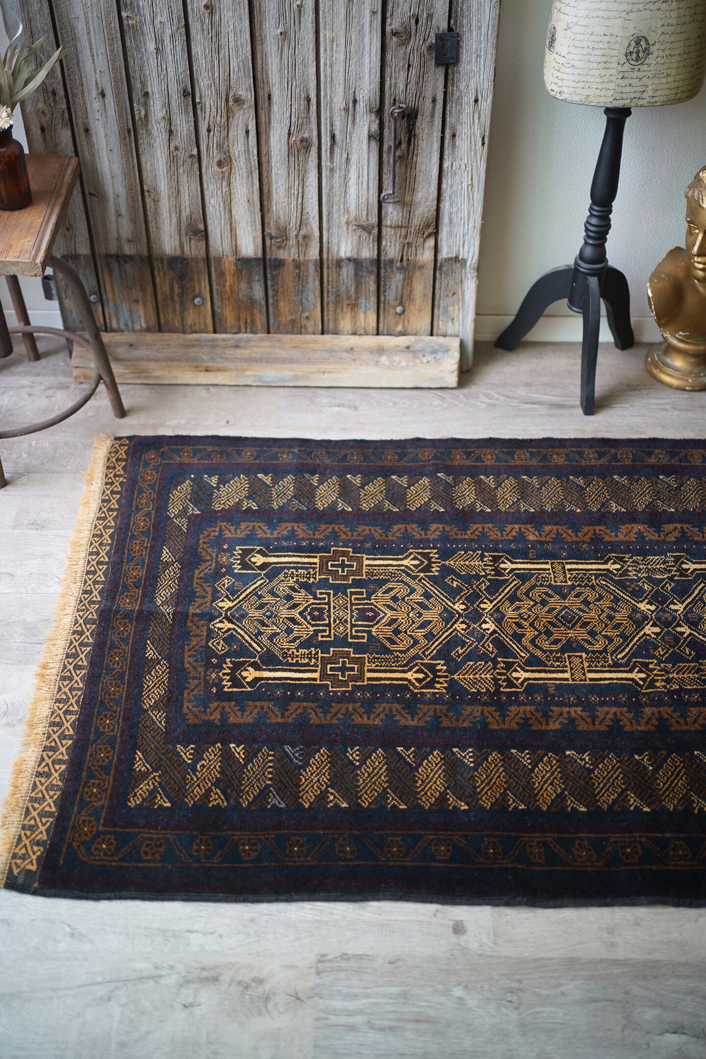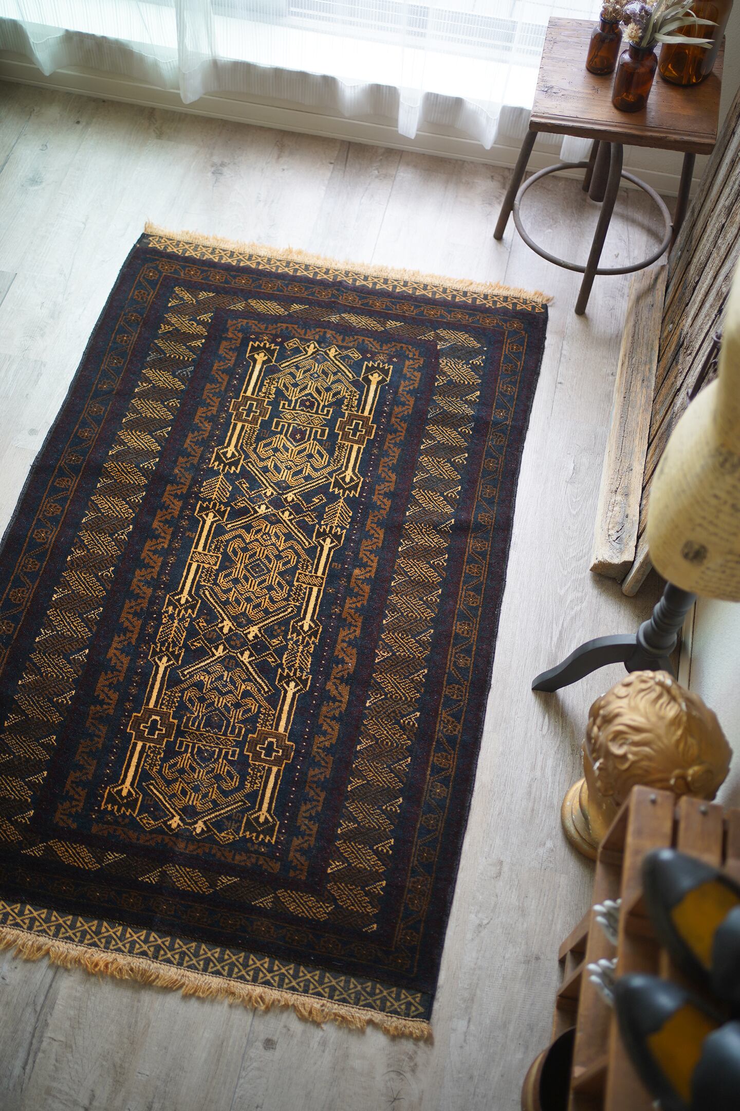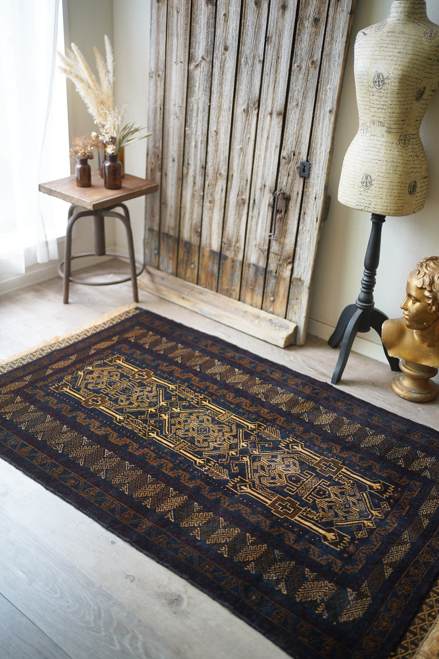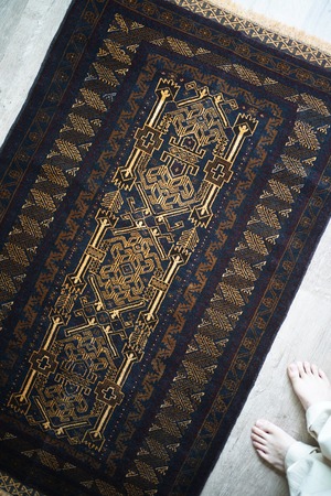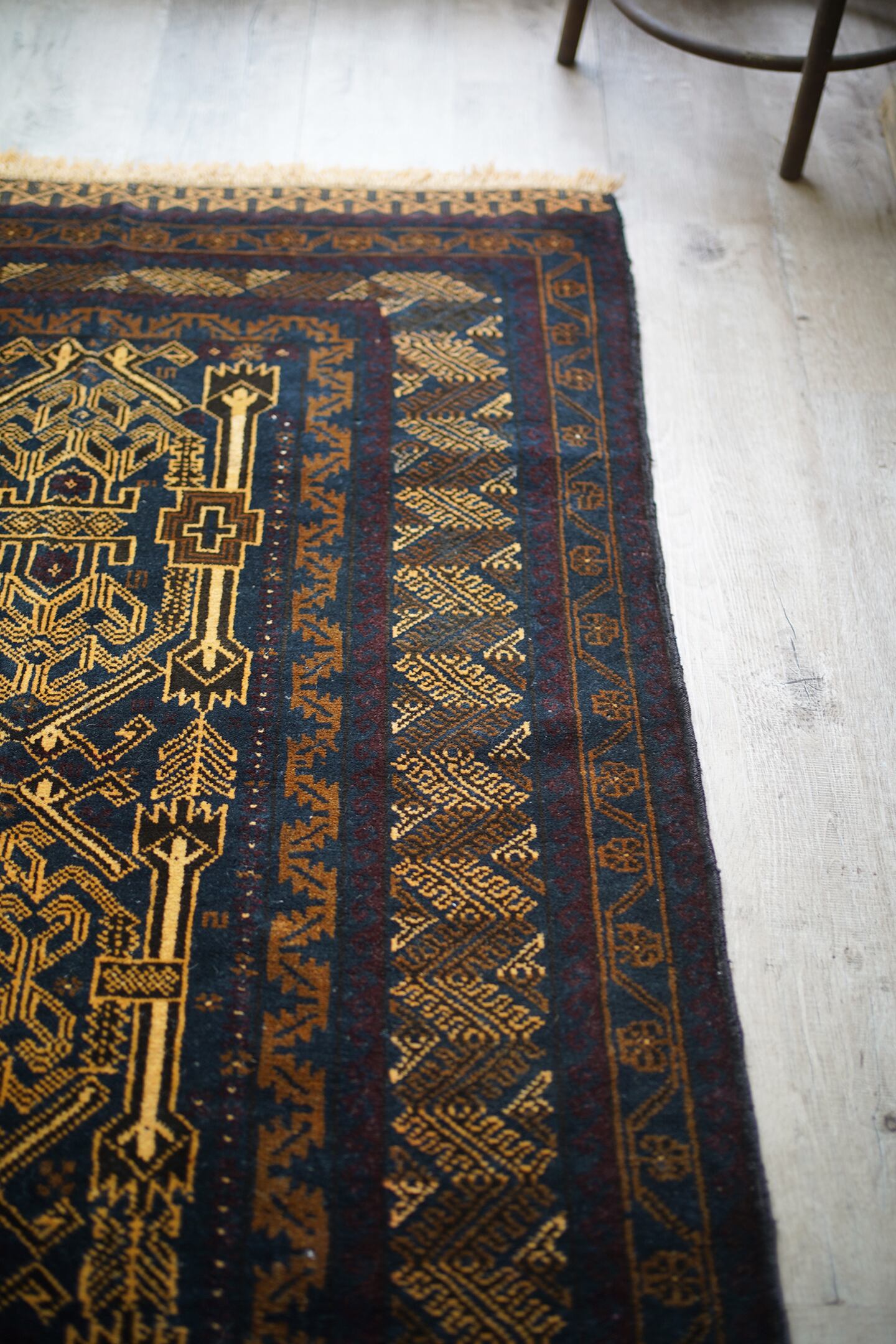 濃紺に浮かび上がる黄金色の紋様が美しい経年40年のバルーチラグ。こちらのラグは時々見かけるデザインですが、同じデザインであれど色味や質感が異なったり、キリムエンドのデザインも違ったりと色んなバリエーションがある印象です。フリンジ部分のキリムエンドは全体のデザインとマッチした統一感のあるデザイン。表面はサラッと滑らかな優しい肌触りで、厚みは6mmほど。目立ったダメージもなく状態良好です。シックで落ち着いた色合いなので、様々なインテリアとも合わせやすいかと思います♫