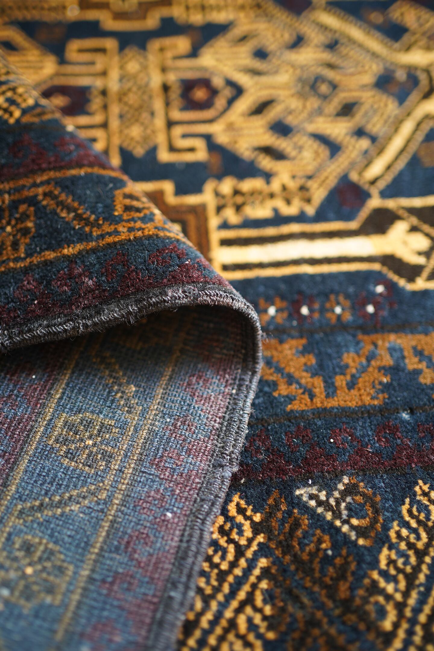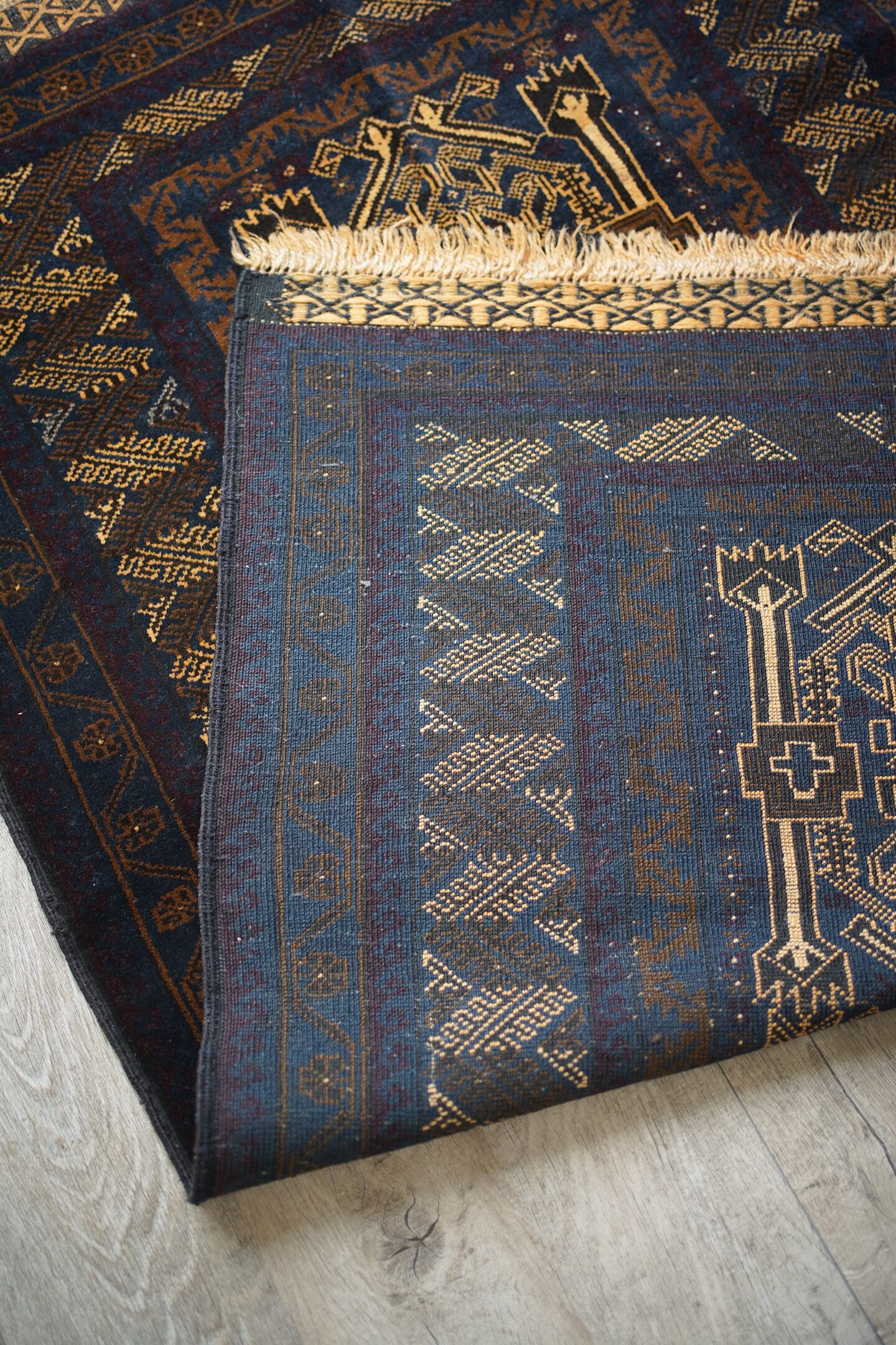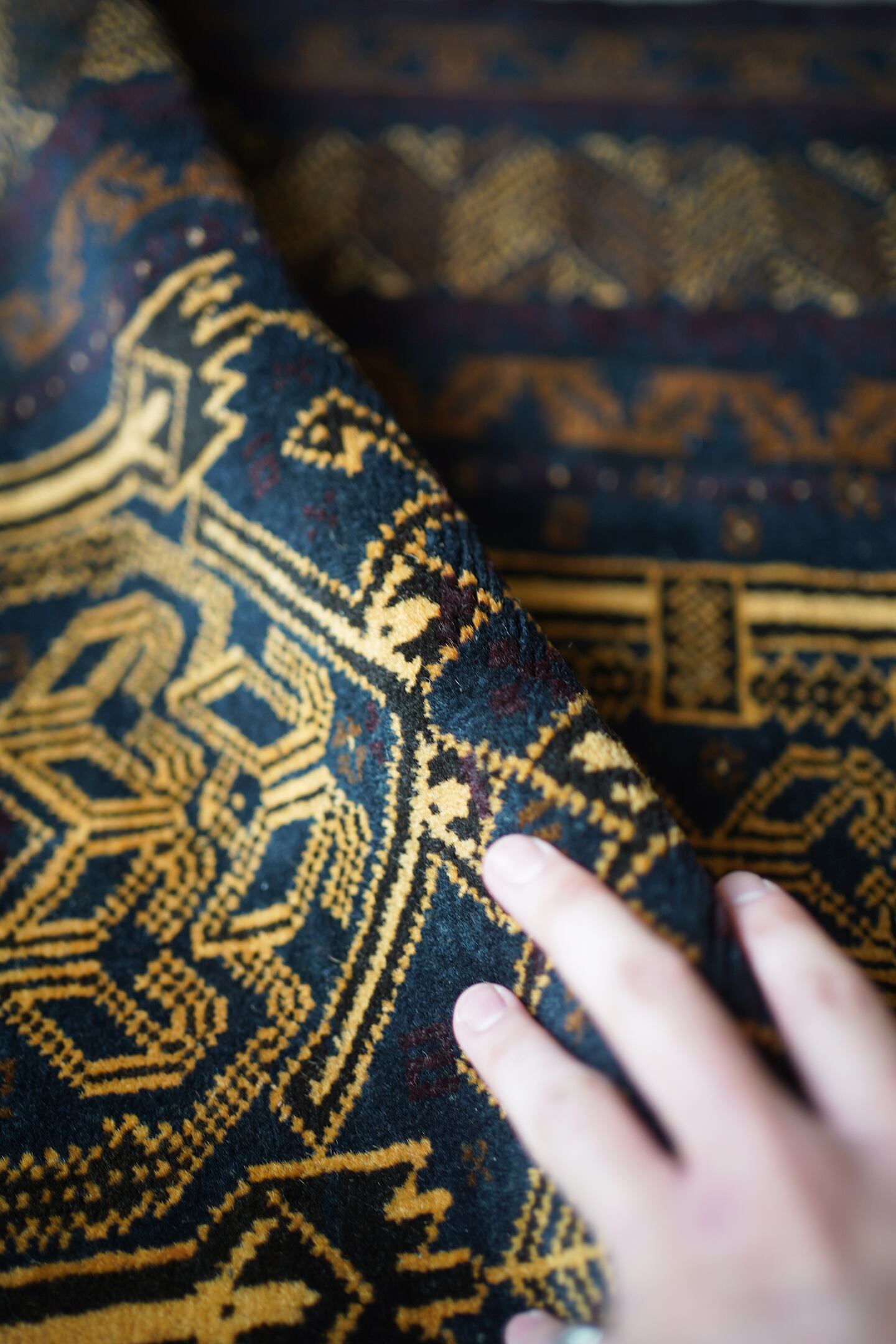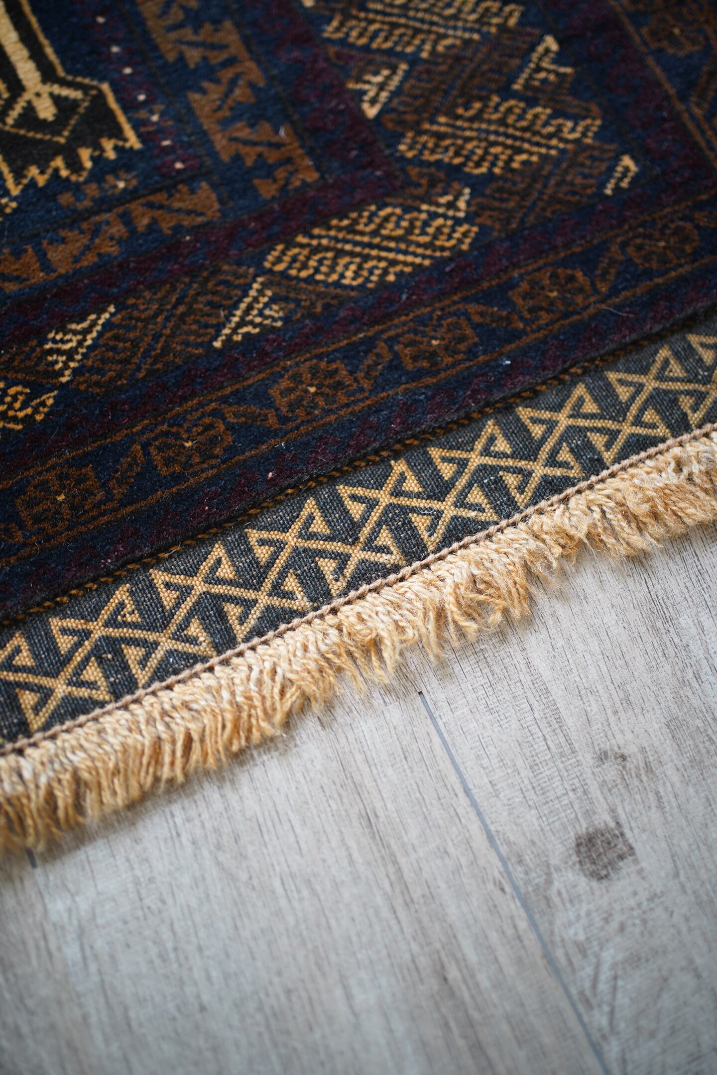 濃紺に浮かび上がる黄金色の紋様が美しい経年40年のバルーチラグ。こちらのラグは時々見かけるデザインですが、同じデザインであれど色味や質感が異なったり、キリムエンドのデザインも違ったりと色んなバリエーションがある印象です。フリンジ部分のキリムエンドは全体のデザインとマッチした統一感のあるデザイン。表面はサラッと滑らかな優しい肌触りで、厚みは6mmほど。目立ったダメージもなく状態良好です。シックで落ち着いた色合いなので、様々なインテリアとも合わせやすいかと思います♫