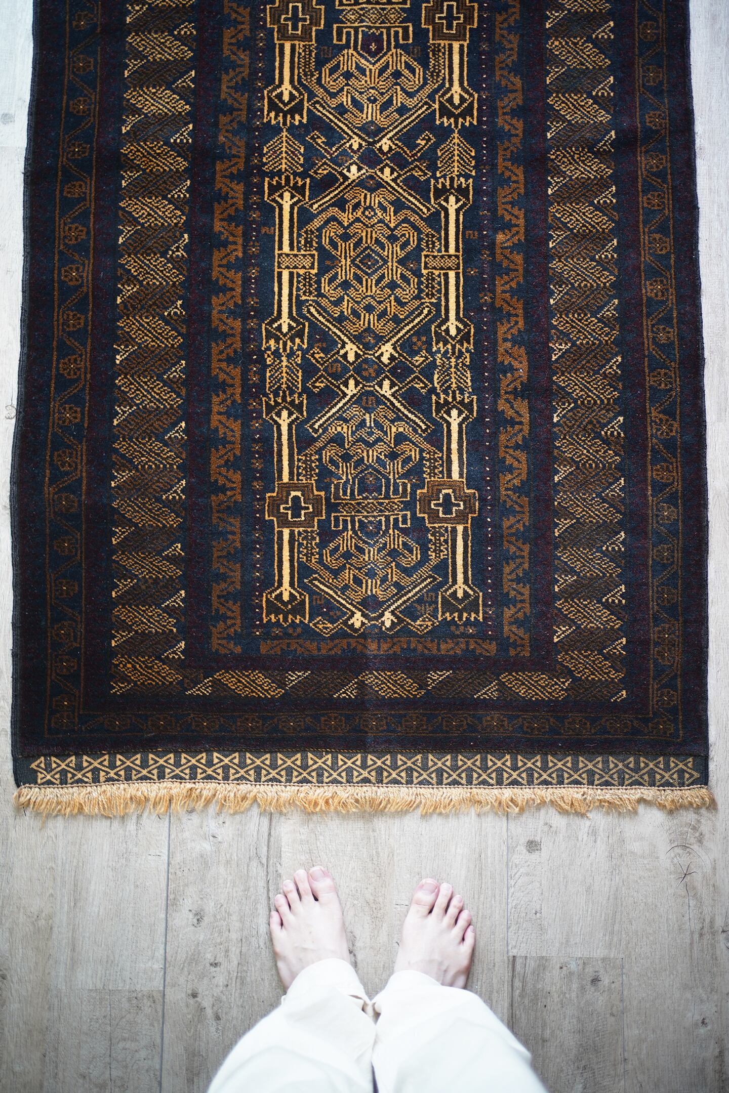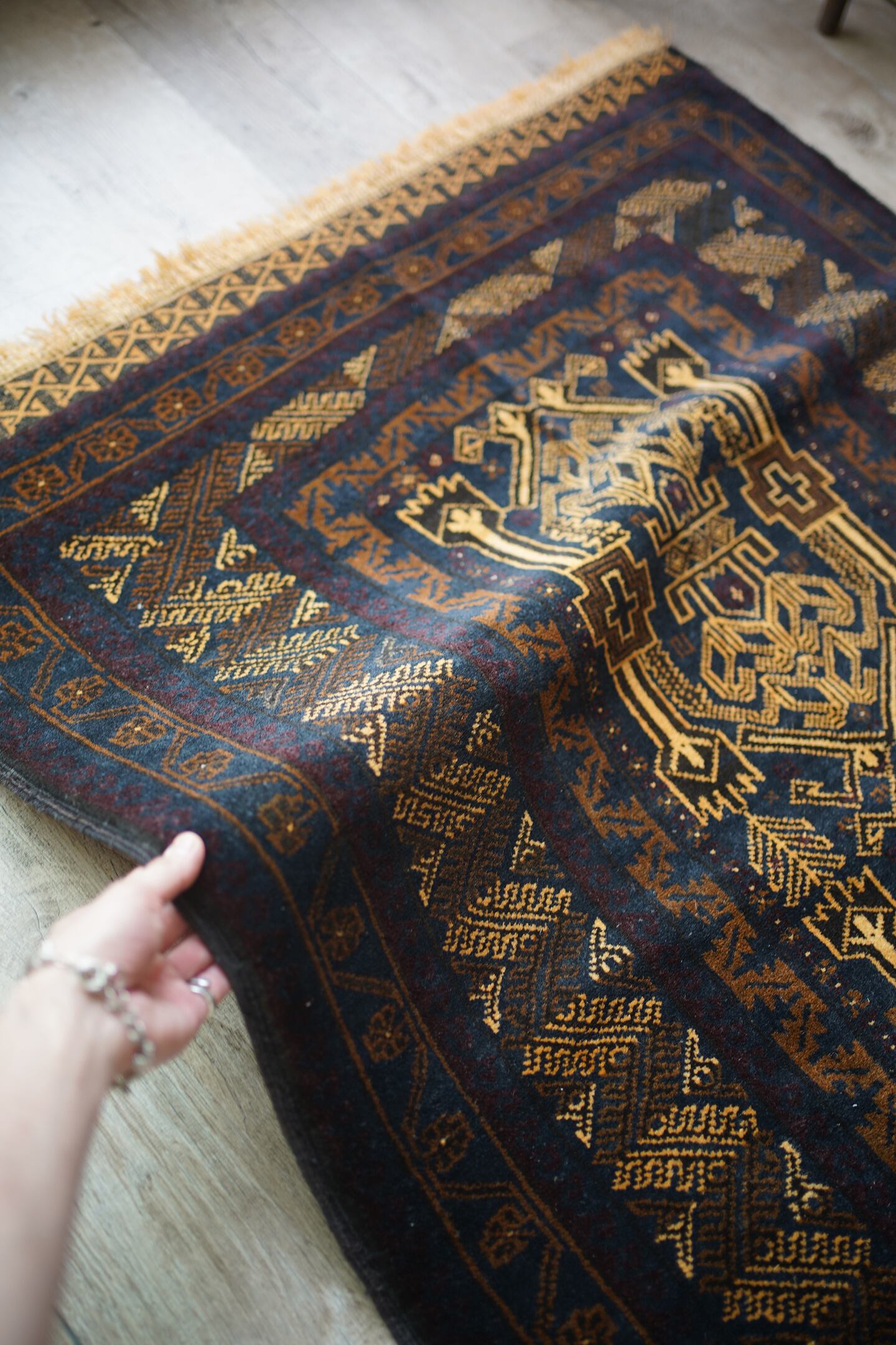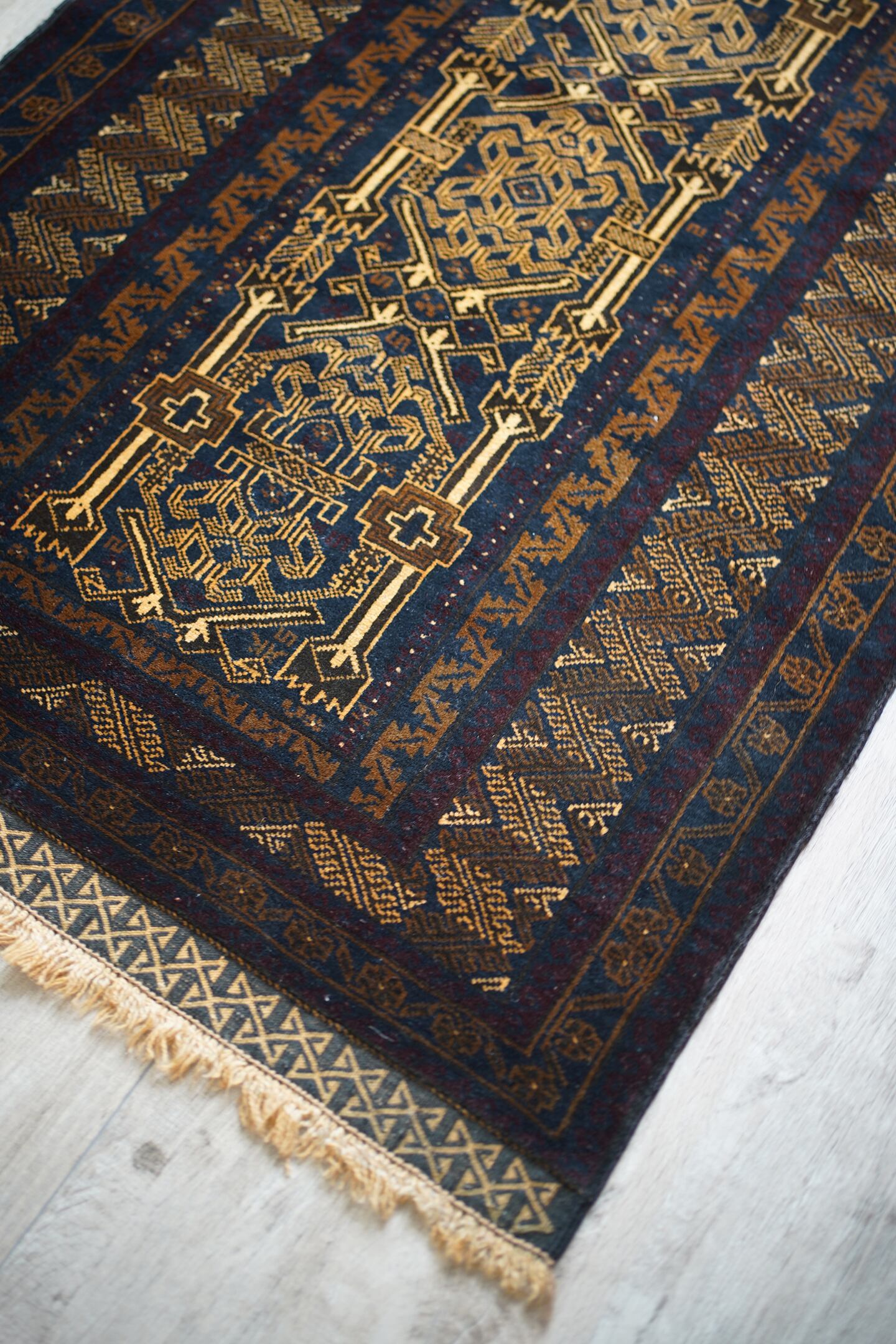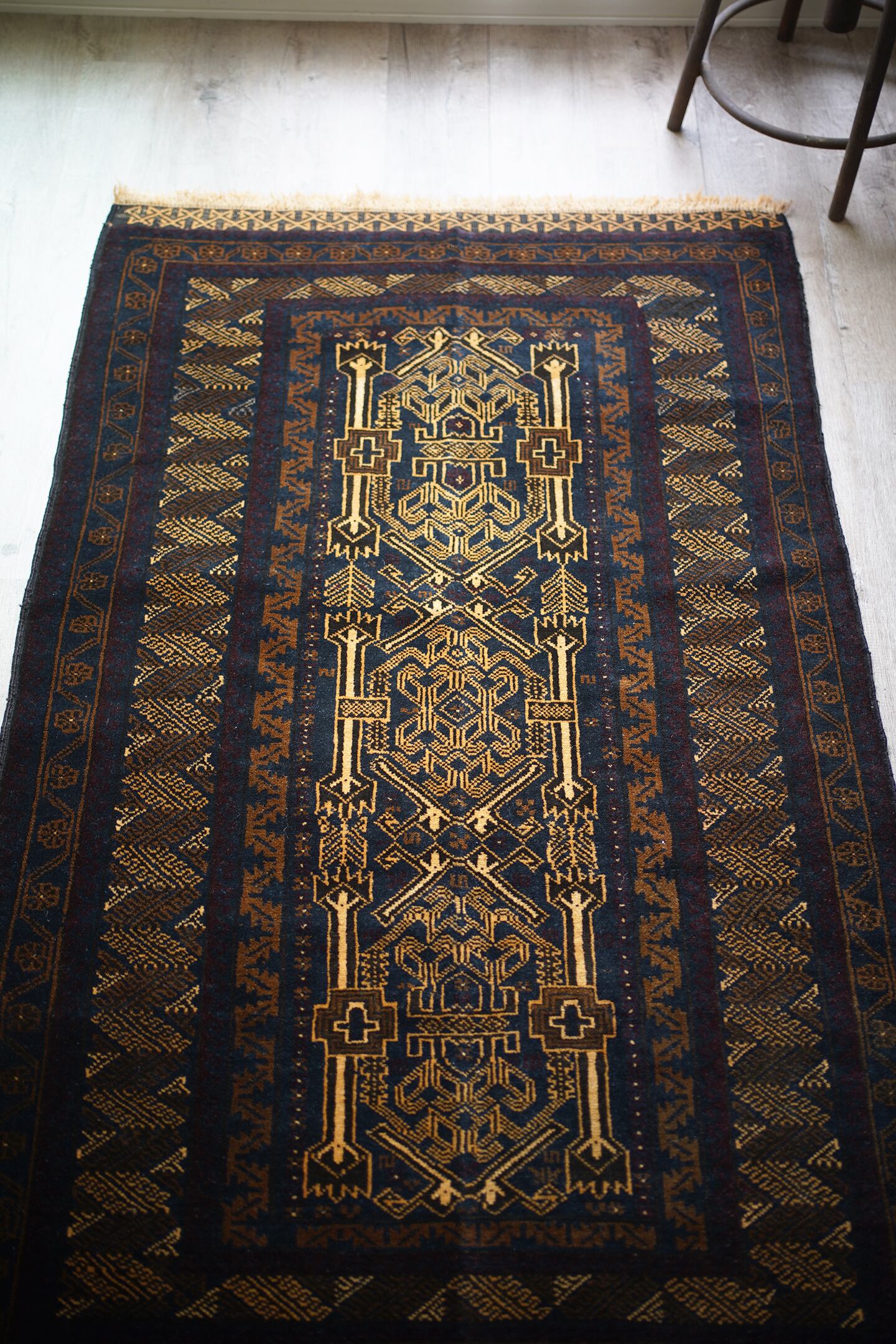 濃紺に浮かび上がる黄金色の紋様が美しい経年40年のバルーチラグ。こちらのラグは時々見かけるデザインですが、同じデザインであれど色味や質感が異なったり、キリムエンドのデザインも違ったりと色んなバリエーションがある印象です。フリンジ部分のキリムエンドは全体のデザインとマッチした統一感のあるデザイン。表面はサラッと滑らかな優しい肌触りで、厚みは6mmほど。目立ったダメージもなく状態良好です。シックで落ち着いた色合いなので、様々なインテリアとも合わせやすいかと思います♫