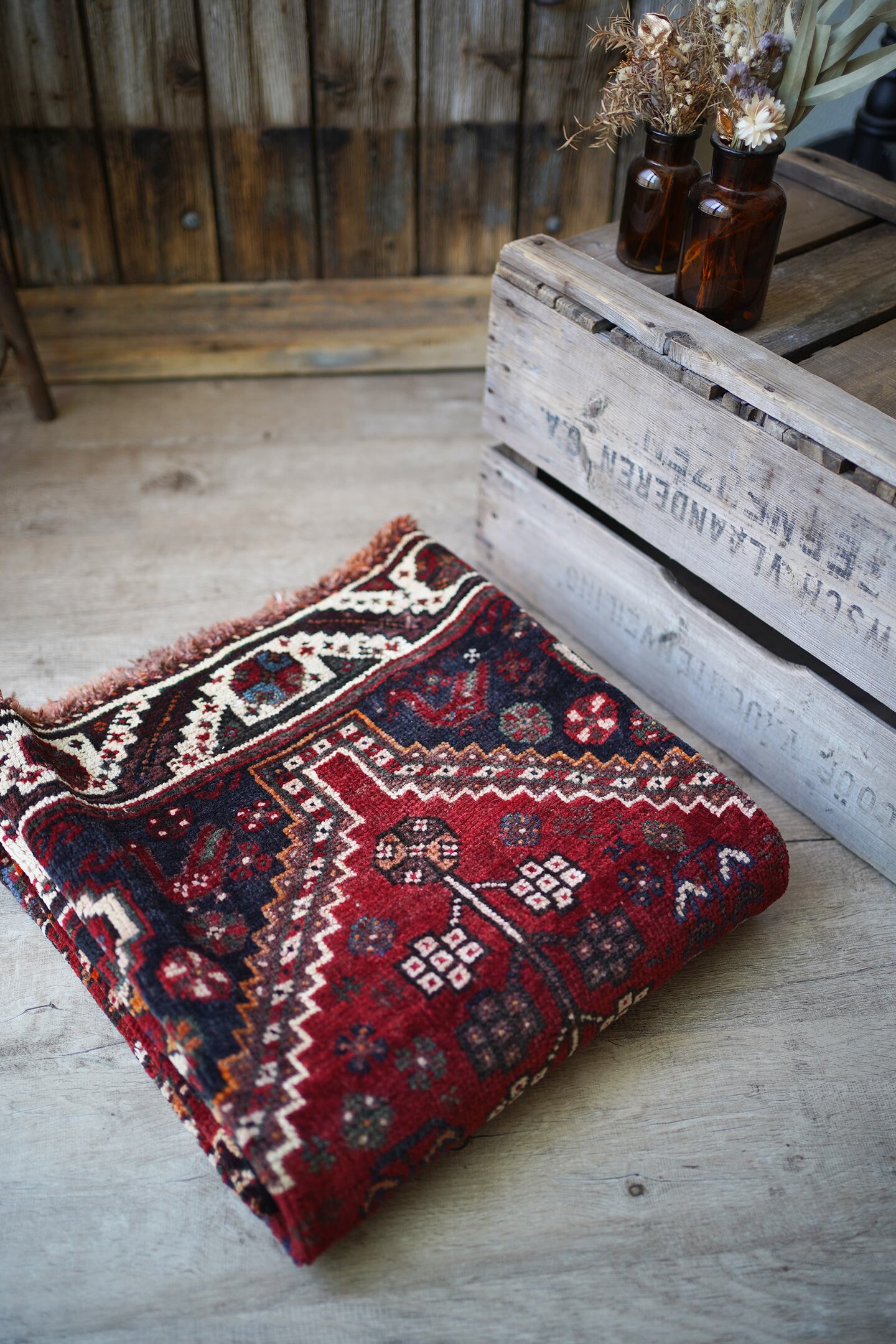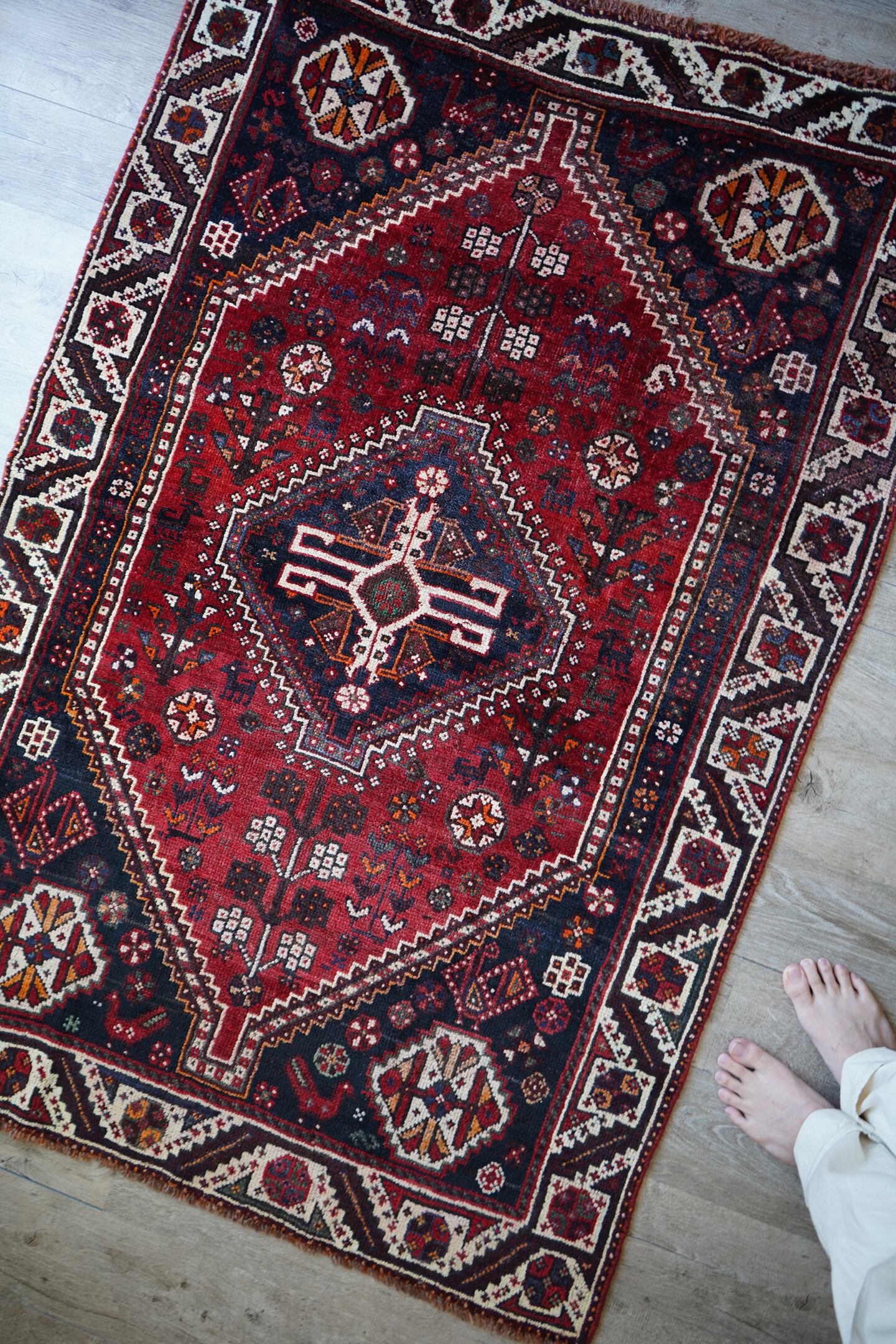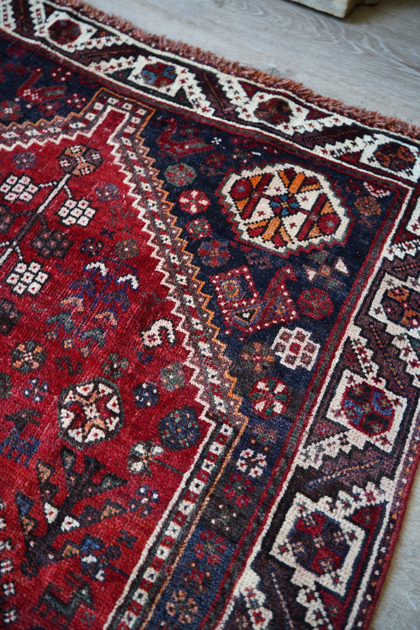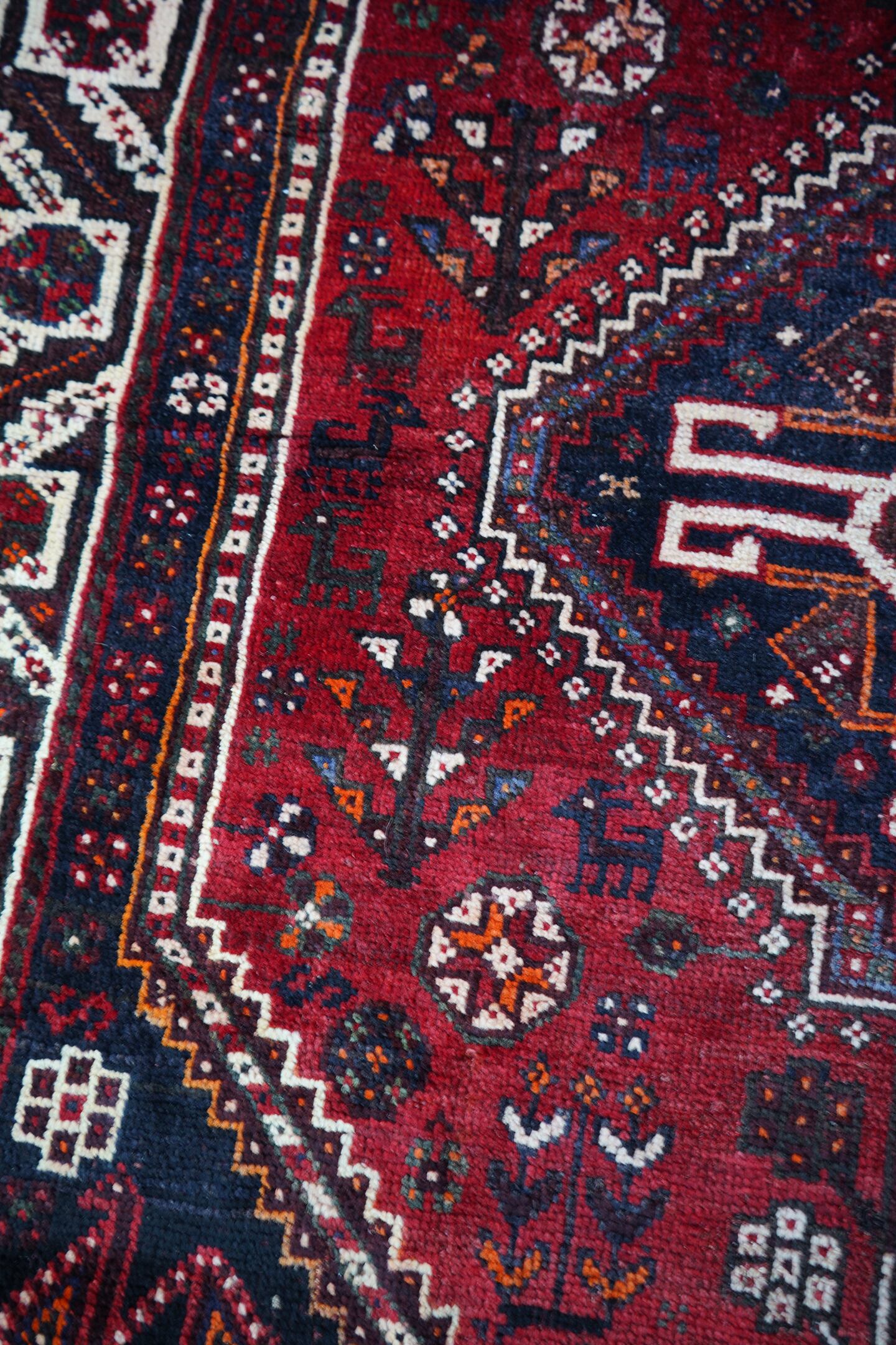 おおよそ60年前に織られたシラーズカシュガイラグです。フィールドは赤、コーナーは濃紺、ボーダーは焦茶にホワイトの配色で、全体的に差し色でオレンジが使われています。花紋様や八角星の他、可愛らしい鹿や鳥などの動物も織り込まれた可愛らしい一枚です。サラふわっとした優しい肌触りで、6mm〜7mmほどの厚みとなります。ダメージもなく、グッドコンディション。リビングをはじめ、お気に入りのスペースにどうぞ♫
