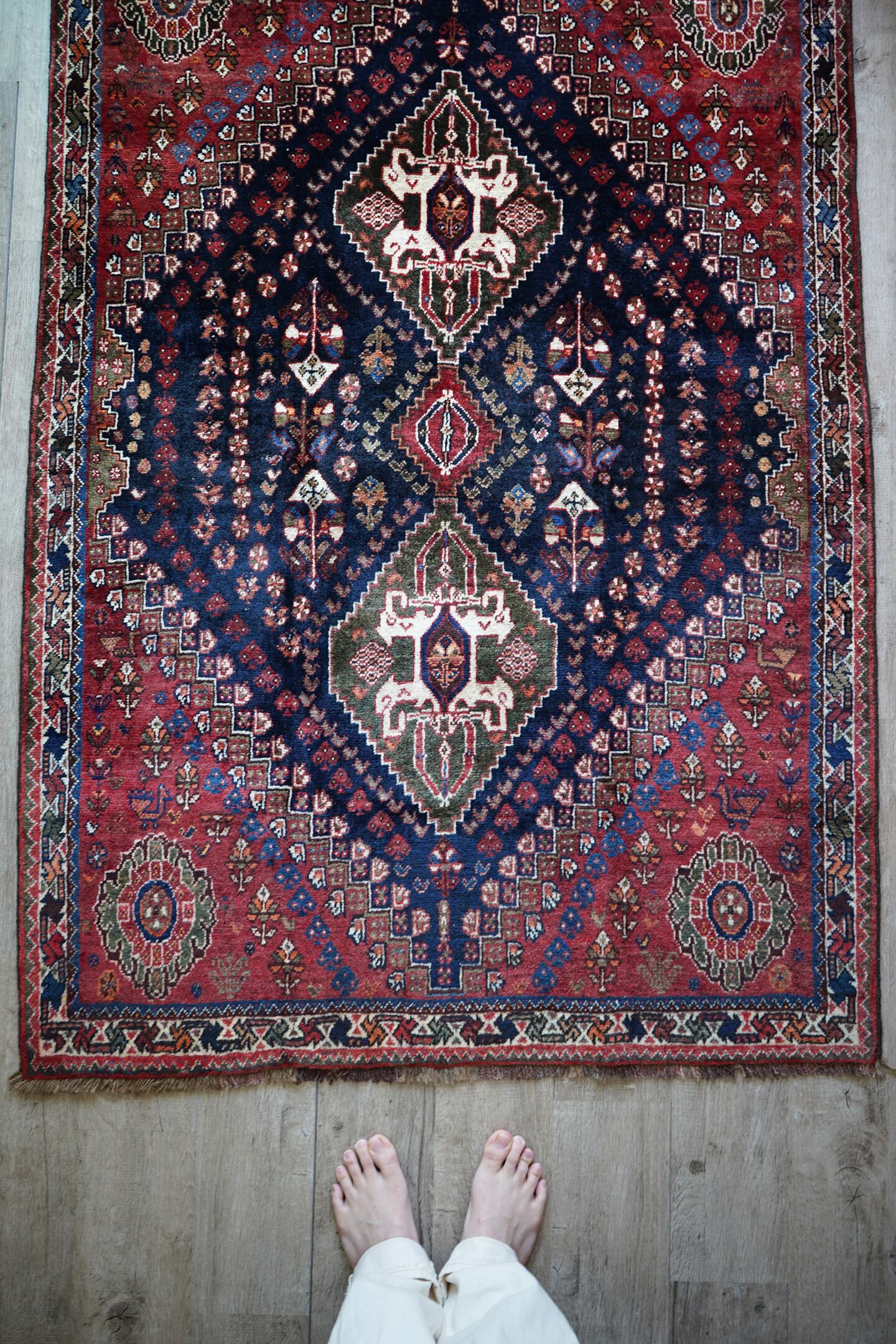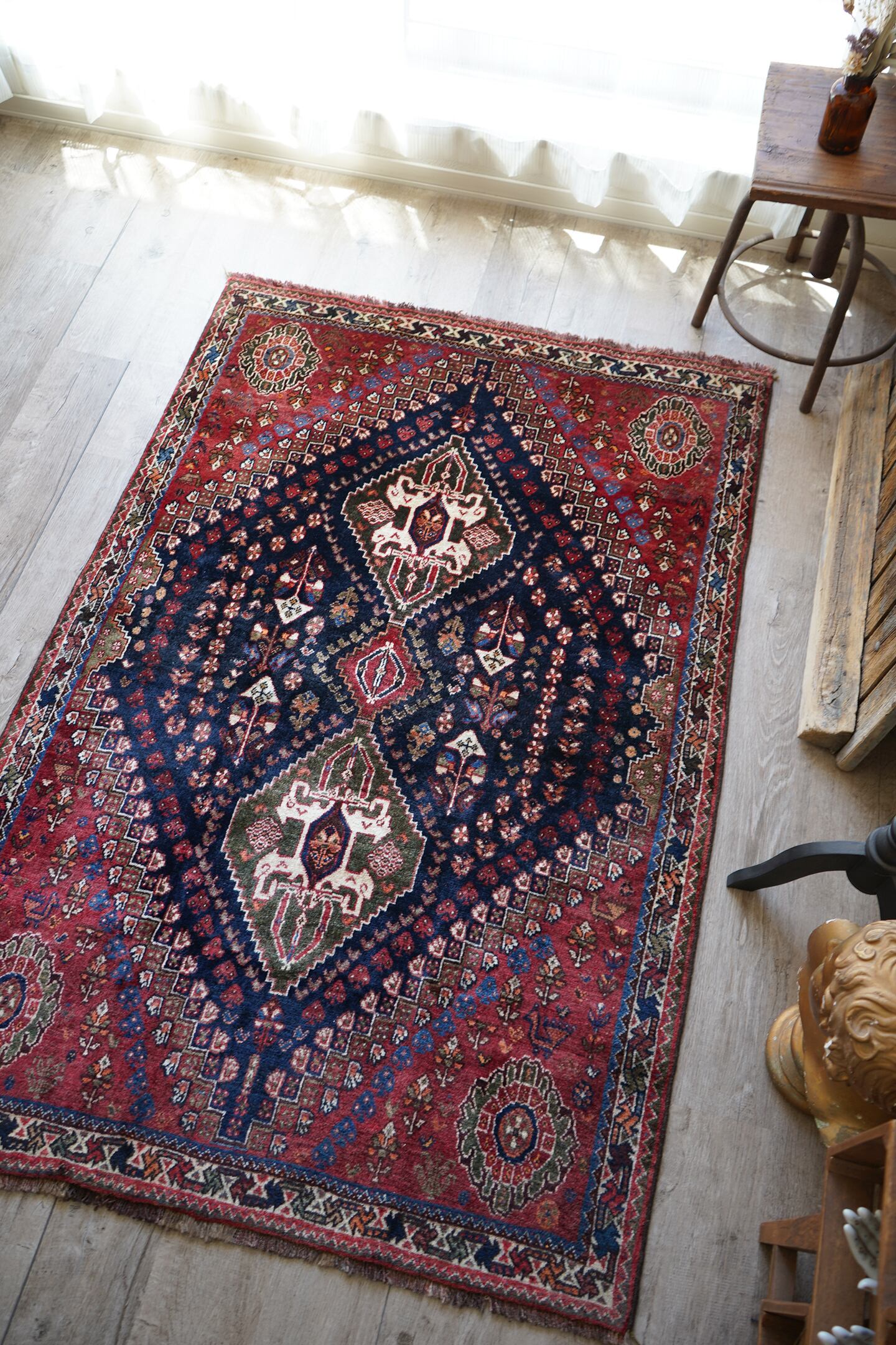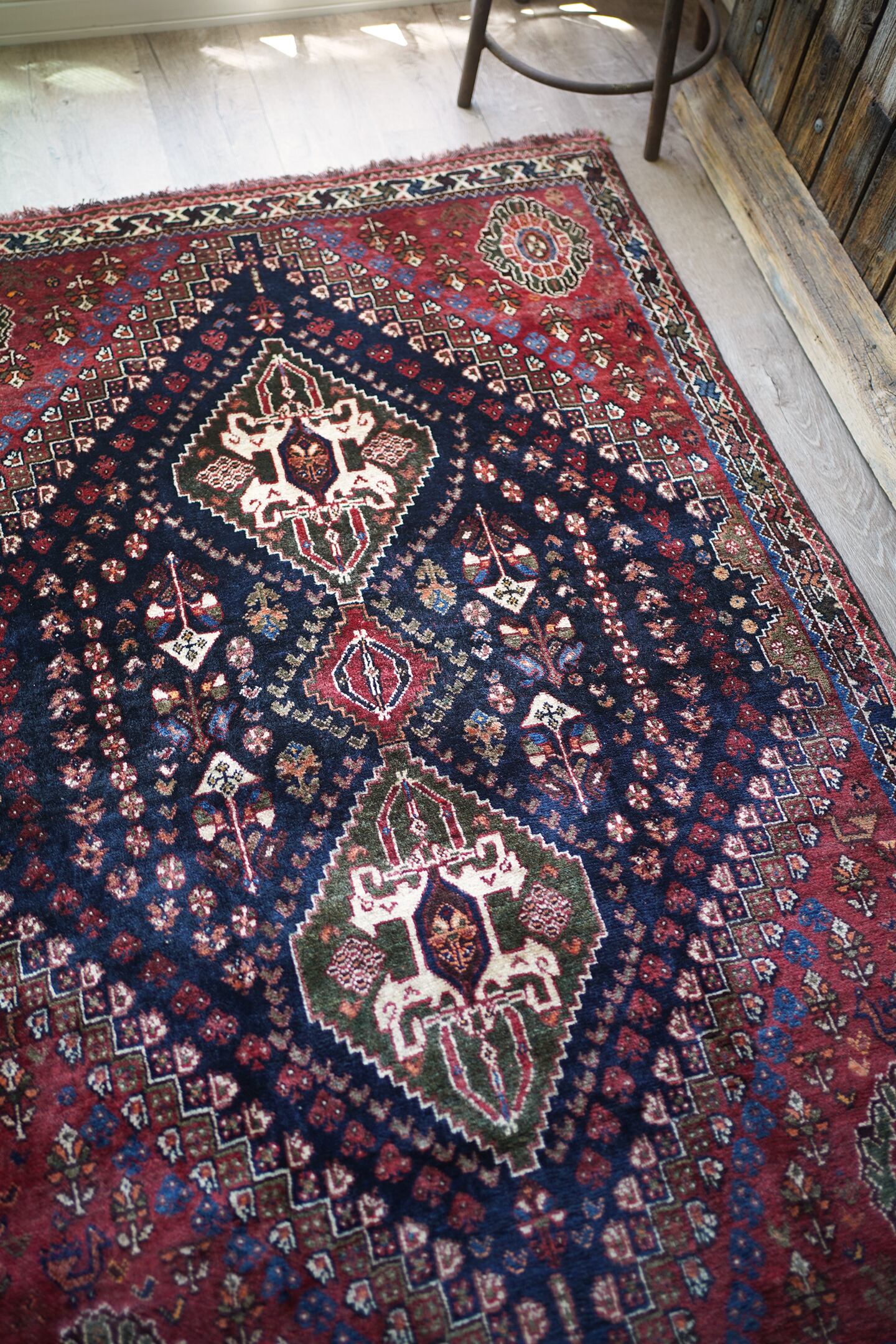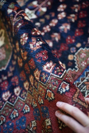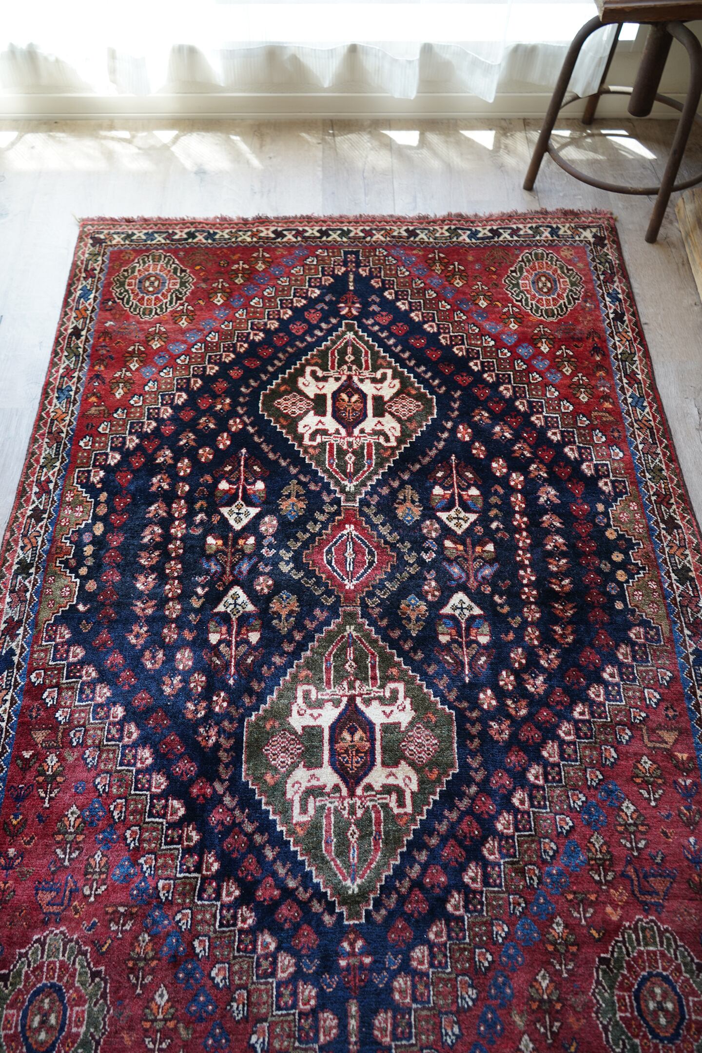 圧倒的なデザイン・質感・艶、三拍子揃った本当の本当の本当に素晴らしいカシュガイラグです。極上のソフトウールで、ふわっともっちり天使のような滑らかな肌触りで、いつまでも絨毯の上にいたくなるそんな感覚になります。フィールドは吸い込まれそうなほど美しい艶のある深海色のネイビー、メダリオンはモスグリーン、コーナーは落ち着いた赤の配色です。スペードのような紋様をはじめ、八角星や花紋様が美しい配列で織り込まれています。よく見ると可愛い鳥もいるので、ぜひ探してみてください。状態も言うことなしのパーフェクトコンディション。厚みは7mm程度となります。なかなか巡り会えない素晴らしい質感と状態のラグ、絶対に見逃して欲しくない一枚です。