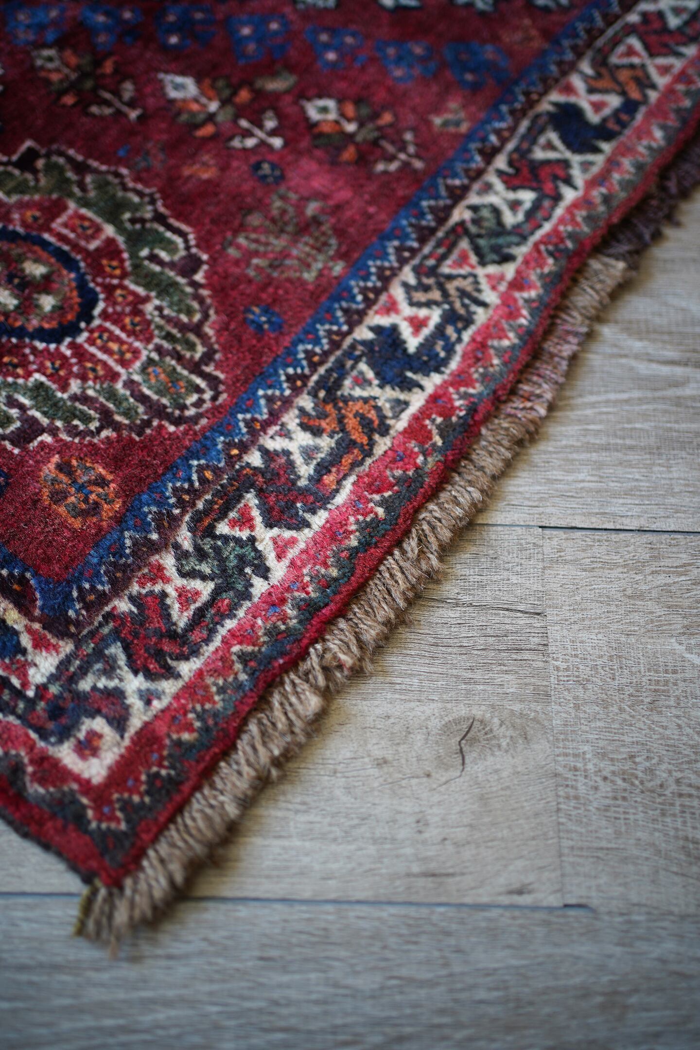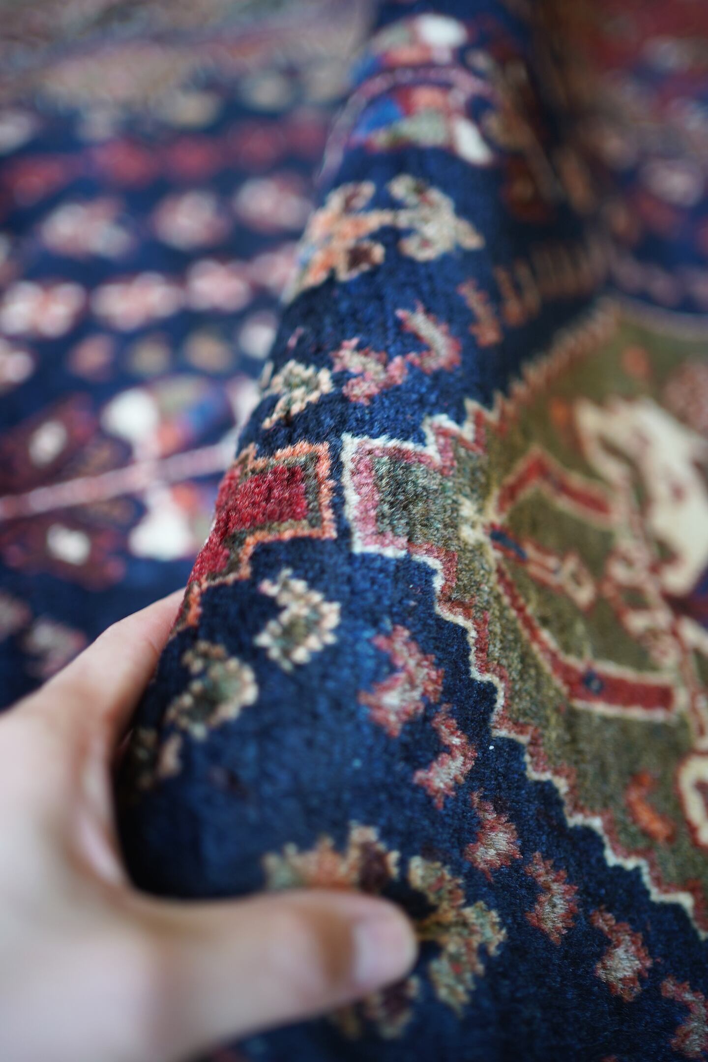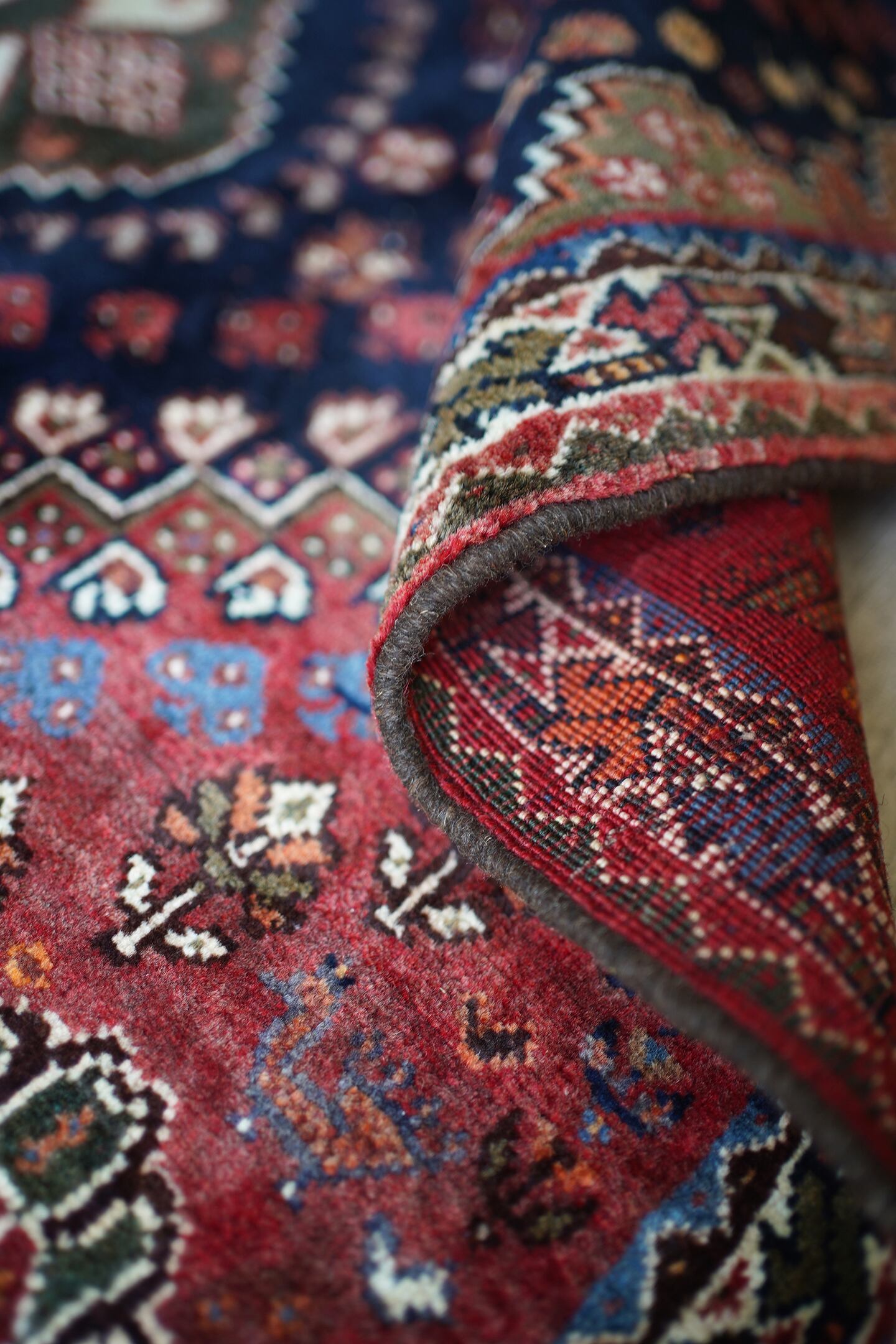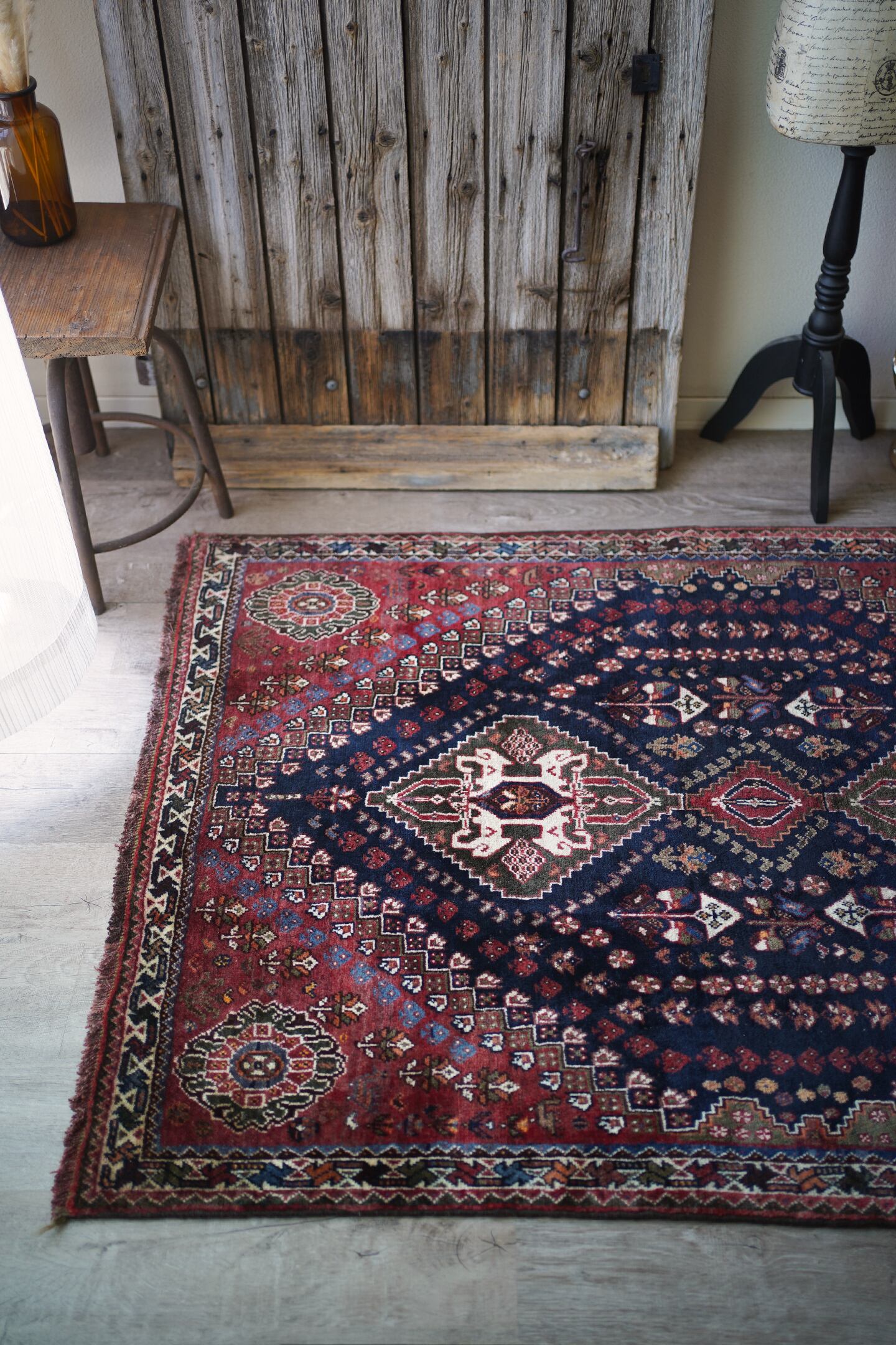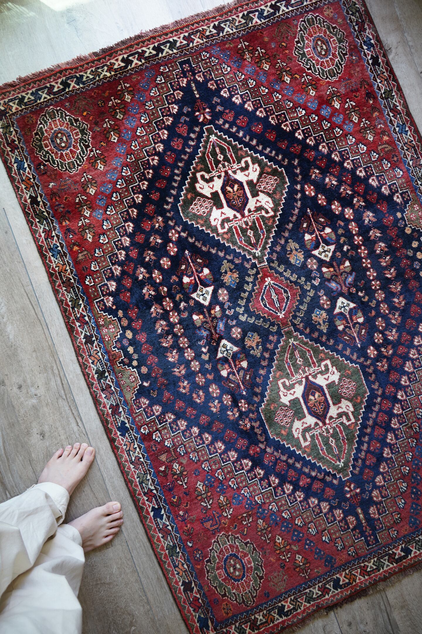 圧倒的なデザイン・質感・艶、三拍子揃った本当の本当の本当に素晴らしいカシュガイラグです。極上のソフトウールで、ふわっともっちり天使のような滑らかな肌触りで、いつまでも絨毯の上にいたくなるそんな感覚になります。フィールドは吸い込まれそうなほど美しい艶のある深海色のネイビー、メダリオンはモスグリーン、コーナーは落ち着いた赤の配色です。スペードのような紋様をはじめ、八角星や花紋様が美しい配列で織り込まれています。よく見ると可愛い鳥もいるので、ぜひ探してみてください。状態も言うことなしのパーフェクトコンディション。厚みは7mm程度となります。なかなか巡り会えない素晴らしい質感と状態のラグ、絶対に見逃して欲しくない一枚です。