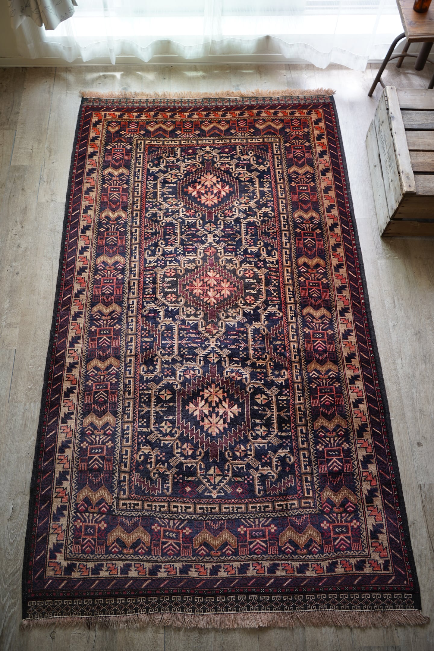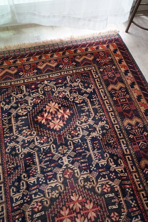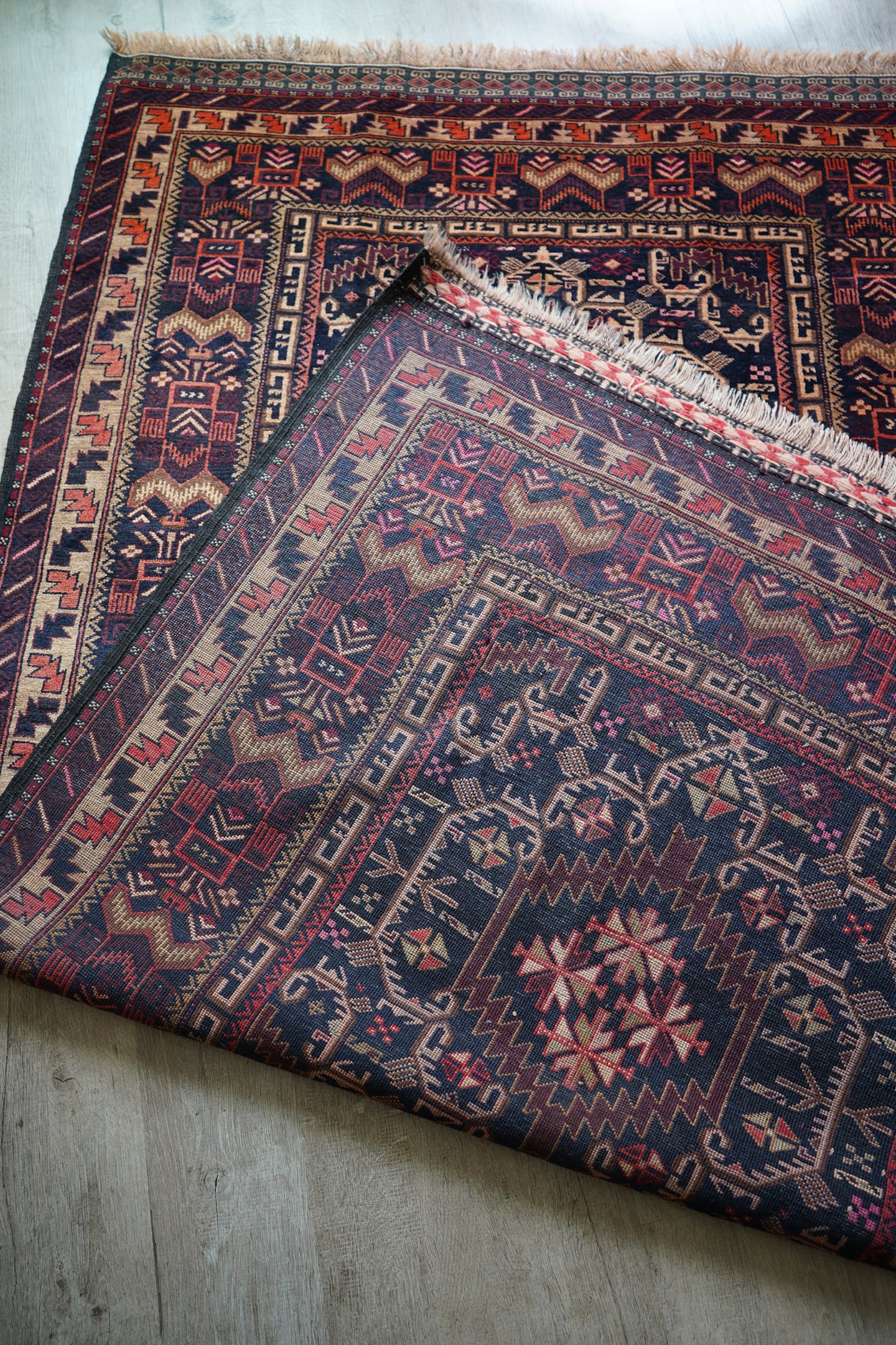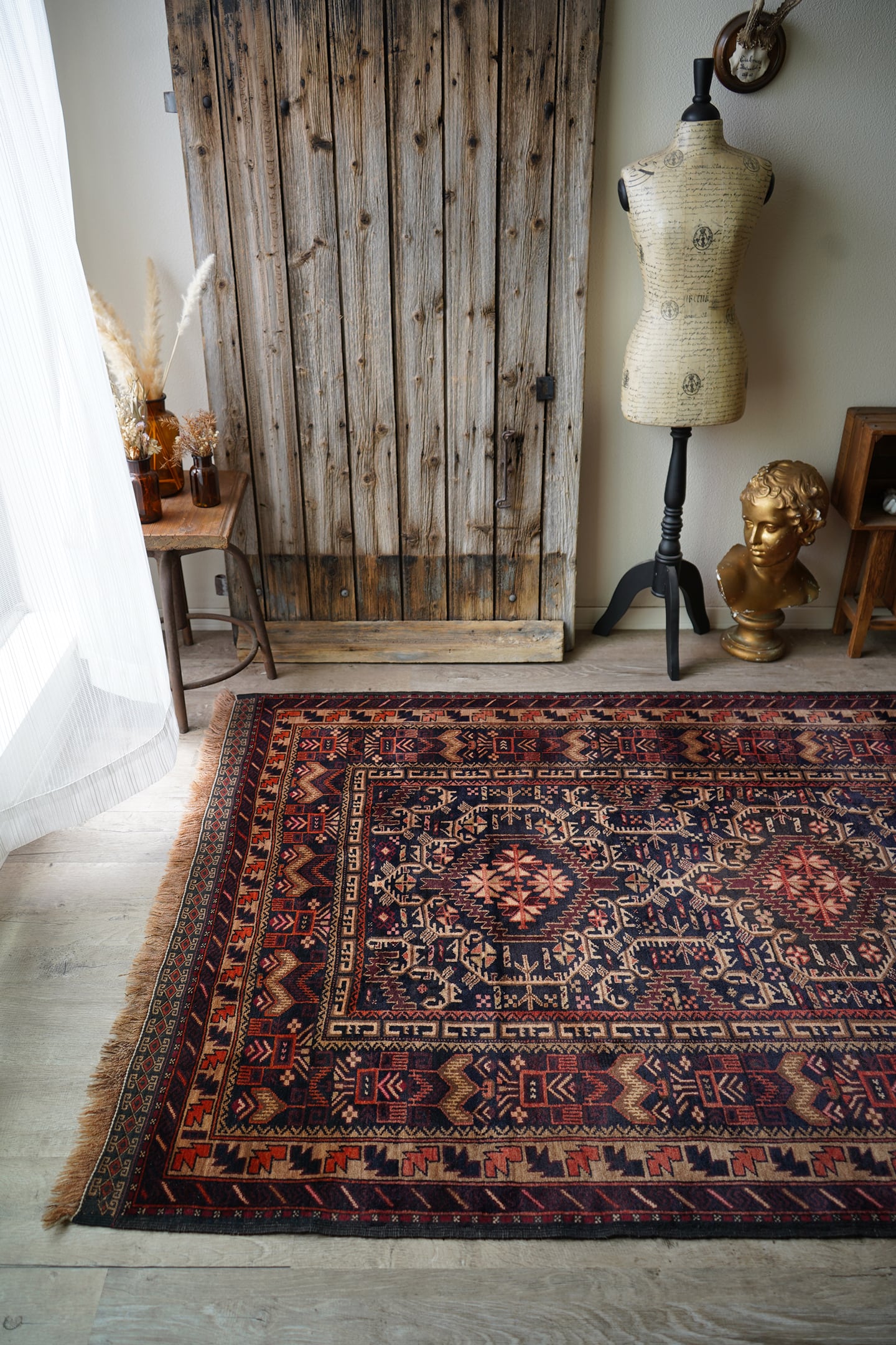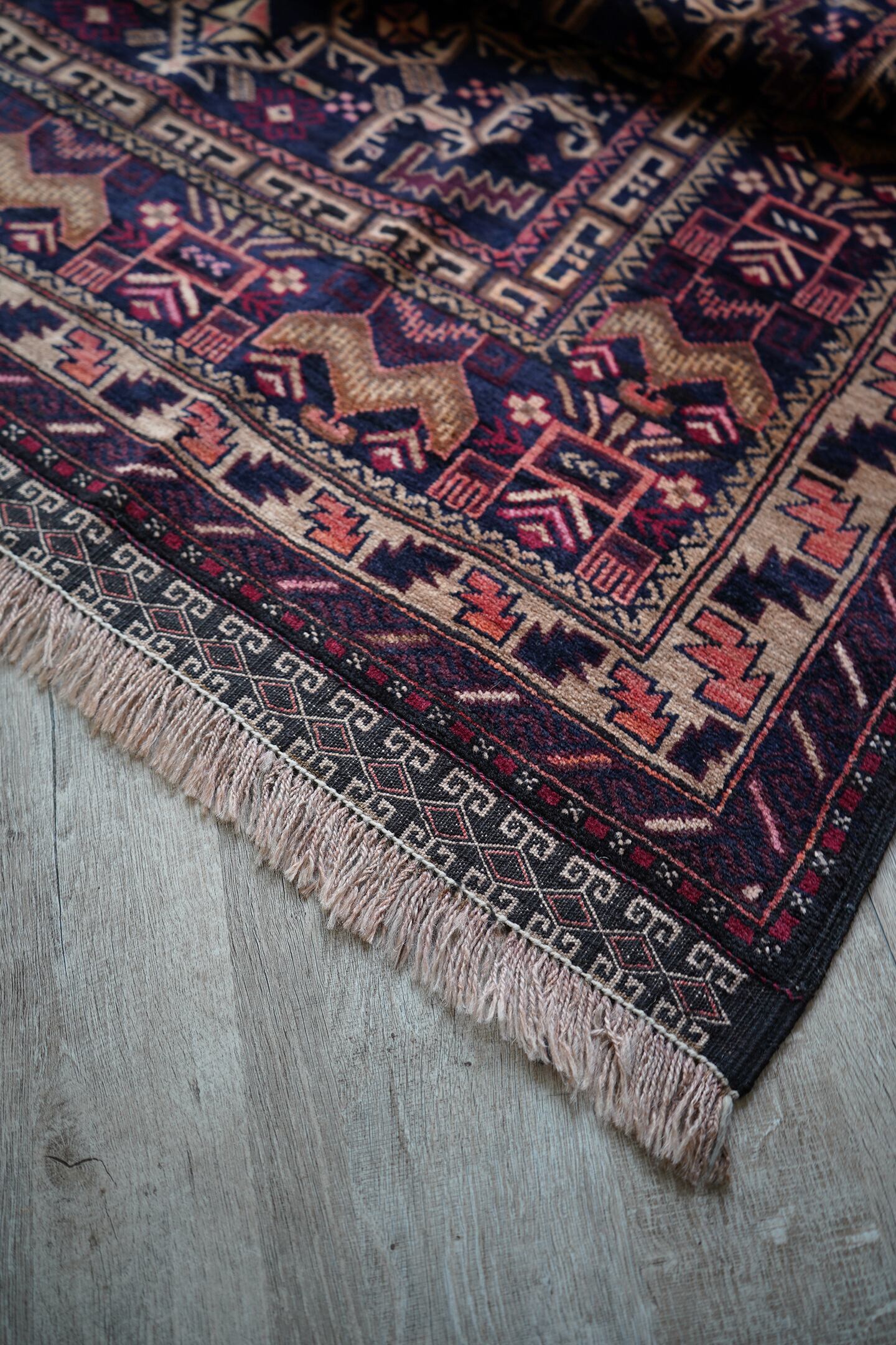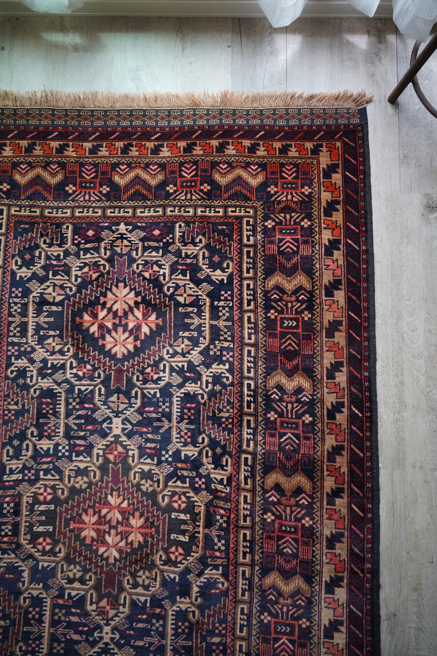 ふわっと柔らかく滑らかで優しい肌触りのアフガンバルーチラグ。濃紺、コーラルピンク、ベージュ、ブラウンのお色味で葉っぱの形をしたチナール紋様が素敵な一枚です。またフリンジ部分はキリムエンドになっています。ダメージや補修跡もなく、パーフェクトなコンディション。厚みは7mm程度。リビングのソファ前やベッドサイドなどにどうぞ。