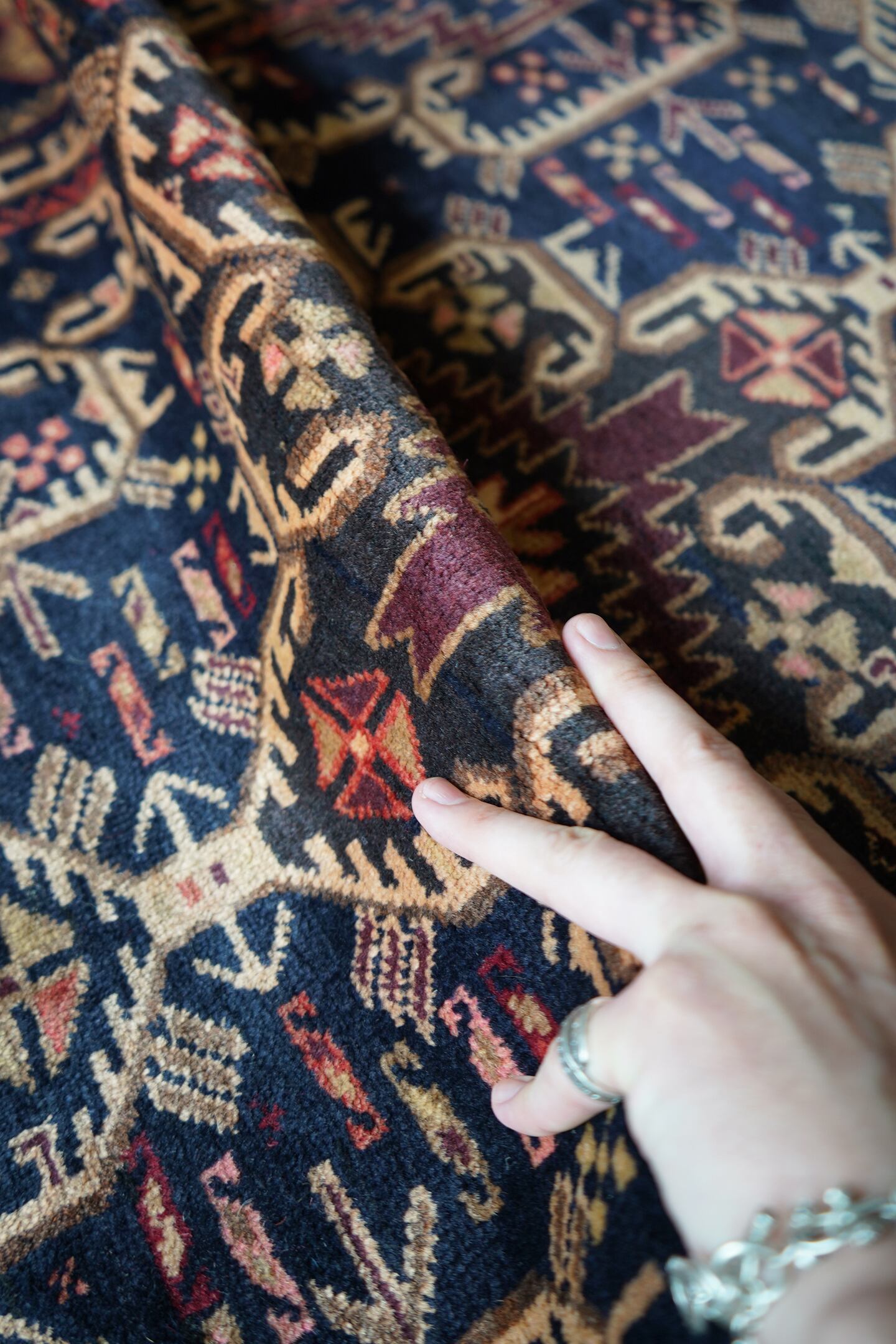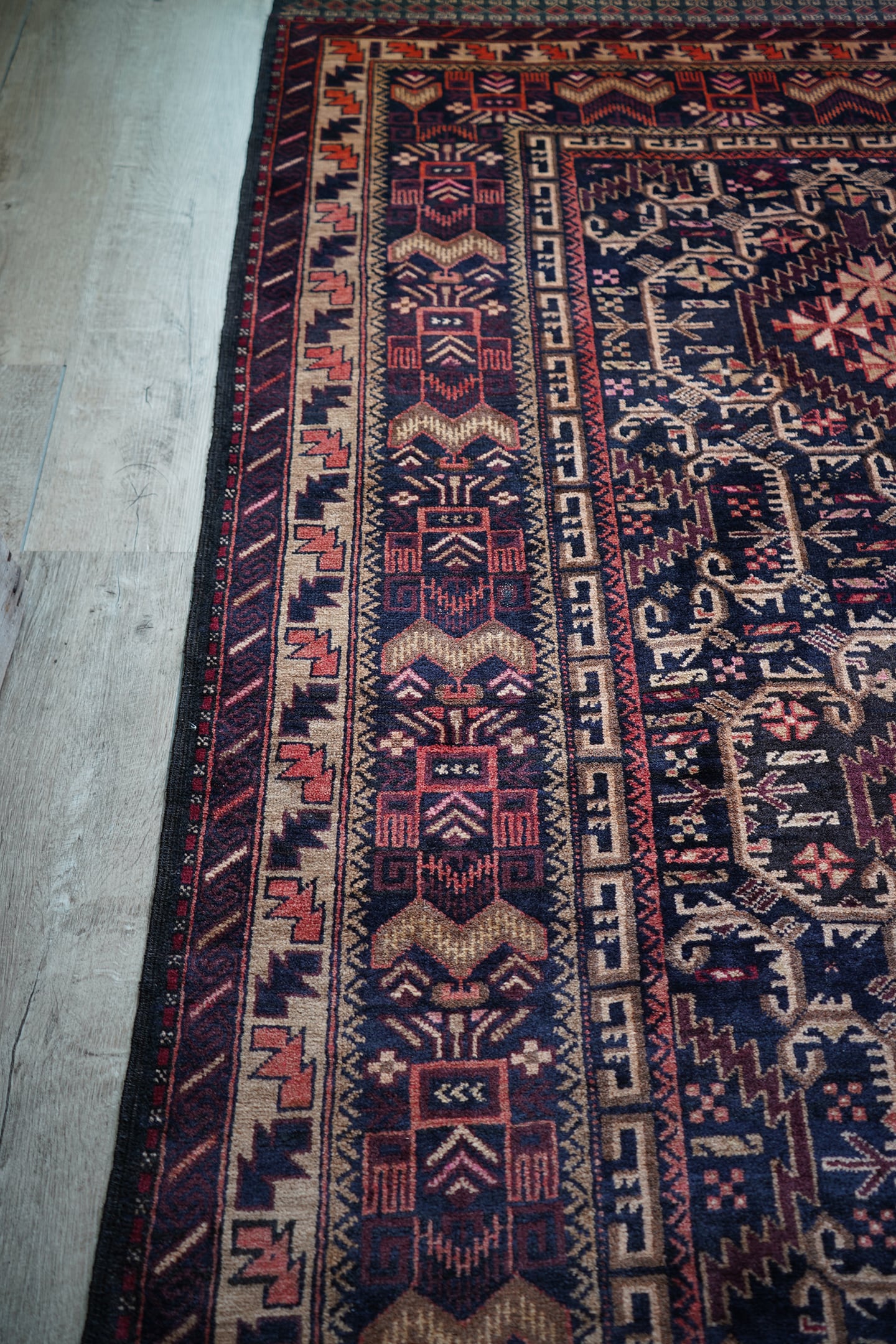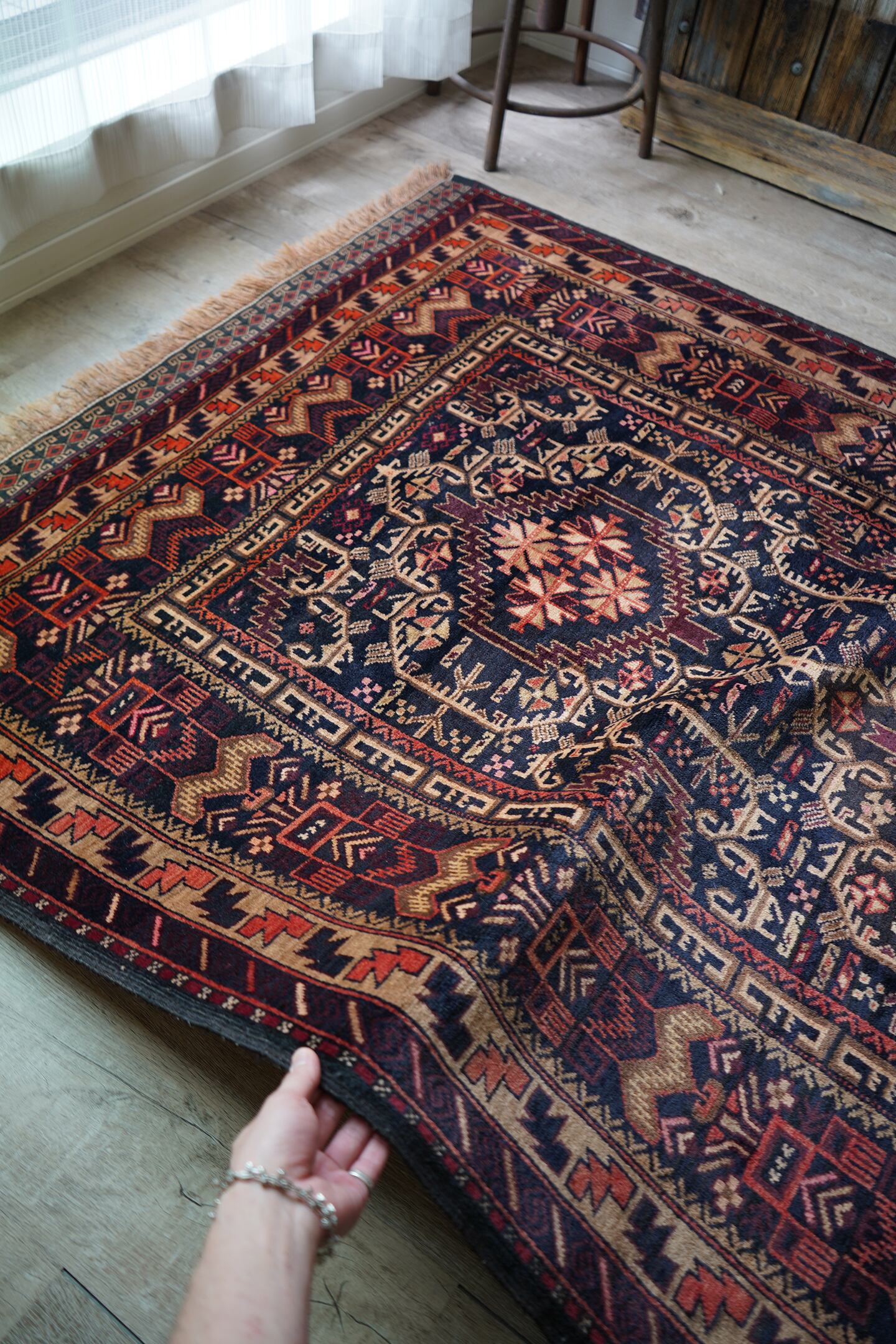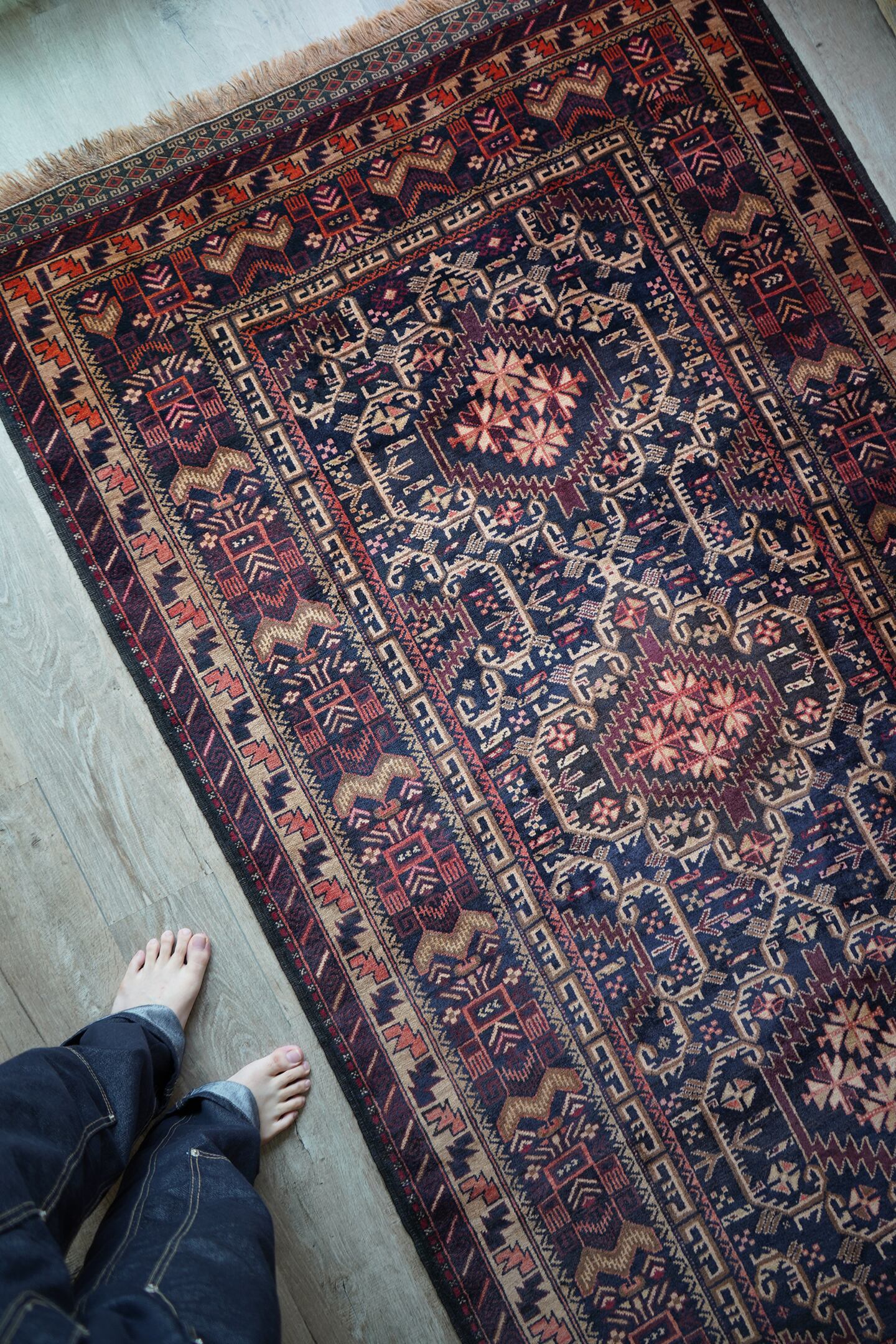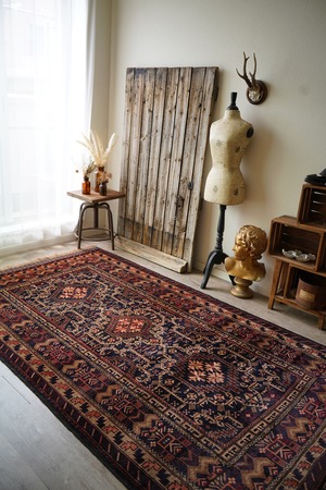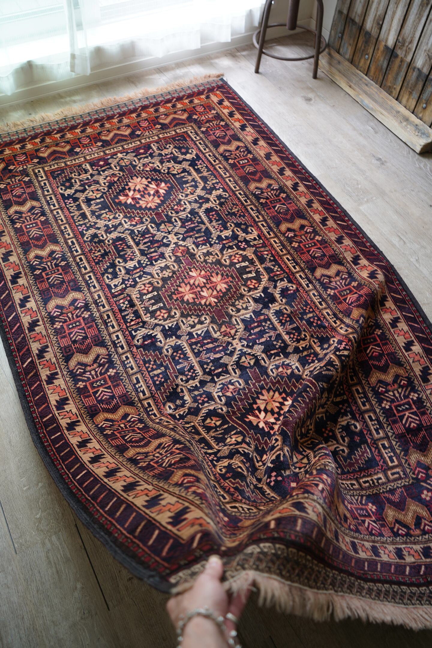 ふわっと柔らかく滑らかで優しい肌触りのアフガンバルーチラグ。濃紺、コーラルピンク、ベージュ、ブラウンのお色味で葉っぱの形をしたチナール紋様が素敵な一枚です。またフリンジ部分はキリムエンドになっています。ダメージや補修跡もなく、パーフェクトなコンディション。厚みは7mm程度。リビングのソファ前やベッドサイドなどにどうぞ。
