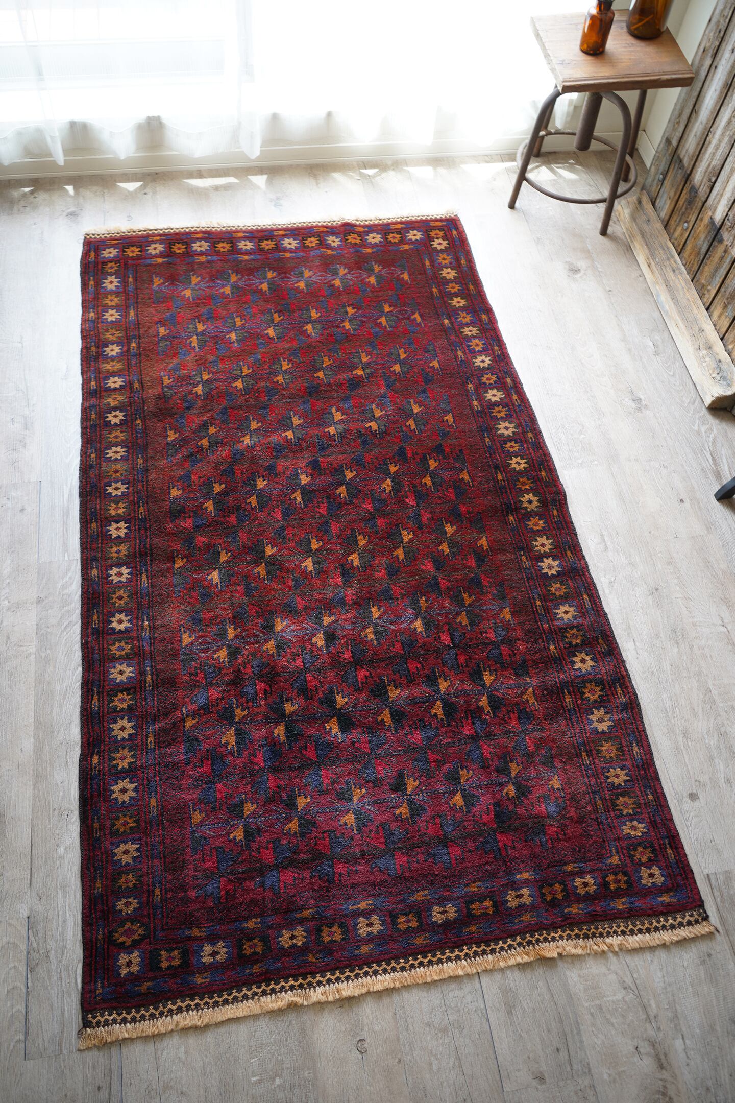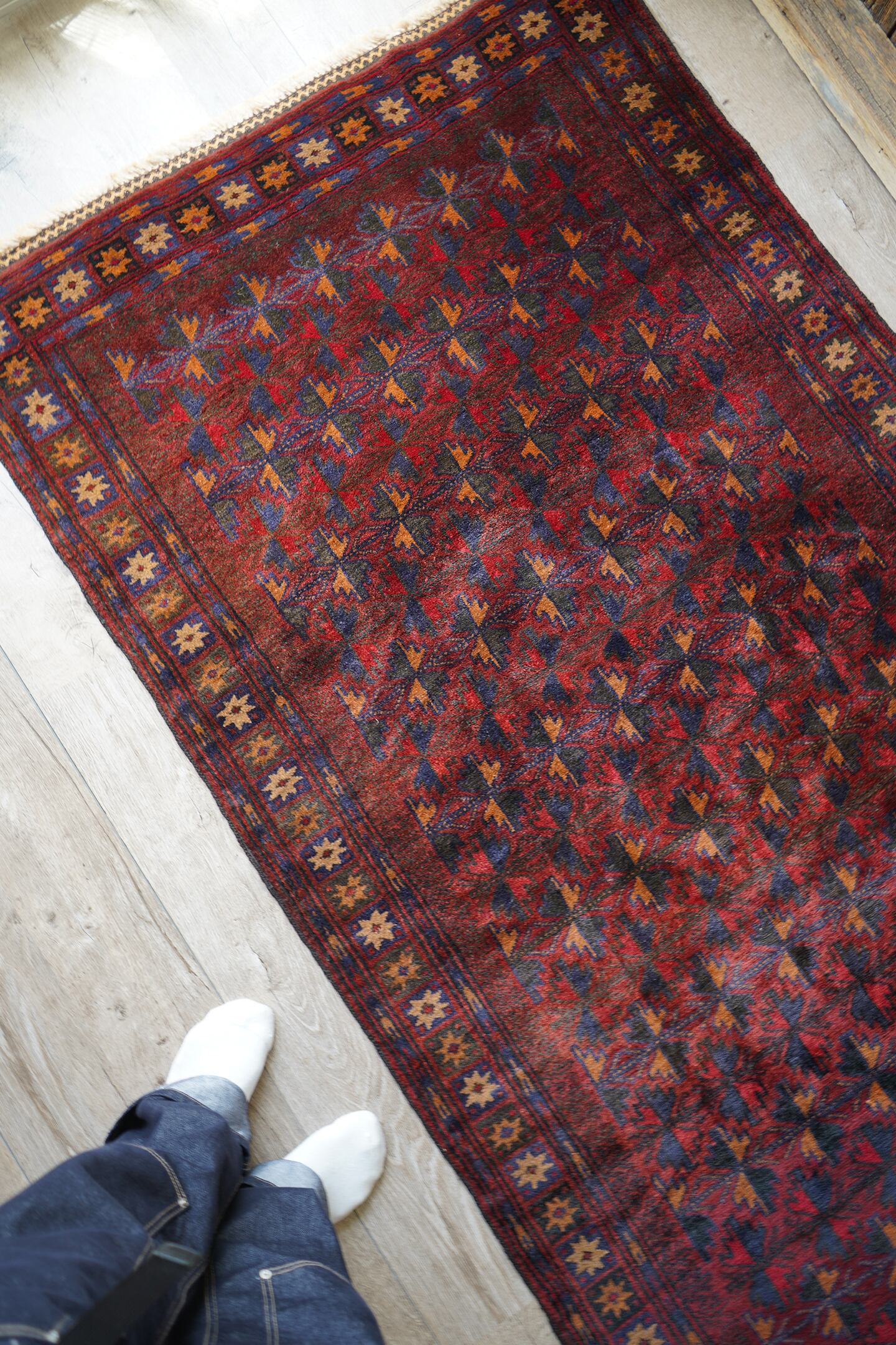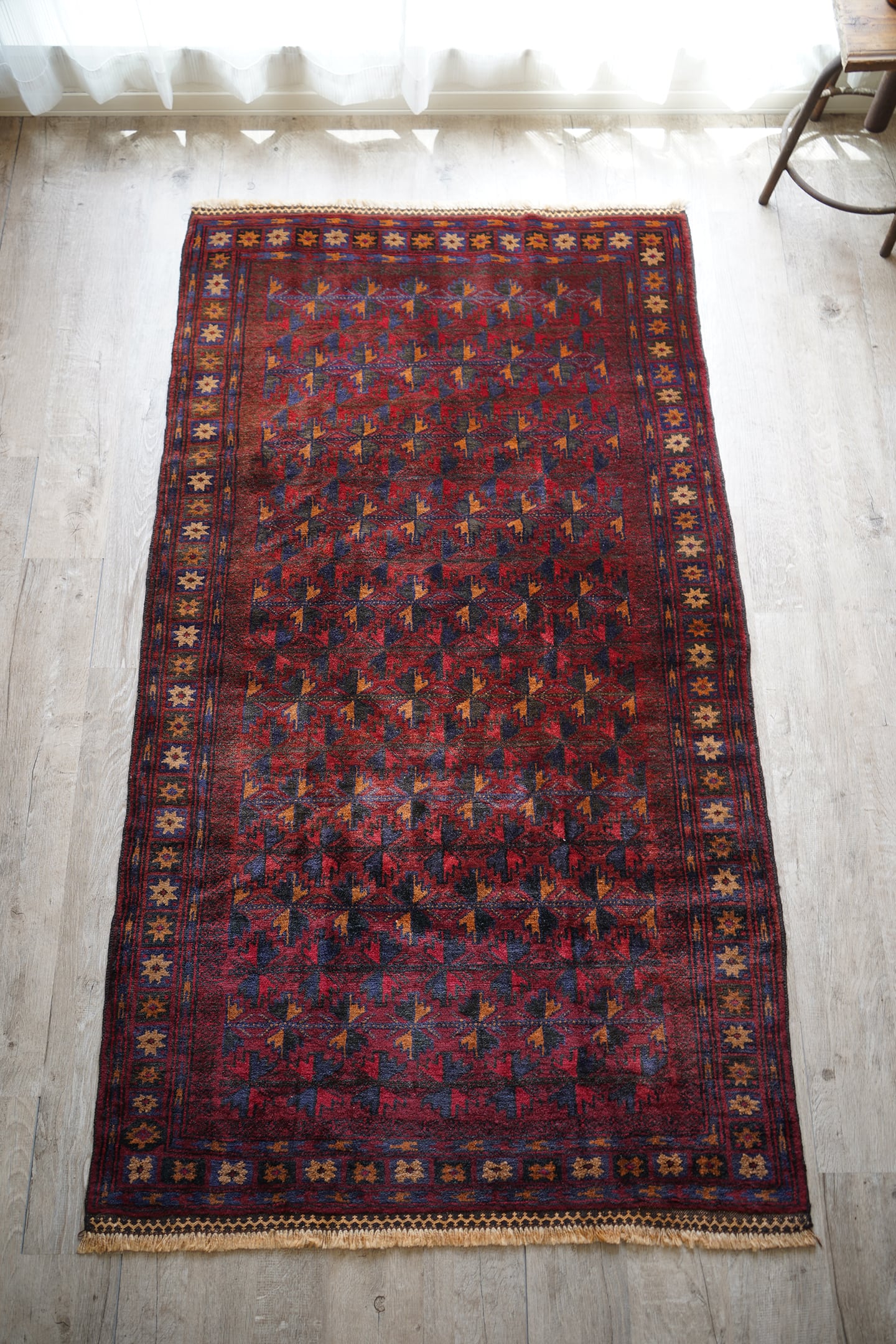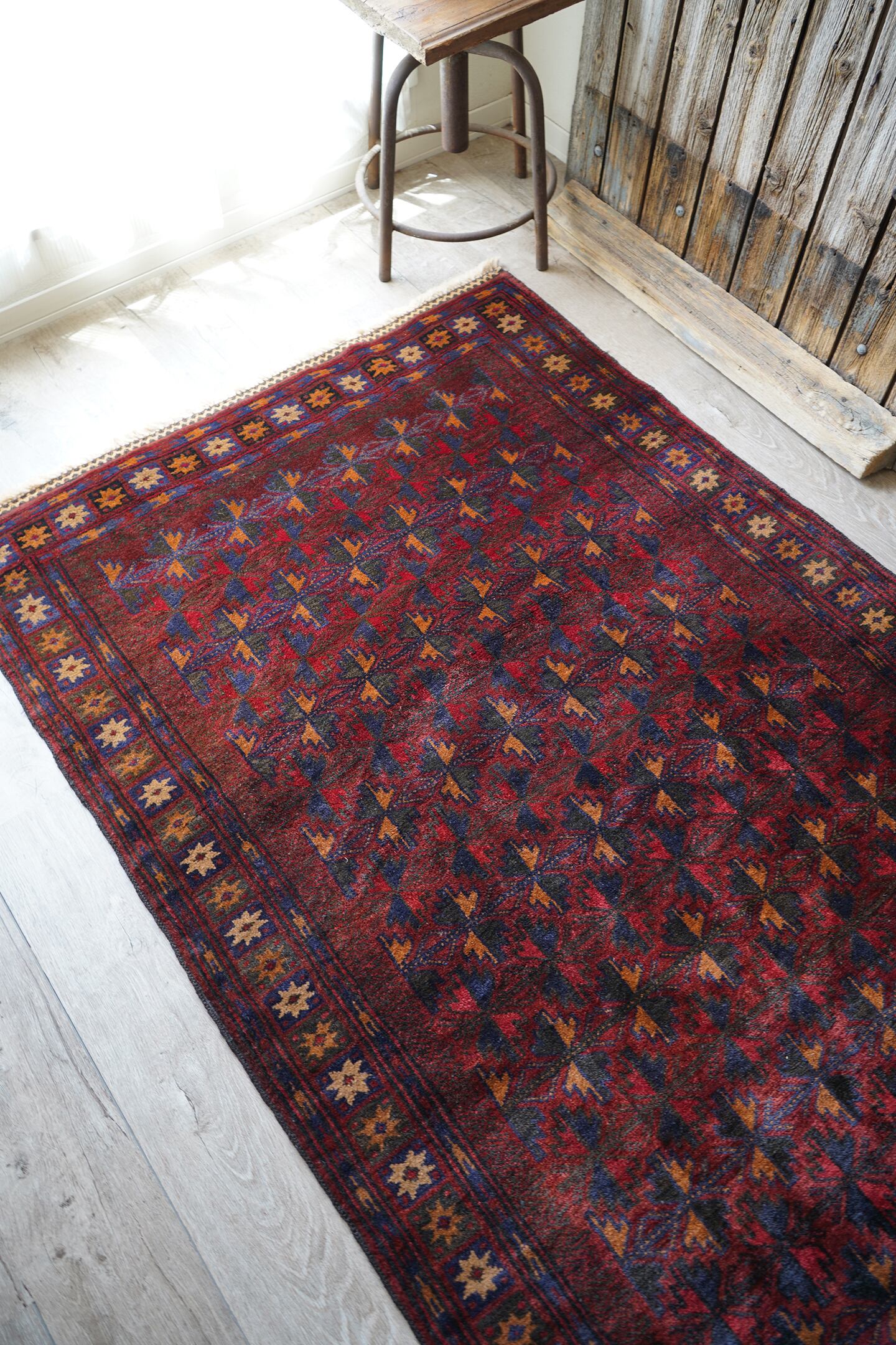 ソフトウールで、ふわっふわの柔らかくて気持ちの良い肌触りがたまらないバルーチラグ。ずっとラグの上に乗っていたくなるような優しい質感が素晴らしい一枚です。深く暗めのシックな赤色をベースにフィールドには2種のチナール紋様(ブラウン&ネイビー、赤&濃紺)、ボーダーには八角星が織り込まれています。またフリンジ部分は素敵なキリムエンドとなっています。パイルに光が差し込むと艶も見受けられ大変美しいです。ダメージもなく、パーフェクトなコンディション。厚みは9mm程度です。是非気持ちの良いソフトウールを体感してみてください。