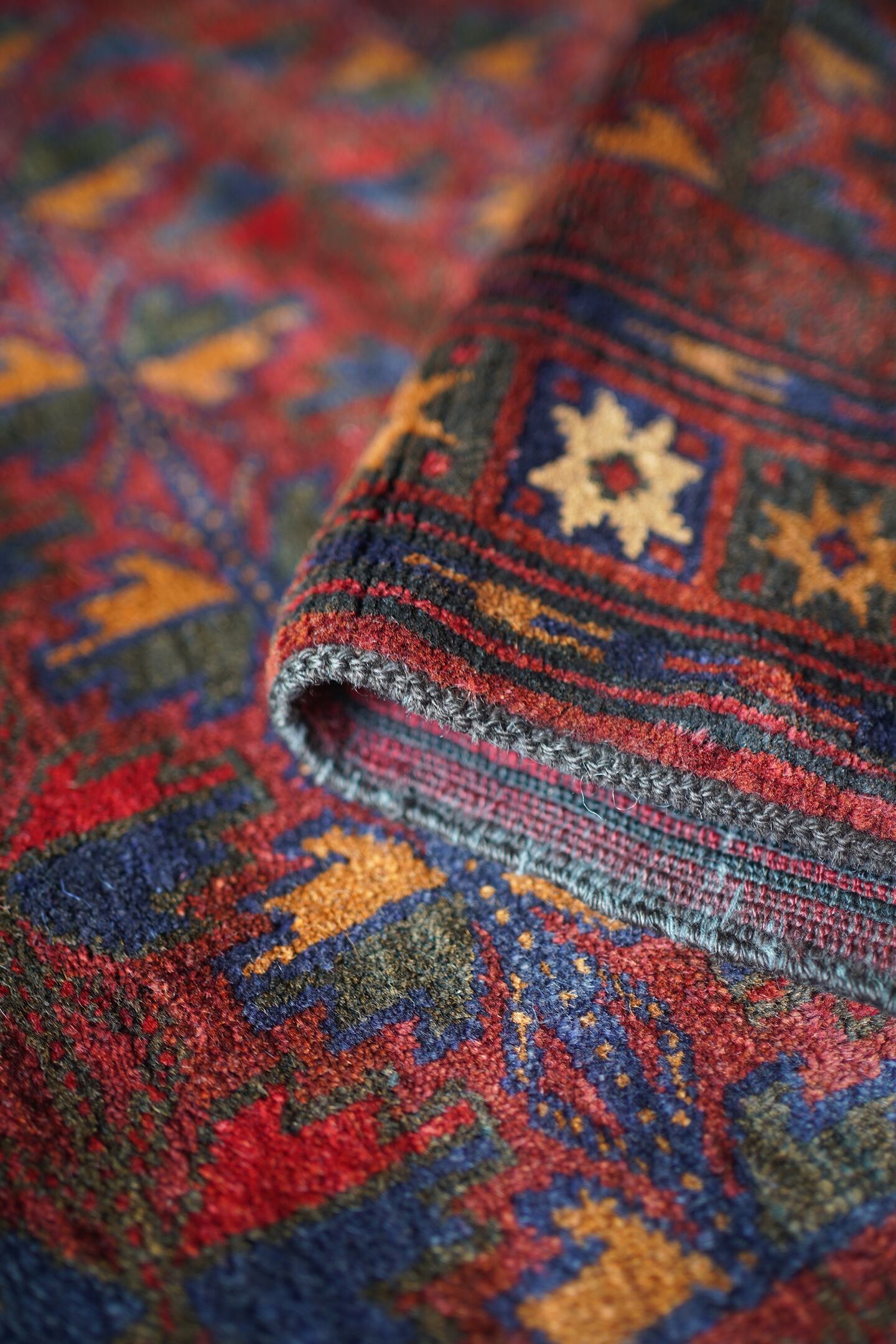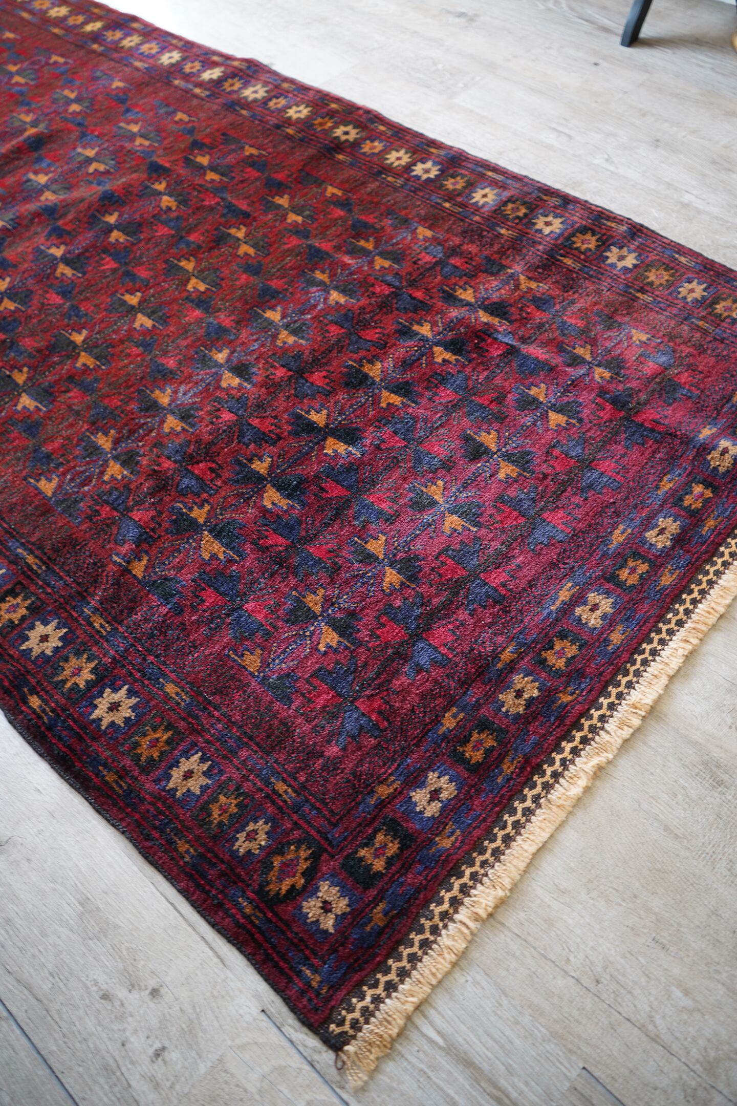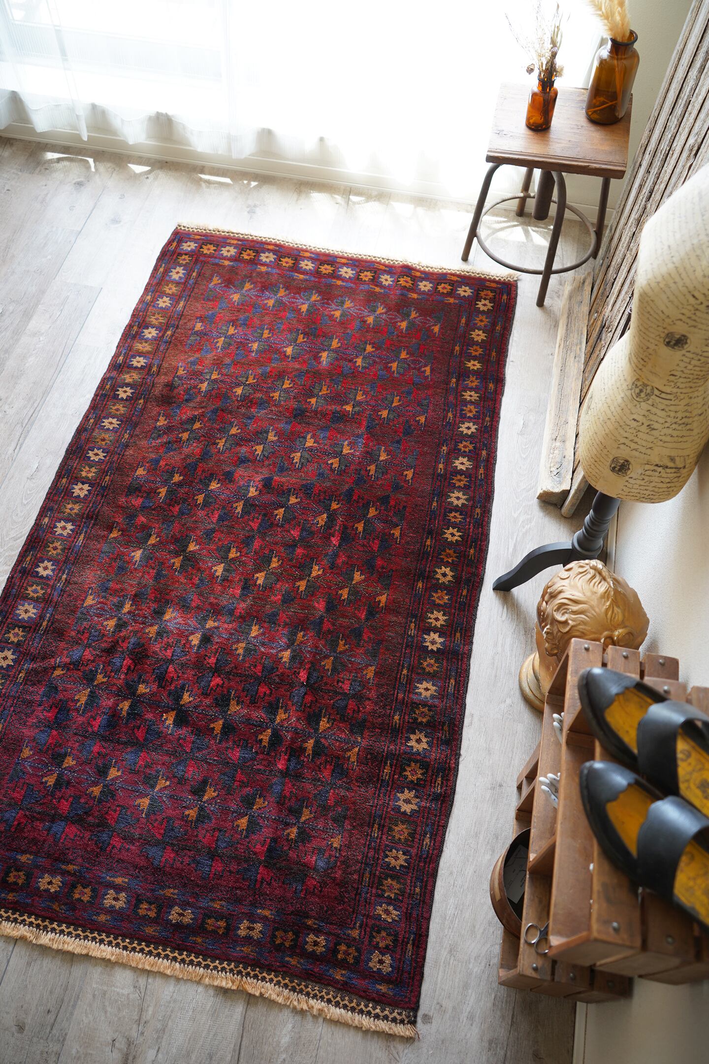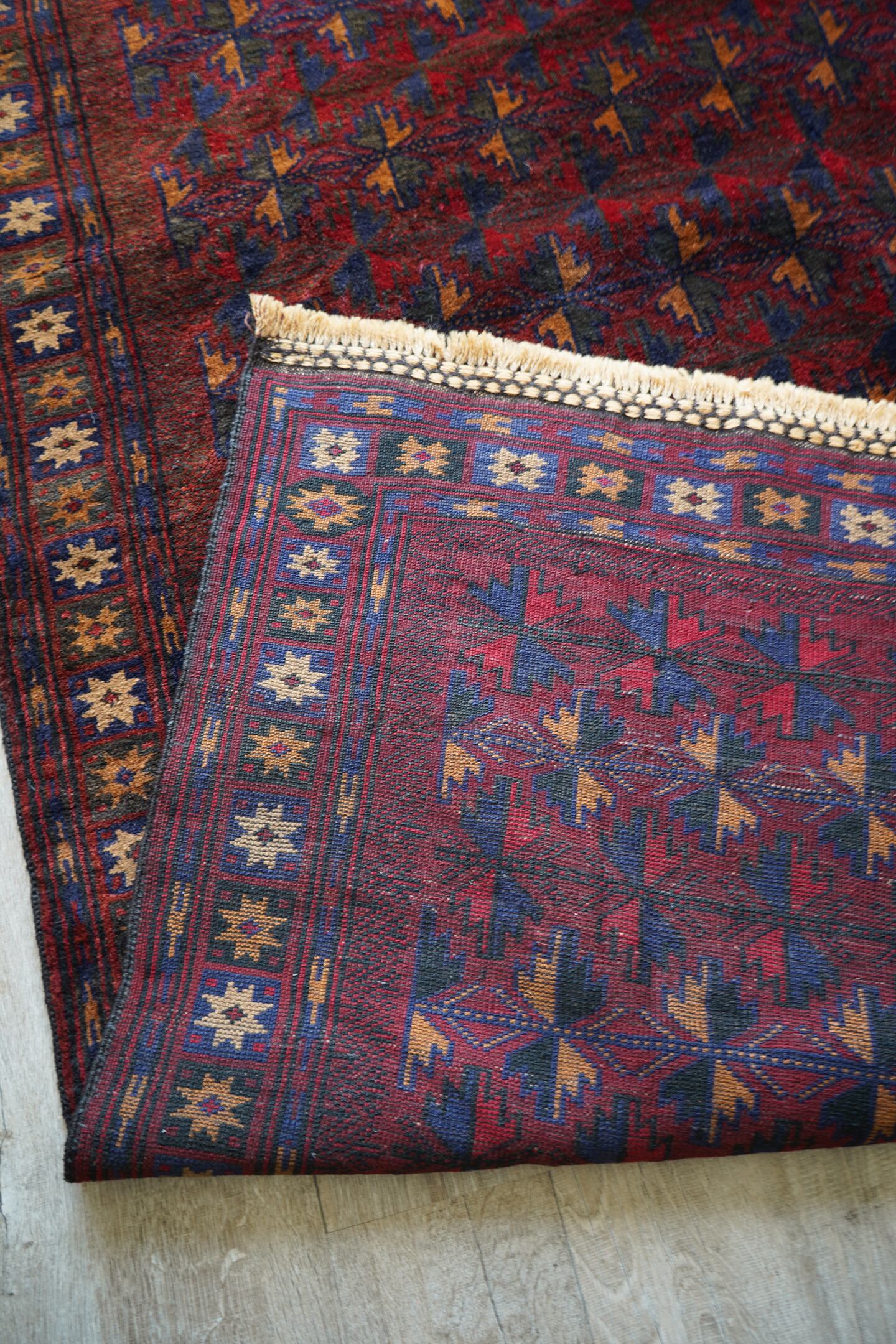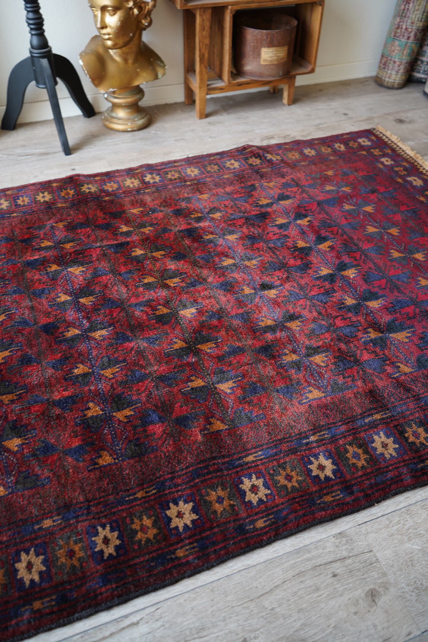 ソフトウールで、ふわっふわの柔らかくて気持ちの良い肌触りがたまらないバルーチラグ。ずっとラグの上に乗っていたくなるような優しい質感が素晴らしい一枚です。深く暗めのシックな赤色をベースにフィールドには2種のチナール紋様(ブラウン&ネイビー、赤&濃紺)、ボーダーには八角星が織り込まれています。またフリンジ部分は素敵なキリムエンドとなっています。パイルに光が差し込むと艶も見受けられ大変美しいです。ダメージもなく、パーフェクトなコンディション。厚みは9mm程度です。是非気持ちの良いソフトウールを体感してみてください。