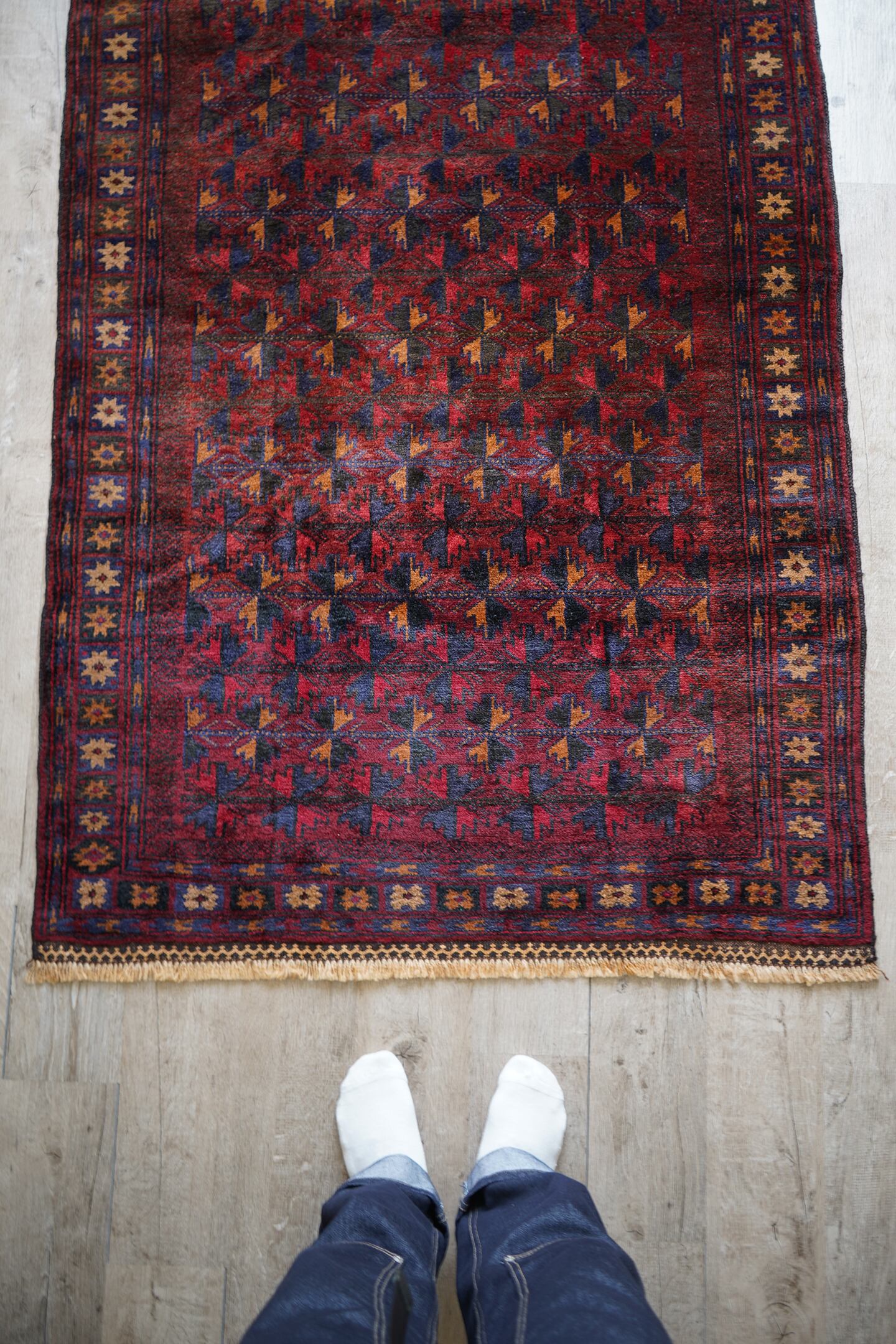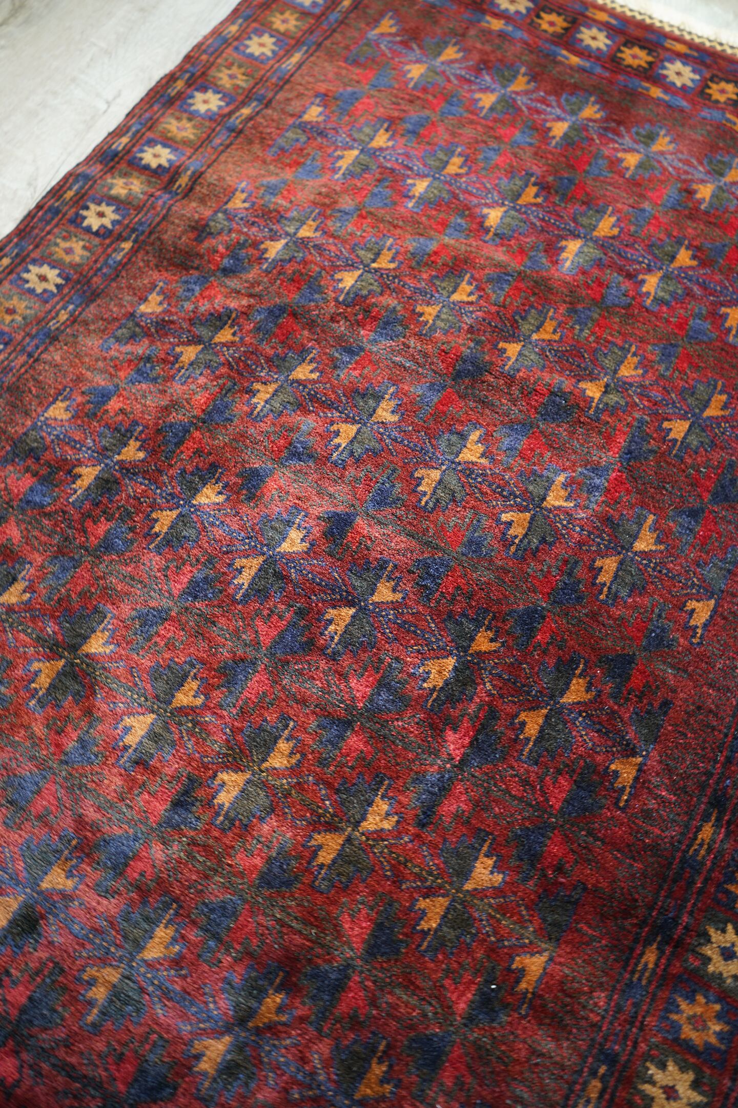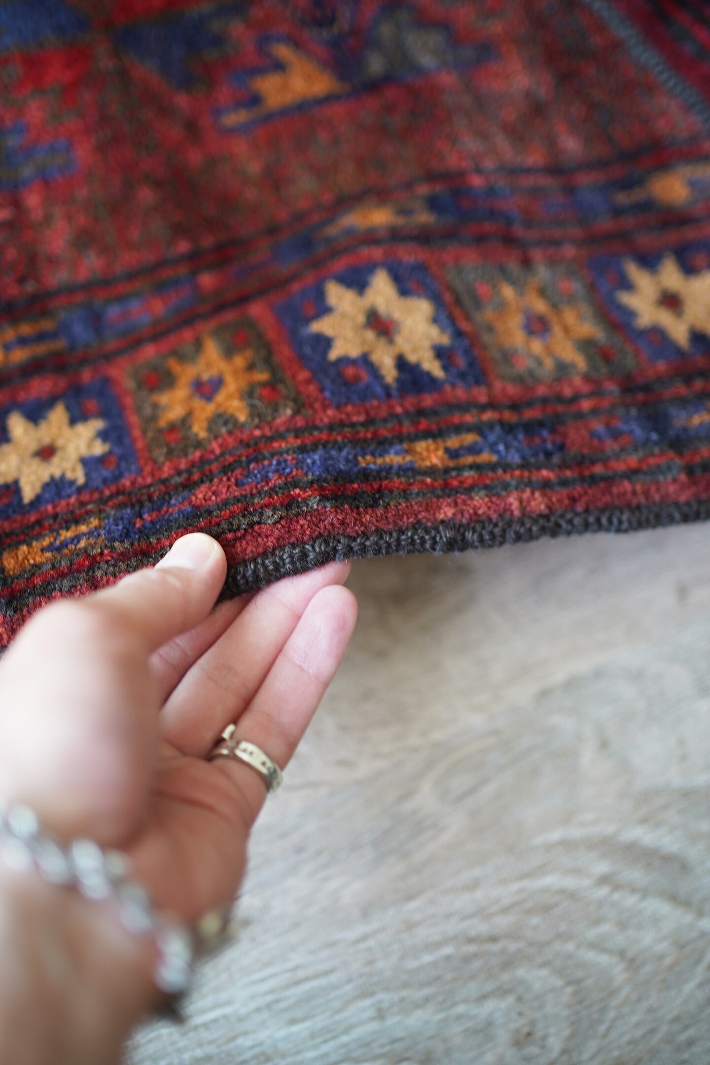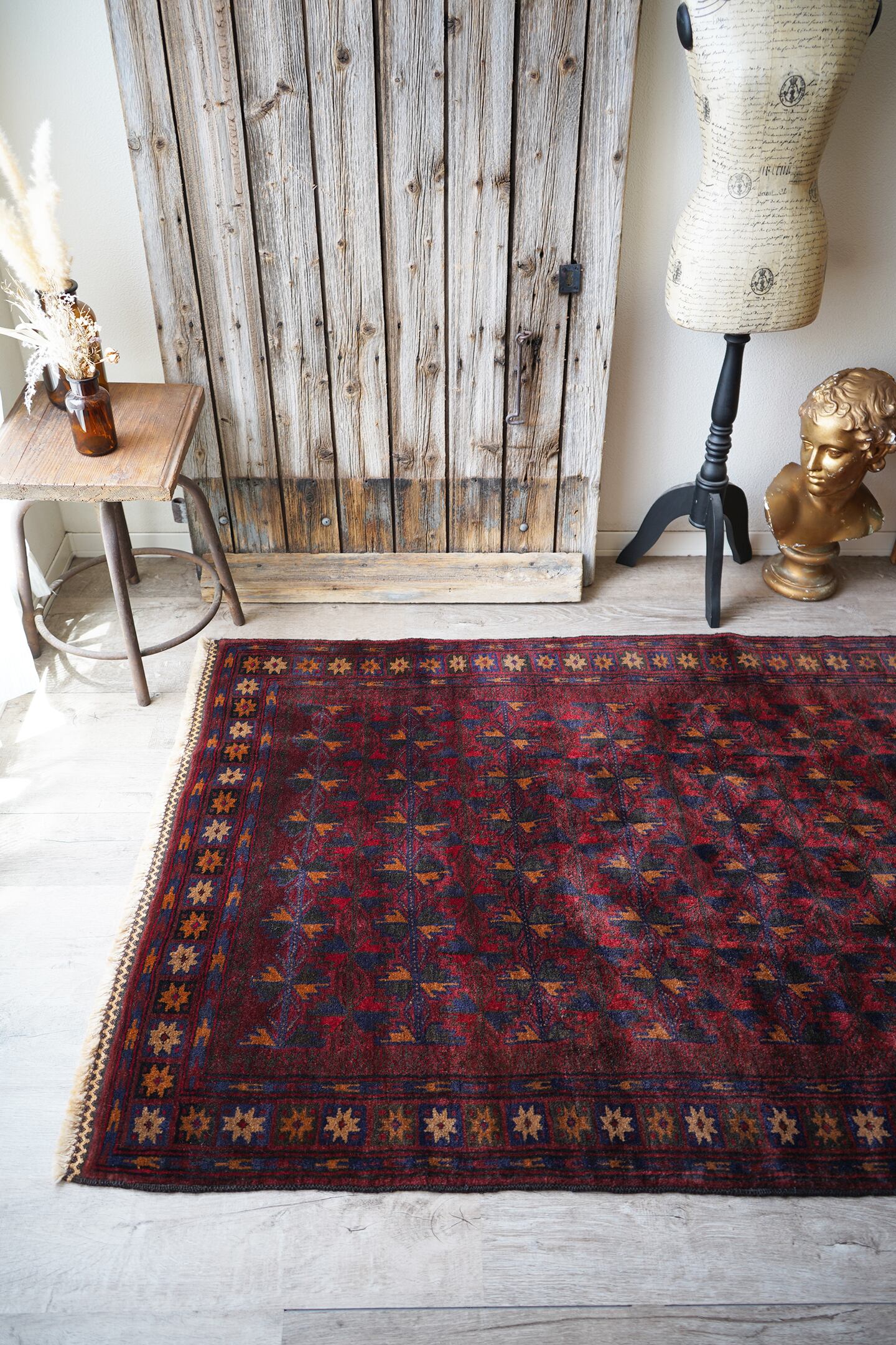 ソフトウールで、ふわっふわの柔らかくて気持ちの良い肌触りがたまらないバルーチラグ。ずっとラグの上に乗っていたくなるような優しい質感が素晴らしい一枚です。深く暗めのシックな赤色をベースにフィールドには2種のチナール紋様(ブラウン&ネイビー、赤&濃紺)、ボーダーには八角星が織り込まれています。またフリンジ部分は素敵なキリムエンドとなっています。パイルに光が差し込むと艶も見受けられ大変美しいです。ダメージもなく、パーフェクトなコンディション。厚みは9mm程度です。是非気持ちの良いソフトウールを体感してみてください。