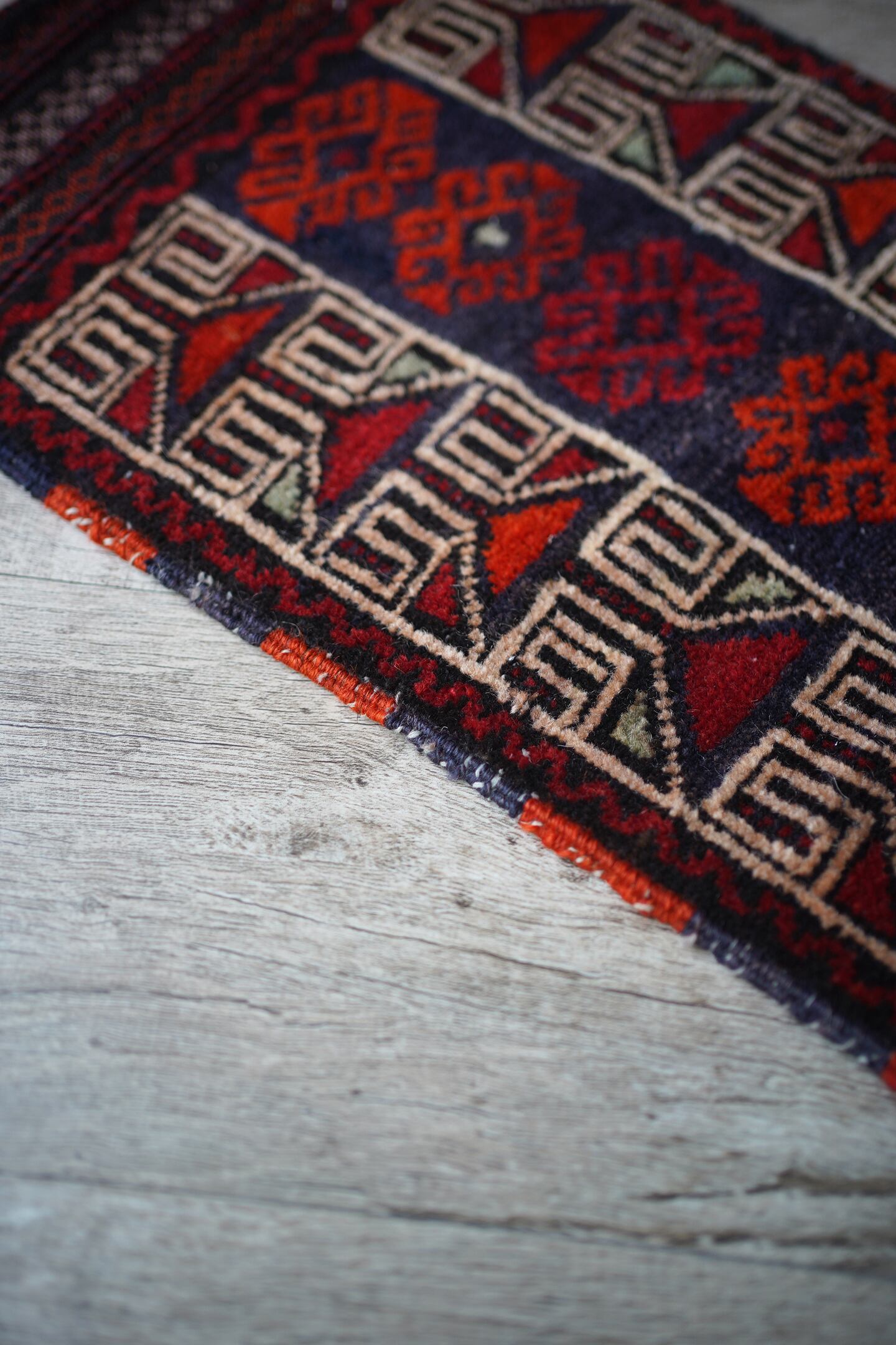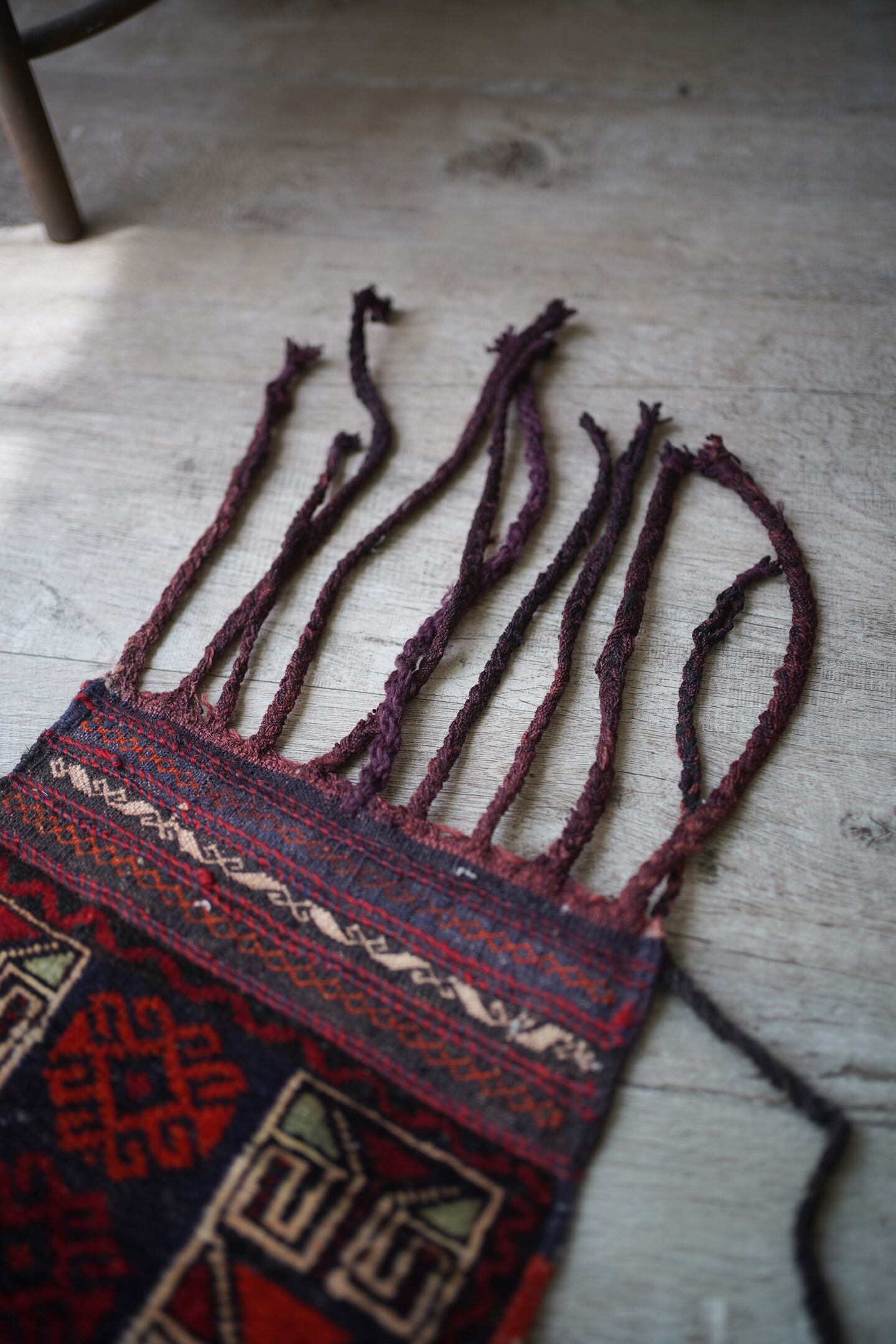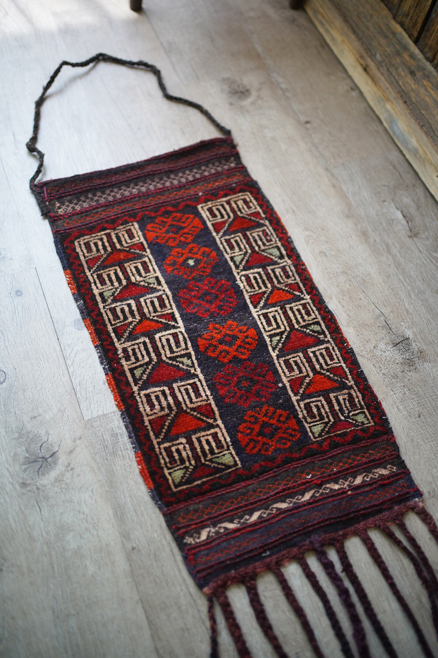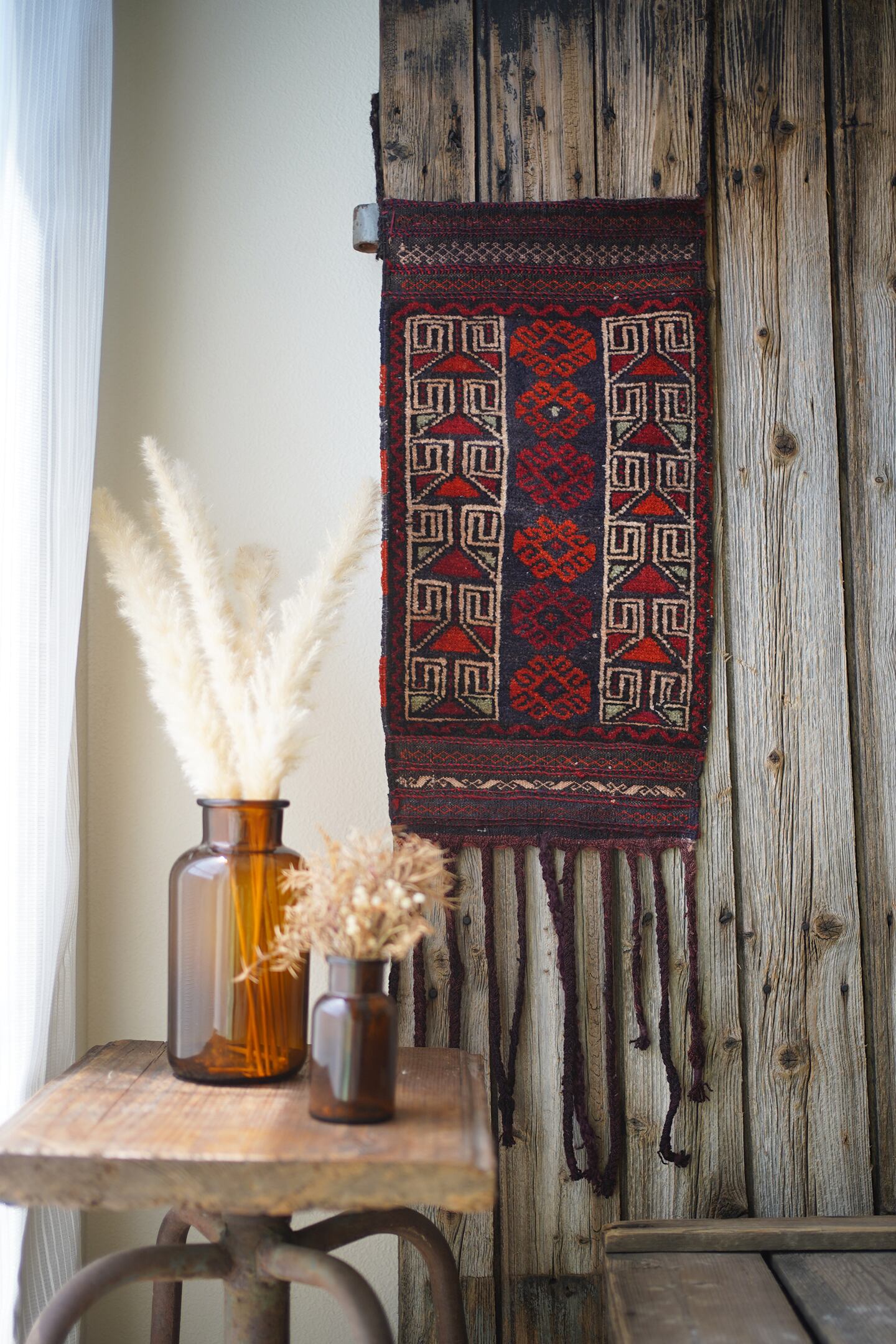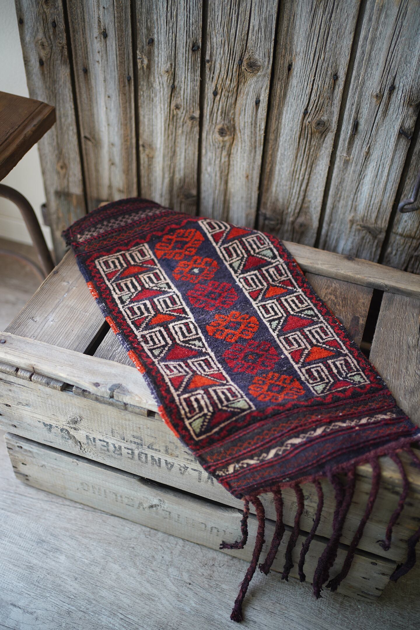 約50年ほど前にバルーチ族によって作られたラクダなどへの動物用首飾りとして使用されていたものです。色味は濃紺に、深い落ち着いた赤とオレンジにも見える鮮やかな赤、差し色に薄いミントグリーンが使われています。ラグの表面はふわサラッとした肌触りで、4mmほどの厚みです。素敵にお部屋を彩ってくれるタペストリーの壁掛けとしてご利用ください♫