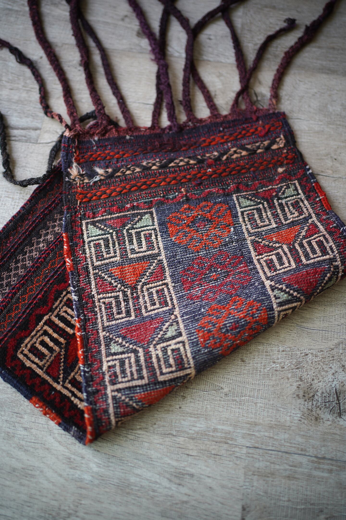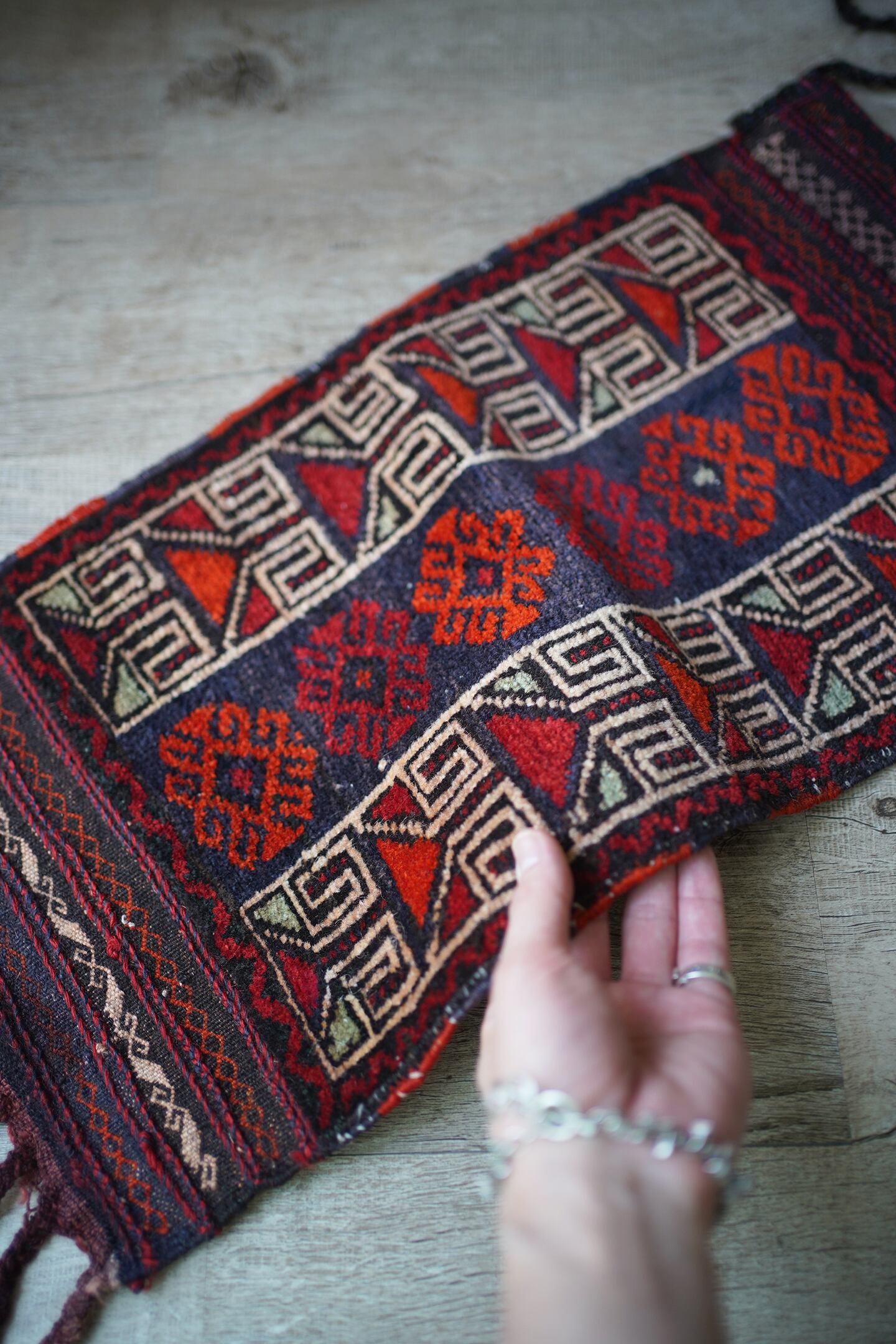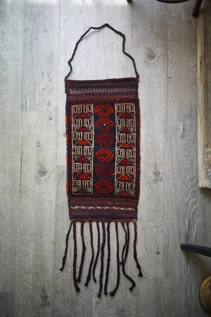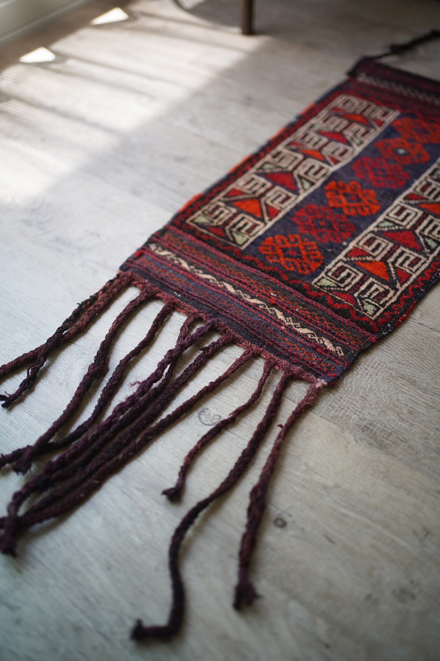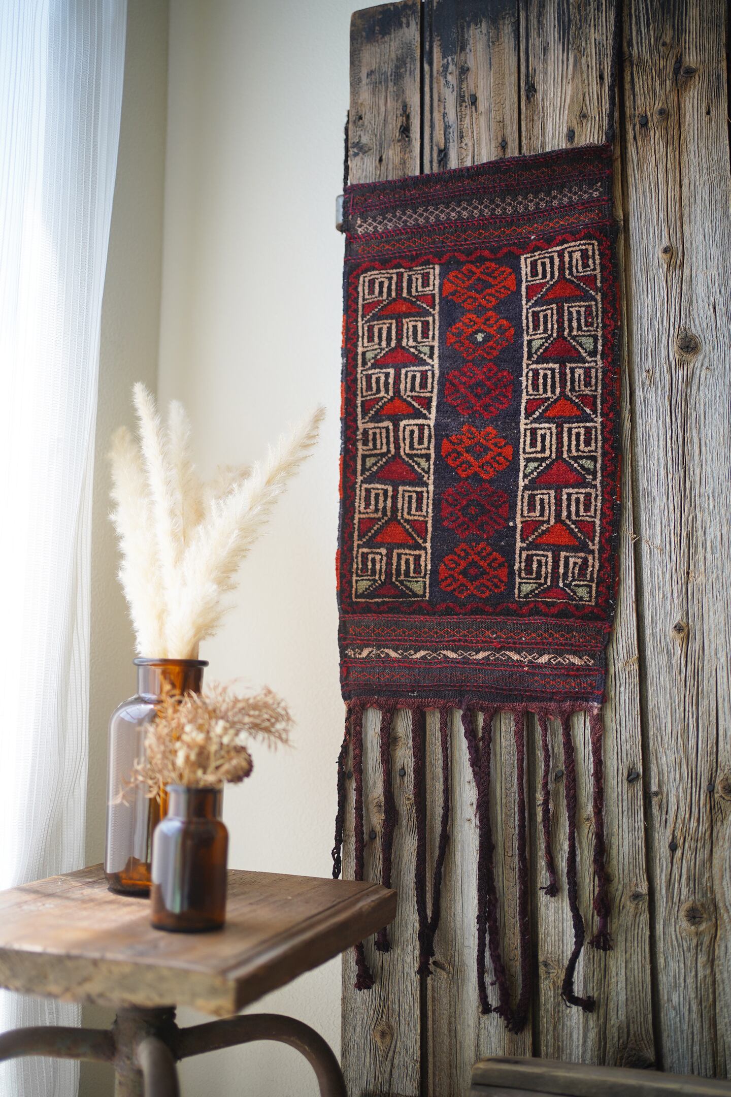 約50年ほど前にバルーチ族によって作られたラクダなどへの動物用首飾りとして使用されていたものです。色味は濃紺に、深い落ち着いた赤とオレンジにも見える鮮やかな赤、差し色に薄いミントグリーンが使われています。ラグの表面はふわサラッとした肌触りで、4mmほどの厚みです。素敵にお部屋を彩ってくれるタペストリーの壁掛けとしてご利用ください♫