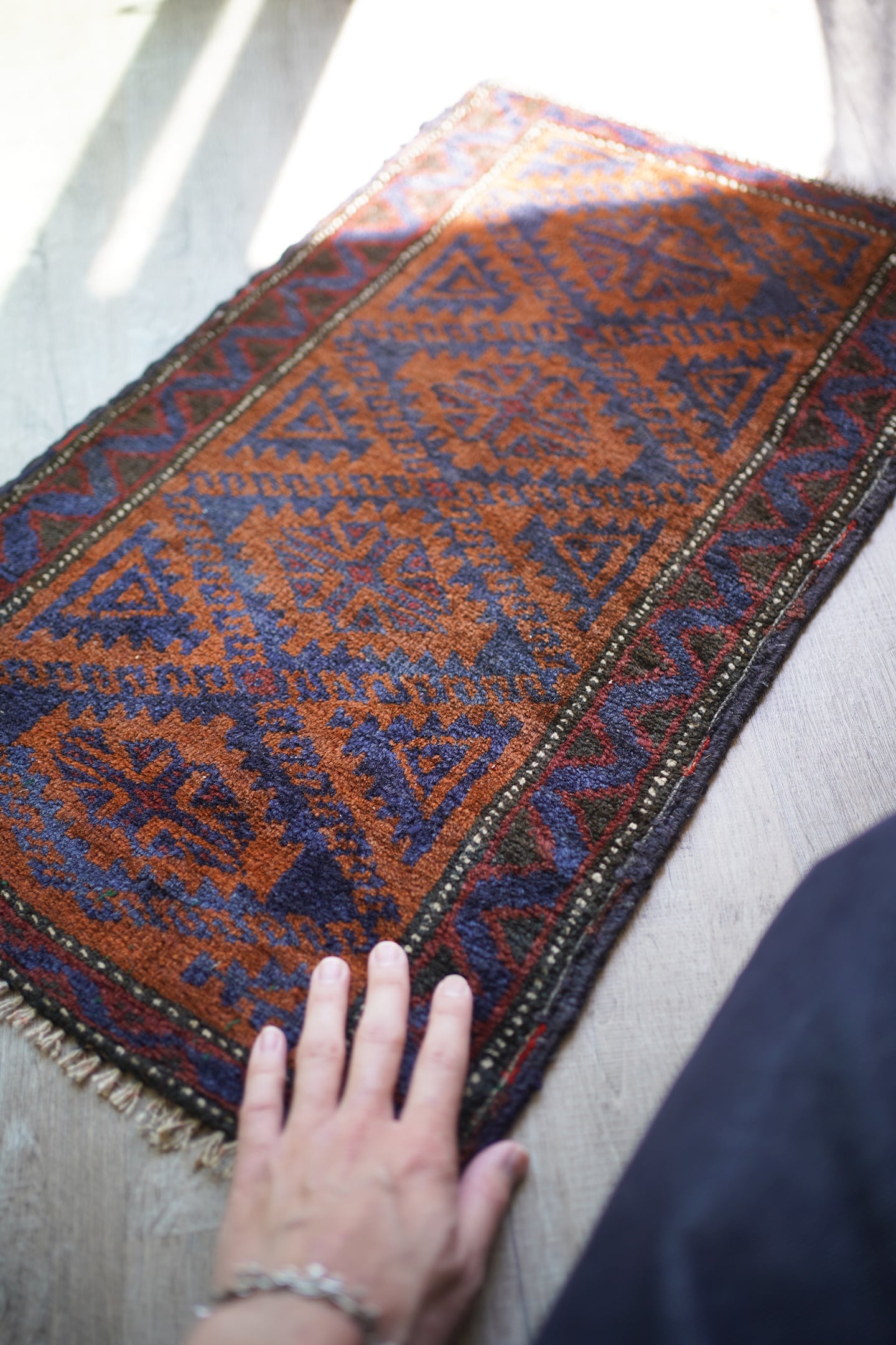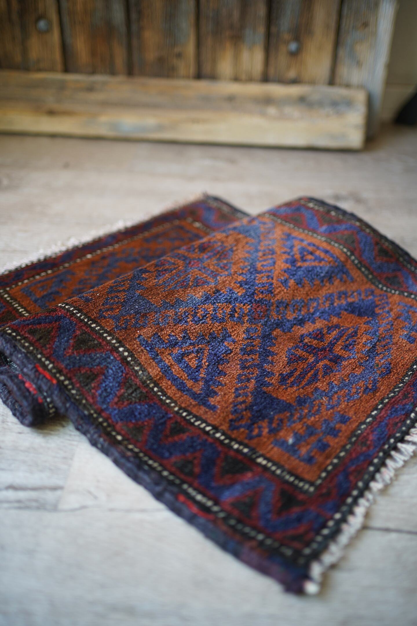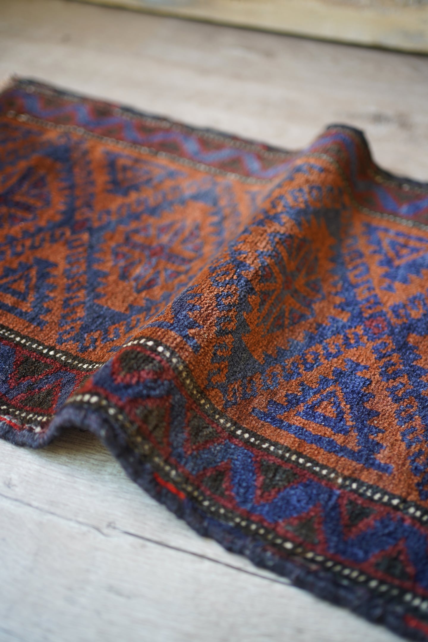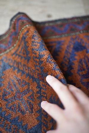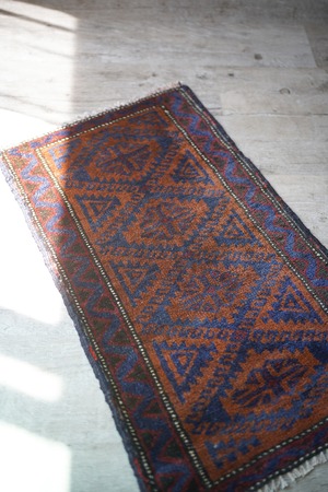 おおよそ60年前にイラン南東部のシスターン地方で織られたバルーチラグです。フィールドは濃いめのブラウンとネイビー、ボーダーは赤茶色の配色でシックで落ち着いた雰囲気です。パイルに太陽光が差し込むと艶も見受けられます。ふわっと優しい肌触りで、厚みは6mm程度。元々付いていた装飾を取り除いた兼ね合いで、色味のあるパイルが残っています(お写真最後の2枚をご参照ください)。ちょっとしたスペースや棚の上などにどうぞ♫