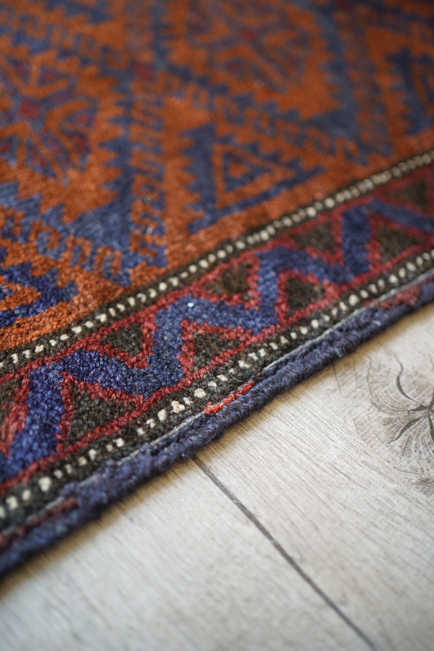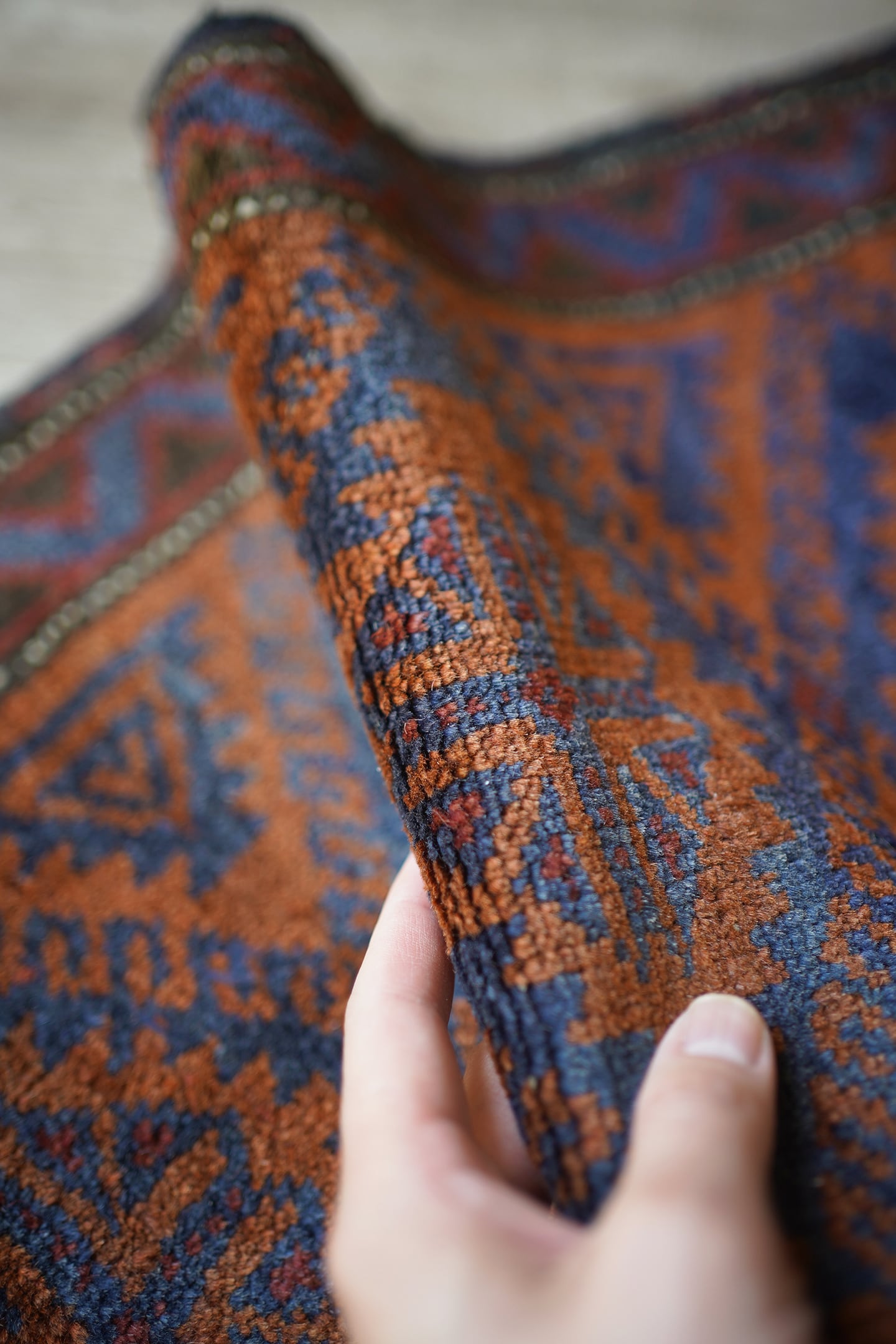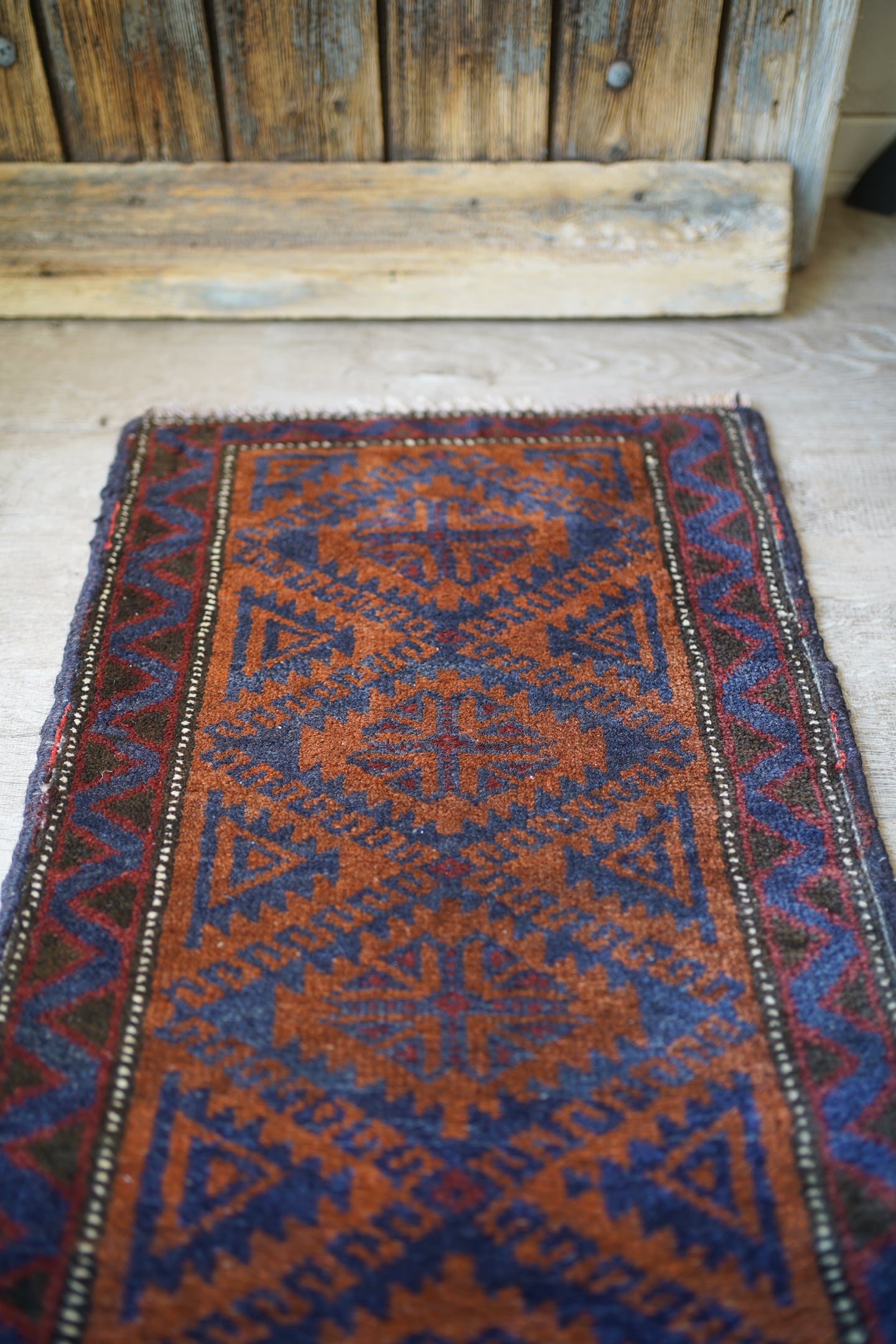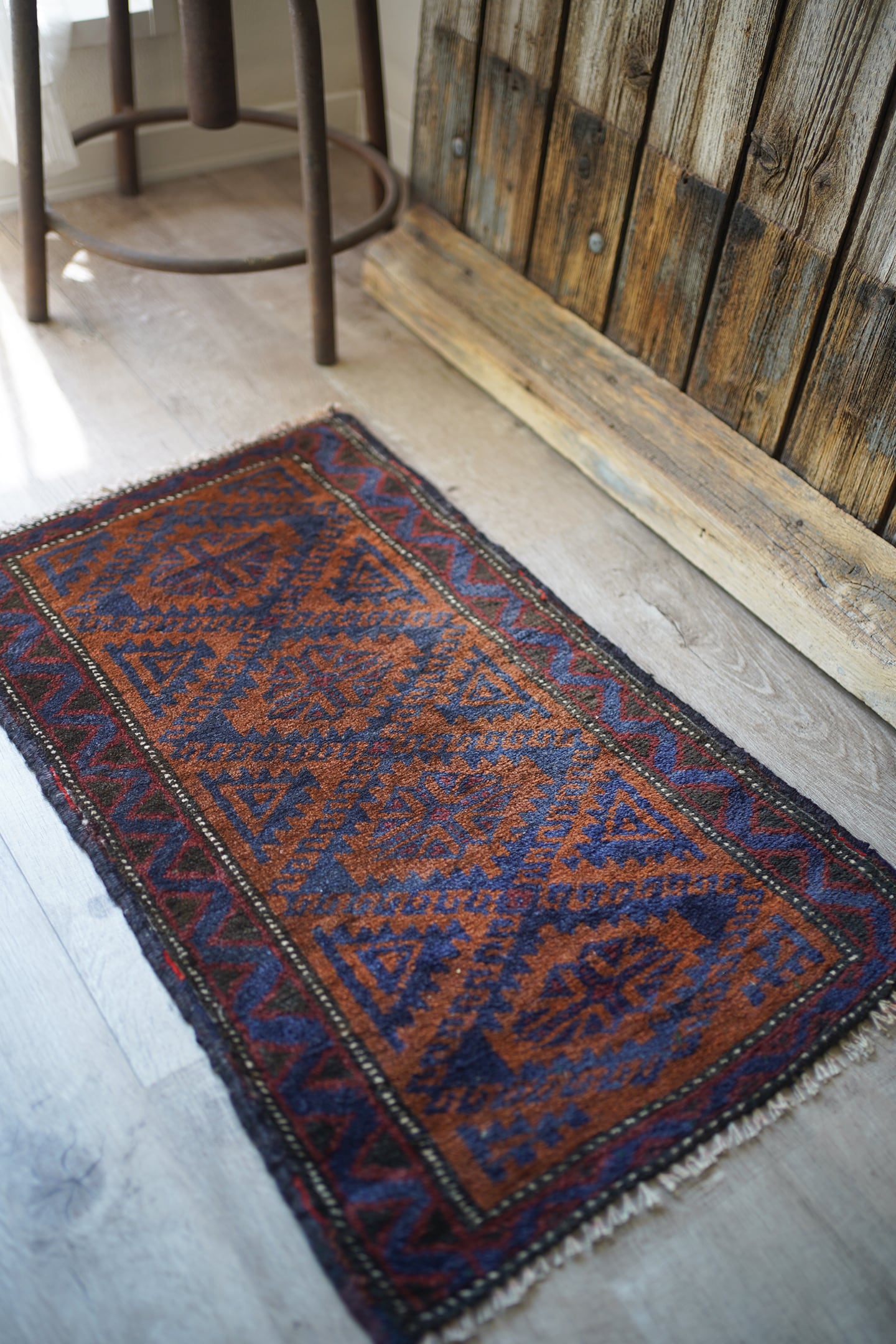 おおよそ60年前にイラン南東部のシスターン地方で織られたバルーチラグです。フィールドは濃いめのブラウンとネイビー、ボーダーは赤茶色の配色でシックで落ち着いた雰囲気です。パイルに太陽光が差し込むと艶も見受けられます。ふわっと優しい肌触りで、厚みは6mm程度。元々付いていた装飾を取り除いた兼ね合いで、色味のあるパイルが残っています(お写真最後の2枚をご参照ください)。ちょっとしたスペースや棚の上などにどうぞ♫