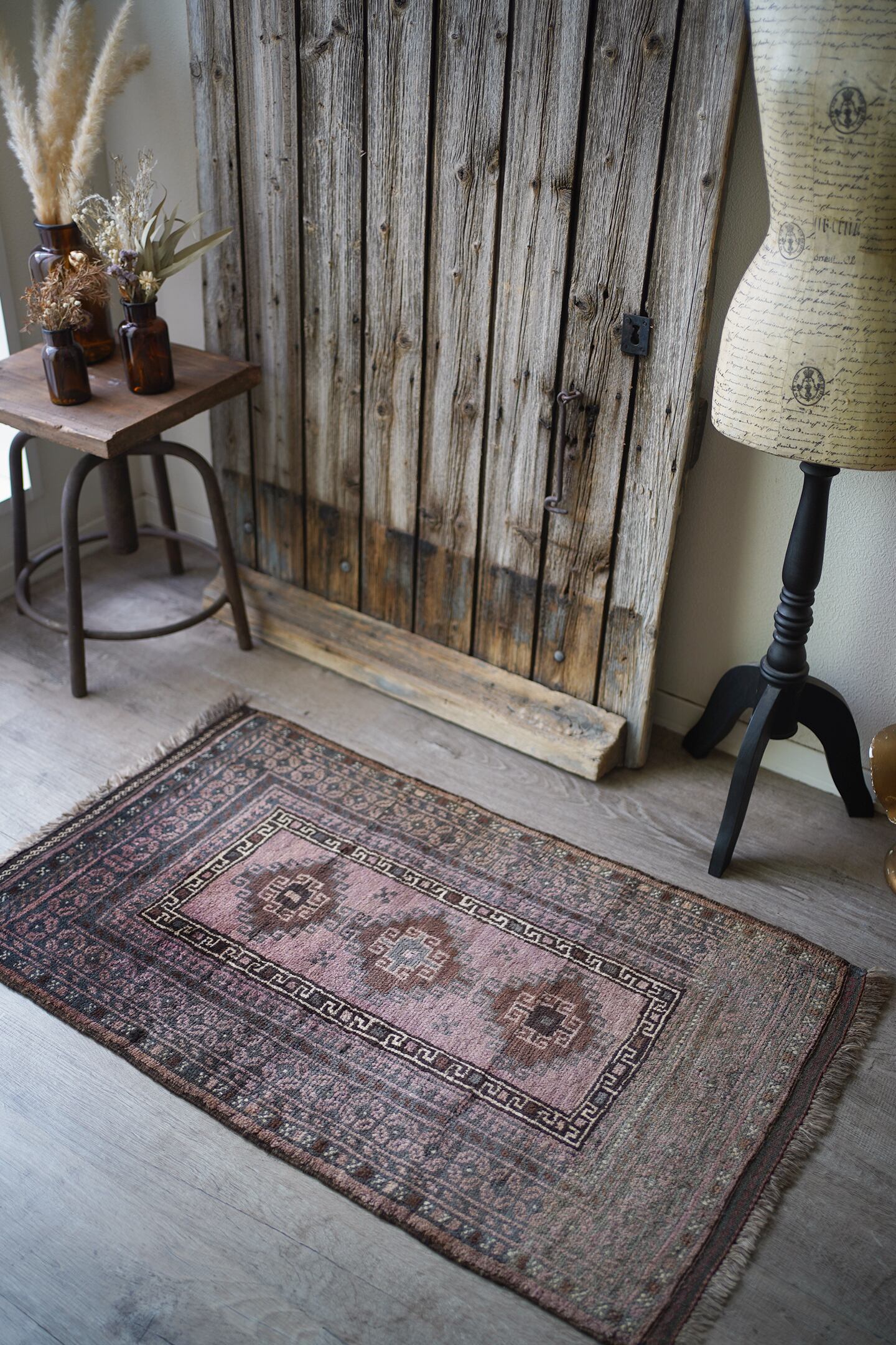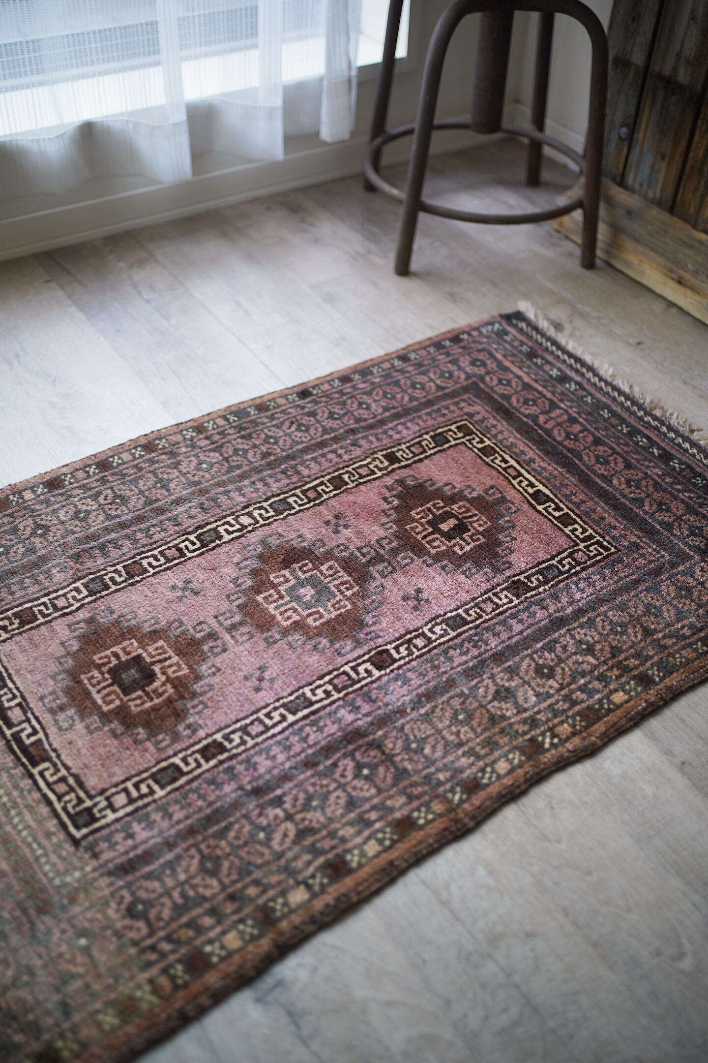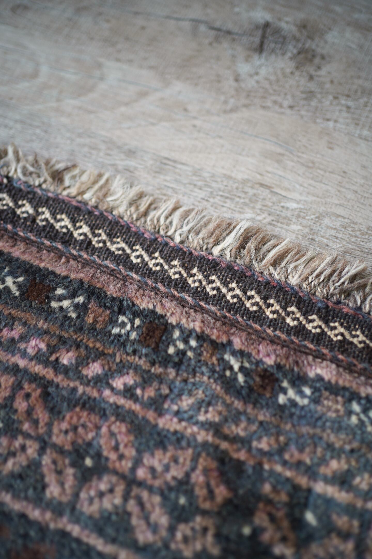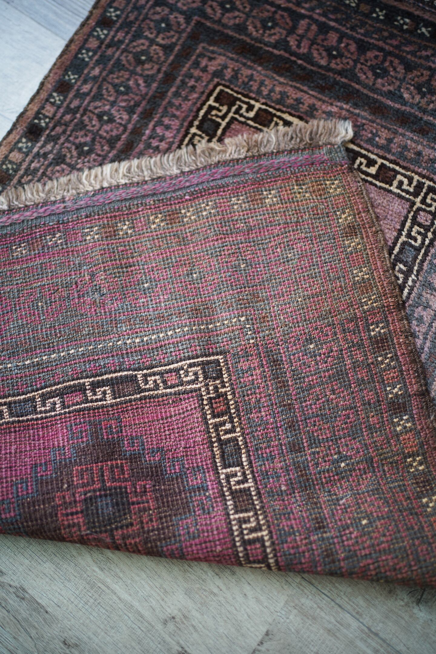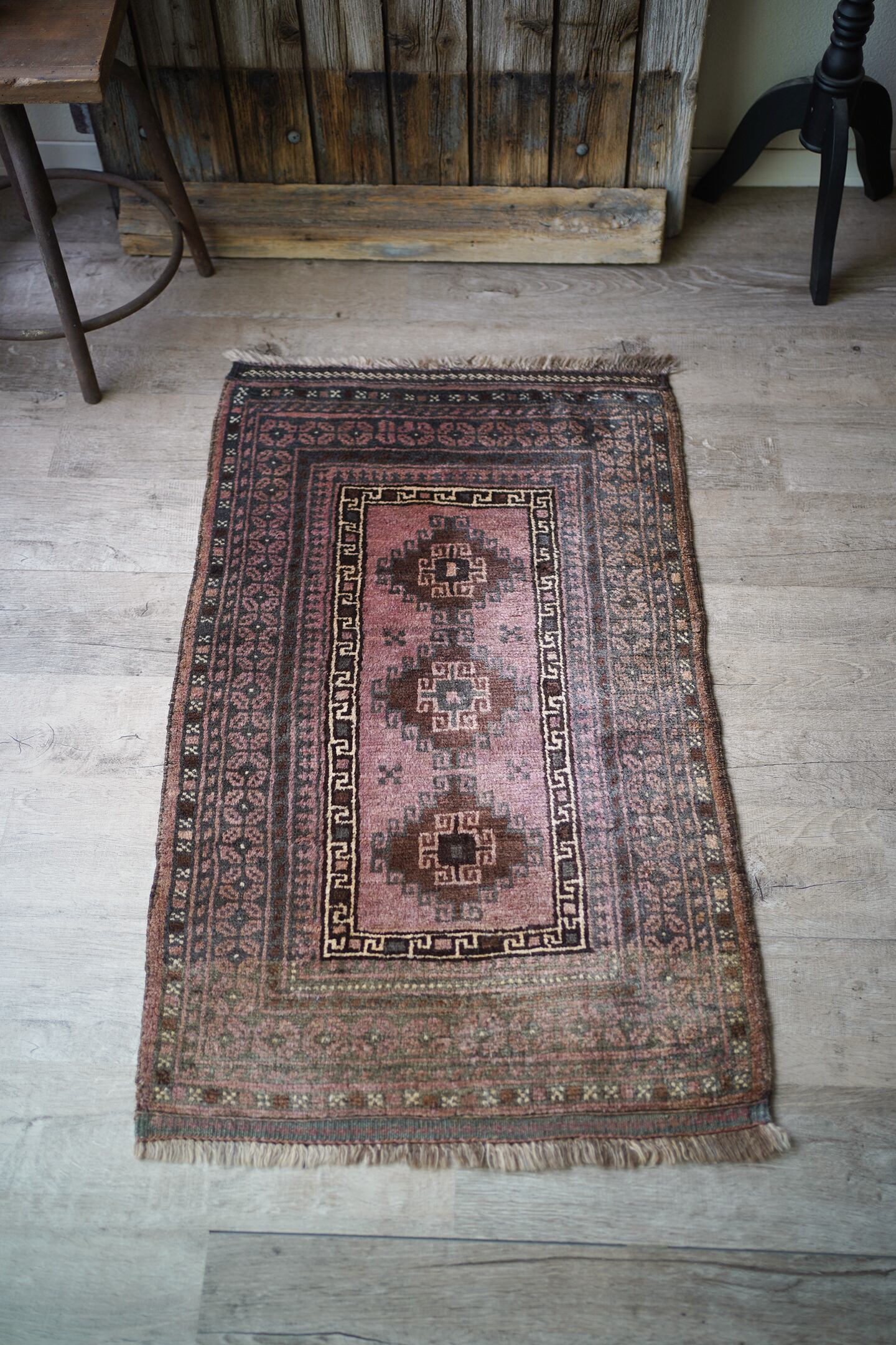 褪色した味のある色味と美しい艶が素敵なセミアンティークのアフガンバルーチラグ。メムリンク紋様が織り込まれたデザインで、元々は赤色だったものが長い年月を経て褪色し、薄い小豆色とブラウンカラーのグラデーションのような色味になった一枚です。フリンジ部分は上下でデザインの異なるキリムエンドとなっています。ふわサラっとした優しい肌触りで、厚みは6mm程度。状態もグッドコンディションです♫