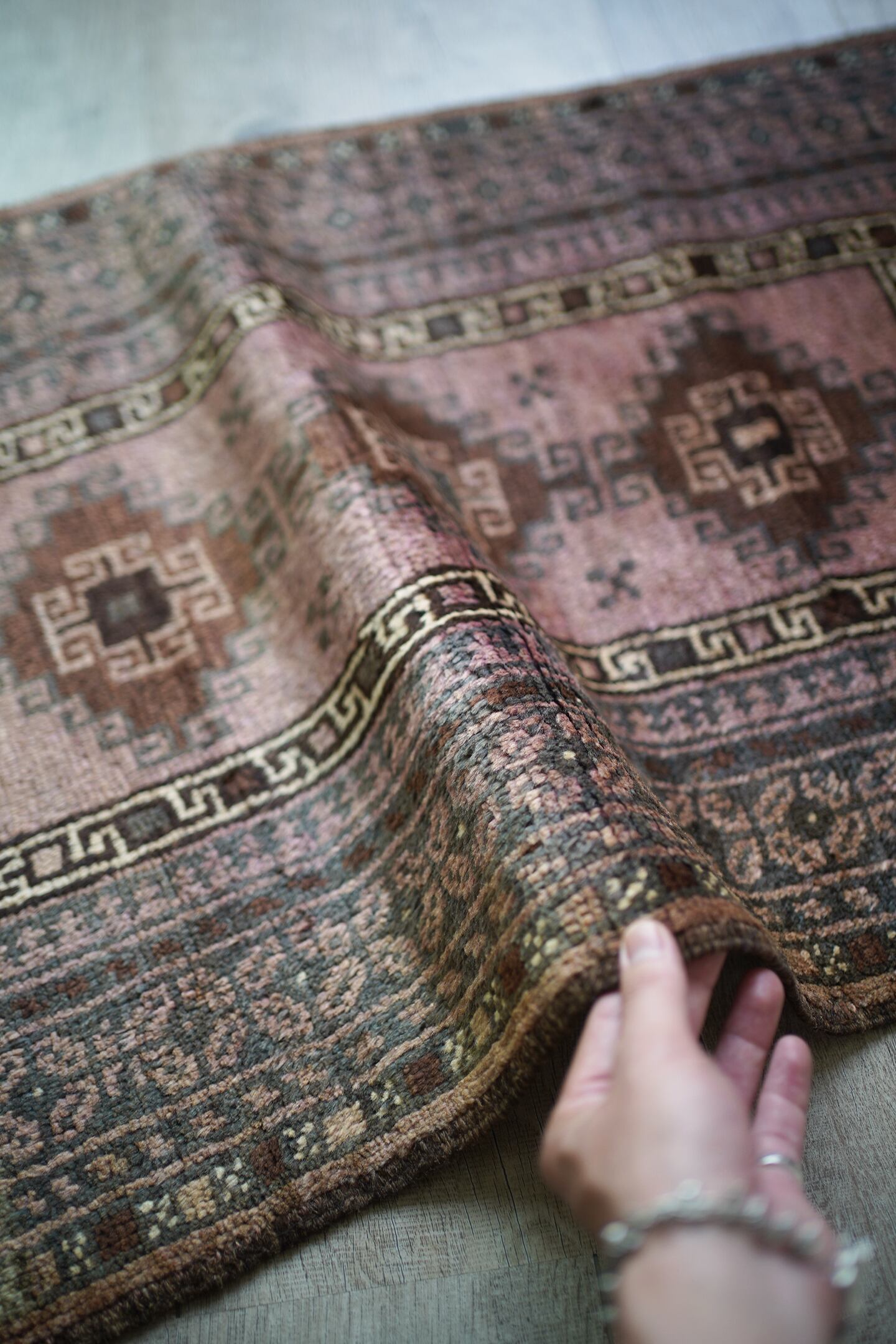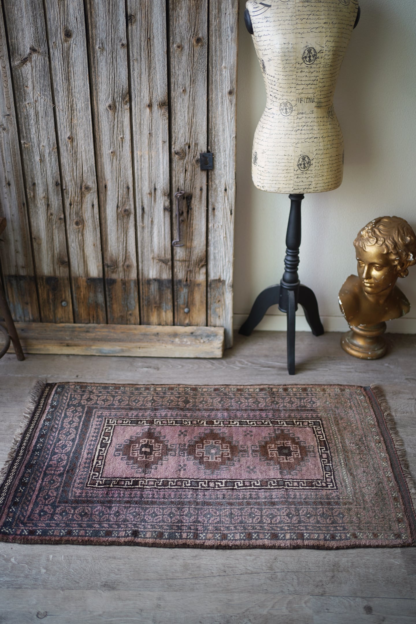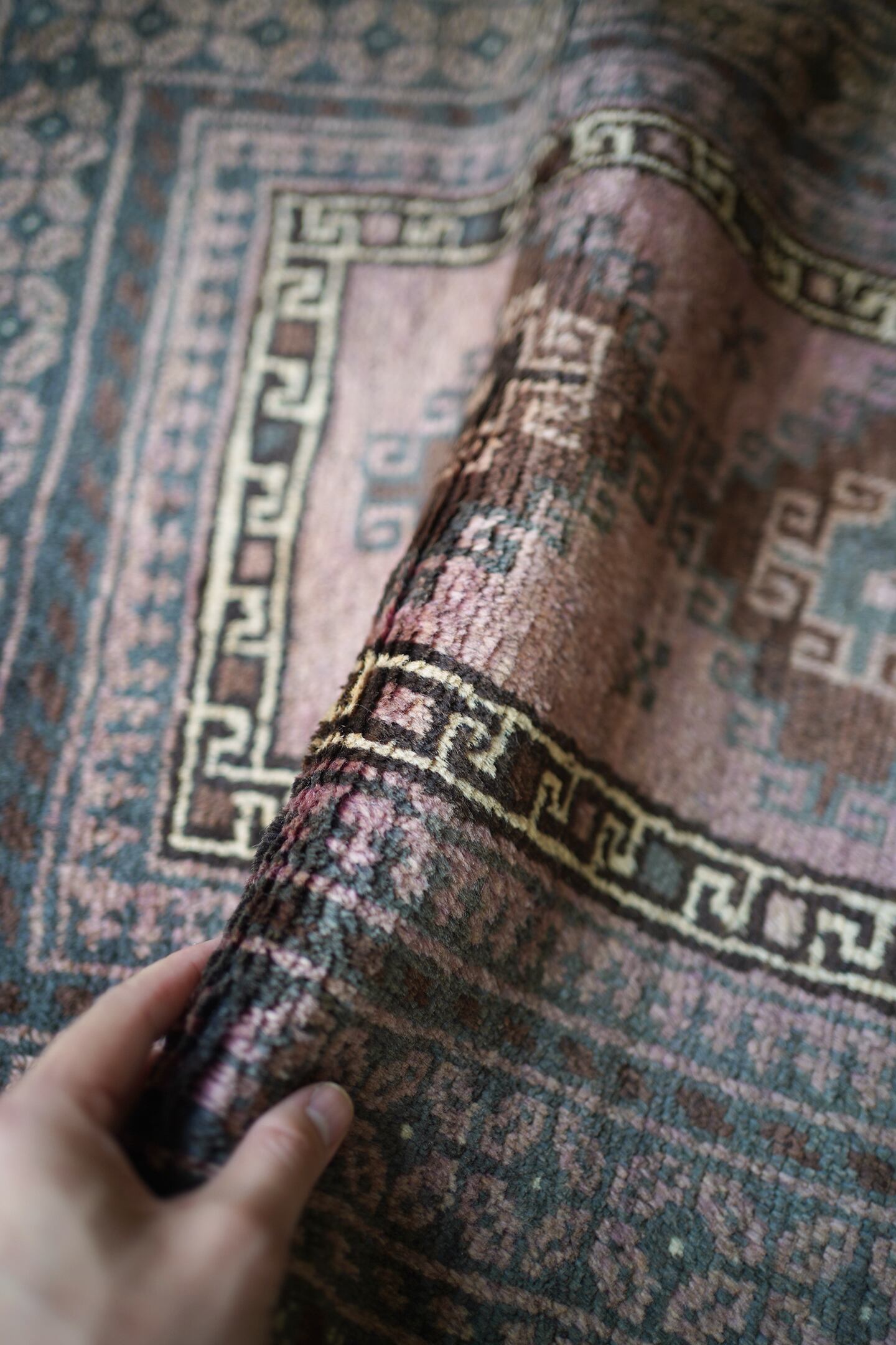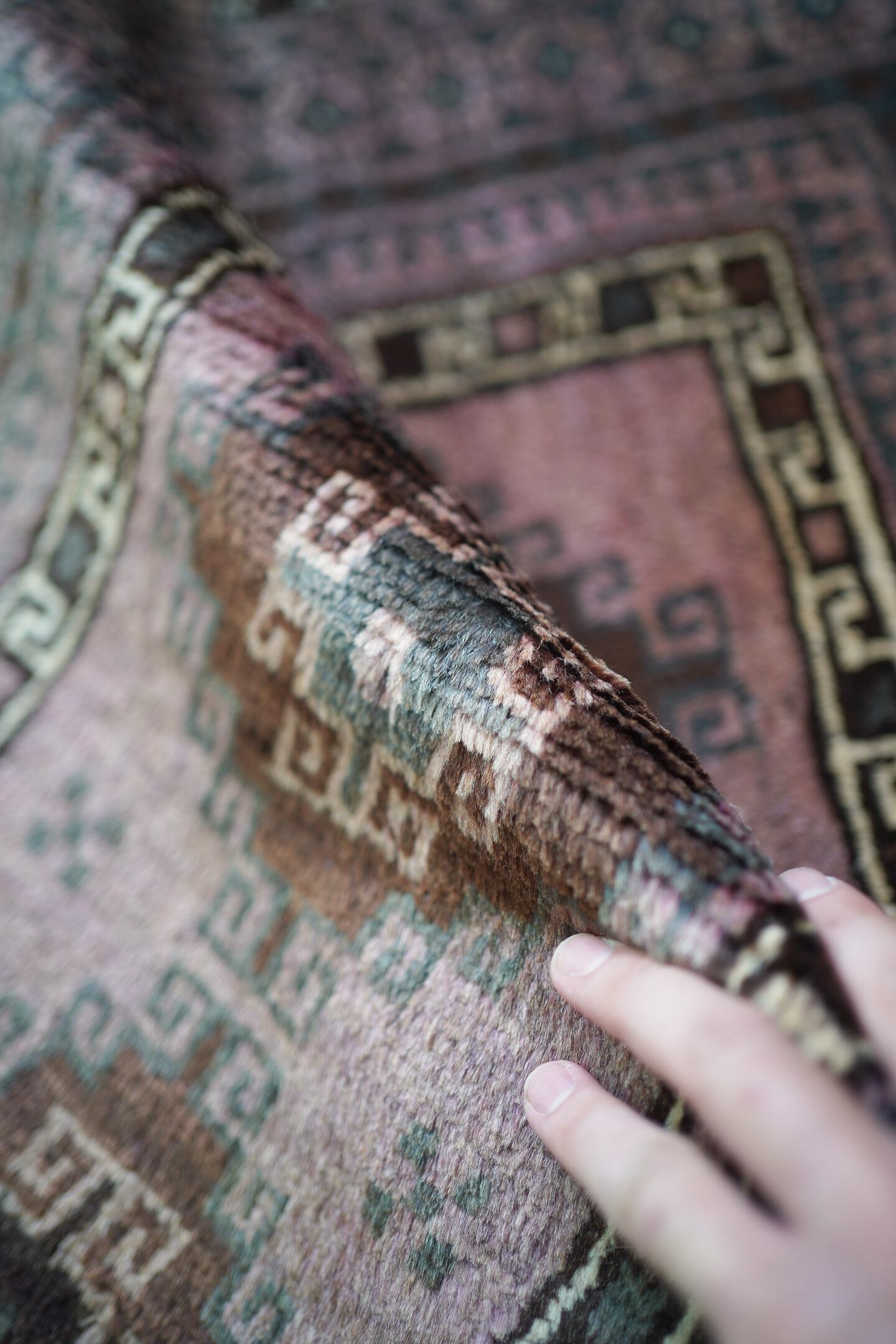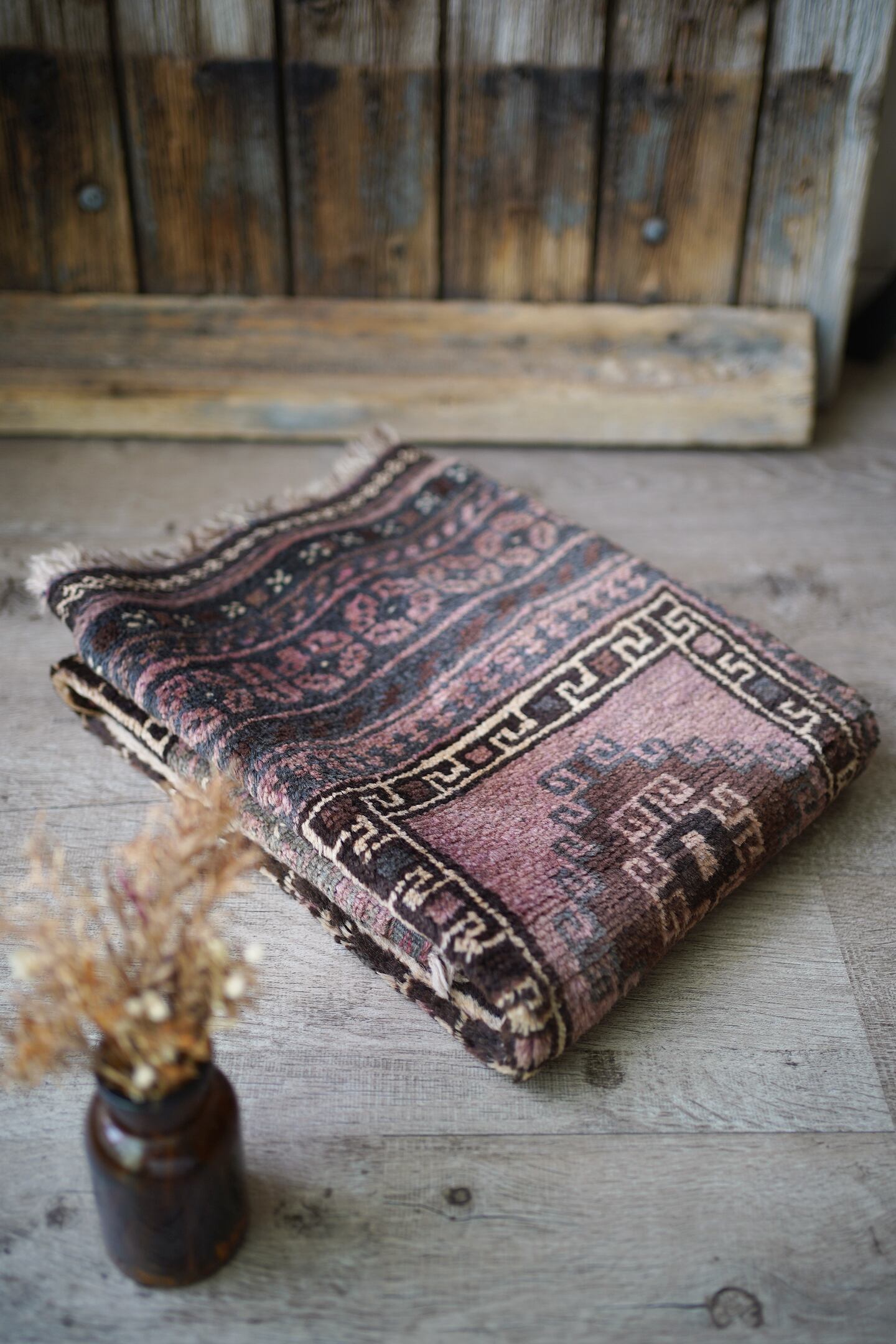 褪色した味のある色味と美しい艶が素敵なセミアンティークのアフガンバルーチラグ。メムリンク紋様が織り込まれたデザインで、元々は赤色だったものが長い年月を経て褪色し、薄い小豆色とブラウンカラーのグラデーションのような色味になった一枚です。フリンジ部分は上下でデザインの異なるキリムエンドとなっています。ふわサラっとした優しい肌触りで、厚みは6mm程度。状態もグッドコンディションです♫